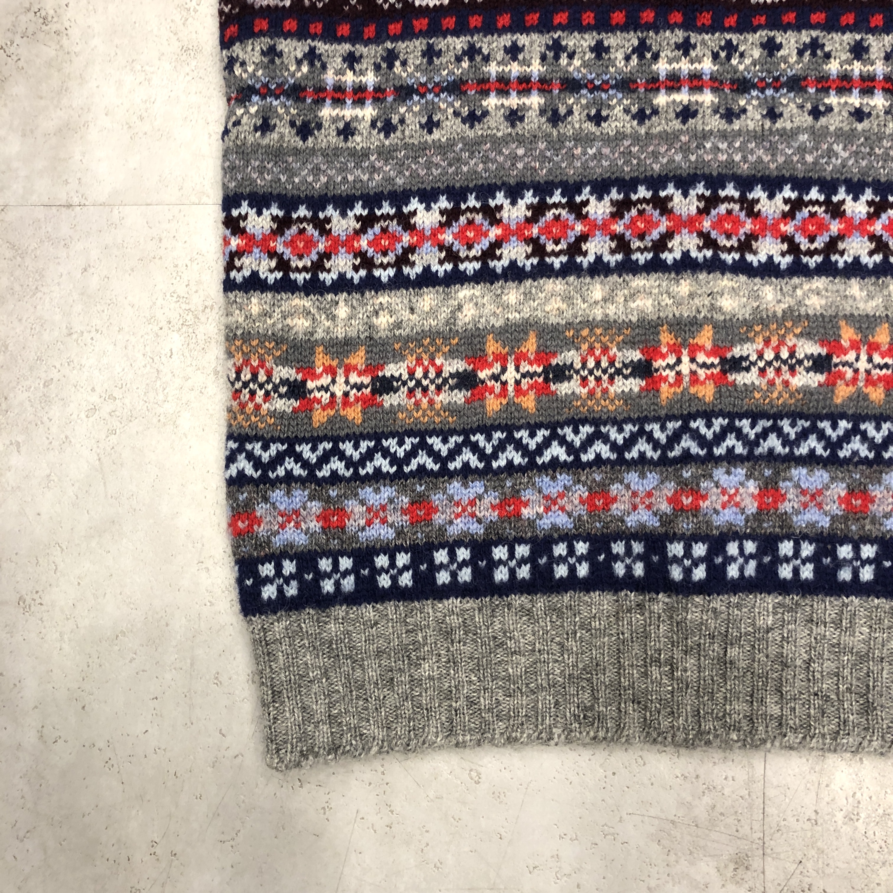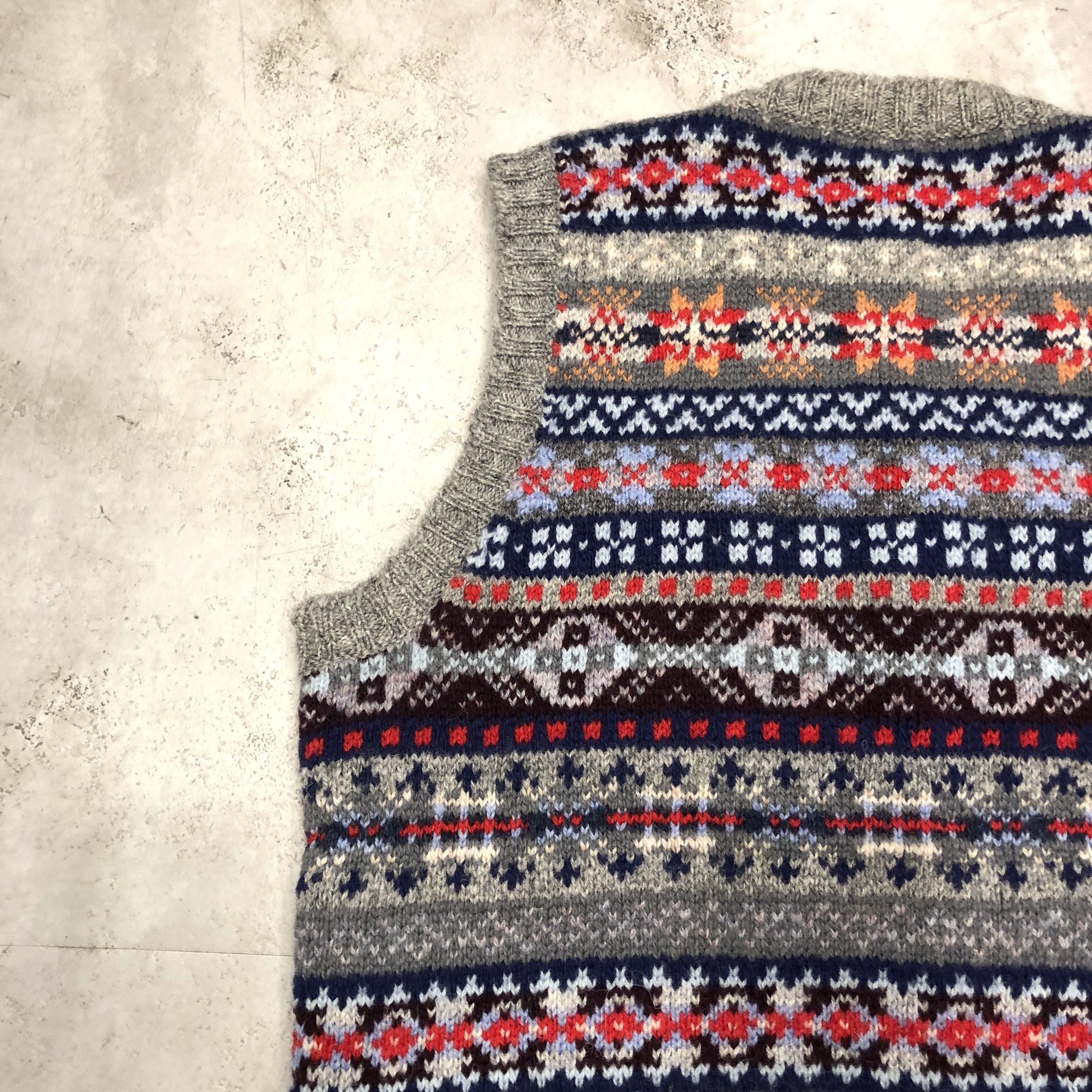 本品はVネックタイプのノースリーブ仕様。ベースカラーにはグレーを配しつつ、深みのあるネイビーやバーガンディ、そして差し色のレッドやスカイブルーが幾何学模様として織り込まれ、まさに“伝統の中の遊び心”が感じられる逸品。