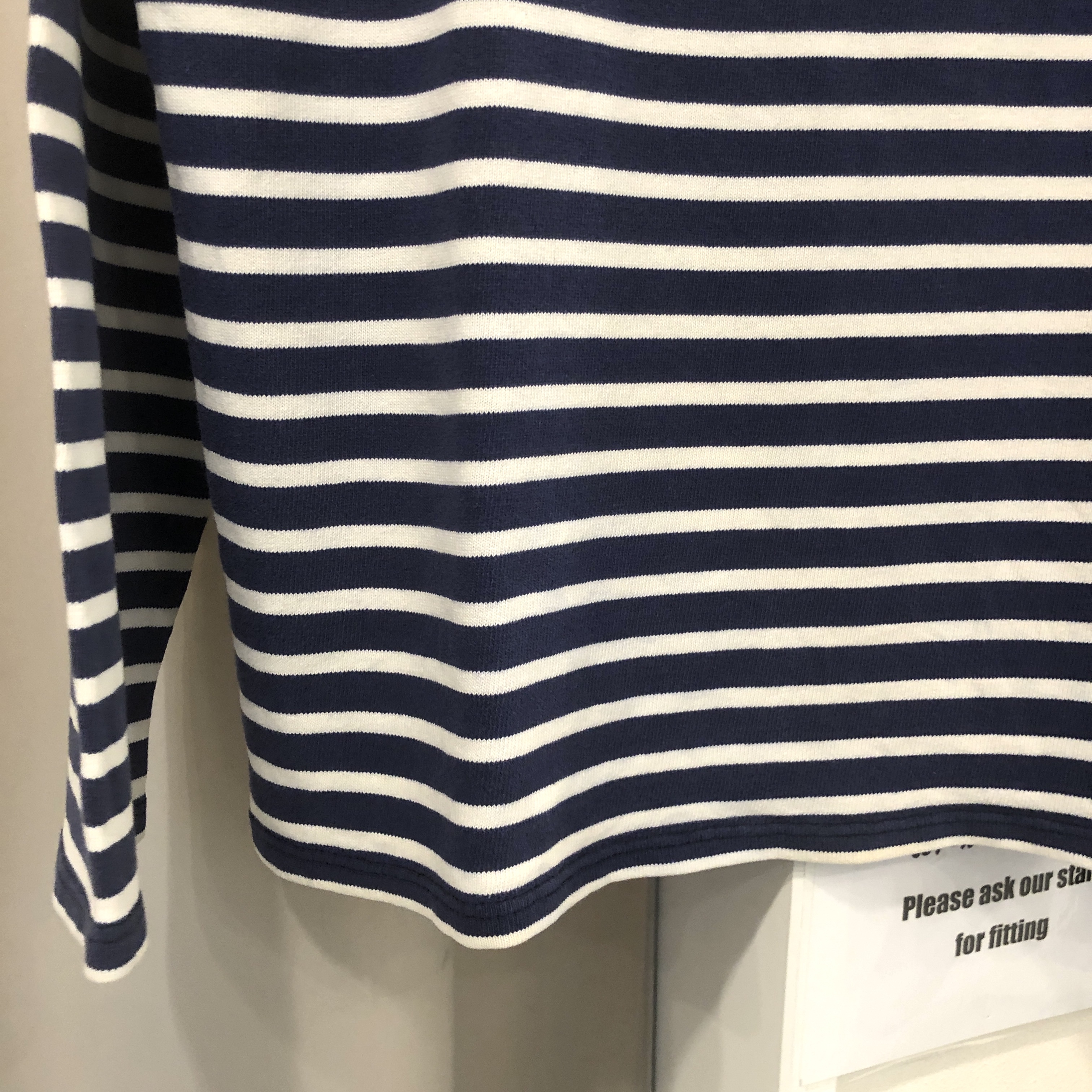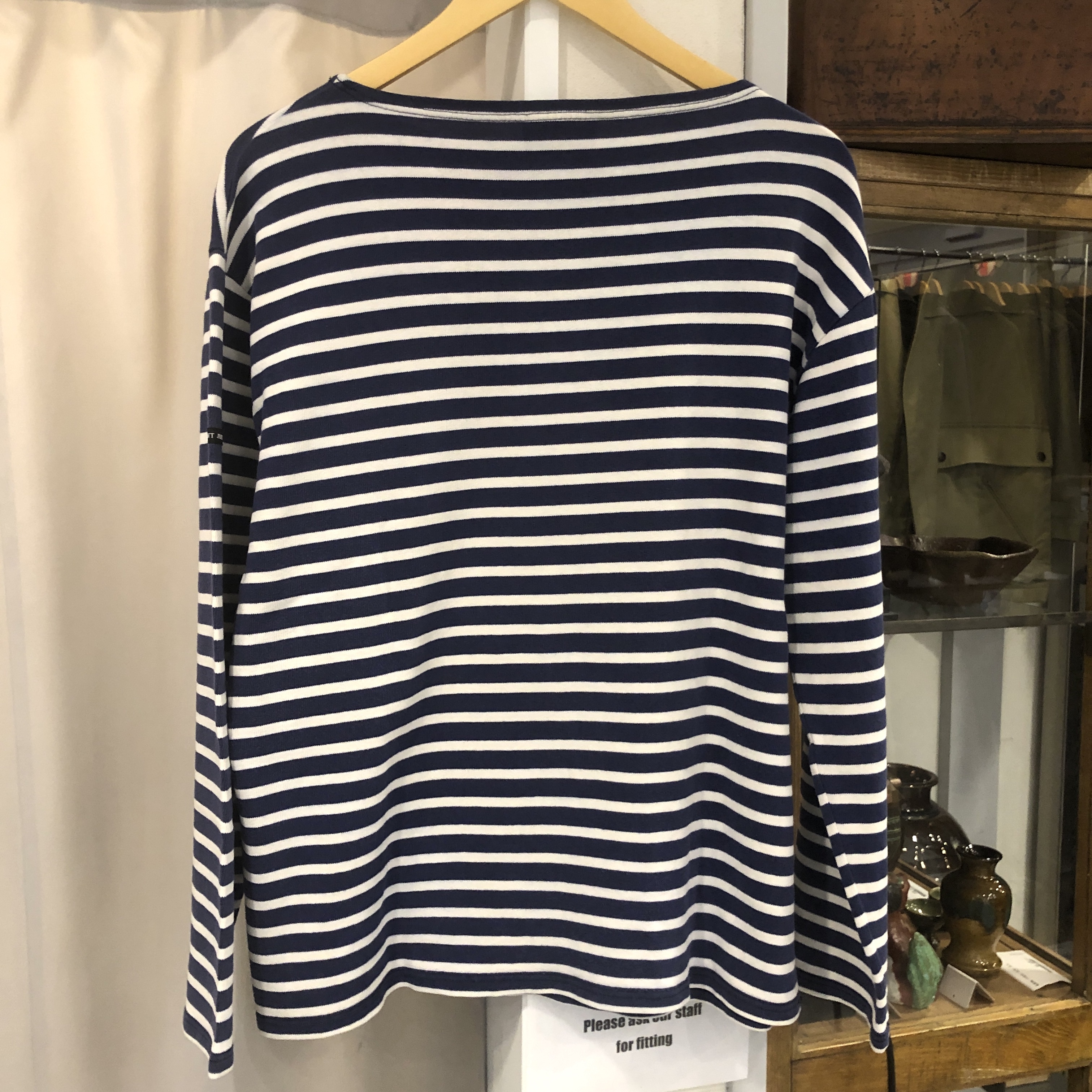 クラシックなボートネックと肩線の落ちたストレートなパターンは、重ね着にも最適。袖口にはブランドロゴのネームパッチを控えめに配置。製造はもちろんフランス自社工場で行われ、サイズはフランス表記6(国際サイズL)で、男女問わずゆとりあるシルエットを楽しめます。