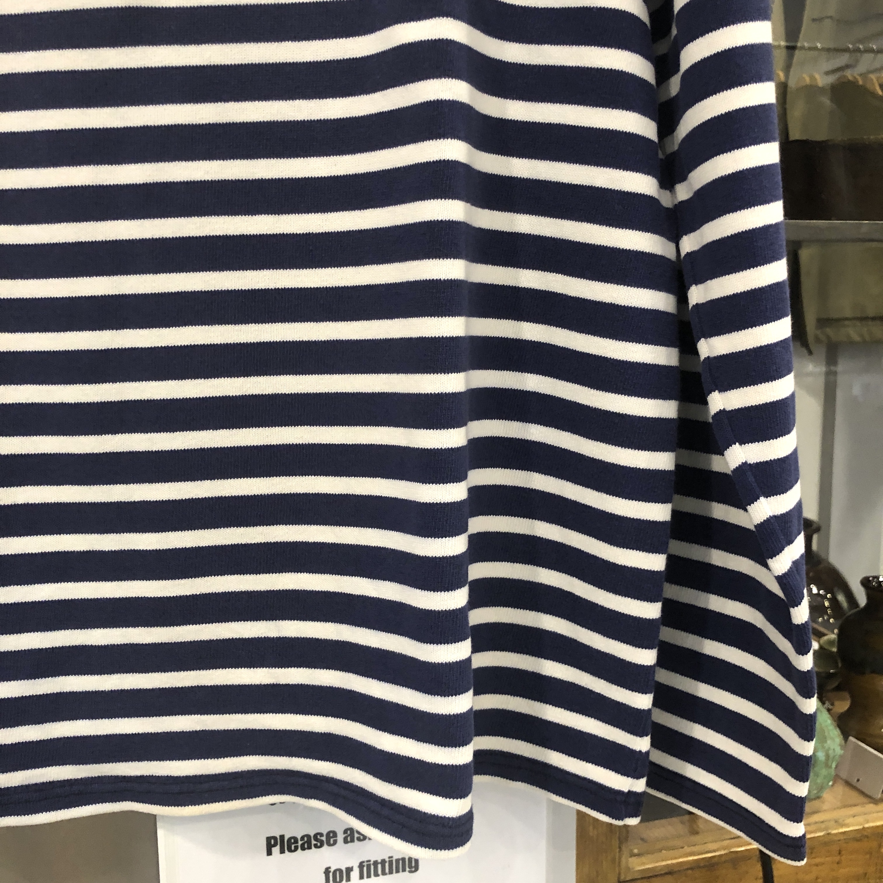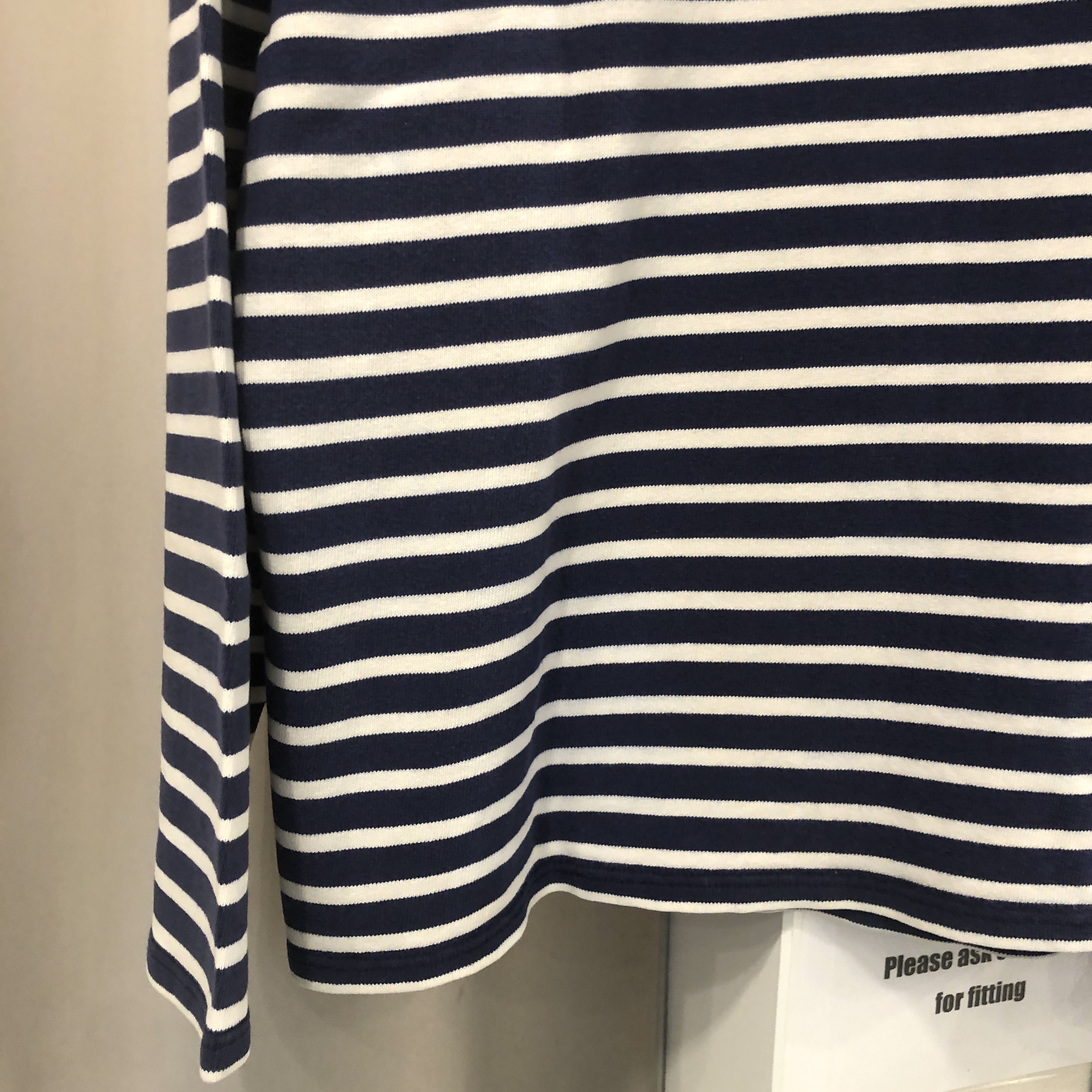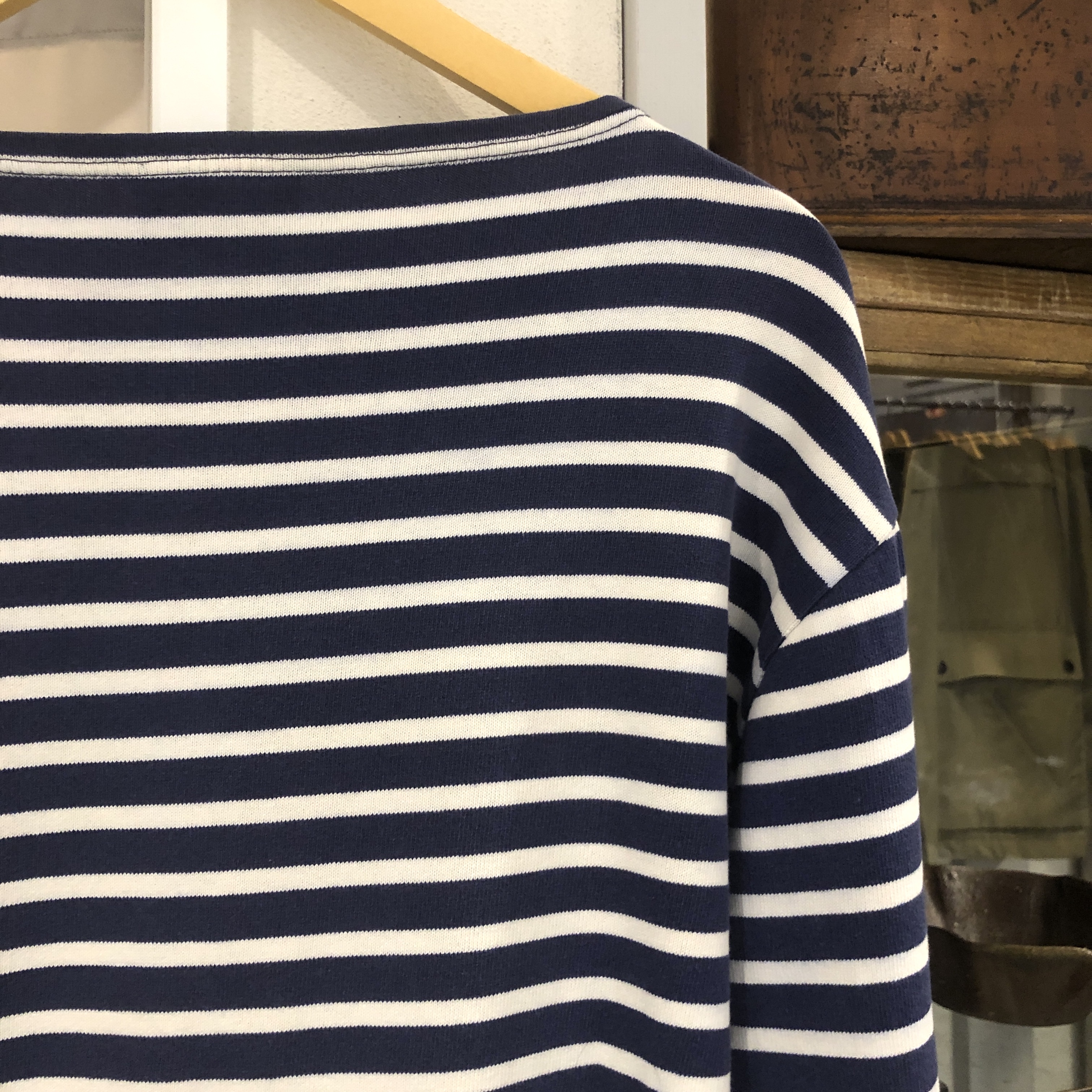 今回ご紹介するのは、落ち着いたネイビー/ ホワイトのボーダーカラー。ミリタリーやワークスタイルにも馴染み、カジュアルからシックまで幅広く対応します。素材は100%コットンの目の詰まった天竺生地。着始めはしっかりとした張り感があり、洗い込むことで徐々に柔らかく、肌馴染みの良い風合いへと育っていきます。