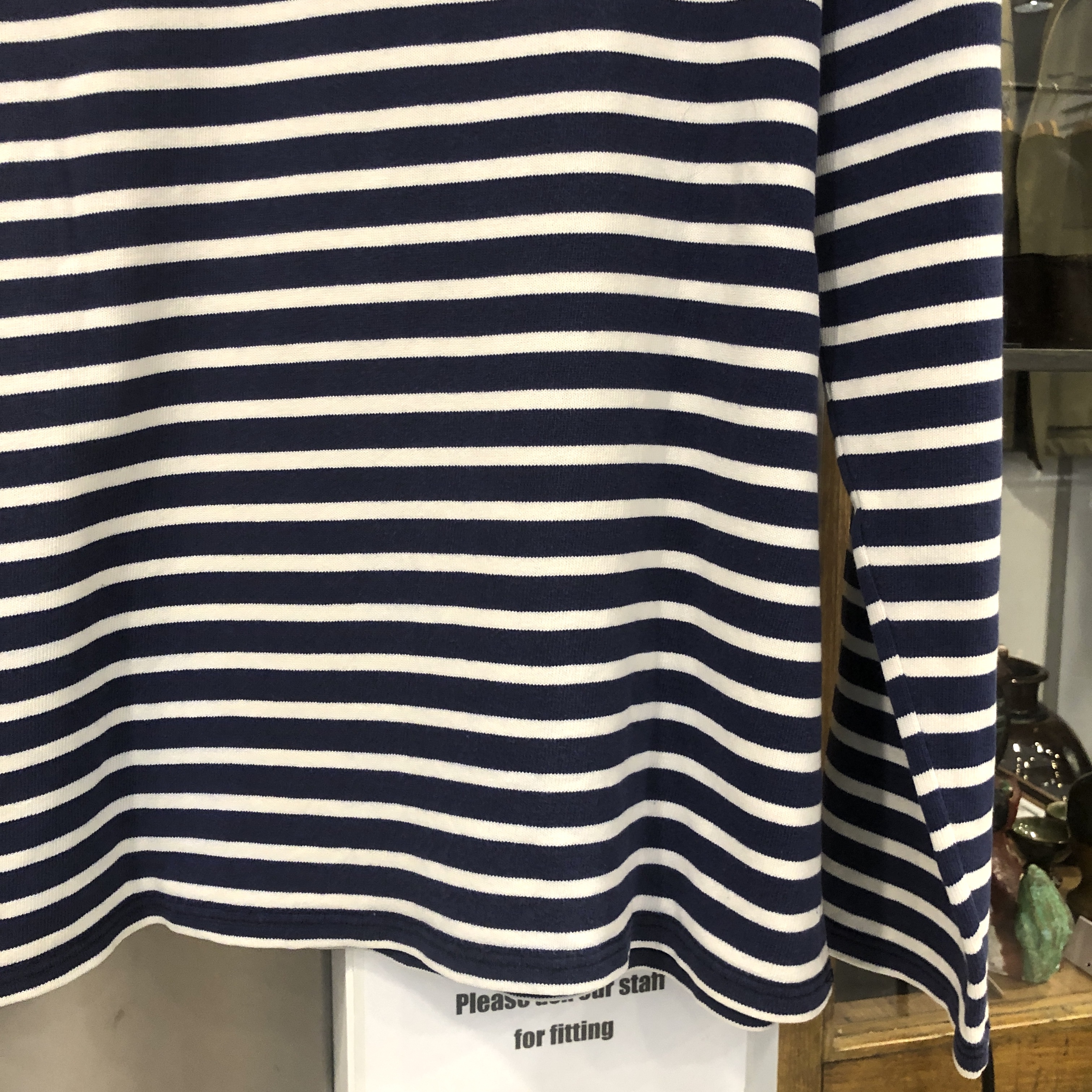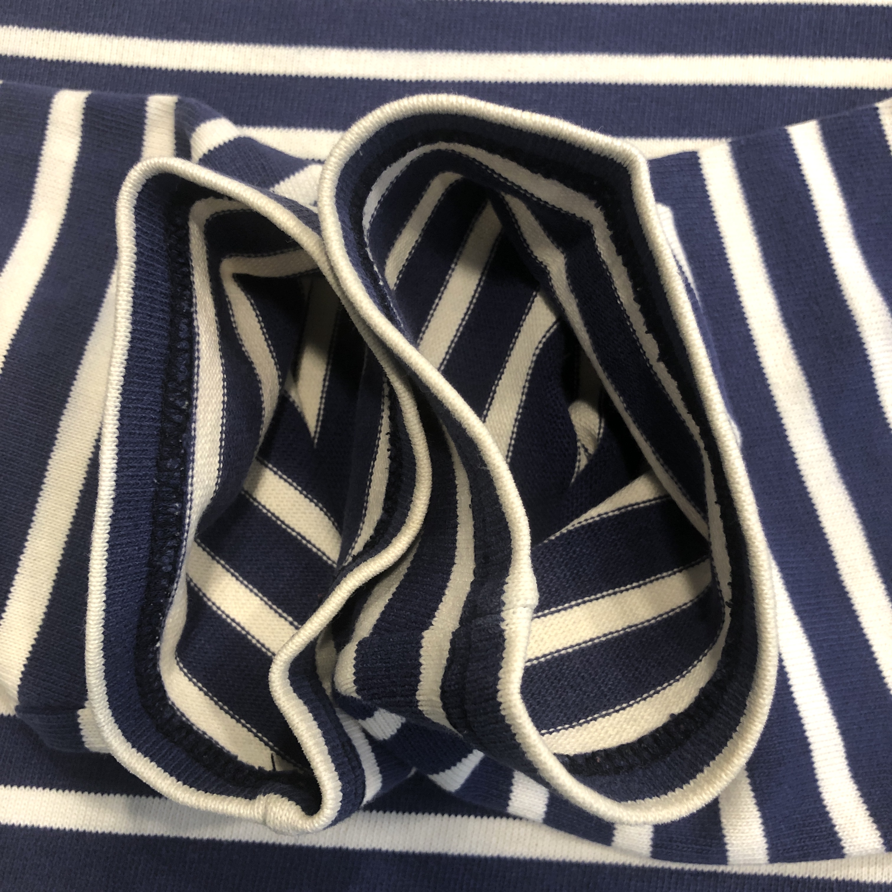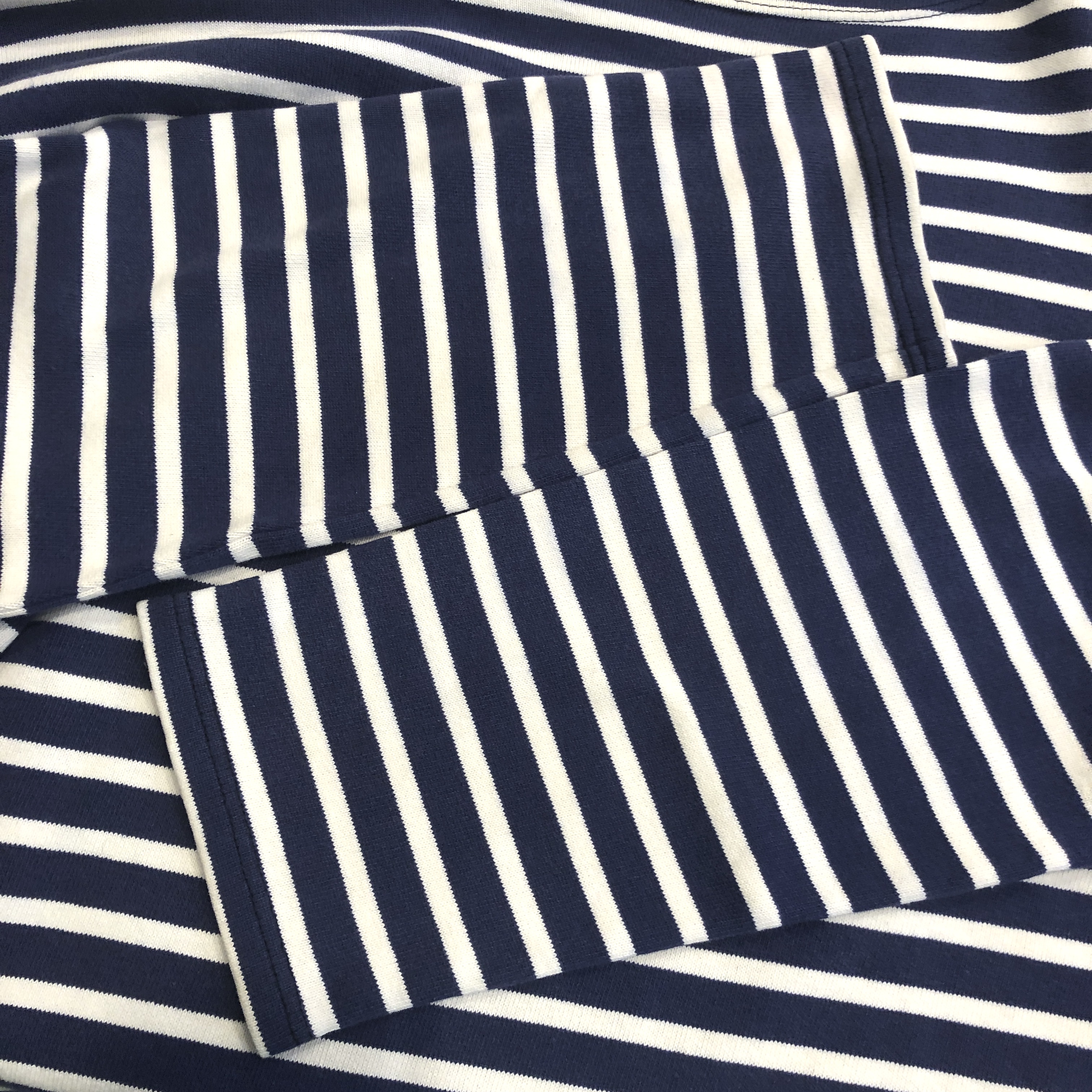 今回ご紹介するのは、落ち着いたネイビー/ ホワイトのボーダーカラー。ミリタリーやワークスタイルにも馴染み、カジュアルからシックまで幅広く対応します。素材は100%コットンの目の詰まった天竺生地。着始めはしっかりとした張り感があり、洗い込むことで徐々に柔らかく、肌馴染みの良い風合いへと育っていきます。