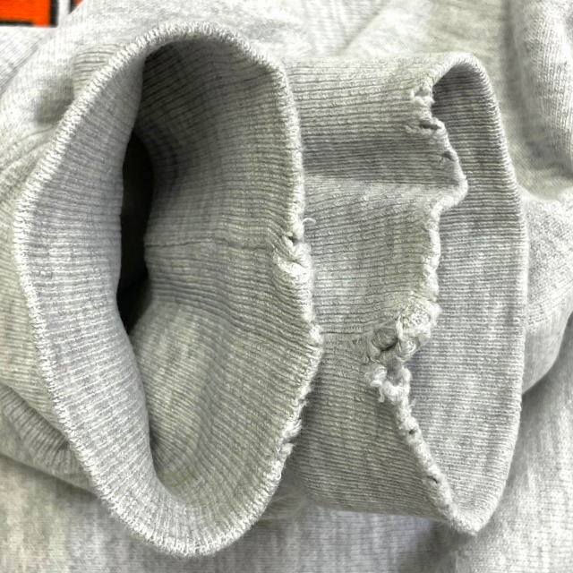 - 画像のように、ネック周りや袖口に破れがあり、前左脇腹付近に小穴がございます。