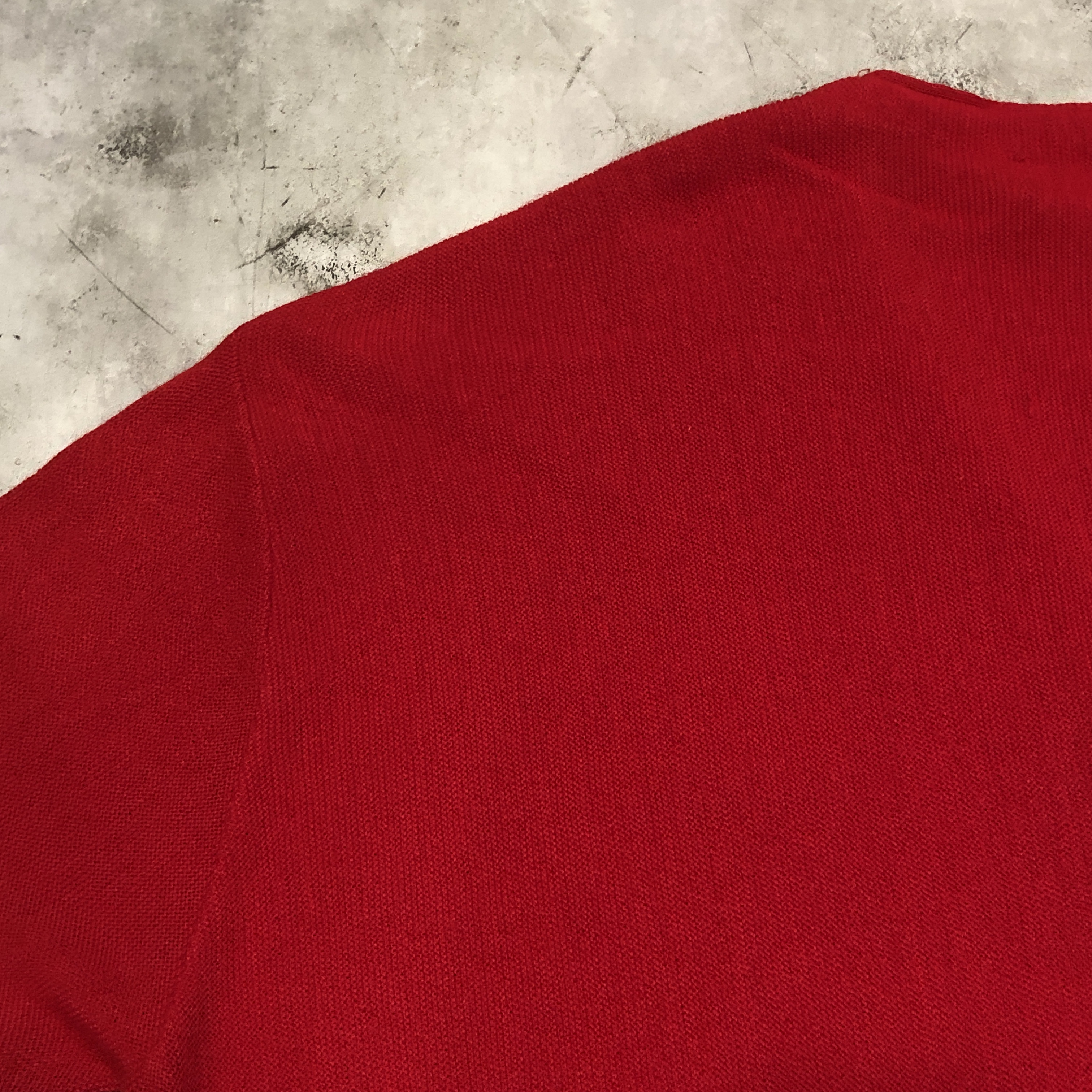 こちらは Made in U.S.A. のオリジナル仕様。100% Orlon Acrylic による軽やかな着心地と、ニットならではの柔らかな風合いが魅力です。汗を気にせず羽織れる実用性から、学生はもちろんジャズマンやアーティストたちにも愛用され、当時のアメリカ文化を象徴する一枚となりました。