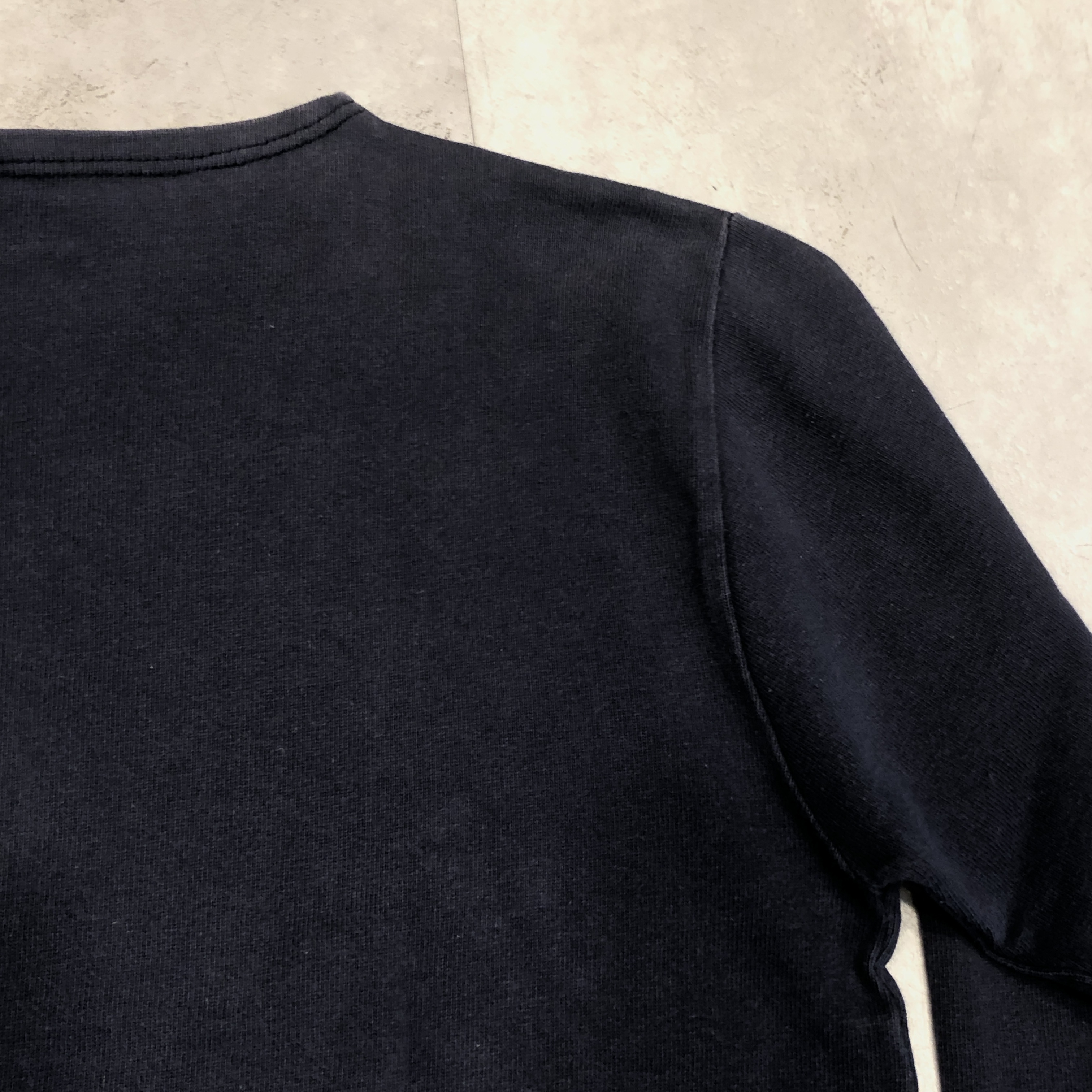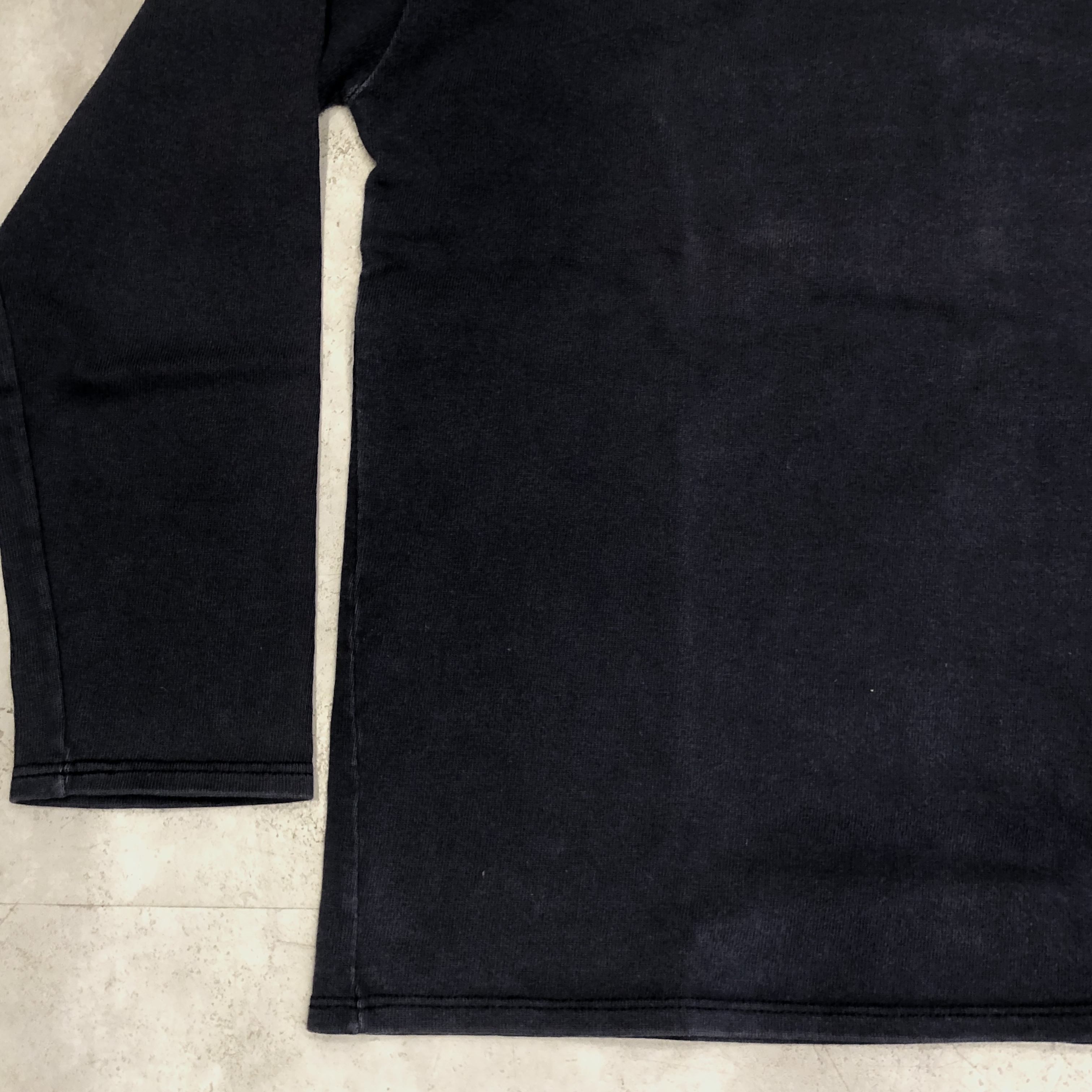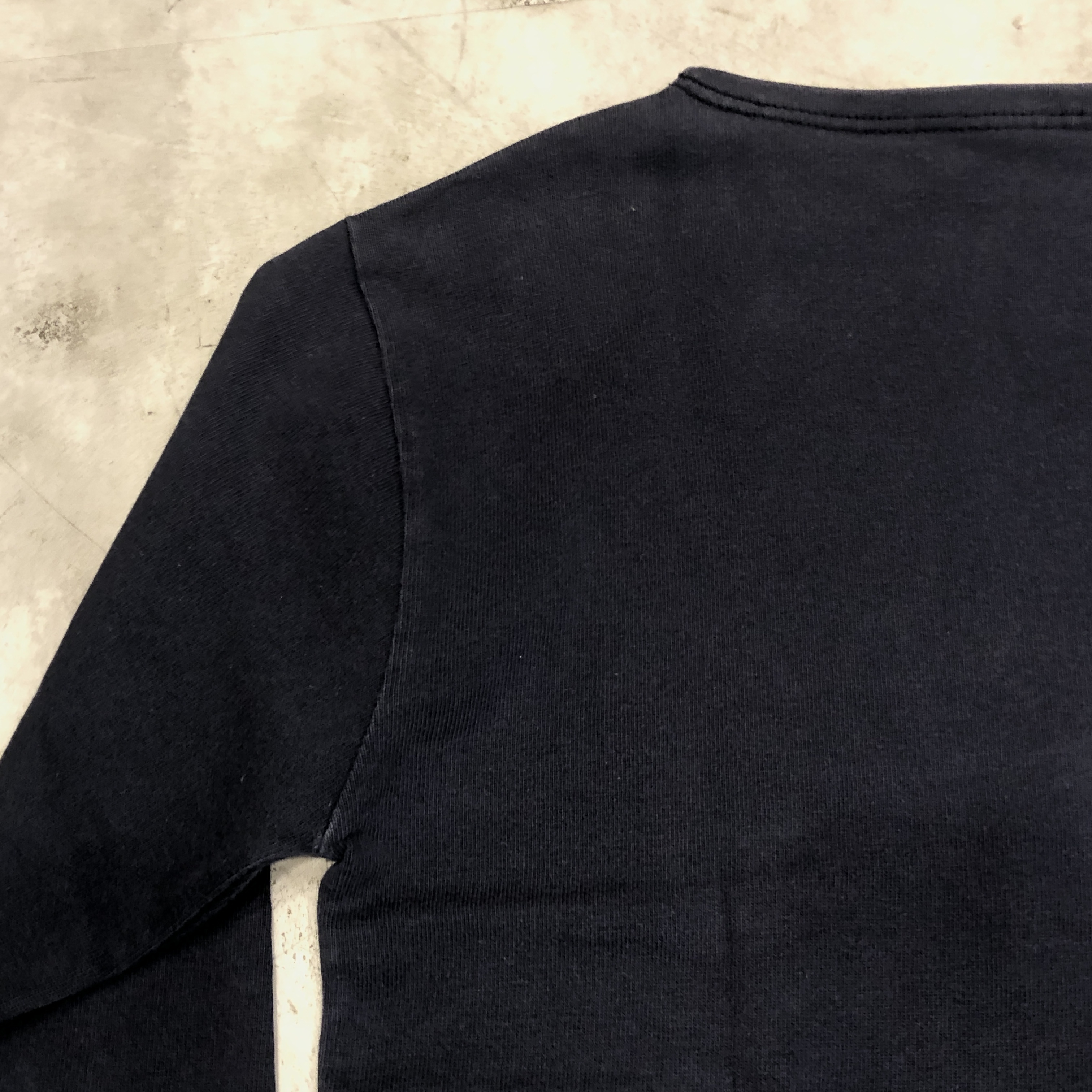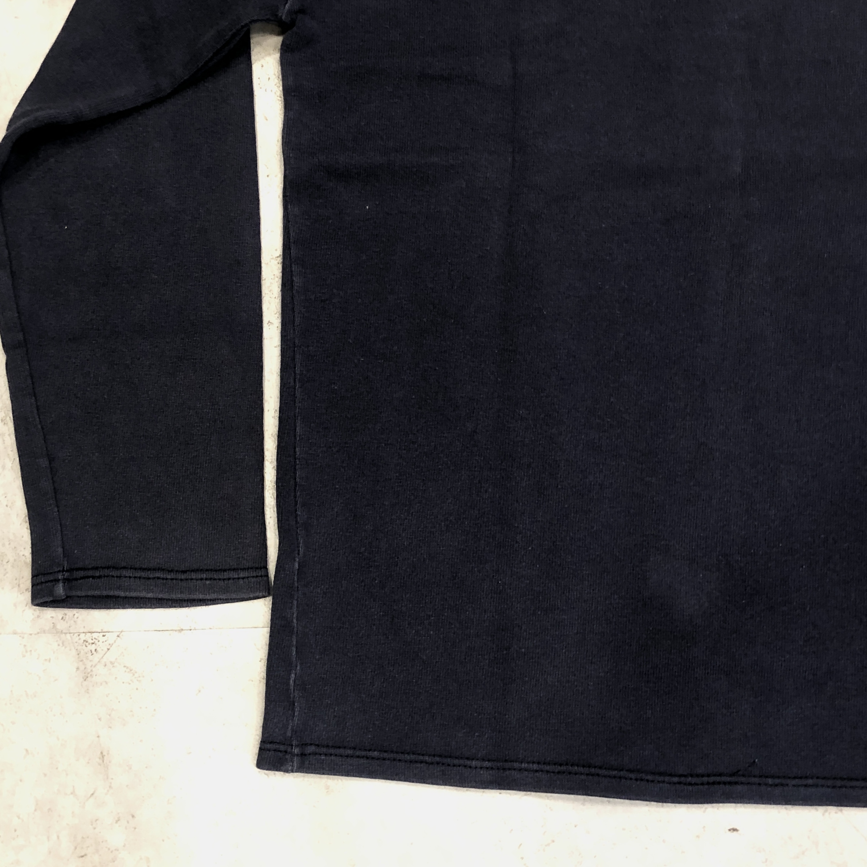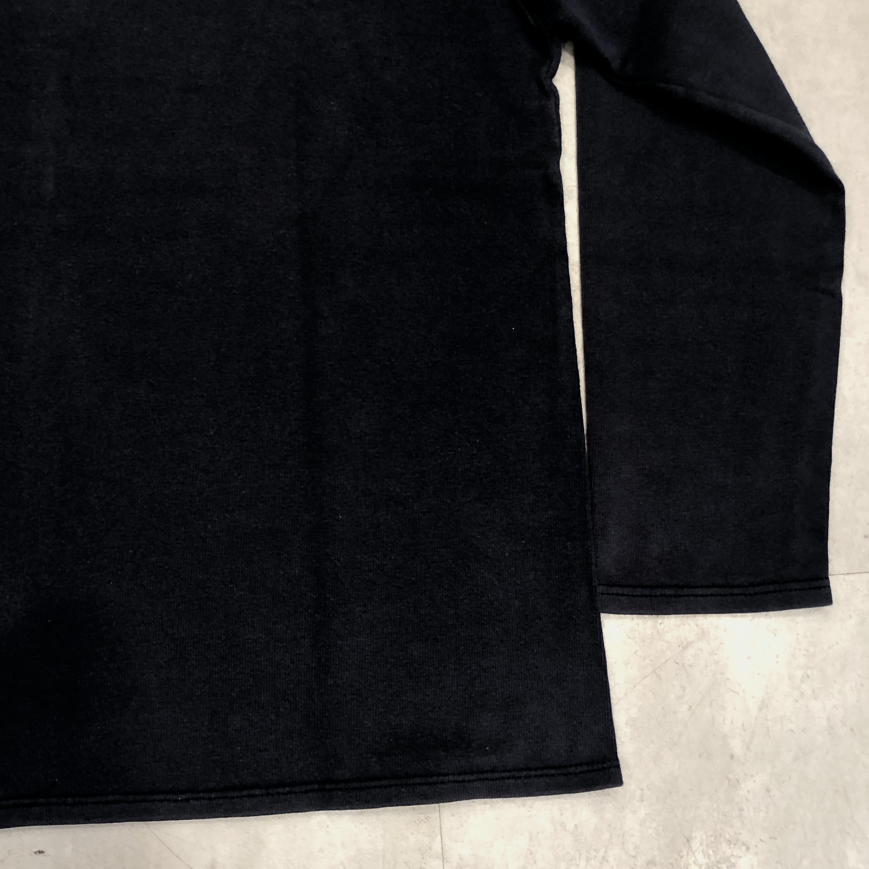 今回ご紹介するのは、落ち着いたネイビーのソリッドカラー。ミリタリーやワークスタイルにも馴染み、カジュアルからシックまで幅広く対応します。素材は100%コットンの目の詰まった天竺生地。着始めはしっかりとした張り感があり、洗い込むことで徐々に柔らかく、肌馴染みの良い風合いへと育っていきます。