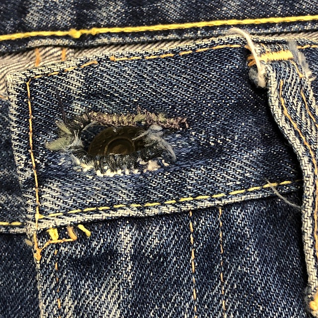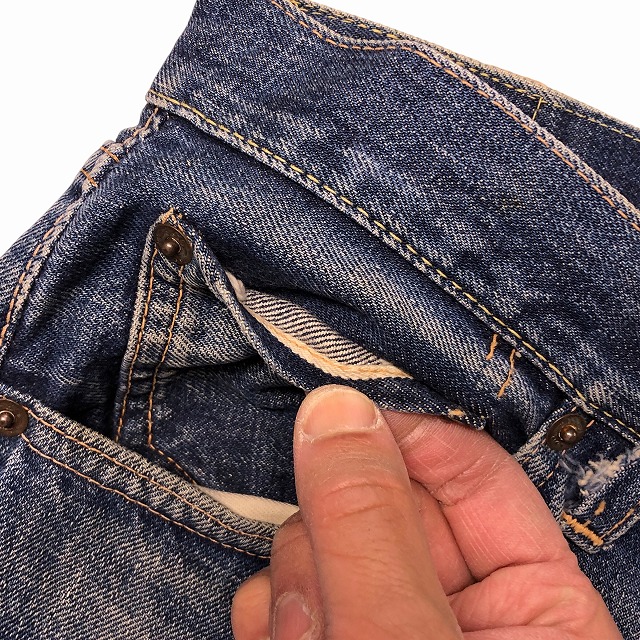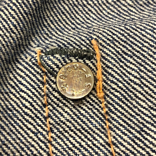 - トップボタン裏刻印『J』、均等V、隠しリベット有り、コインポケット耳付き