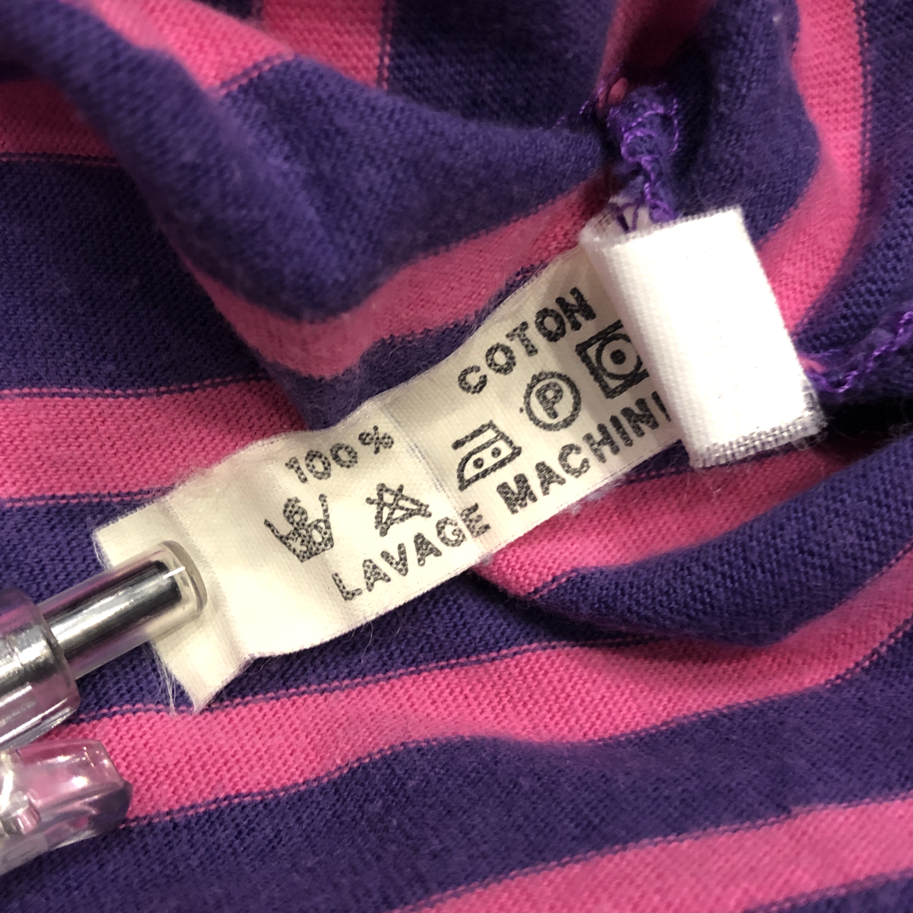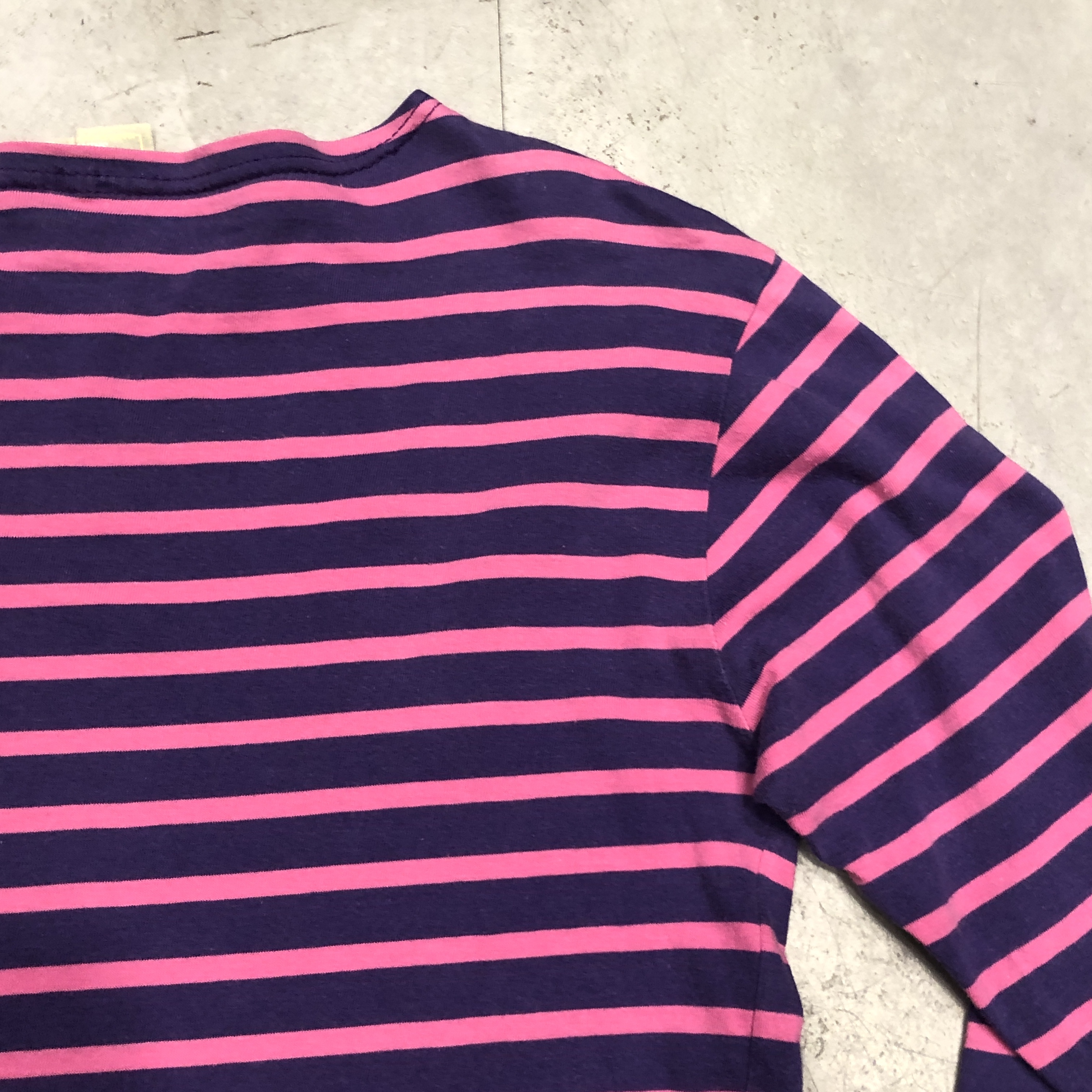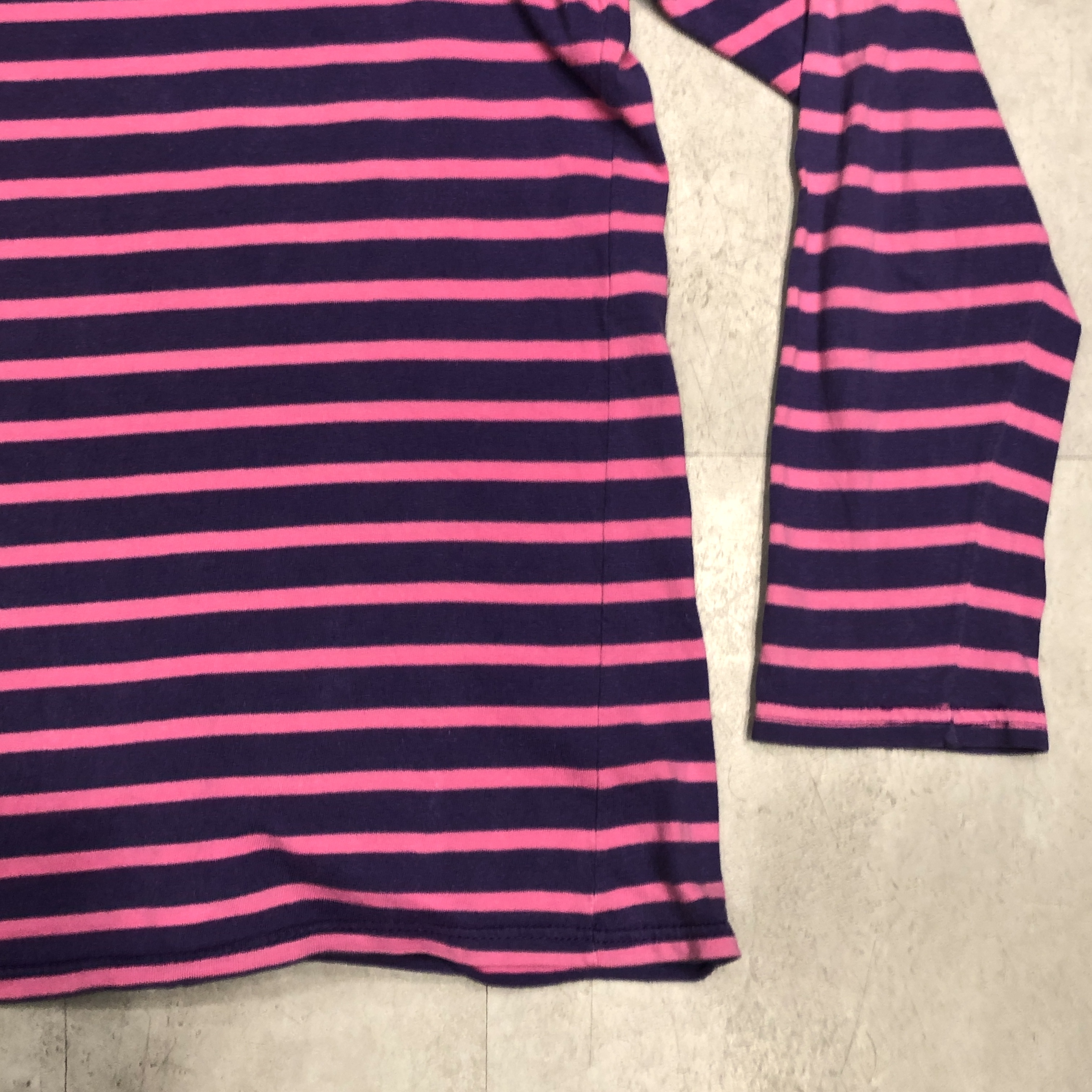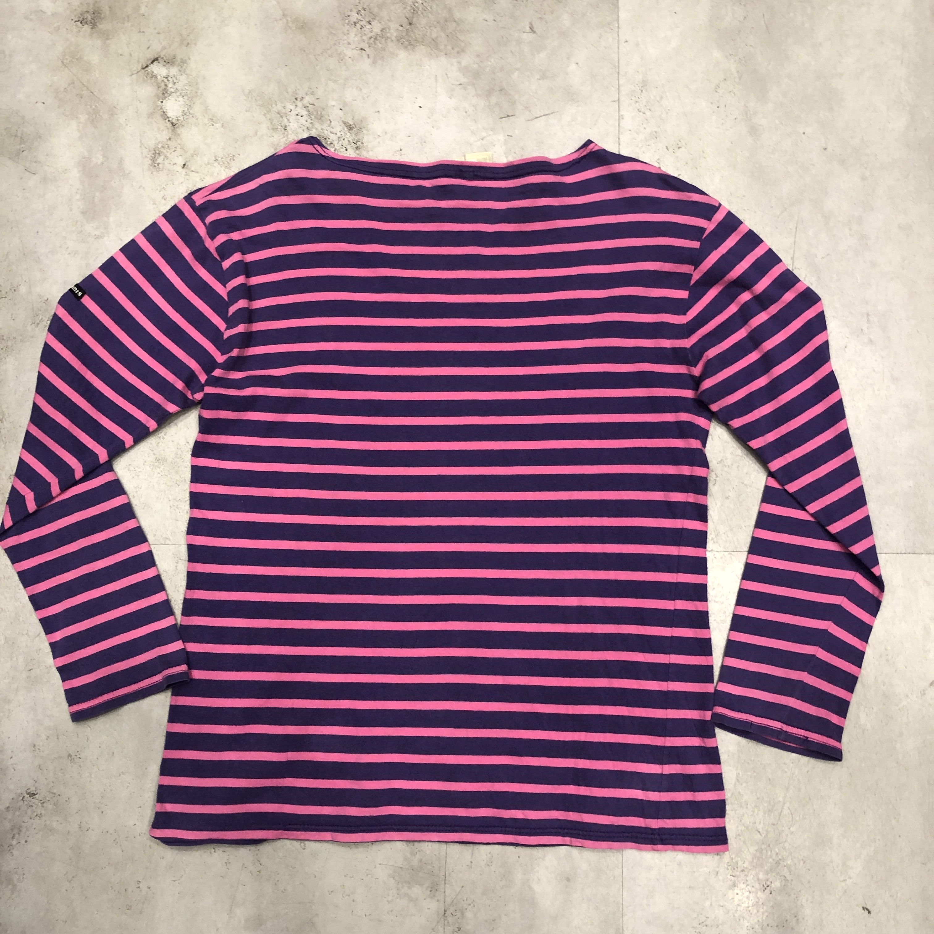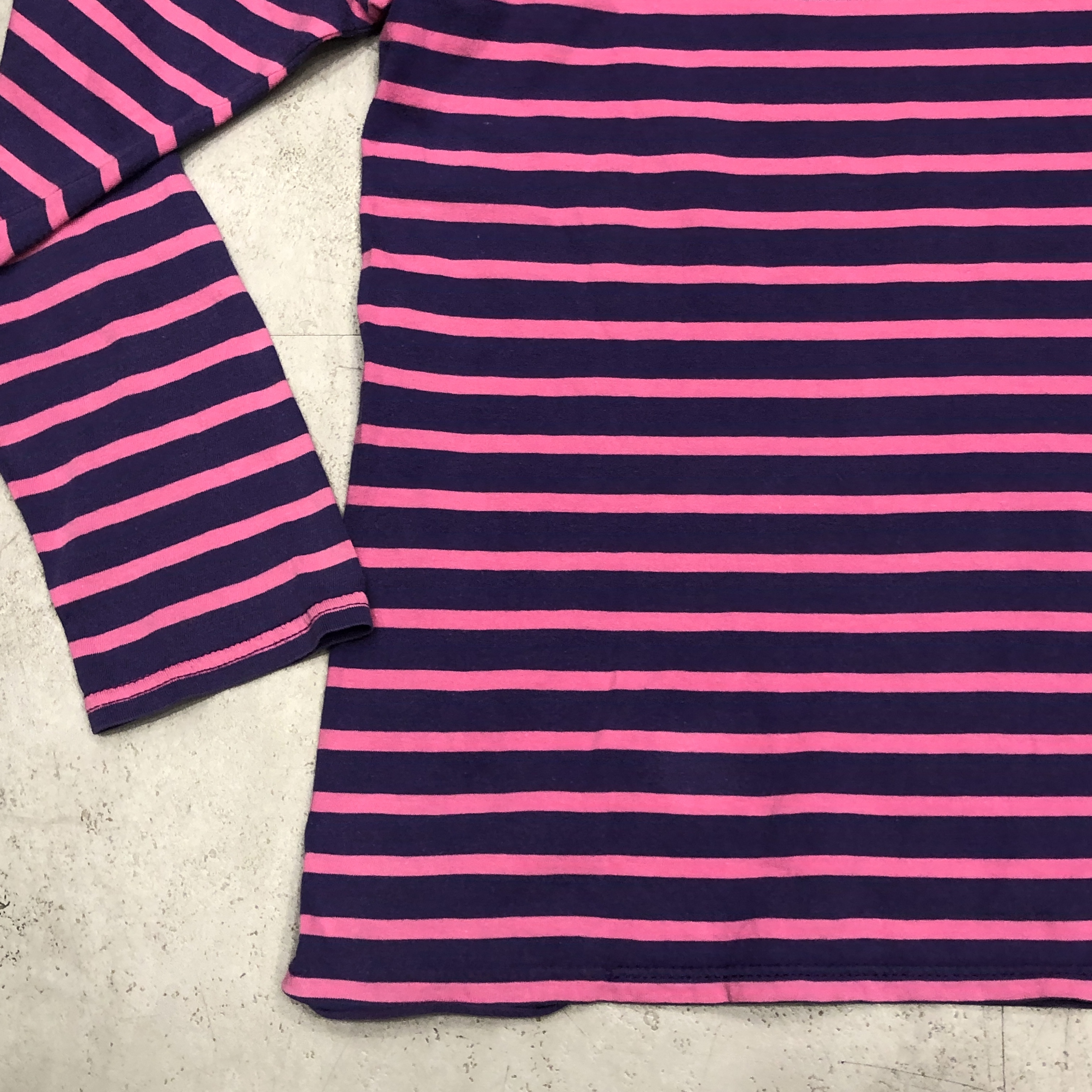 ボートネックにフレンチらしい軽やかなコットン地、ピンク×パープルのバスクボーダー配色は、やや細めピッチで洗練された印象。