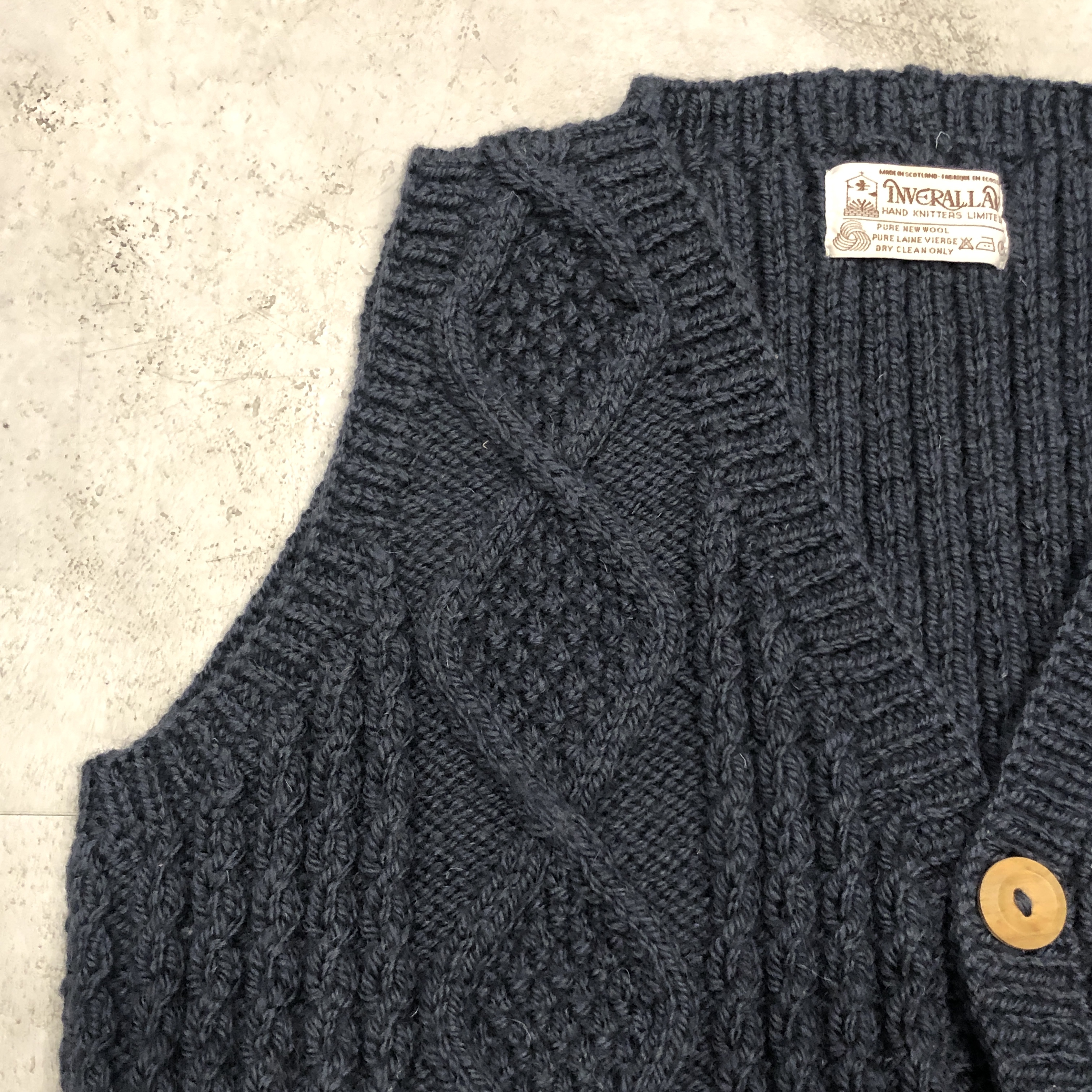 - スコットランド西岸、クライド湾沿いの小さな港町で、熟練のニッターによって一針一針編み上げられる〈INVERALLAN〉。こちらは「9H」ニットベスト、ウール仕様です。