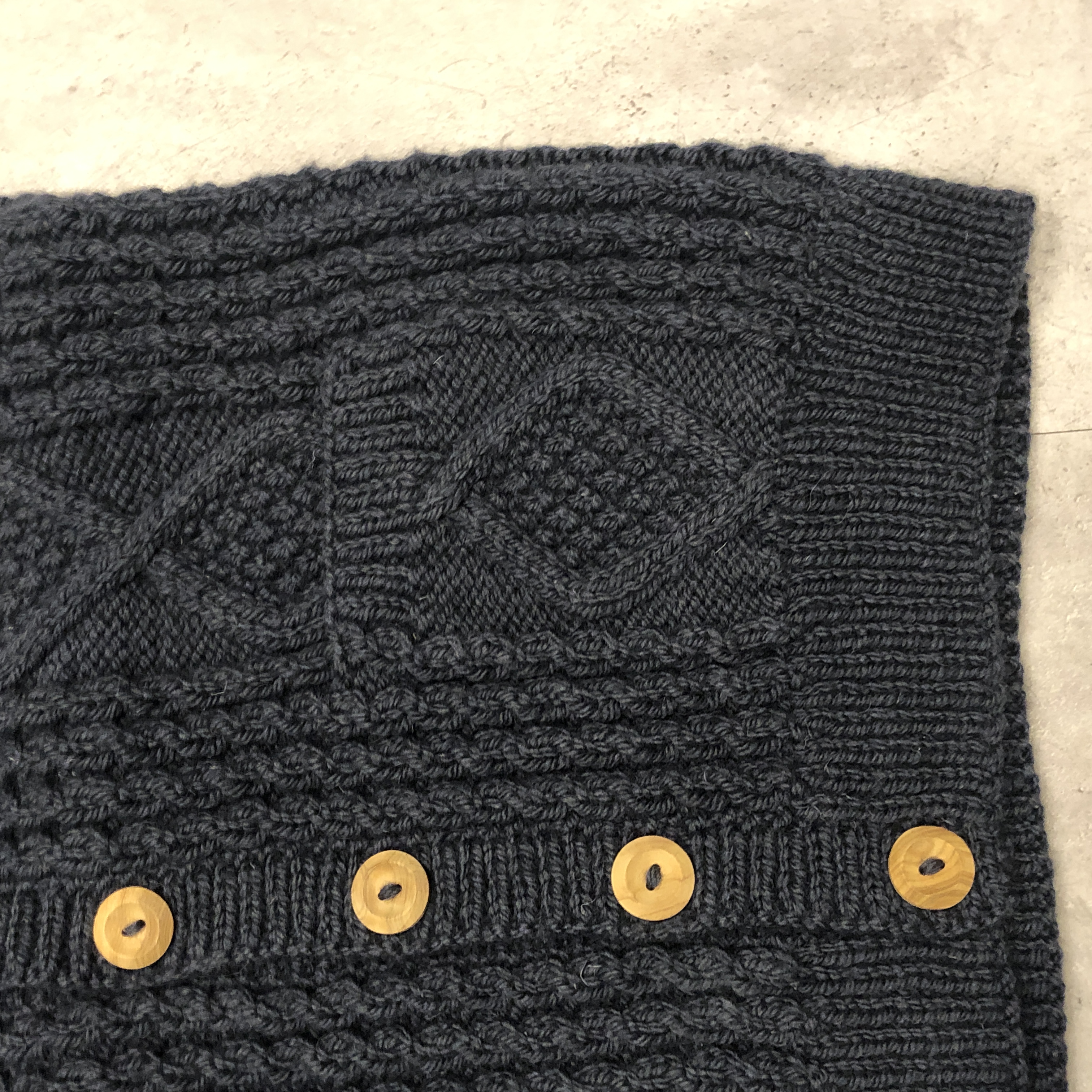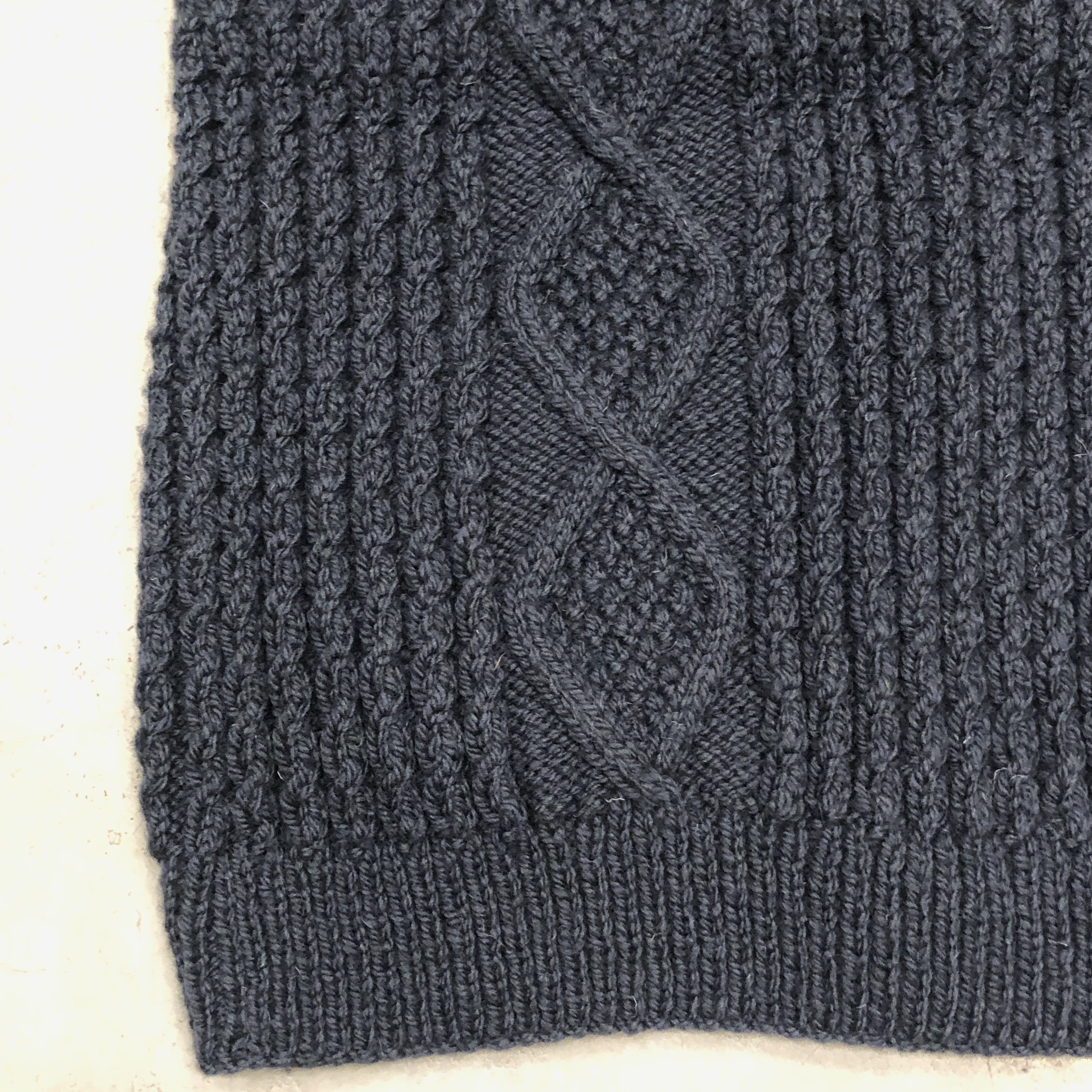 伝統的なアラン編みのパターンを余すところなく配し、深みのあるネイビーカラーは、ジーンズやチノはもちろん、ホワイトデニムやミリタリーパンツにも好相性。ハンドニット特有のふっくらとした編み目は、着るほどに体に馴染み、長年の愛用でさらに味わいを増していきます。