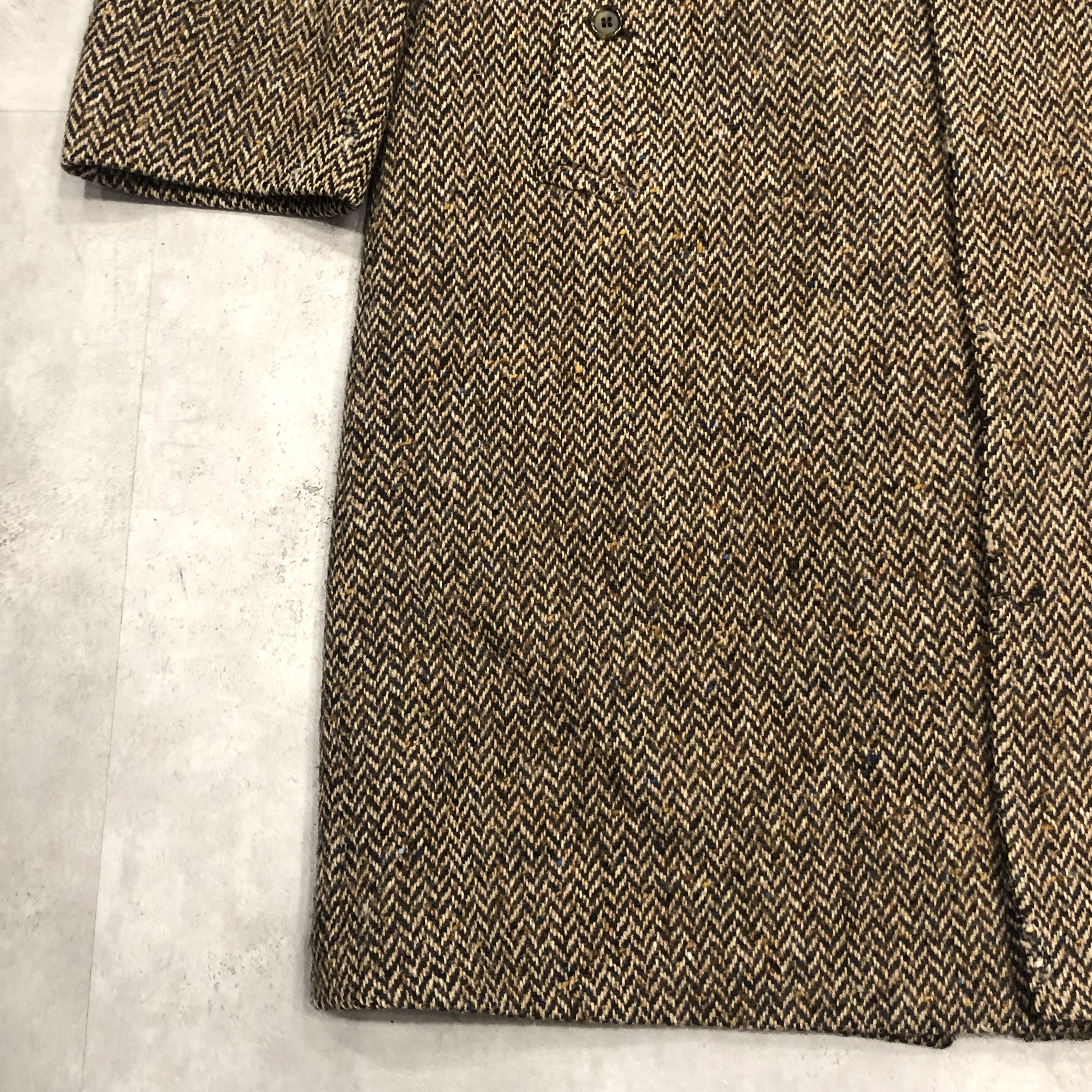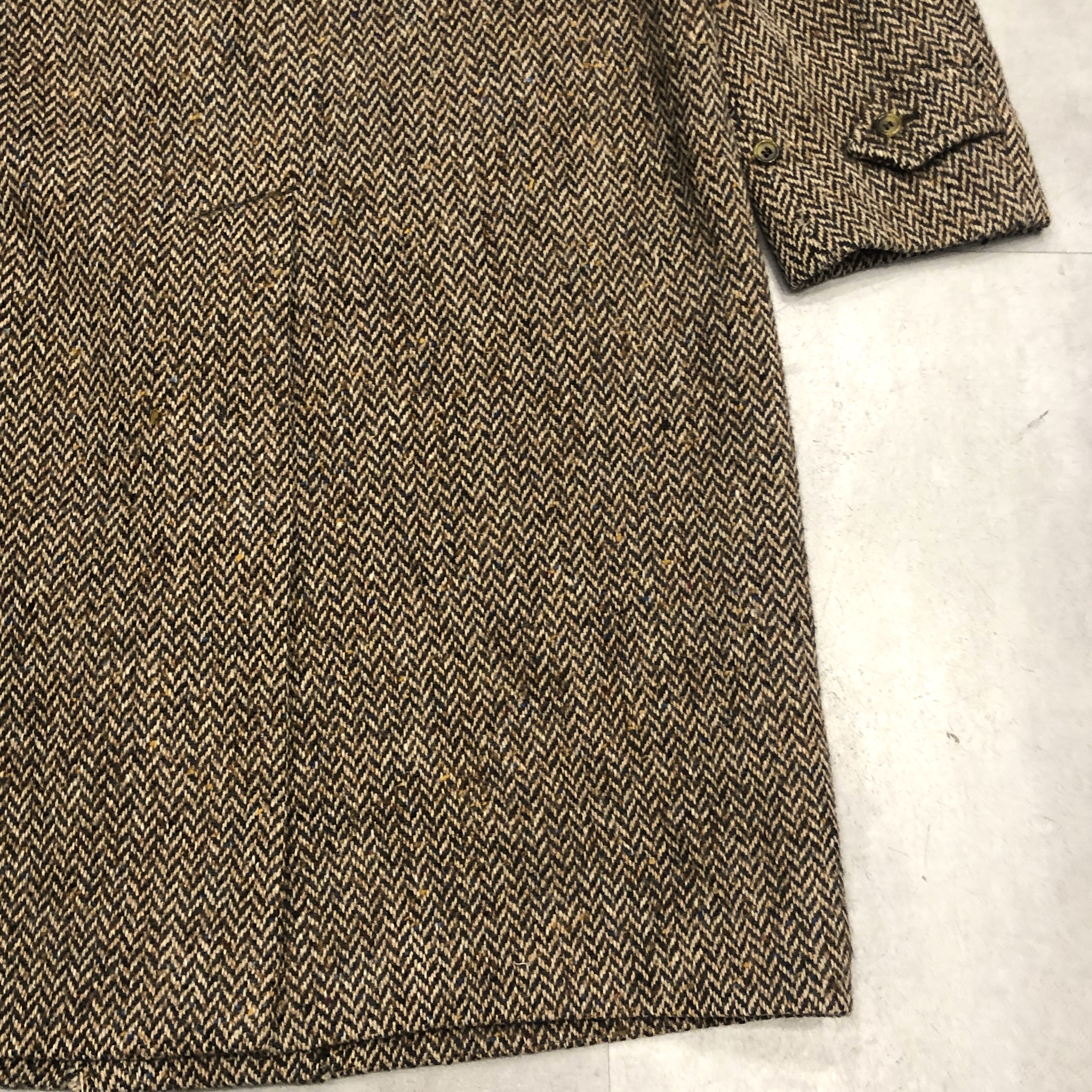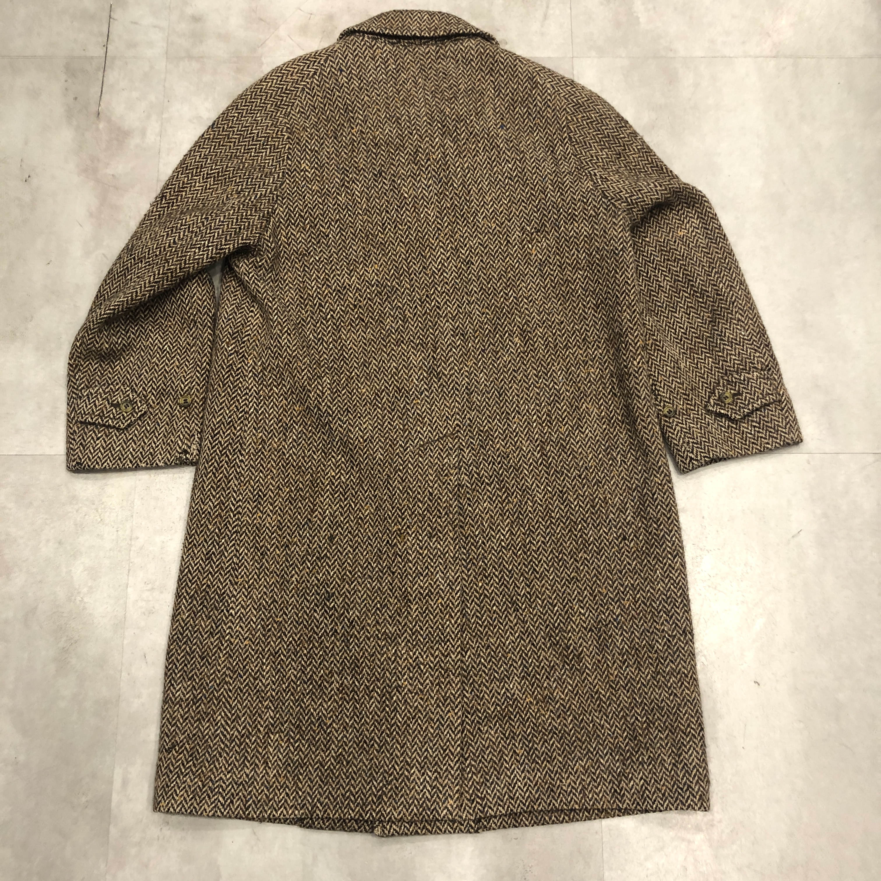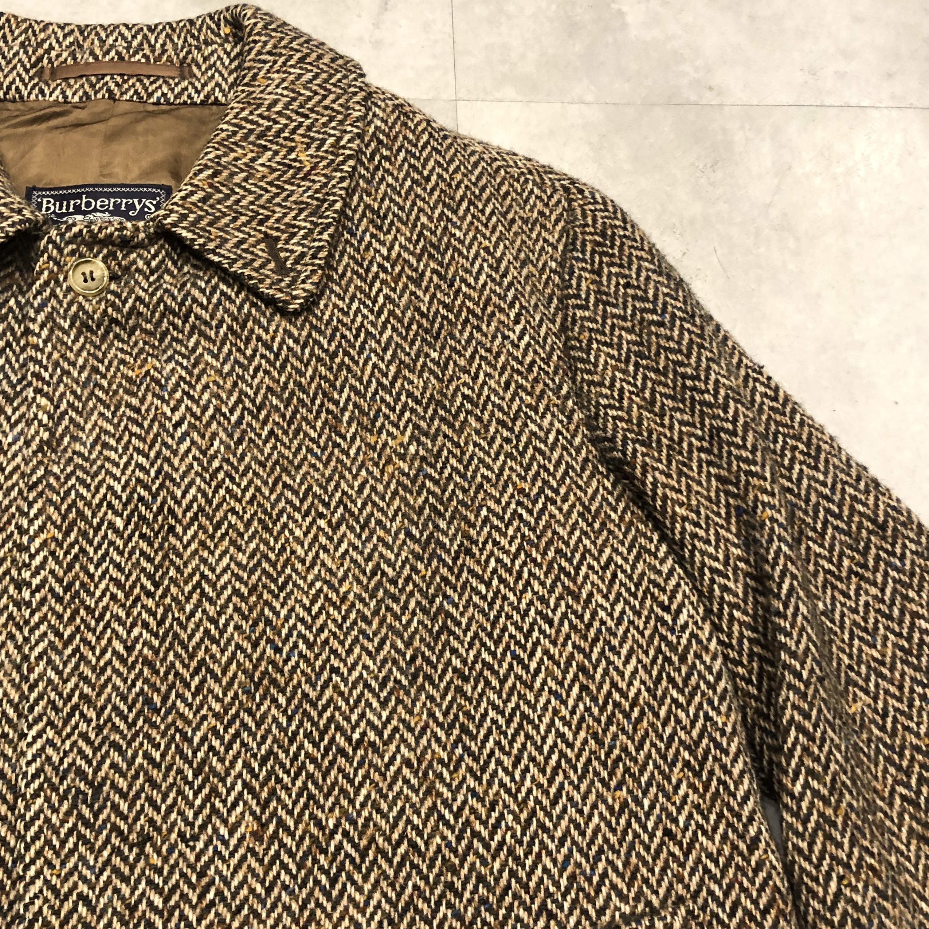 - 老舗バーバリーが誇るアイリッシュツイードを贅沢に使った一枚。80年代頃の「Burberrys’」タグを備えた伝統と風格を纏う英国製コートです。肩から袖にかけての美しい曲線を描くスプリットラグランスリーブが、どの角度から見てもエレガントな立ち姿を演出。