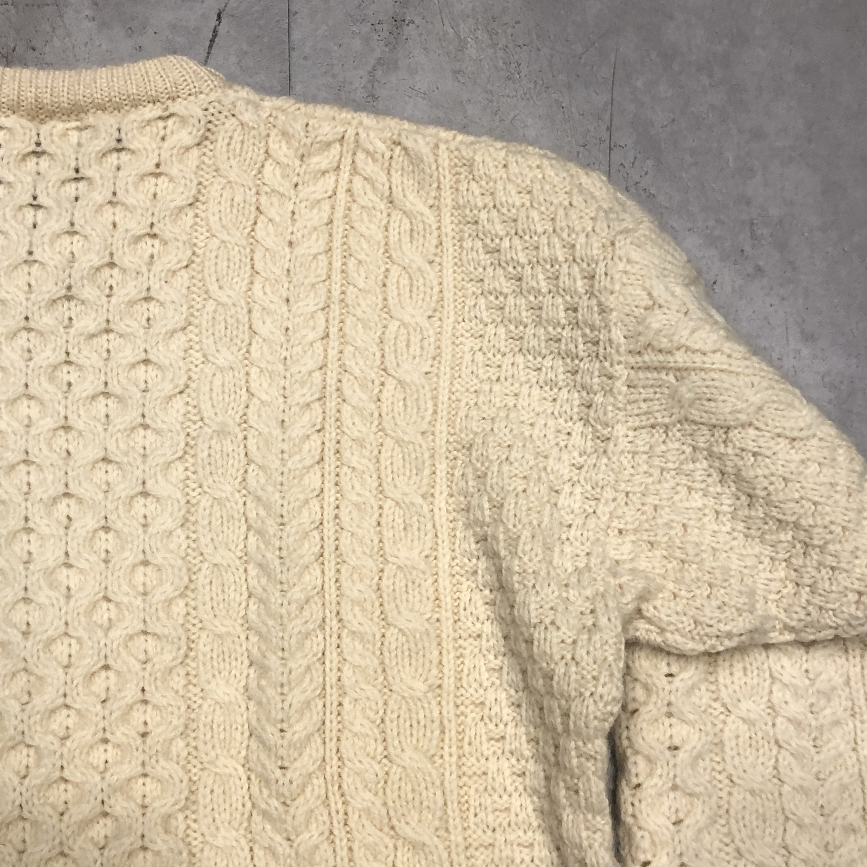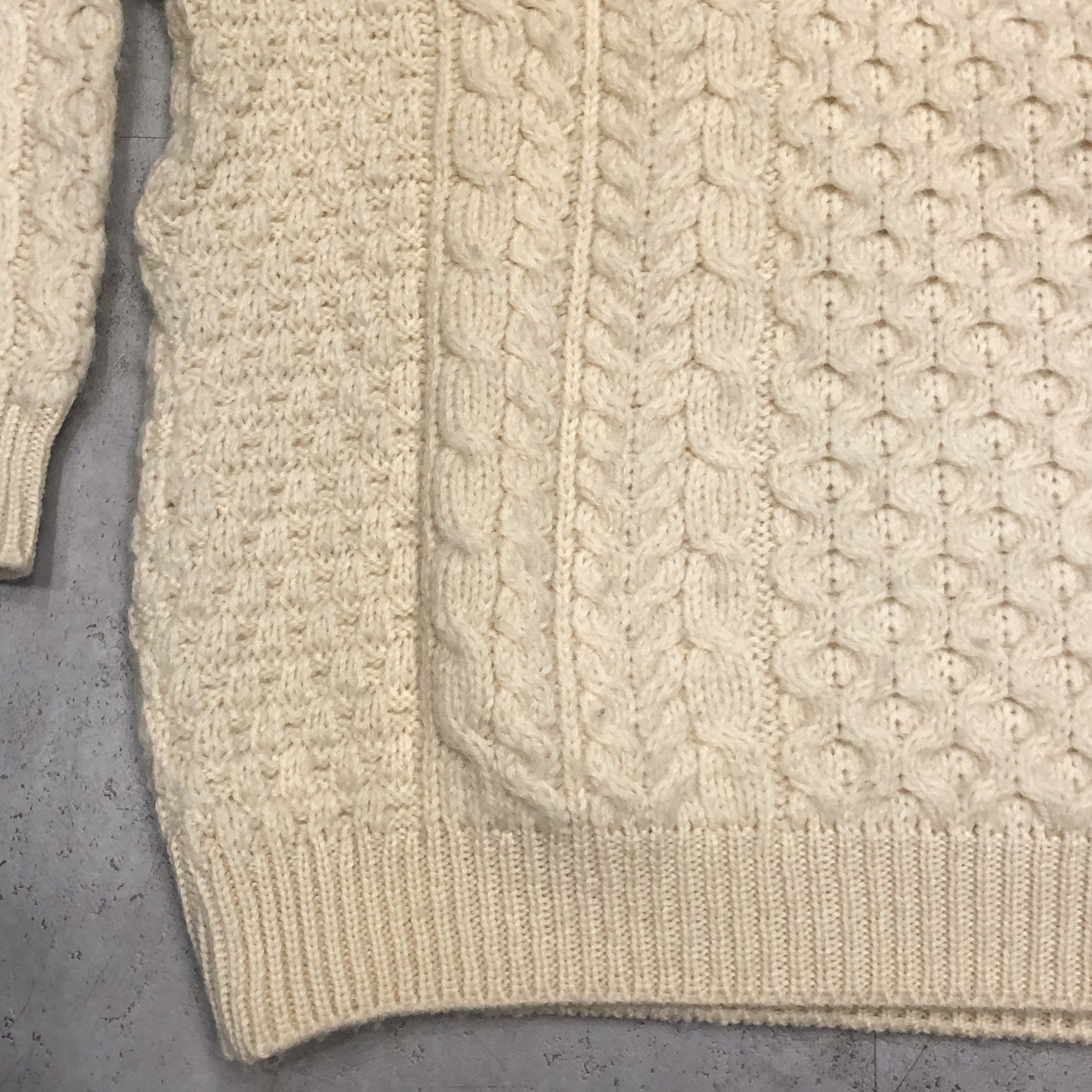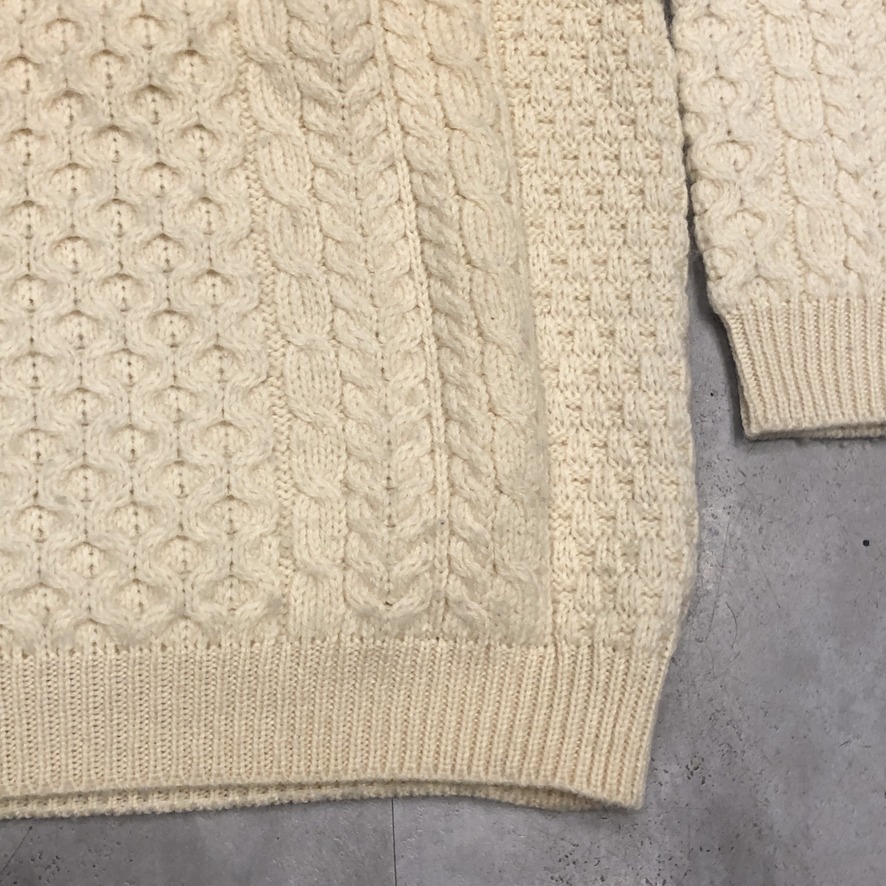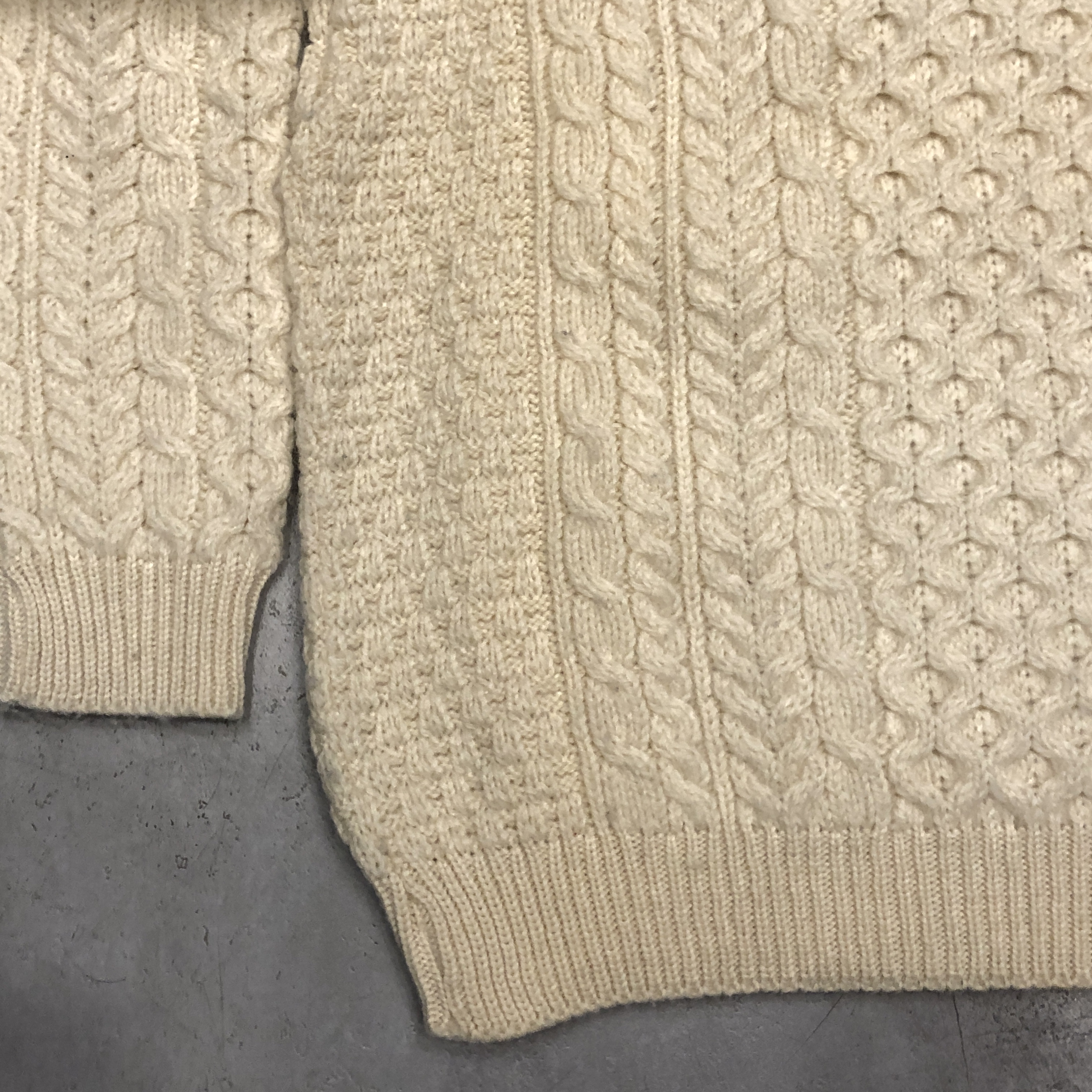 伝統的なアラン編みのパターンを余すところなく配し、柔らかなアイボリーカラーは、ジーンズやチノはもちろん、ホワイトデニムやミリタリーパンツにも好相性。ハンドニット特有のふっくらとした編み目は、着るほどに体に馴染み、長年の愛用でさらに味わいを増していきます。