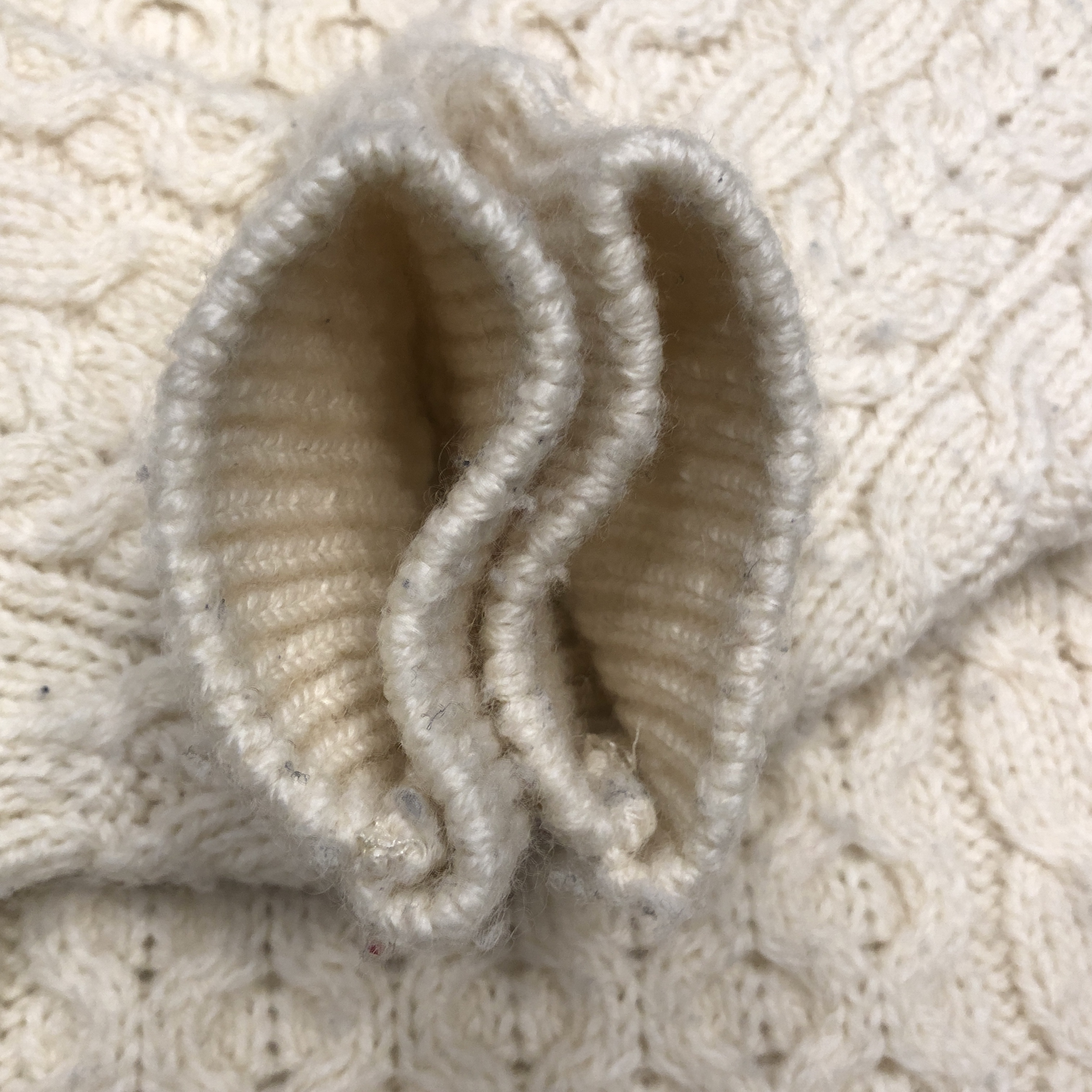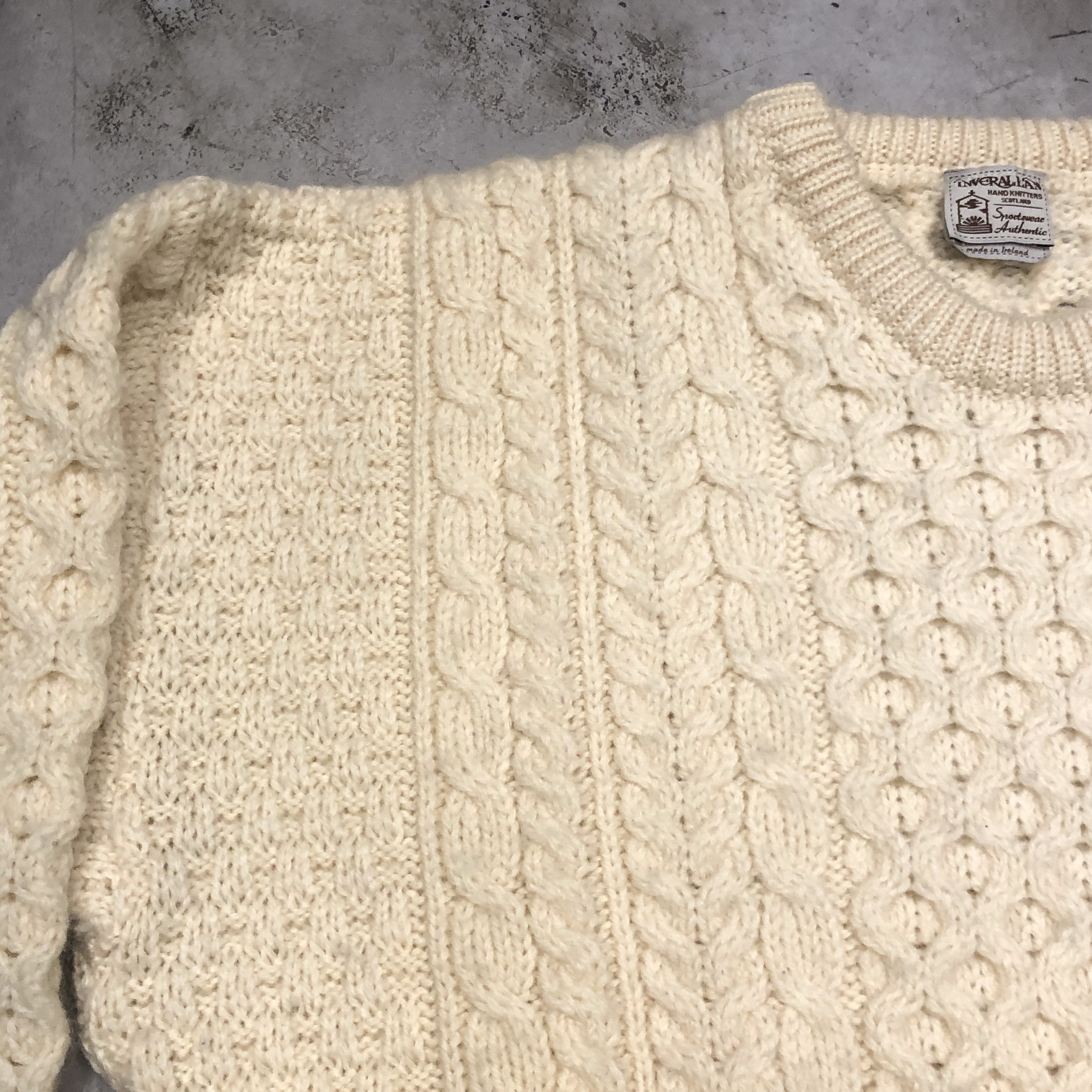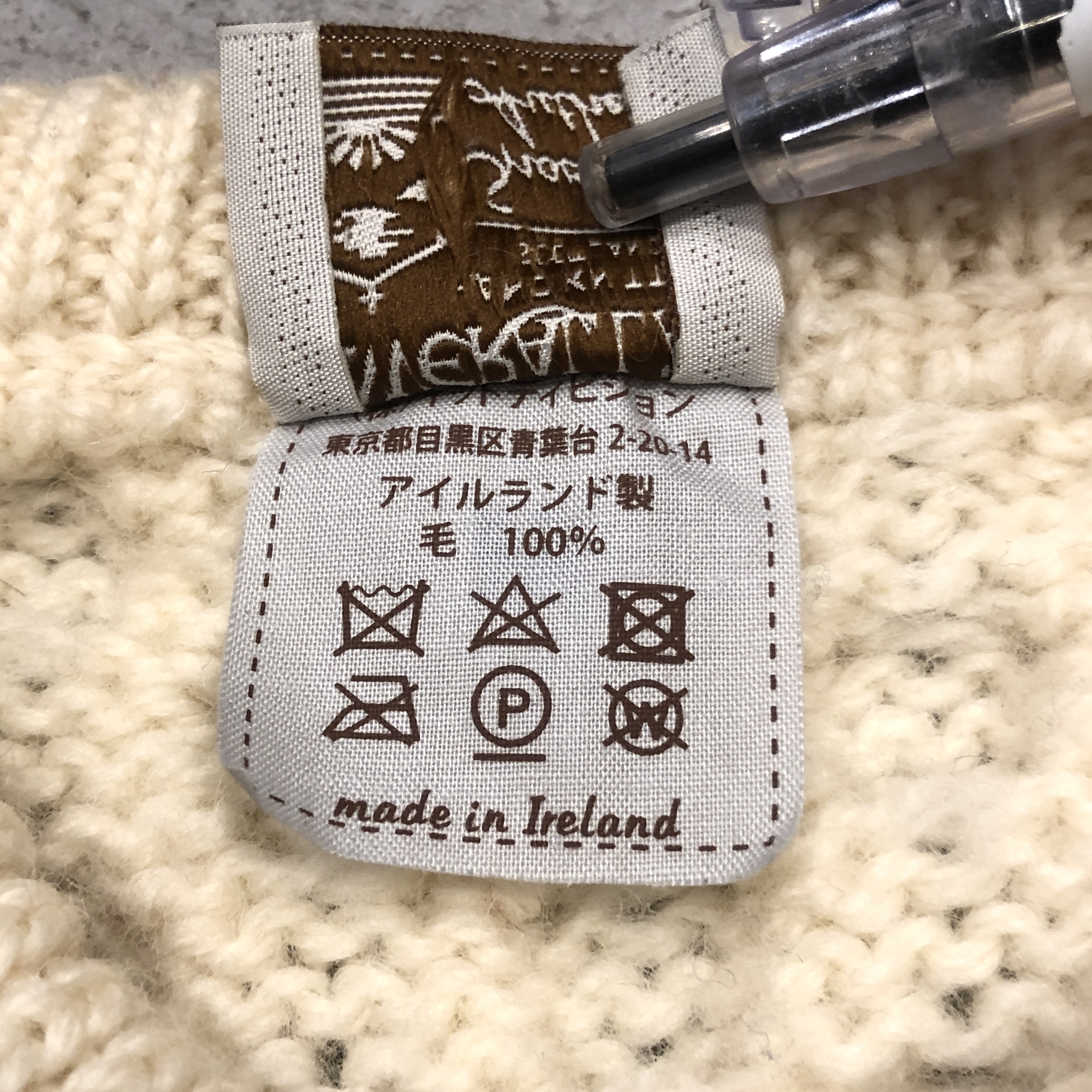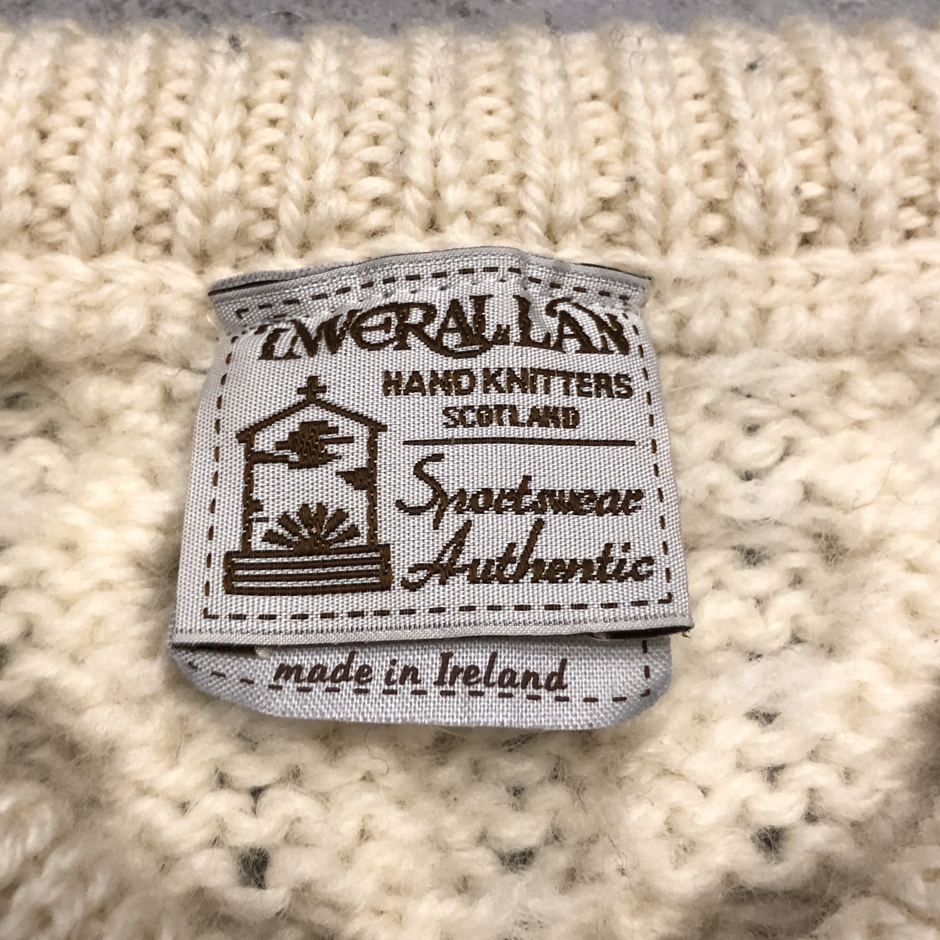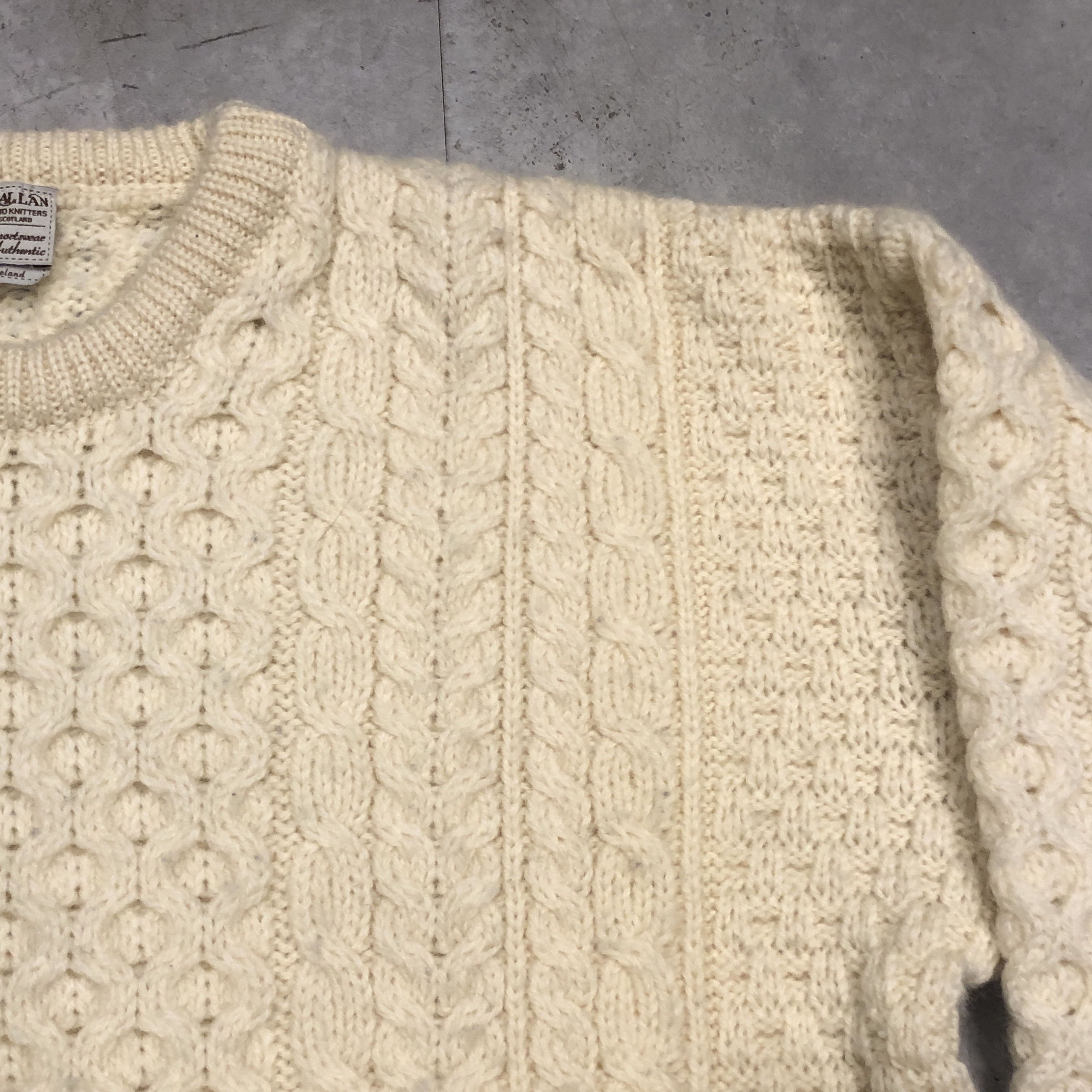 伝統的なアラン編みのパターンを余すところなく配し、柔らかなアイボリーカラーは、ジーンズやチノはもちろん、ホワイトデニムやミリタリーパンツにも好相性。ハンドニット特有のふっくらとした編み目は、着るほどに体に馴染み、長年の愛用でさらに味わいを増していきます。