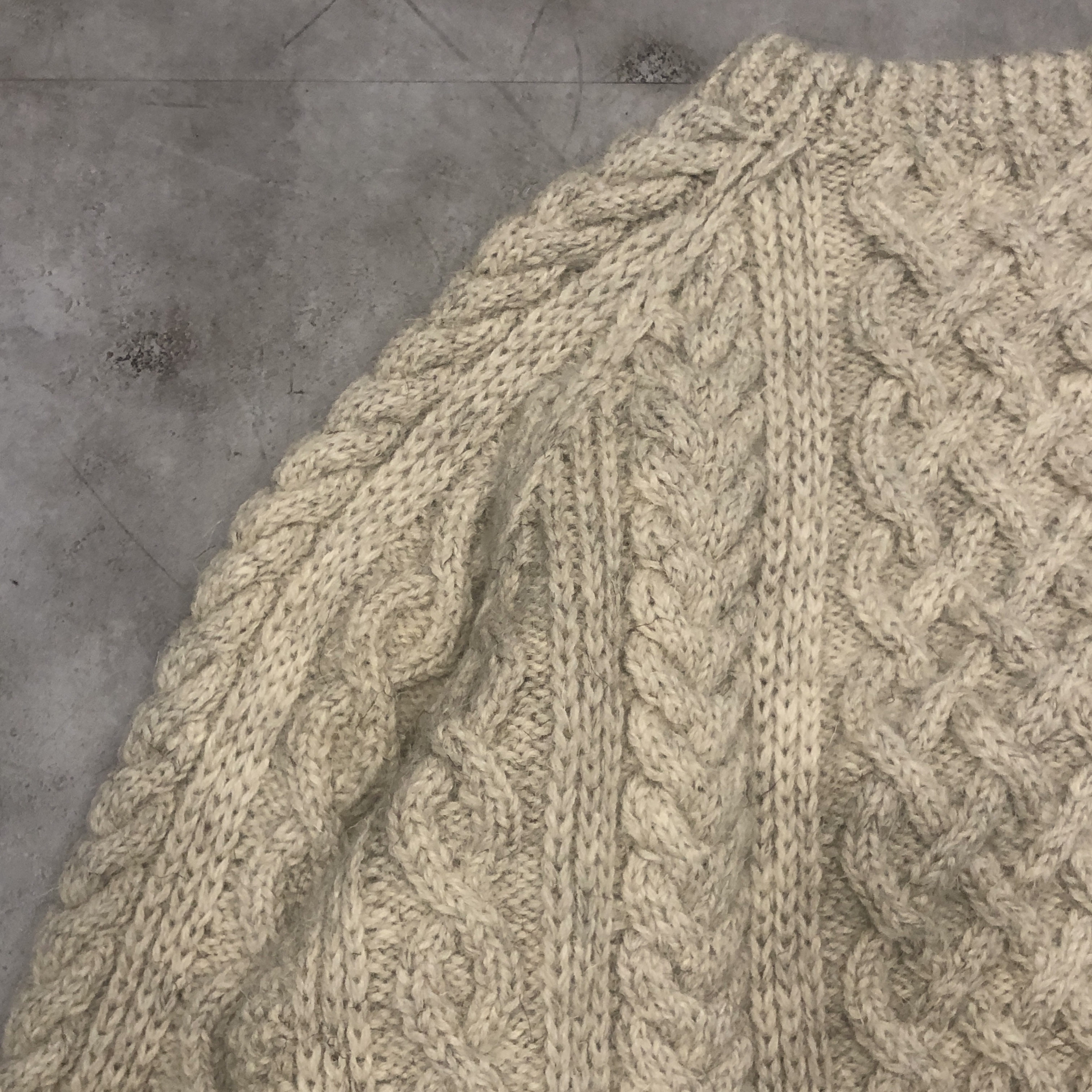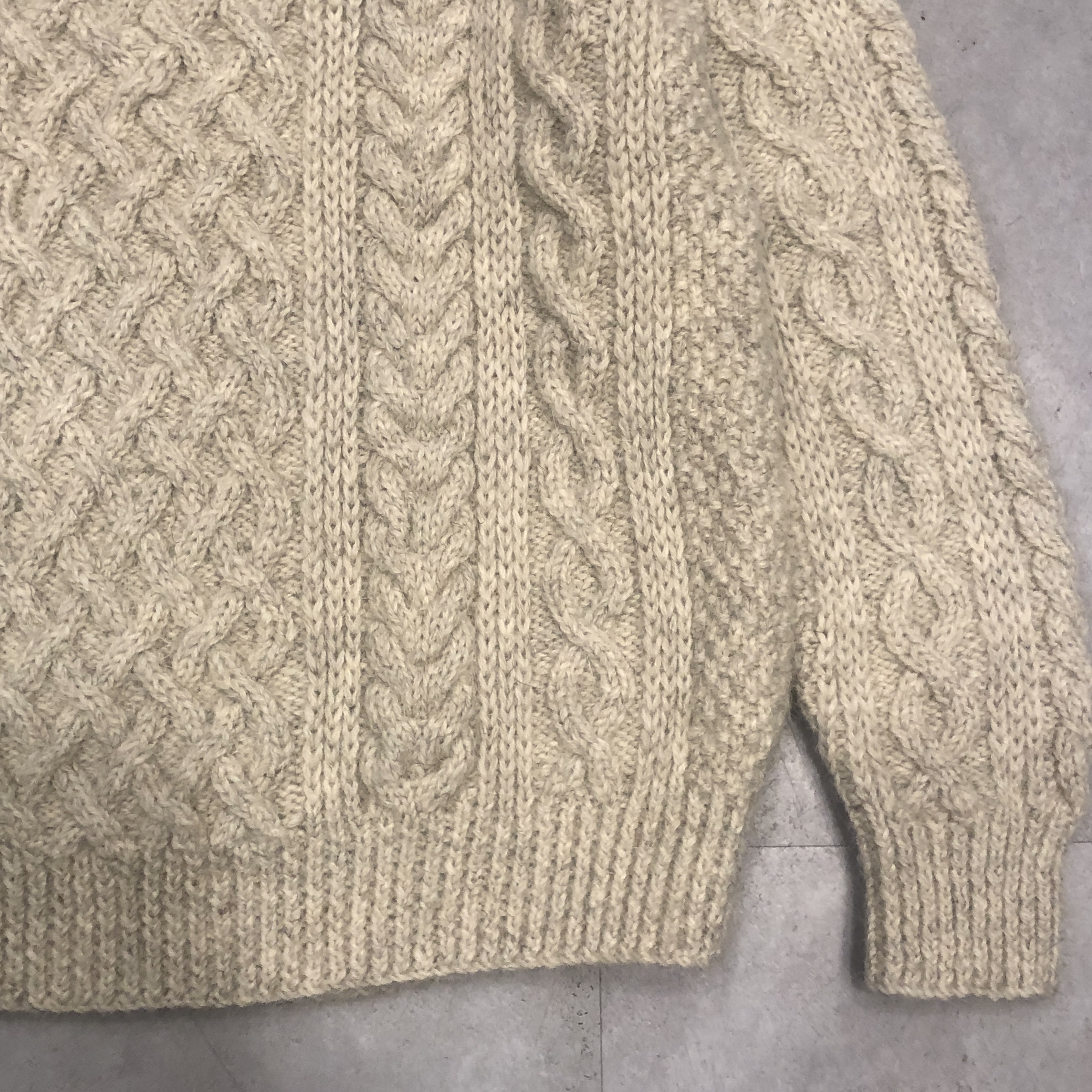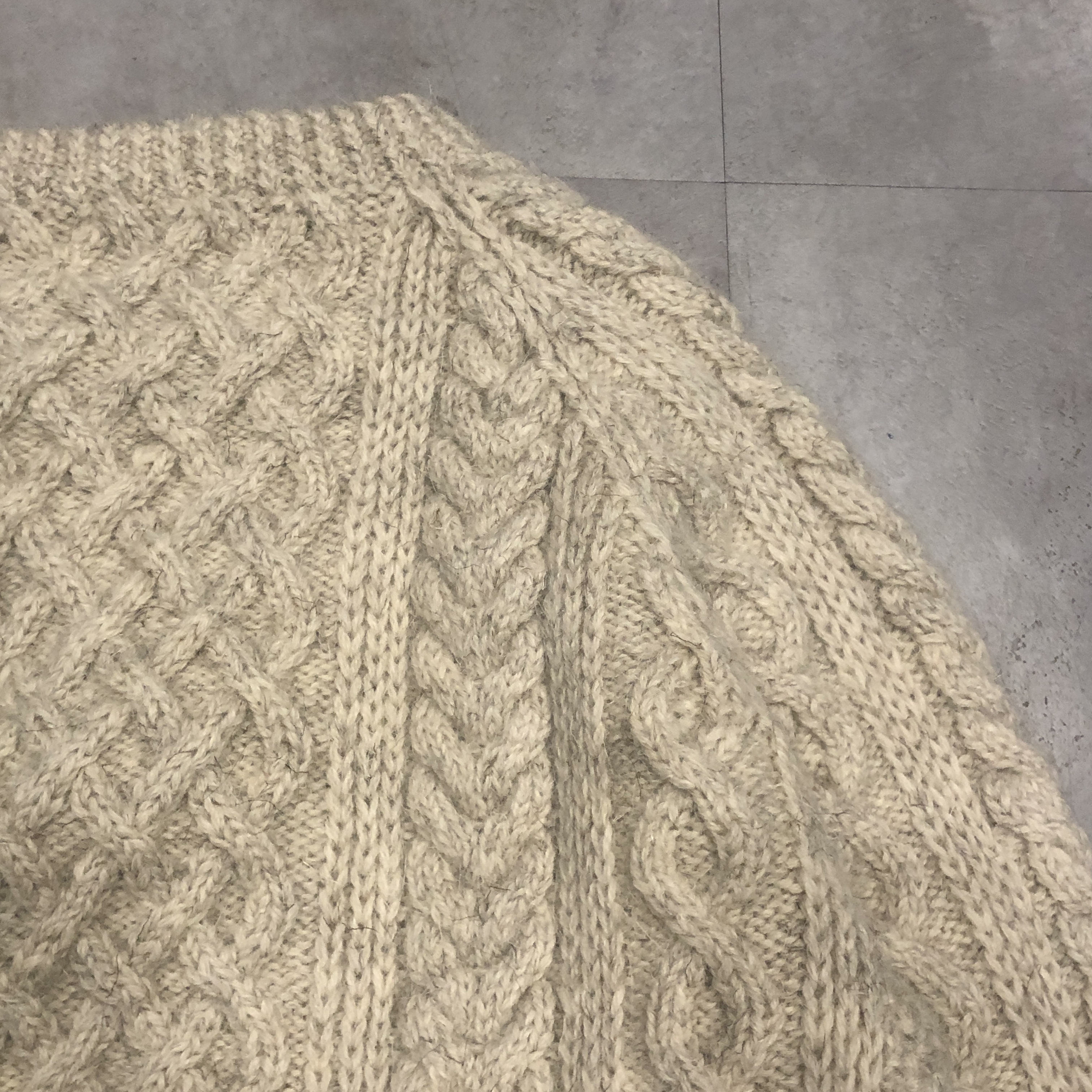 名門INVERALLANの別ラインとしてご存知の方も多い“STRATHTAY”より、ハンドニットのクルーネックセーターのご紹介です。タグからも分かる通りPURE NEW WOOLを贅沢に使用した手編み仕様で、現行のローゲージニットとは根本的に異なる、どこか素朴で原始的な温かみのある表情が魅力の一着。特筆すべきはこの密度の高いケーブル編み。中央には太めのフィッシャーマンズパターン、両サイドにはロープ編みとバスケット編みを交互に配置した非常に凝った構成で、袖にも惜しみなく同様のパターンが入る贅沢仕様です。ラグランスリーブならではの肩に乗る丸みと、ふっくらと膨らむ袖のシルエットが絶妙で、アウターの中に忍ばせても存在感を発揮してくれる頼れる一枚。カラーは生成りに近いナチュラルなオートミールトーンで、デニムや軍パンはもちろん、スラックスの上から合わせても上品にまとまります。このボリューム感と雰囲気をお探しだった方は是非ご検討ください。