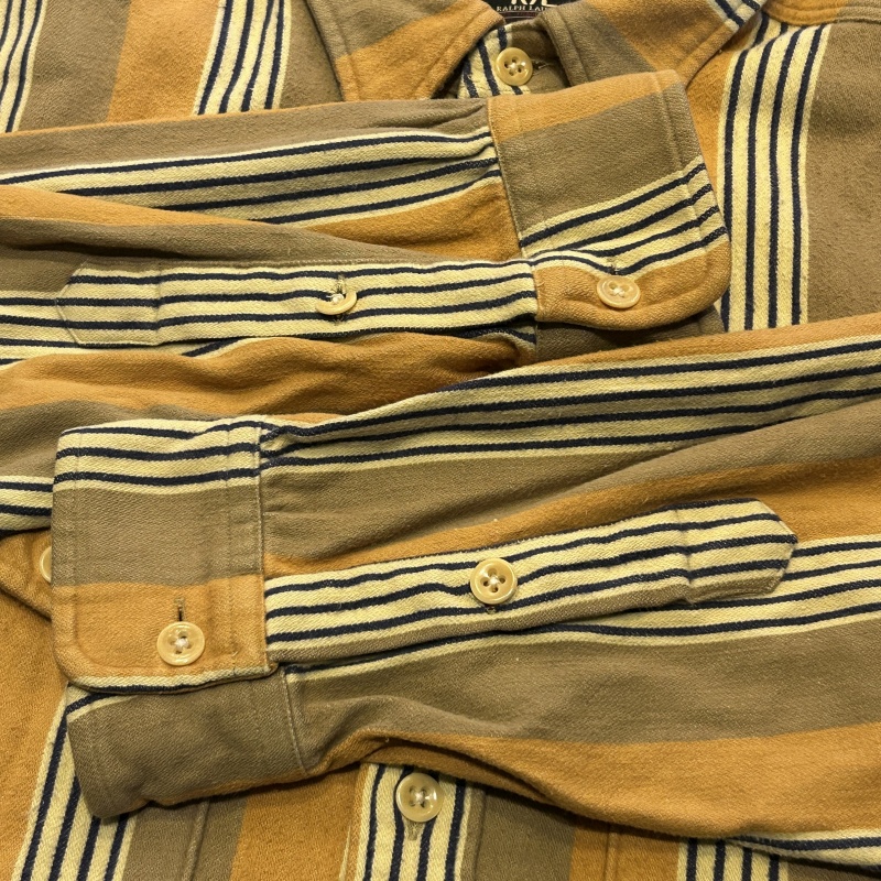 - 右袖ボタンに欠けがございます。毛羽立ち等の着用感がございますが、その他に目立つ汚れやダメージ等は無く、古着慣れされた方でしたら問題無く着用していただける状態です。