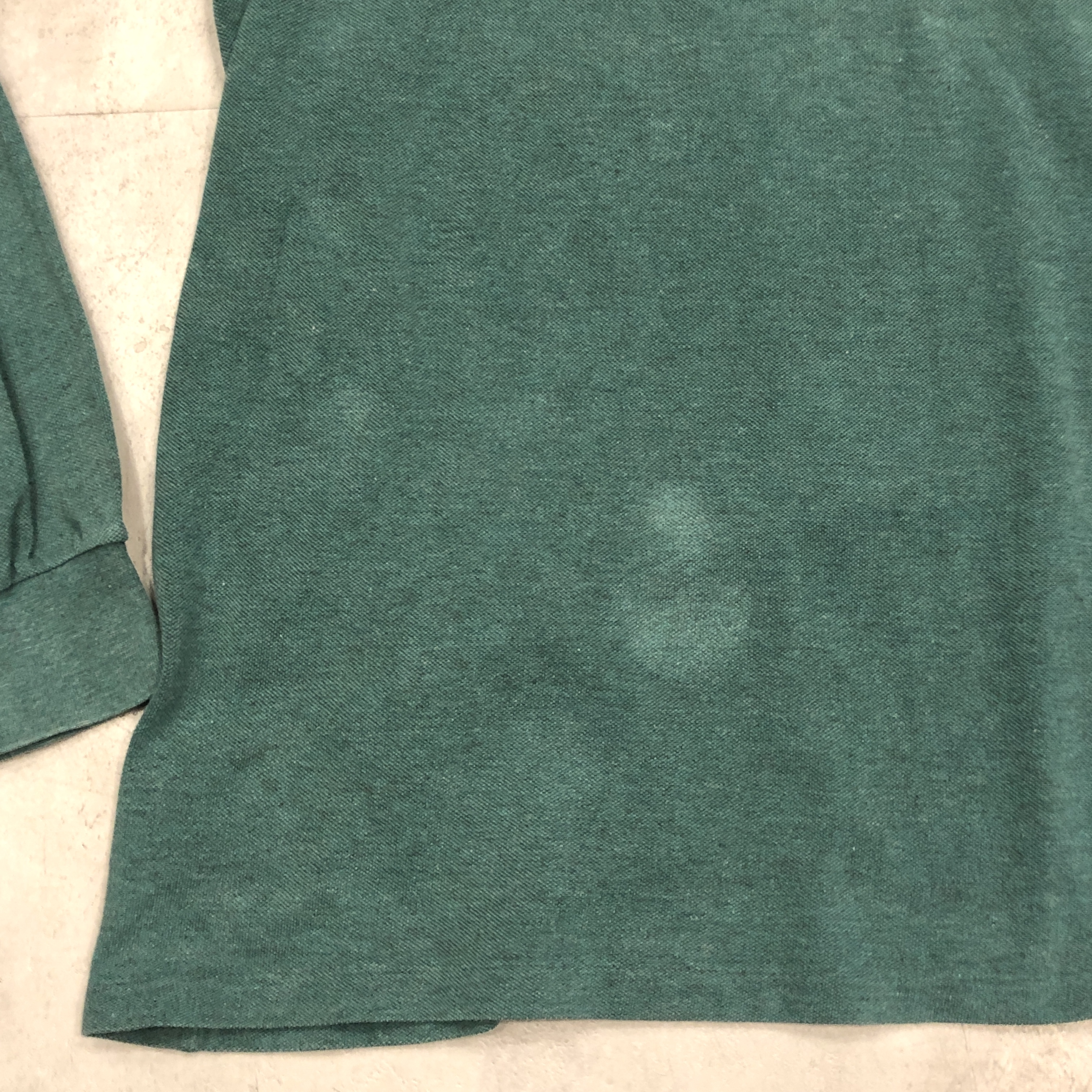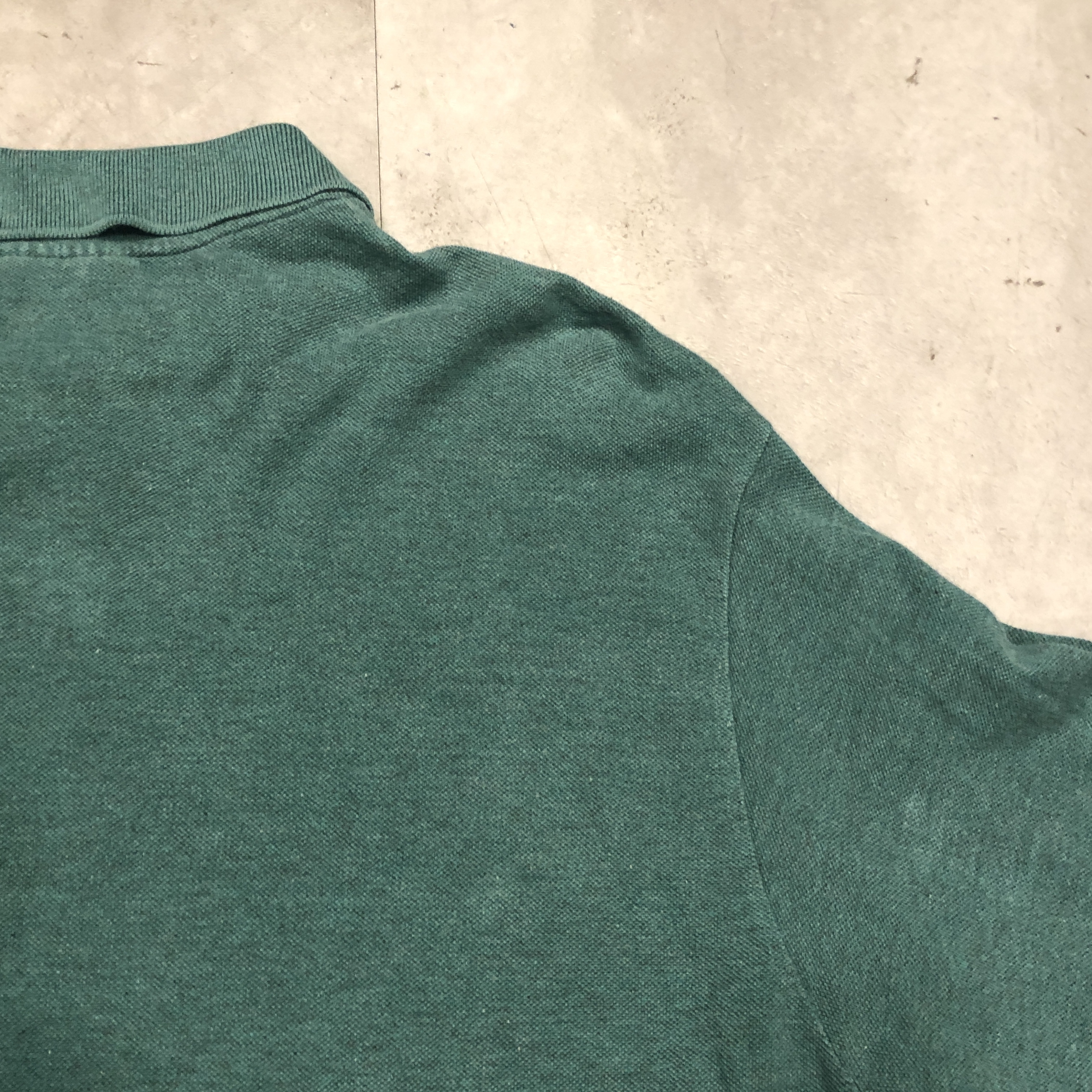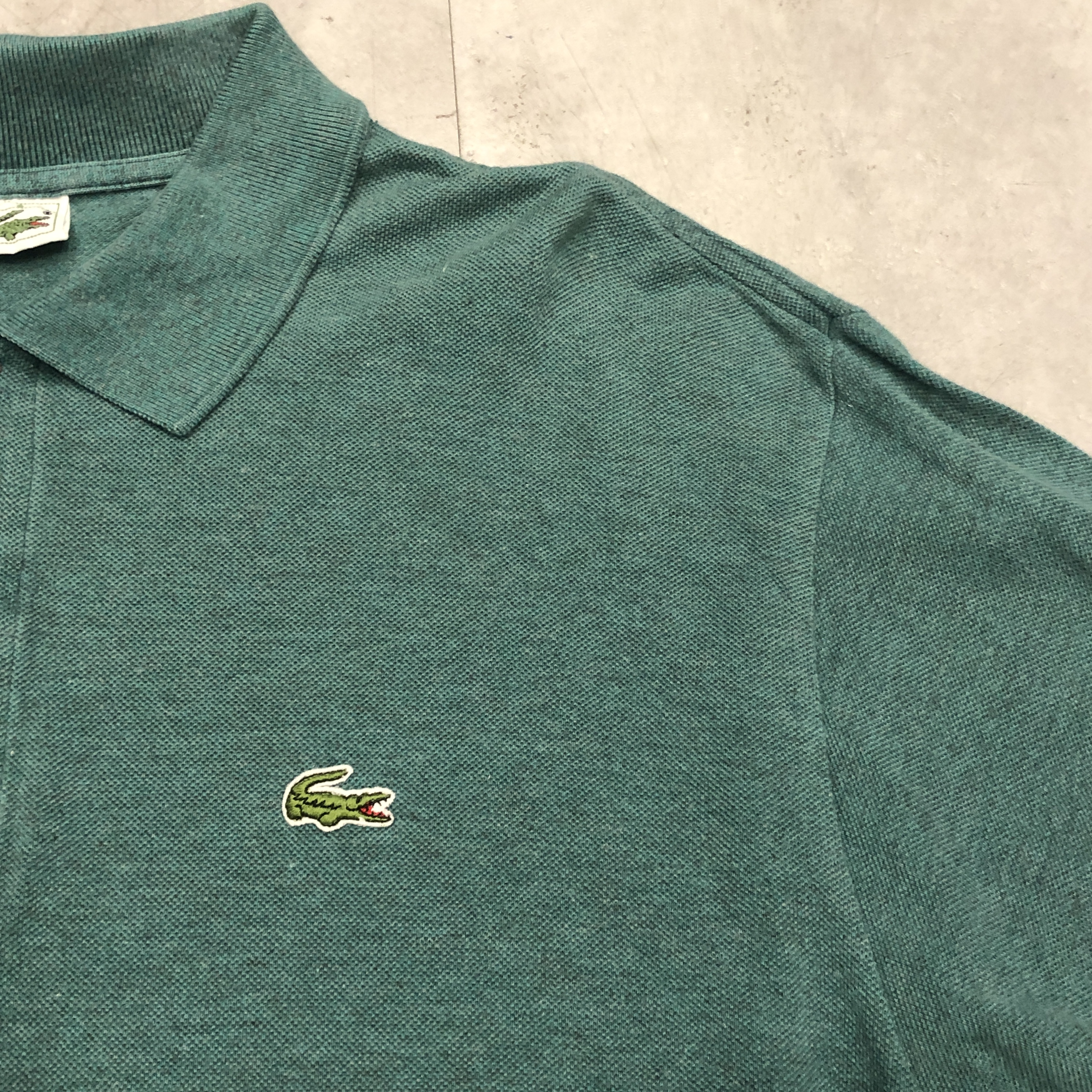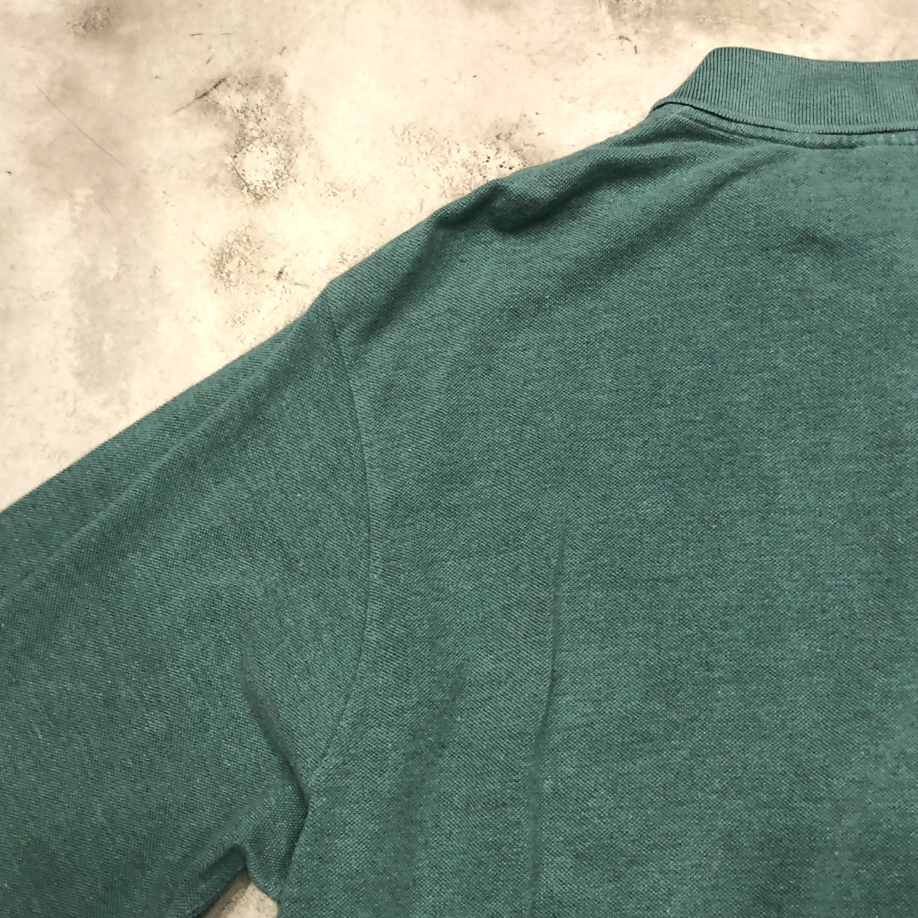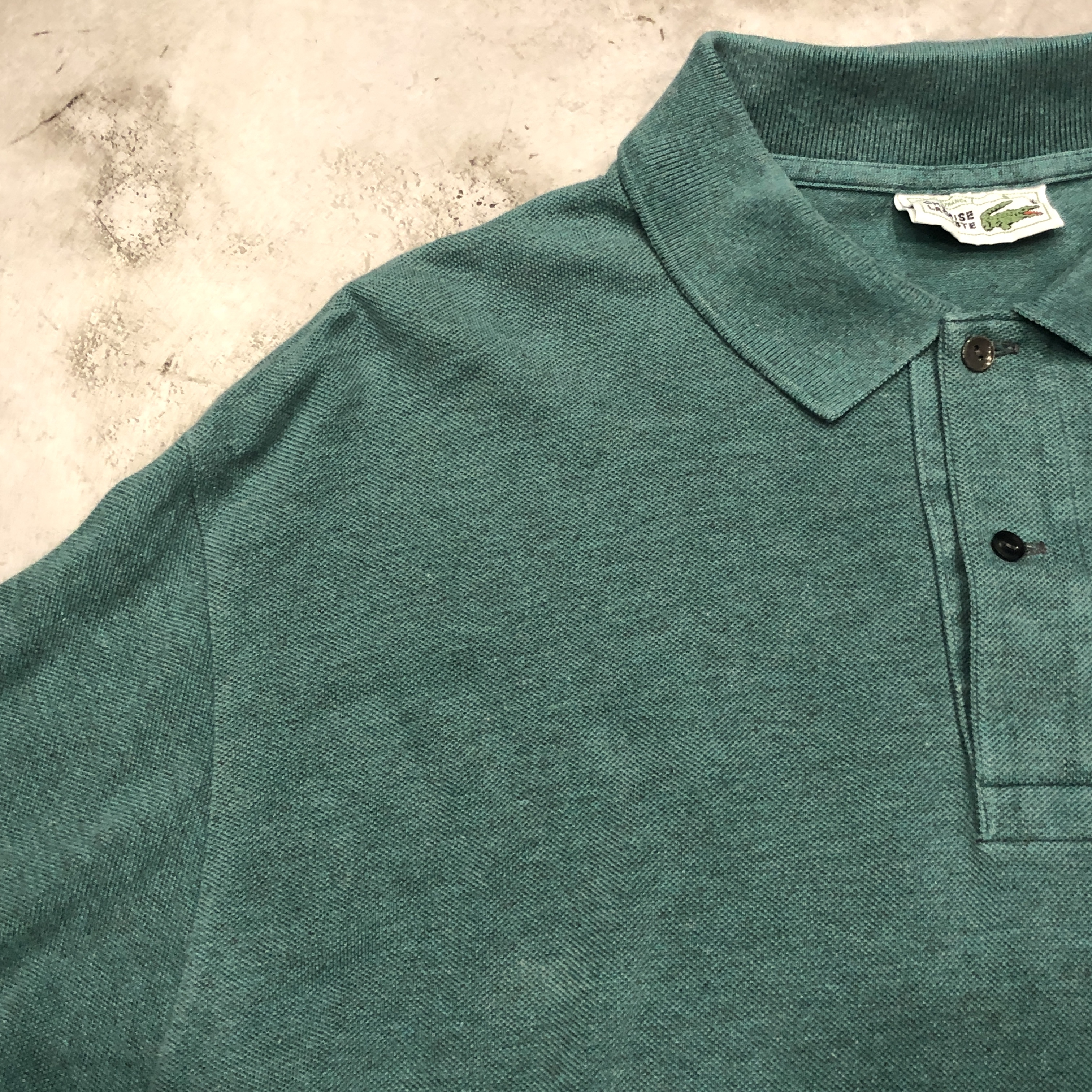 - フランス製タグが誇らしげに主張する、LACOSTEの長袖ポロシャツ。90年代前後と推定されるこの一枚は、現行品とはひと味違う、ややコシのある鹿の子コットンが魅力。色は深いグリーンメランジで、洗いによる自然なフェードが生地に奥行きを与え、まさに一点ものの風格。胸元にはお馴染みのワニがしっかりと刺繍されています。