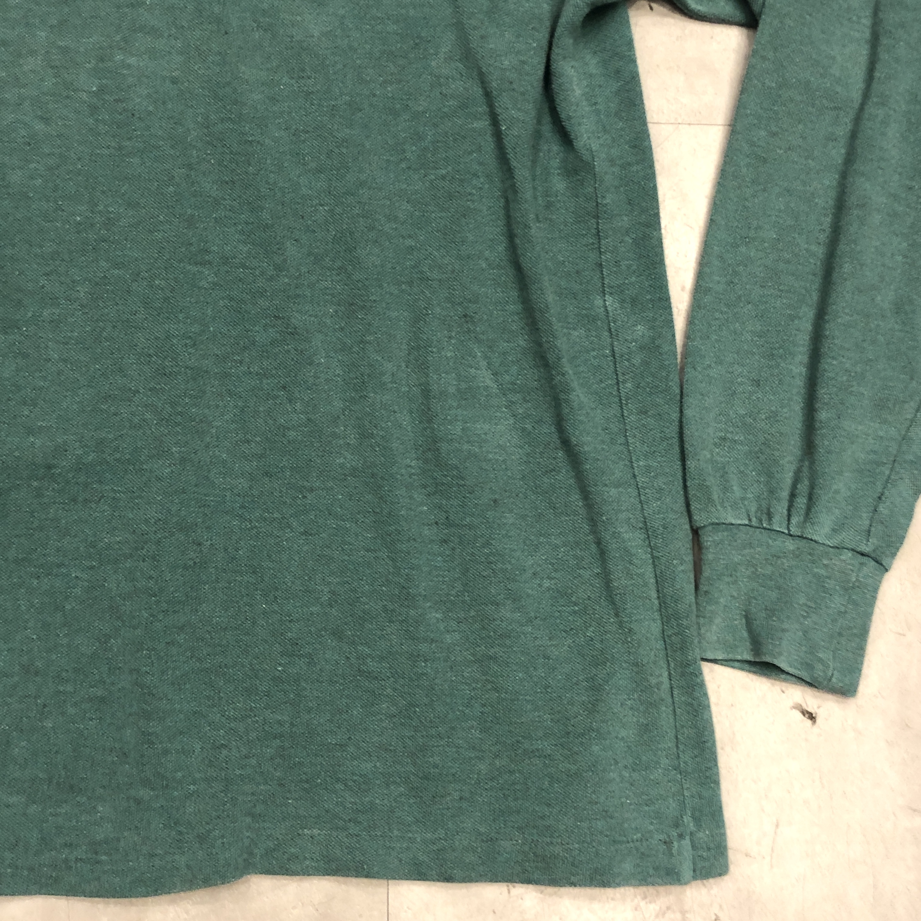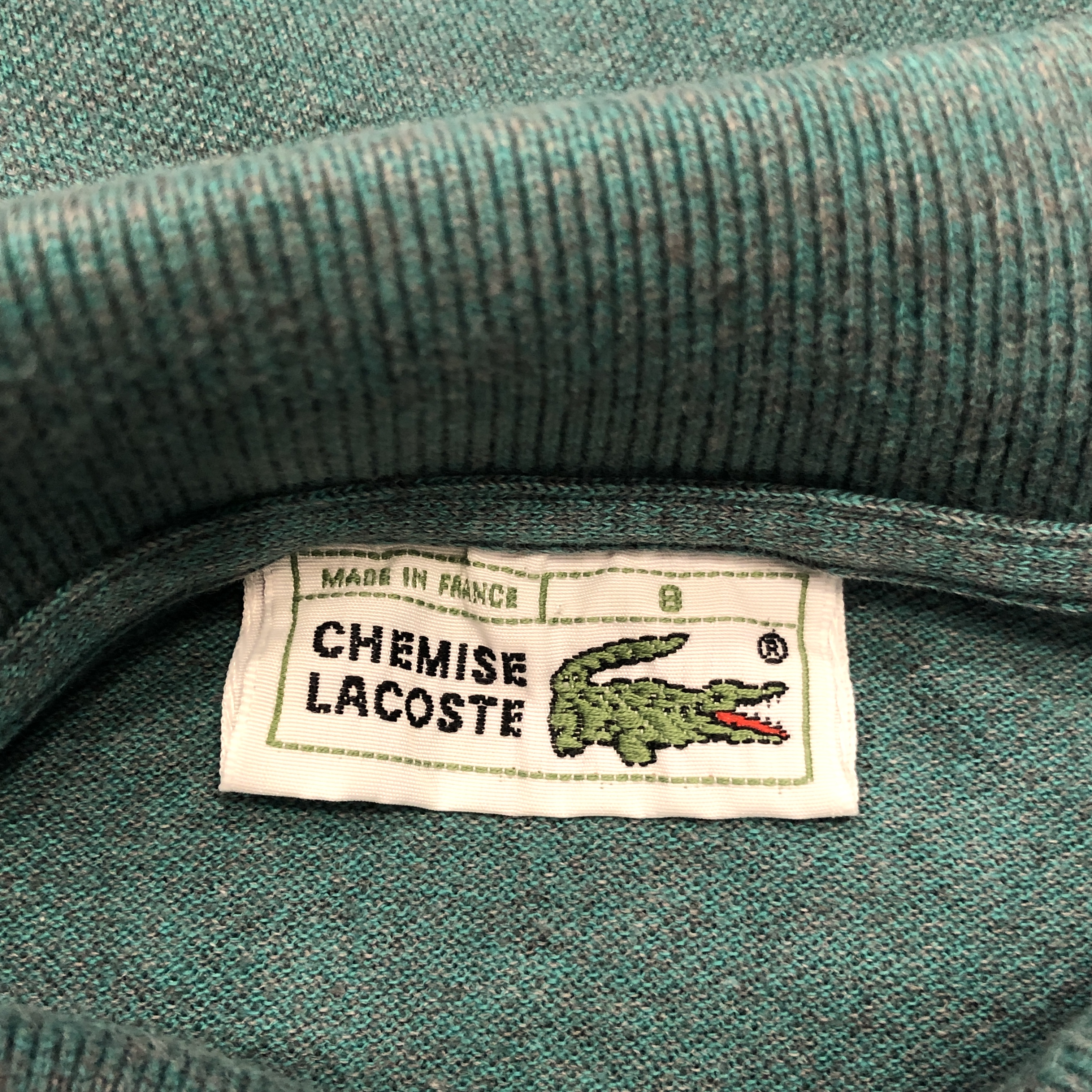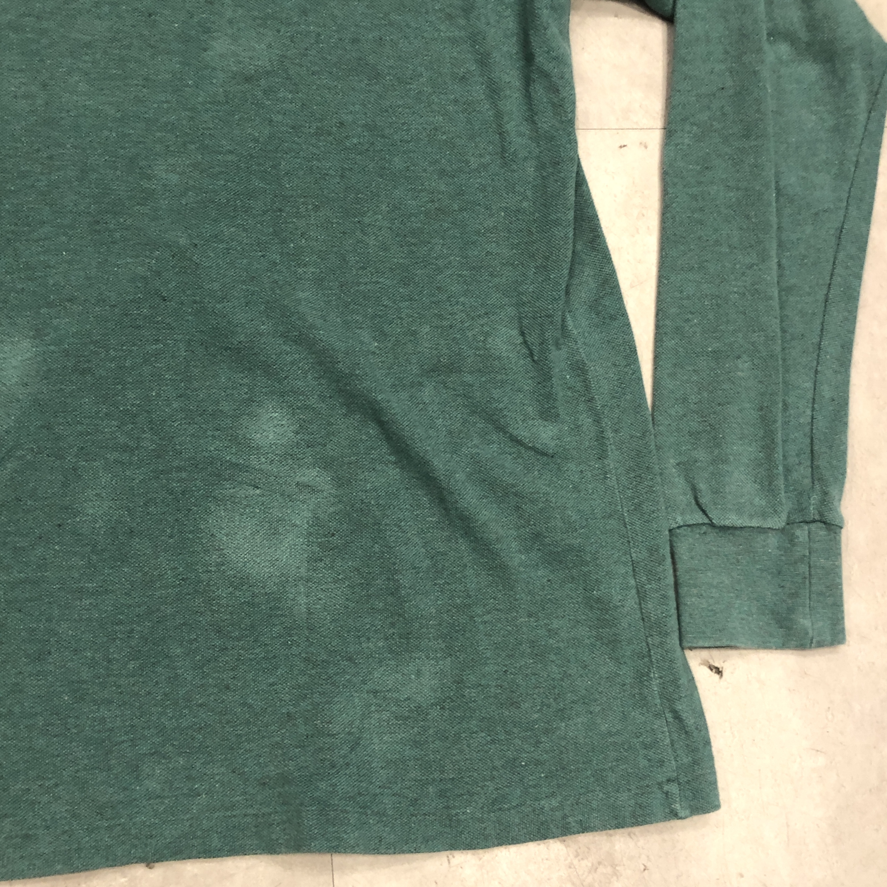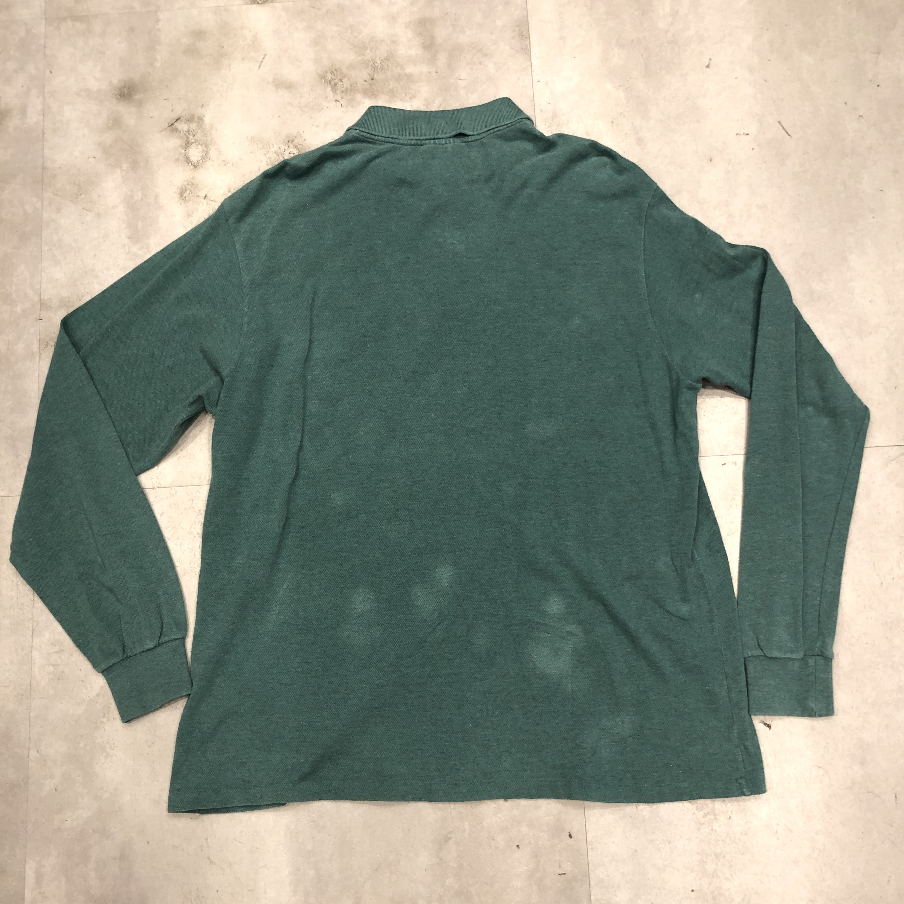 - フランス製タグが誇らしげに主張する、LACOSTEの長袖ポロシャツ。90年代前後と推定されるこの一枚は、現行品とはひと味違う、ややコシのある鹿の子コットンが魅力。色は深いグリーンメランジで、洗いによる自然なフェードが生地に奥行きを与え、まさに一点ものの風格。胸元にはお馴染みのワニがしっかりと刺繍されています。