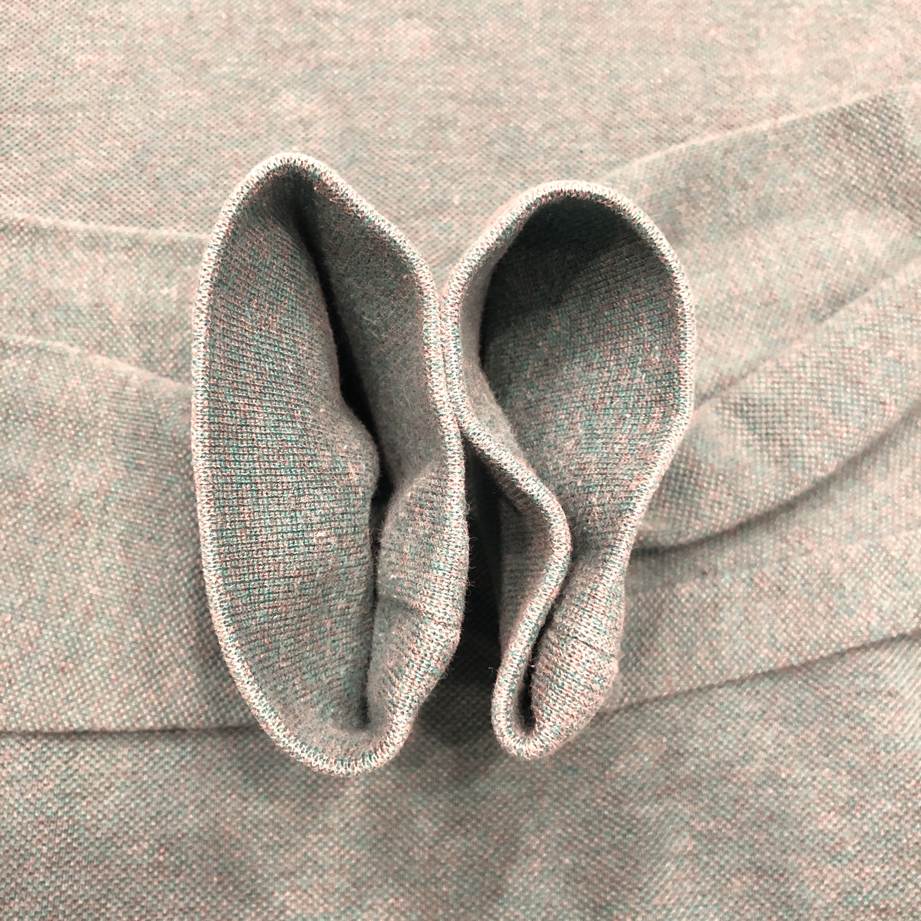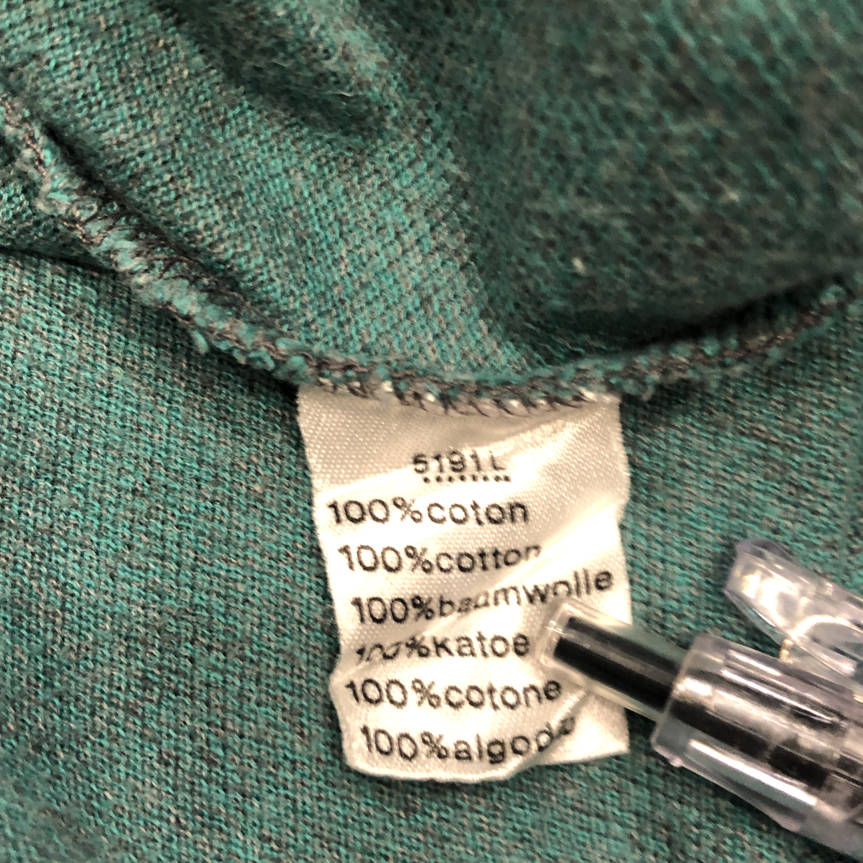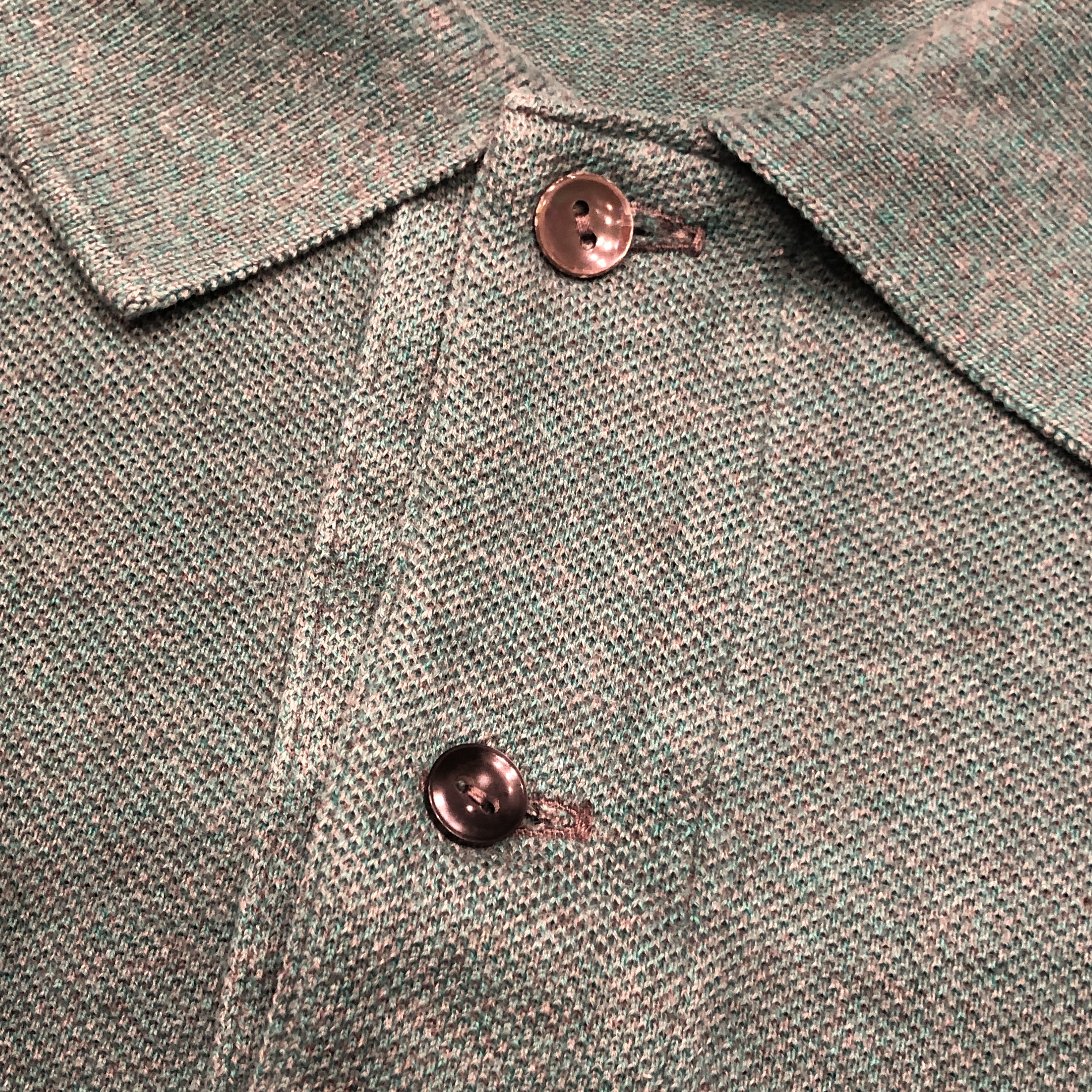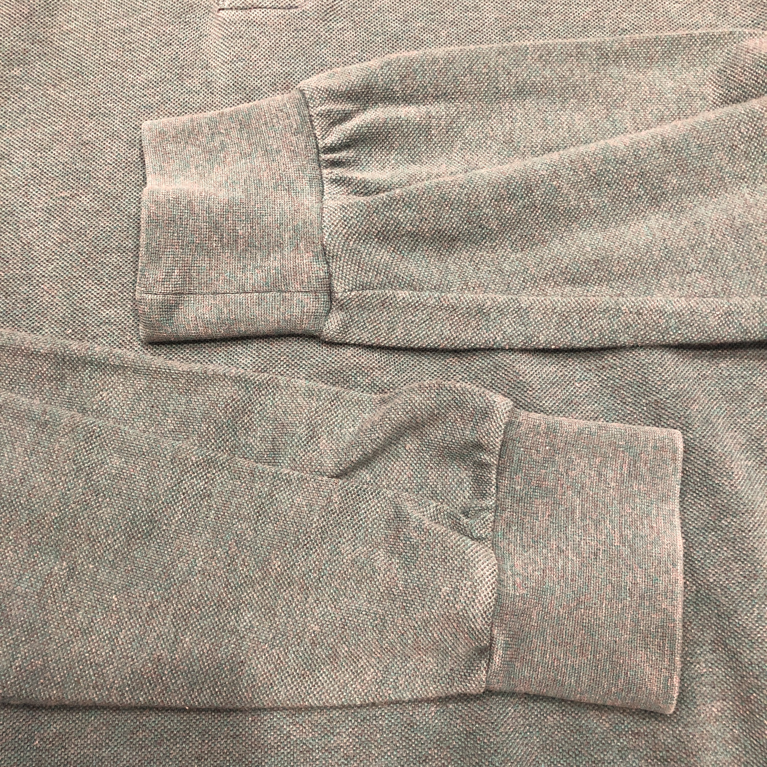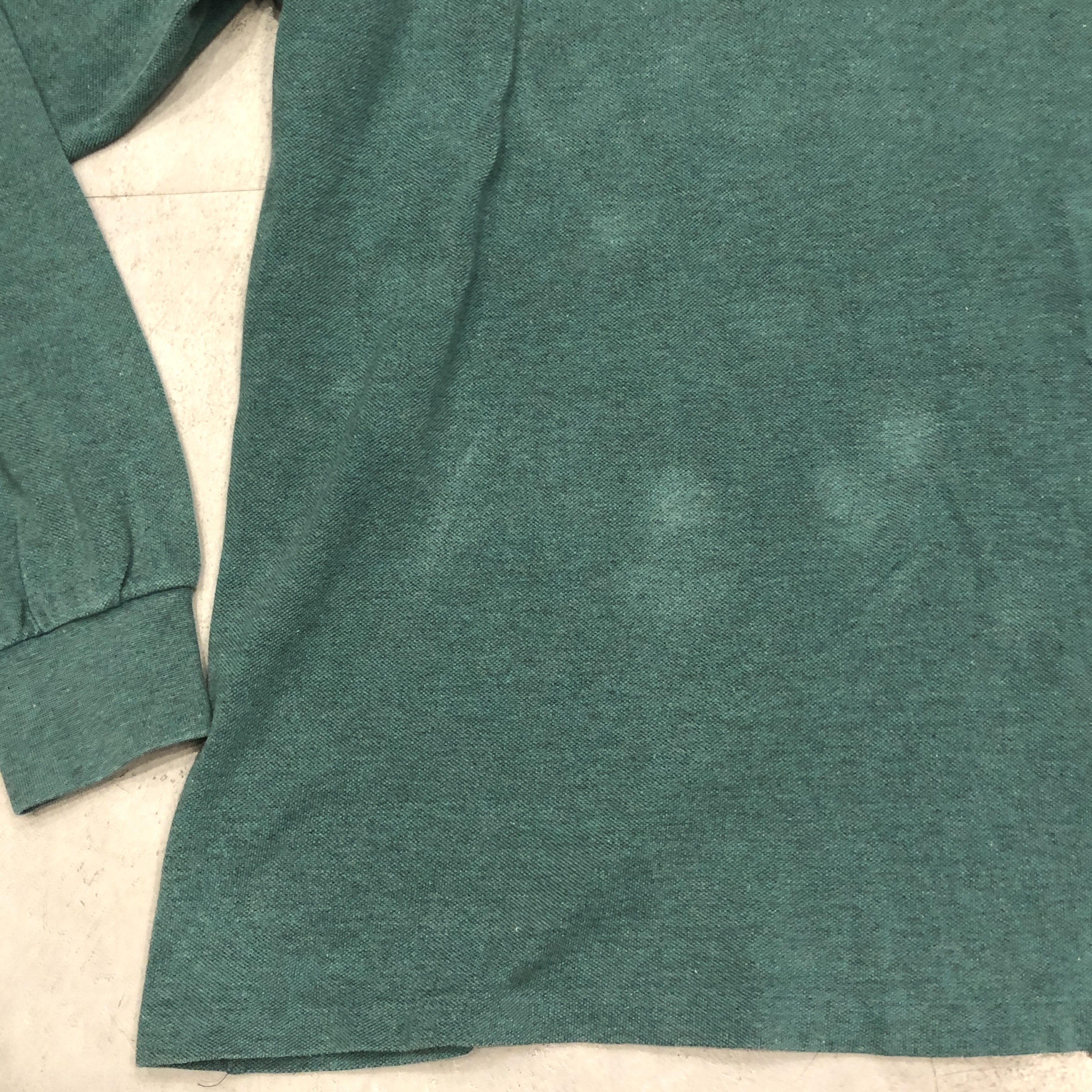 - フランス製タグが誇らしげに主張する、LACOSTEの長袖ポロシャツ。90年代前後と推定されるこの一枚は、現行品とはひと味違う、ややコシのある鹿の子コットンが魅力。色は深いグリーンメランジで、洗いによる自然なフェードが生地に奥行きを与え、まさに一点ものの風格。胸元にはお馴染みのワニがしっかりと刺繍されています。