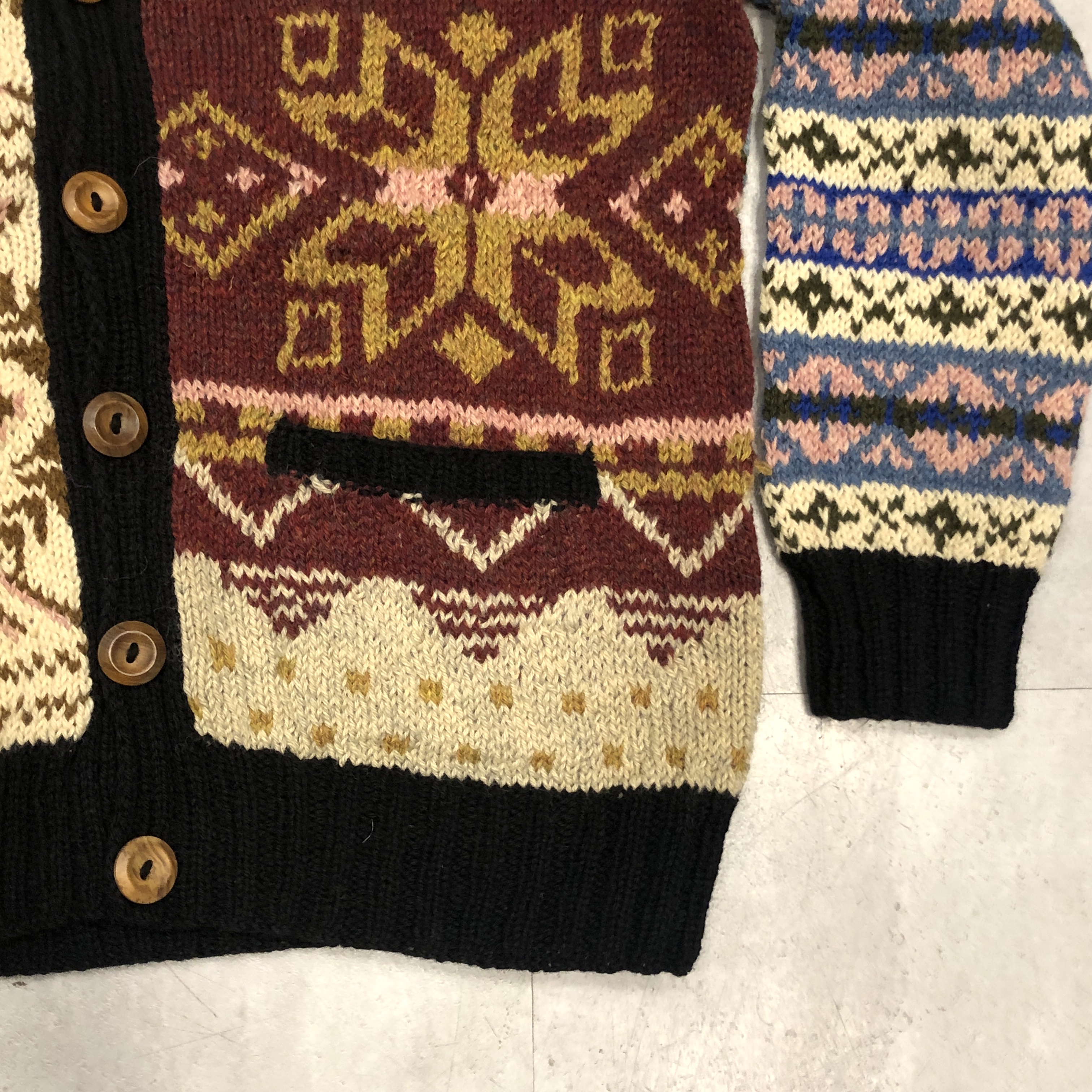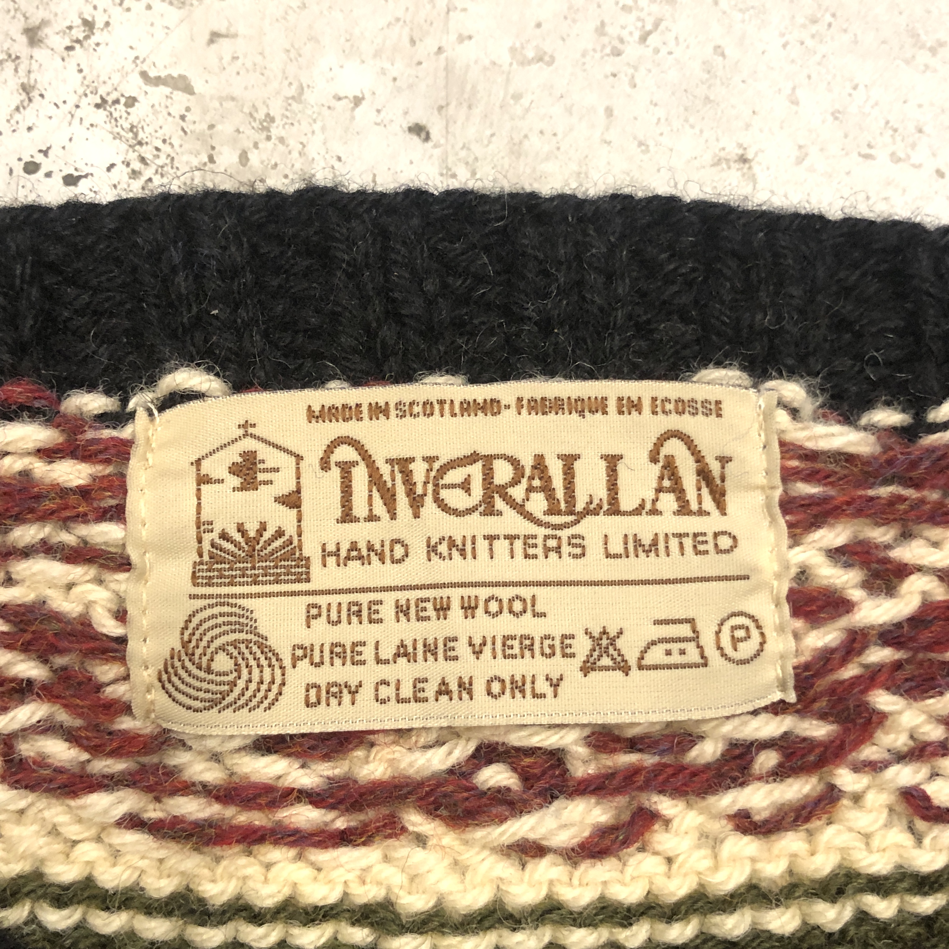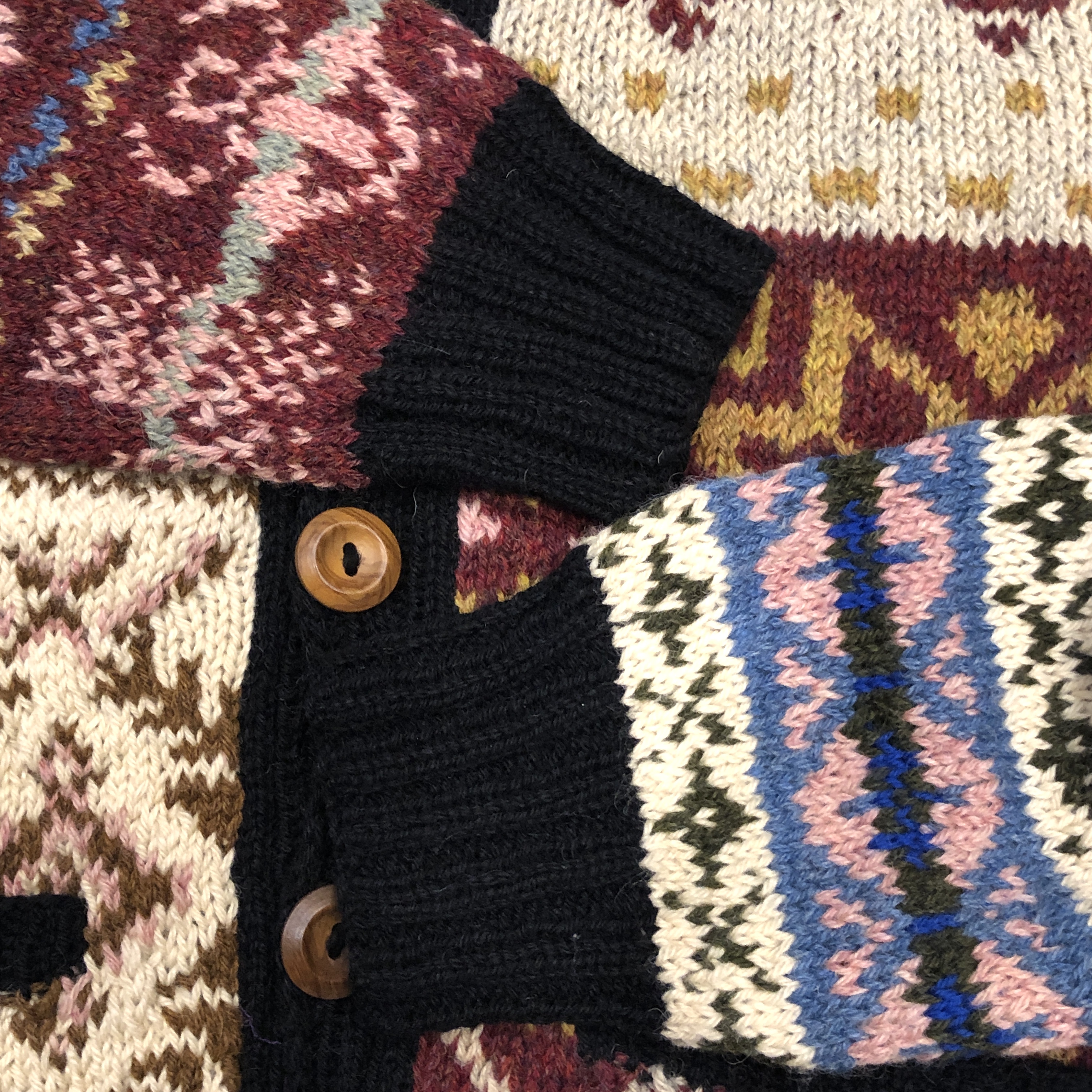 - スコットランドの名門〈INVERALLAN〉より、贅沢すぎるパターンワークが目を奪うフェアアイル・カーディガンのご紹介です。インバーアランといえば3Aのアランニットがあまりにも有名ですが、実はごく一部にこうした“フェアアイル編み”のモデルが存在します。しかもこちらは単なる総柄ではございません。右袖だけブルー系、左袖はボルドー〜オリーブ系、身頃にいたっては左右で柄も配色も全く異なるアシンメトリーデザイン。まるで熟練ニッターが遊び心のままに編み進め、そのまま製品化してしまったかのような、今では考えられない自由さ。もちろんハンドニット100%、肉厚なピュアウール特有の弾力感と保温性は言わずもがな。フロントの木製ボタンも良いアクセントです。柄ニットは好きだけれど“普通のフェアアイルでは物足りない”という方にこそ袖を通していただきたい逸品。このクラスの変化球インバーアランは、次にいつご紹介できるか全く読めませんので、ぜひこの機会にご検討ください。