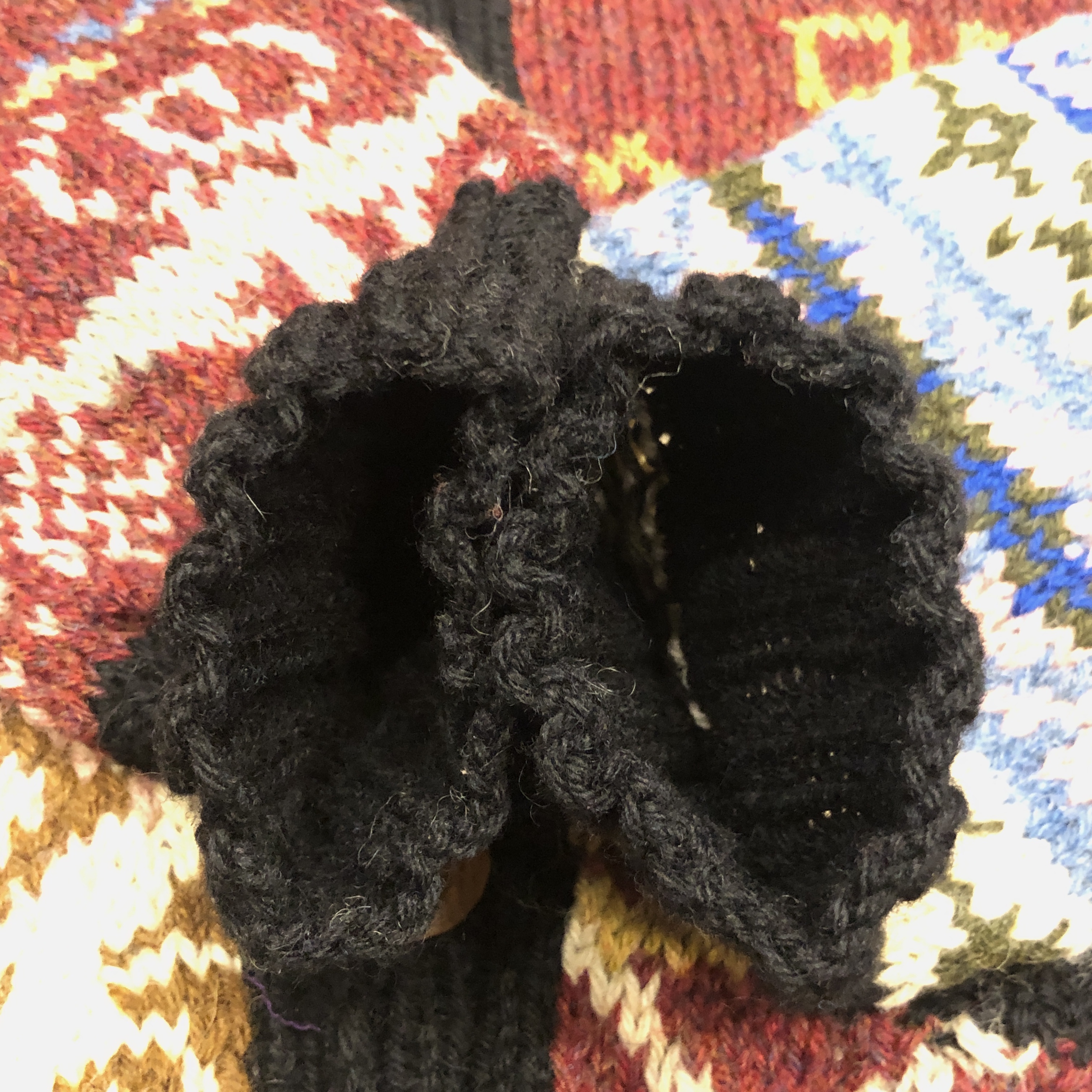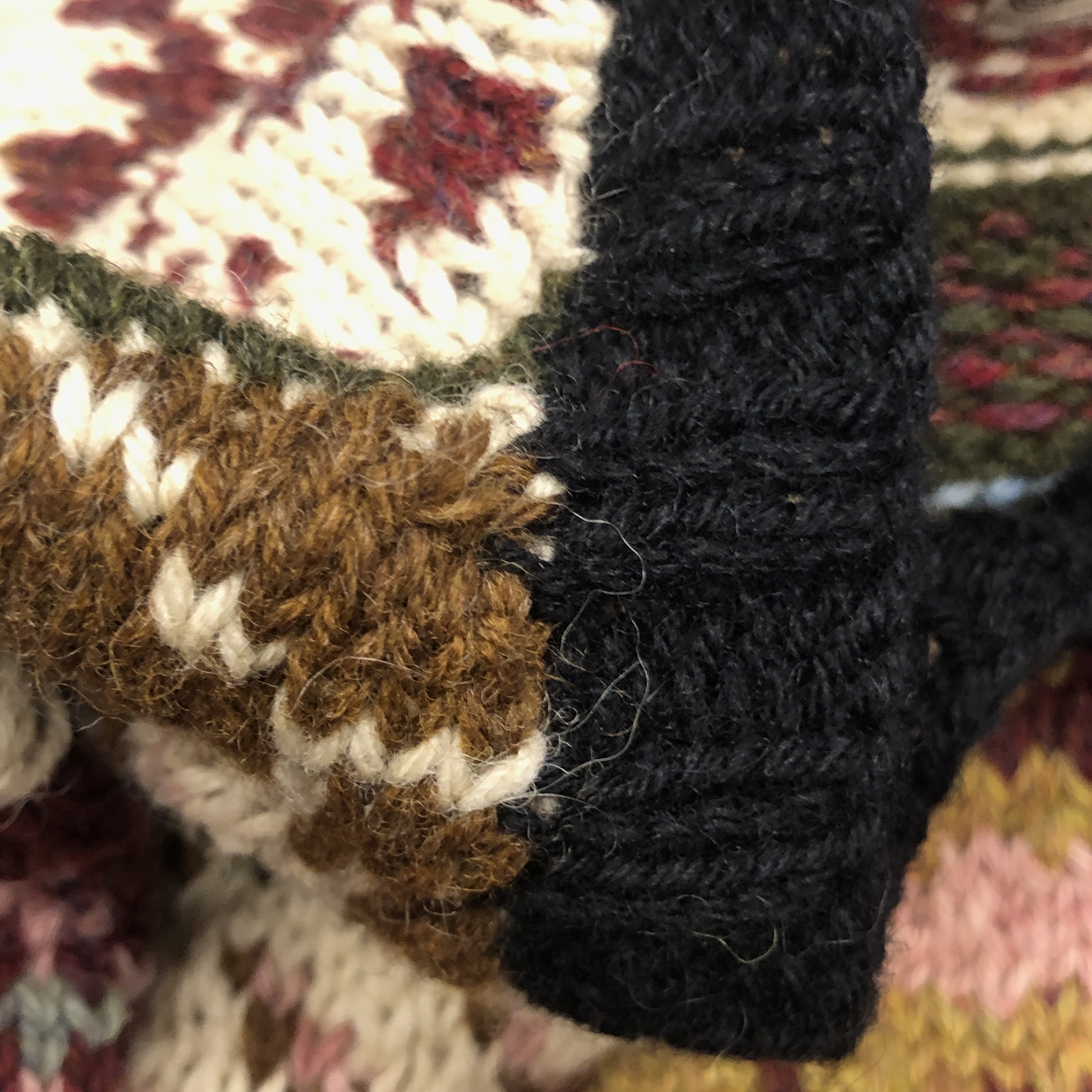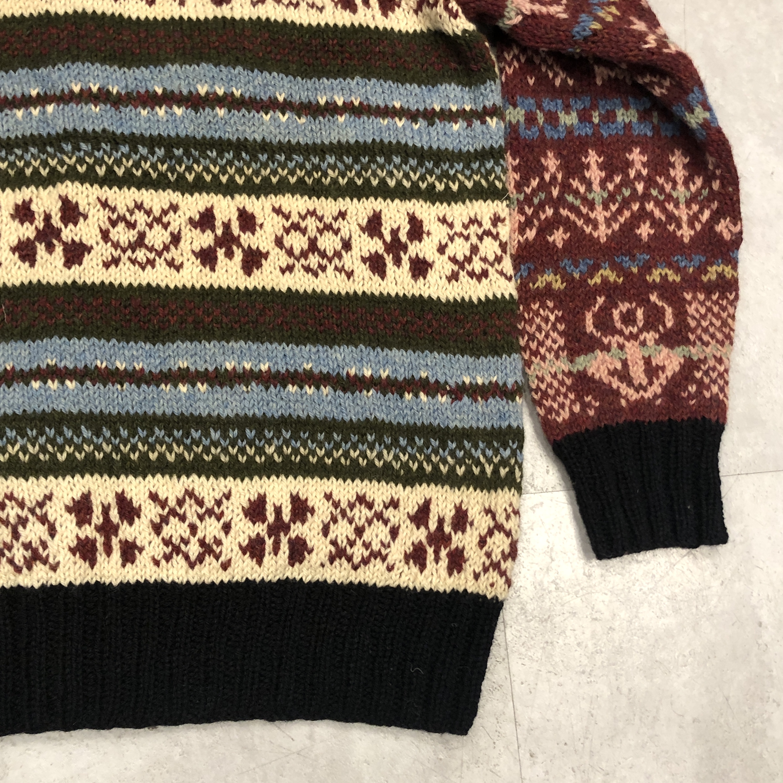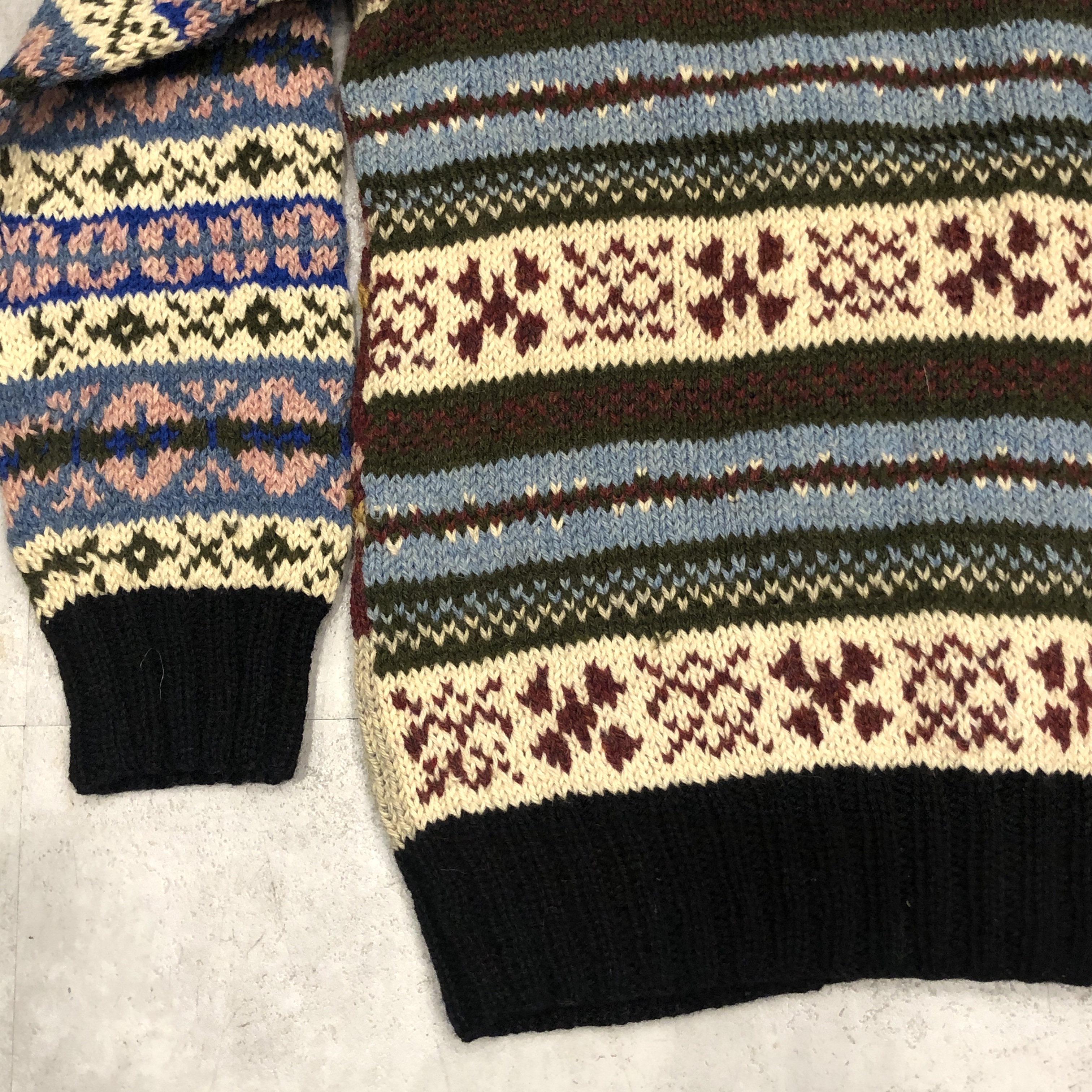 - スコットランドの名門〈INVERALLAN〉より、贅沢すぎるパターンワークが目を奪うフェアアイル・カーディガンのご紹介です。インバーアランといえば3Aのアランニットがあまりにも有名ですが、実はごく一部にこうした“フェアアイル編み”のモデルが存在します。しかもこちらは単なる総柄ではございません。右袖だけブルー系、左袖はボルドー〜オリーブ系、身頃にいたっては左右で柄も配色も全く異なるアシンメトリーデザイン。まるで熟練ニッターが遊び心のままに編み進め、そのまま製品化してしまったかのような、今では考えられない自由さ。もちろんハンドニット100%、肉厚なピュアウール特有の弾力感と保温性は言わずもがな。フロントの木製ボタンも良いアクセントです。柄ニットは好きだけれど“普通のフェアアイルでは物足りない”という方にこそ袖を通していただきたい逸品。このクラスの変化球インバーアランは、次にいつご紹介できるか全く読めませんので、ぜひこの機会にご検討ください。