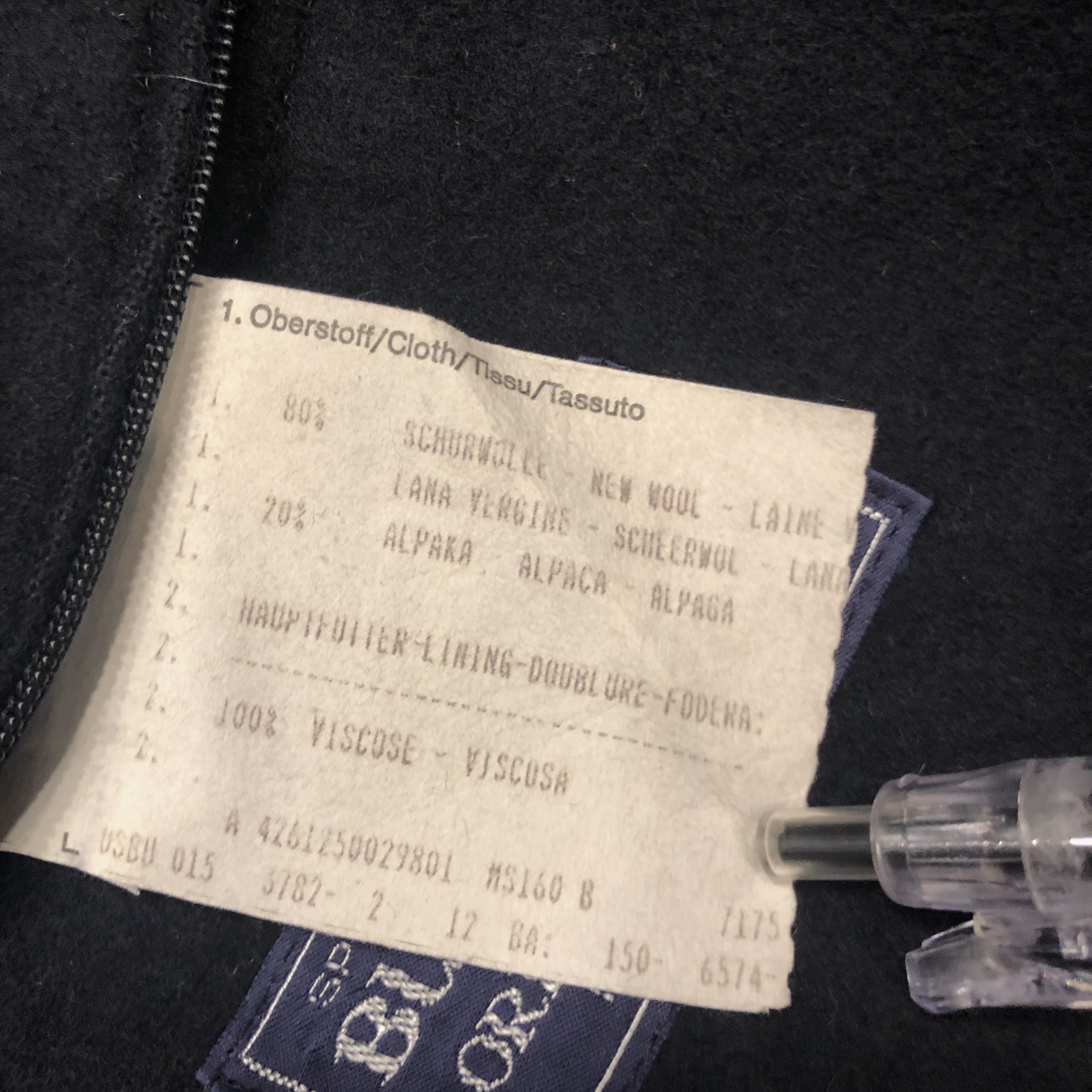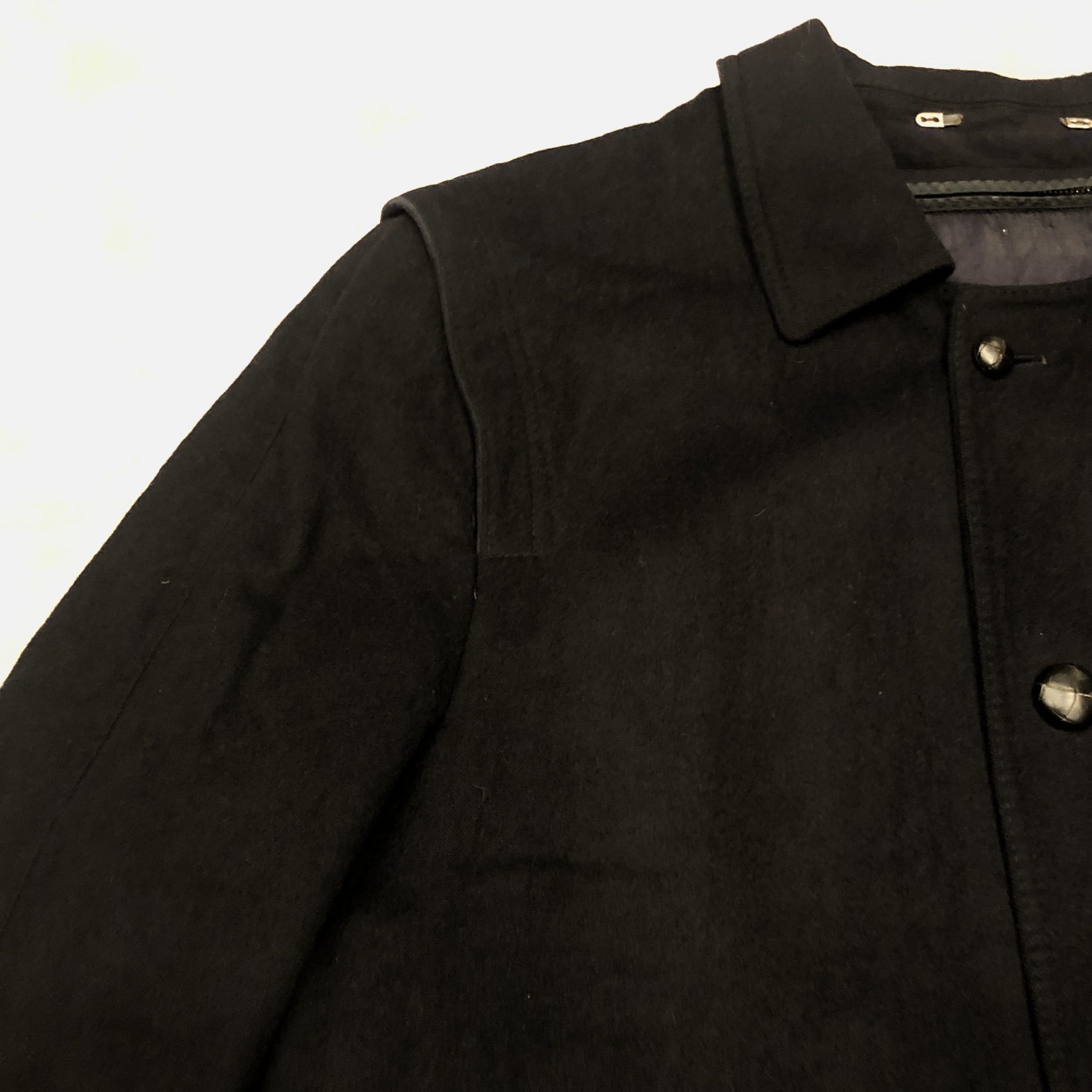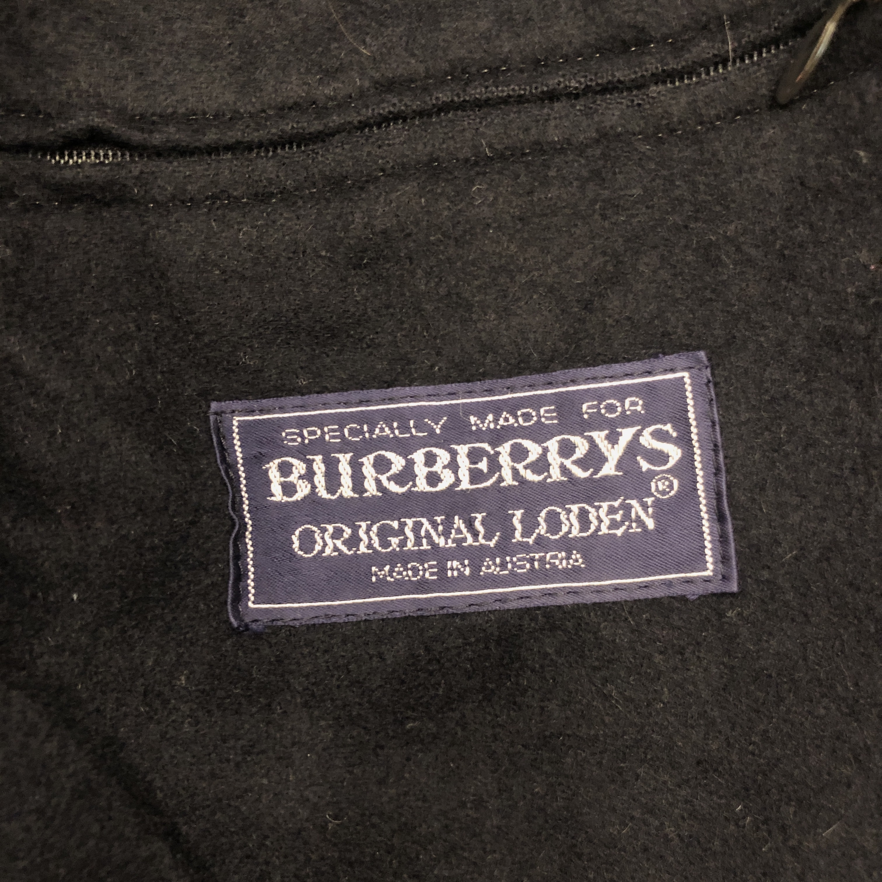 - オーストリア製のローデンクロスを贅沢に用いた、Burberrysによるオリジナル・ローデンコート。ローデンとは、オーストリア〜南ドイツの山岳地帯で狩猟や乗馬用に愛用されてきた伝統的なウール地で、雨雪を弾きながらも内部の湿気は逃がすという、ゴアテックスも顔負けの天然機能素材。本来グリーン系が主流ですが、こちらは漆黒に近いダークネイビーというのがまた洒落ています。背中には深いインバーテッドプリーツ、総裏にはブラックウォッチ系チェックのライニング、80%ヴァージンウール+20%アルパカ混。着るだけでウィーンの街角に立っているような気分にさせてくれる、風格と詩情を併せ持った一着です。バーバリーのトレンチとはまた別軸の、ヨーロッパ上流階級の休日服——その余裕を、現代の装いに取り入れてみませんか。