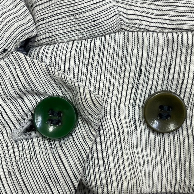 前ネック下に手縫いで簡易的なお直しがあり、右肩の縫製部分に裂けがございます。