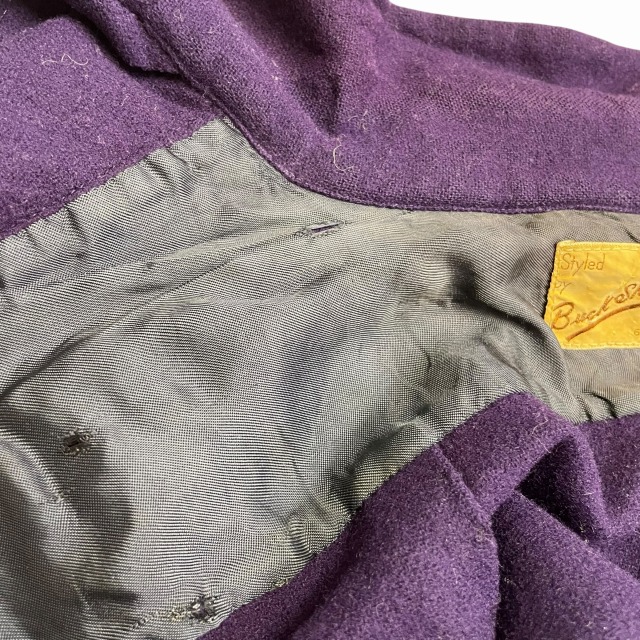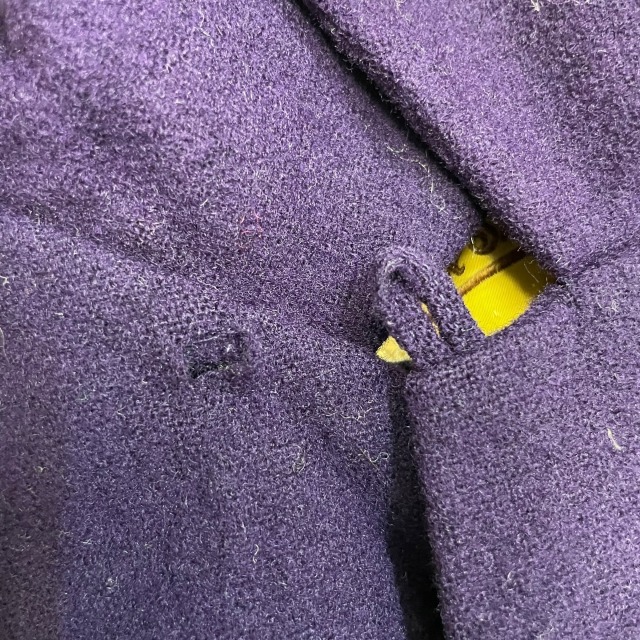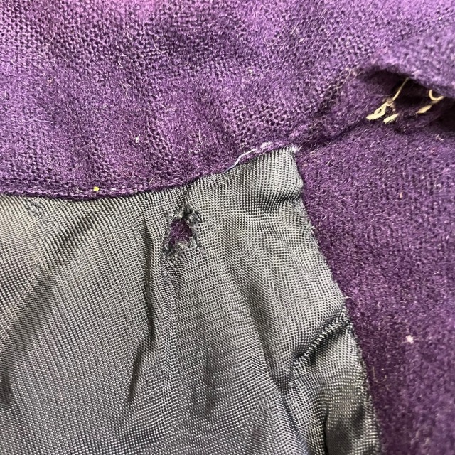 トップボタンの欠損に伴い生地にダメージがあり、ヨーク裏地に破れがございます。