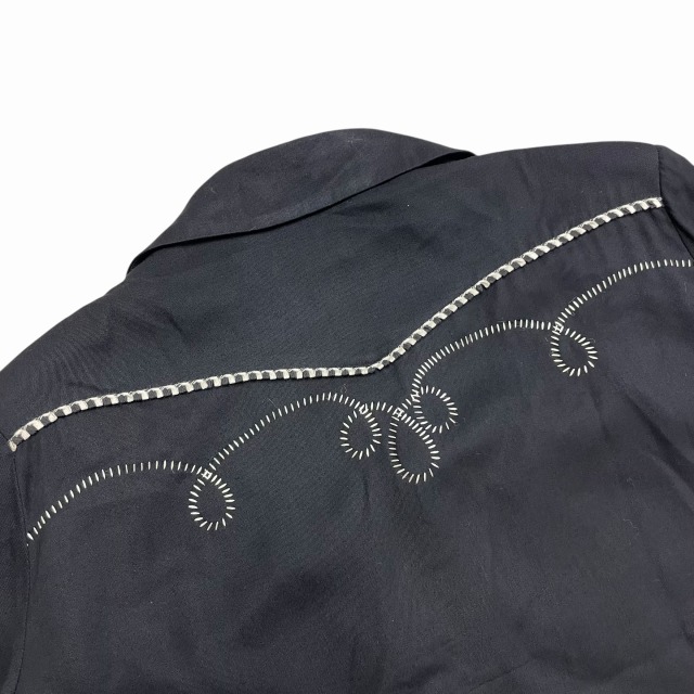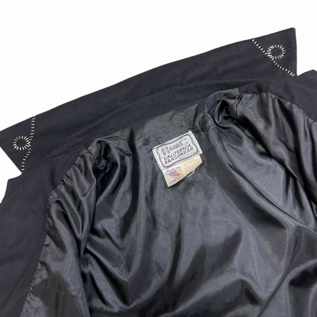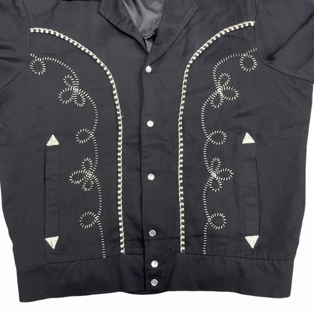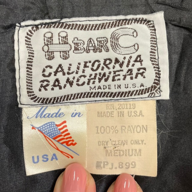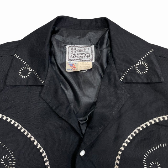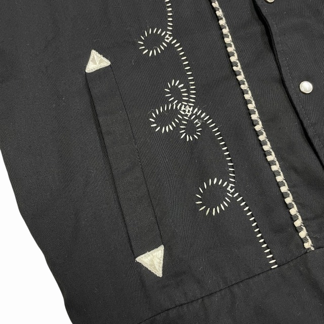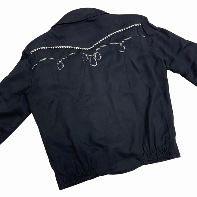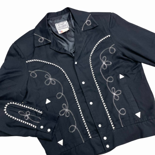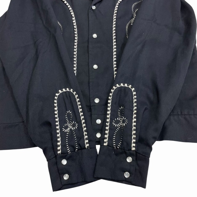 サイズ M 実寸 肩幅45.5㎝ 身幅55.5㎝ 着丈61㎝ 袖丈61.5㎝ ※若干の誤差はご了承ください ・サイズガイド 肩幅:肩~肩 身幅:脇下~脇下 袖丈:肩~袖先 着丈:背面中心部 襟の付け根~裾 状態 スレ、薄汚れ、糸ツレが多少ございますが、 目立つ大きなダメージや汚れはございませんので、問題無く着用可能です。 商品詳細 1980'S OLD H BAR Cのウエスタンジャケット。 カラーはブラックで、素材はレーヨンです。 いくつかパターンのある刺繍ですが、当個体は人気のクルクルしたパターンの刺繍が入ります。 近年非常に需要の高いウエスタンジャケットですが、入荷の機会は決して多くありません。 気の利いたビンテージをお探しの方に是非オススメしたい1着です!! ※実店舗と併売している為、ご注文時に売り切れの場合がございます。 予めご了承下さいませ。 ※お使いのモニター環境により、色の見え方が実物と異なる場合がございます。 予めご了承ください。