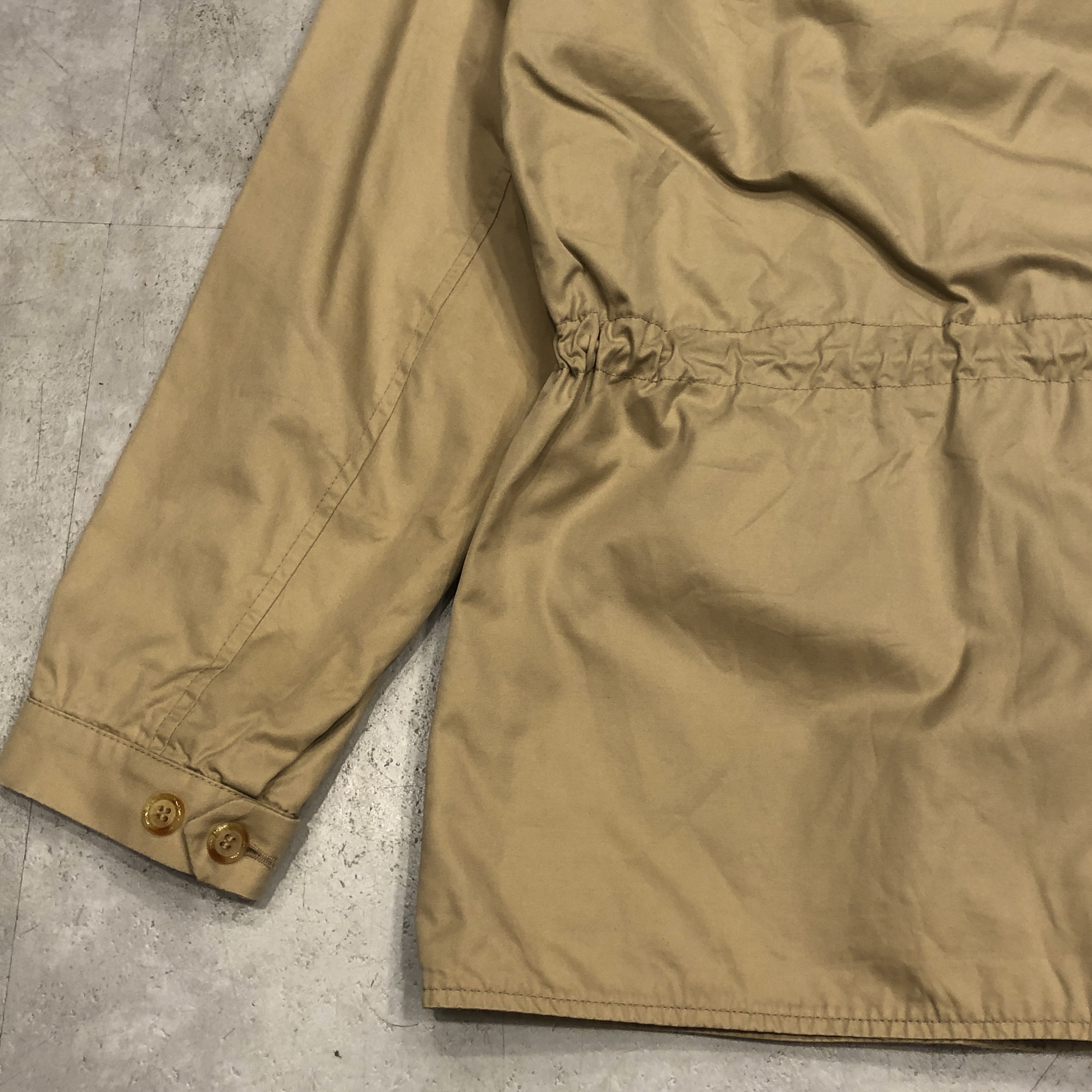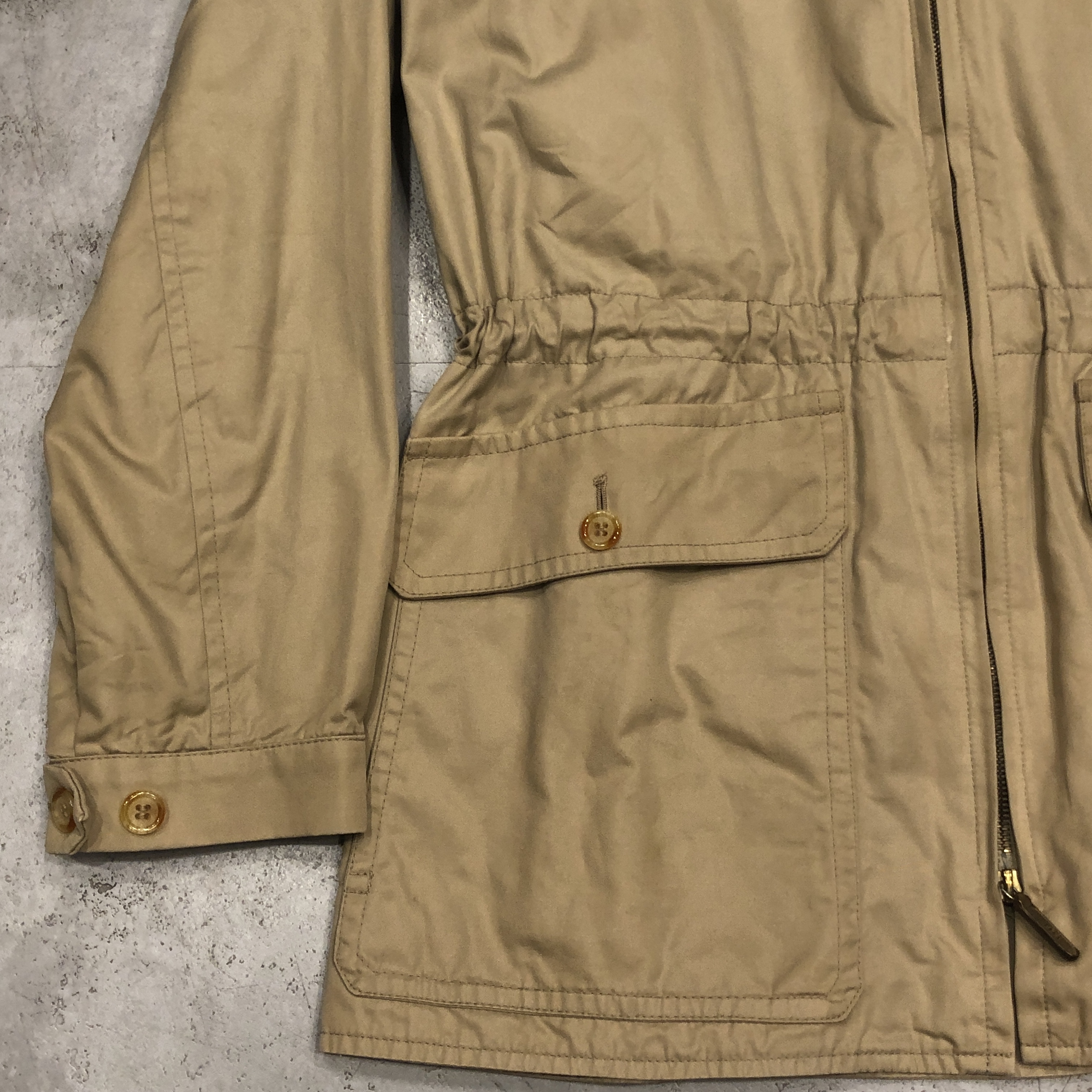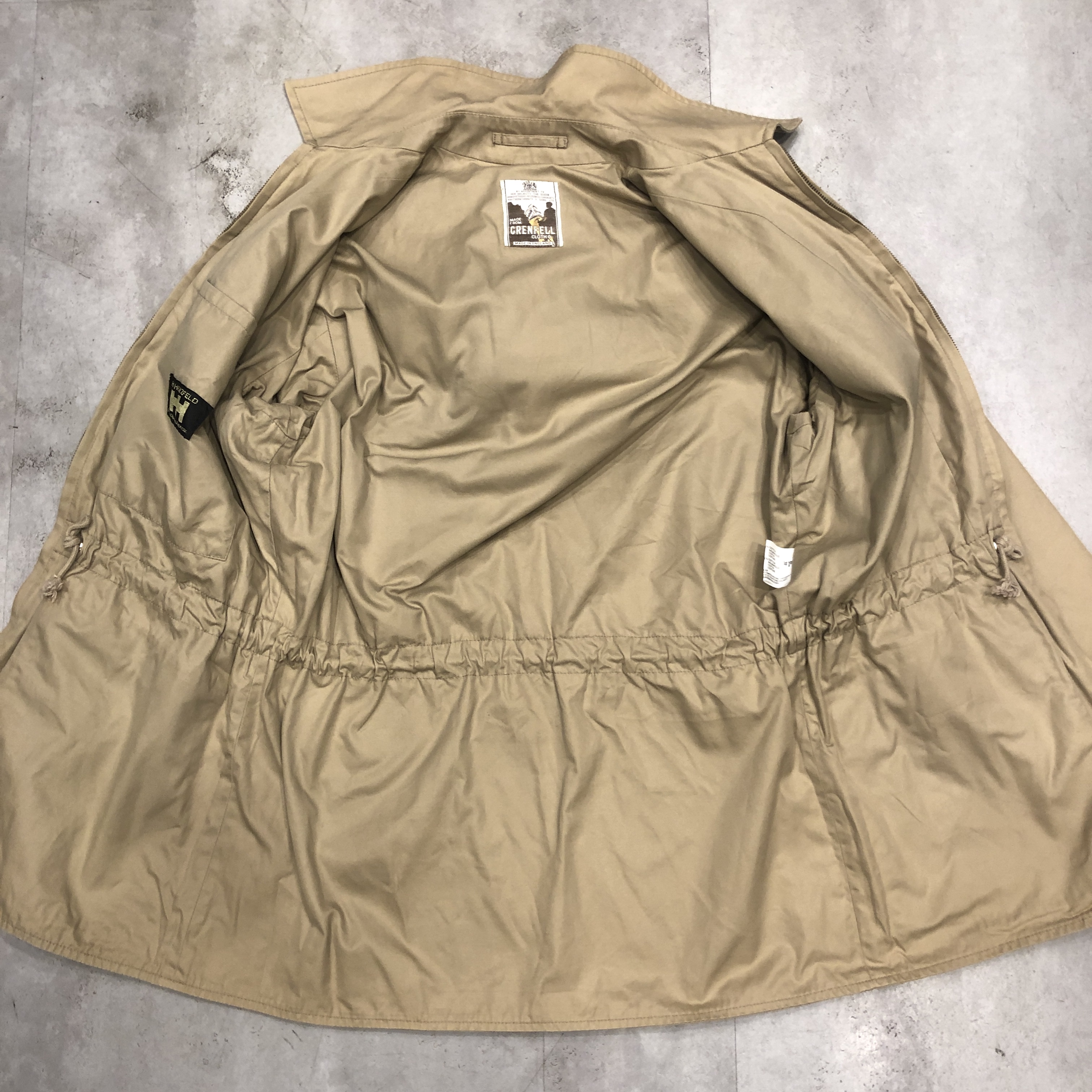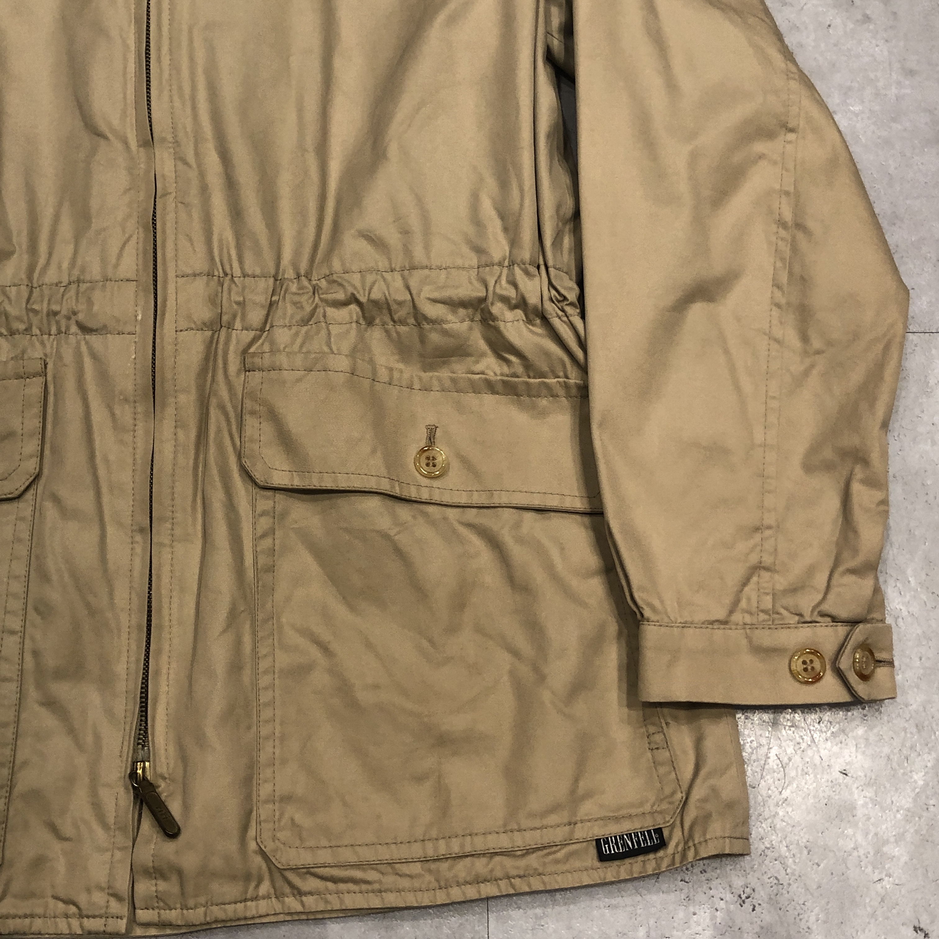 ディテールはまさにフィールドジャケットの王道。胸の斜めジップポケット、ウエストのドローコード、ゆったりとした袖付けなど、実用一辺倒の構造ながら、どこか上品にまとまってしまうのがグレンフェルの名品たる所以。