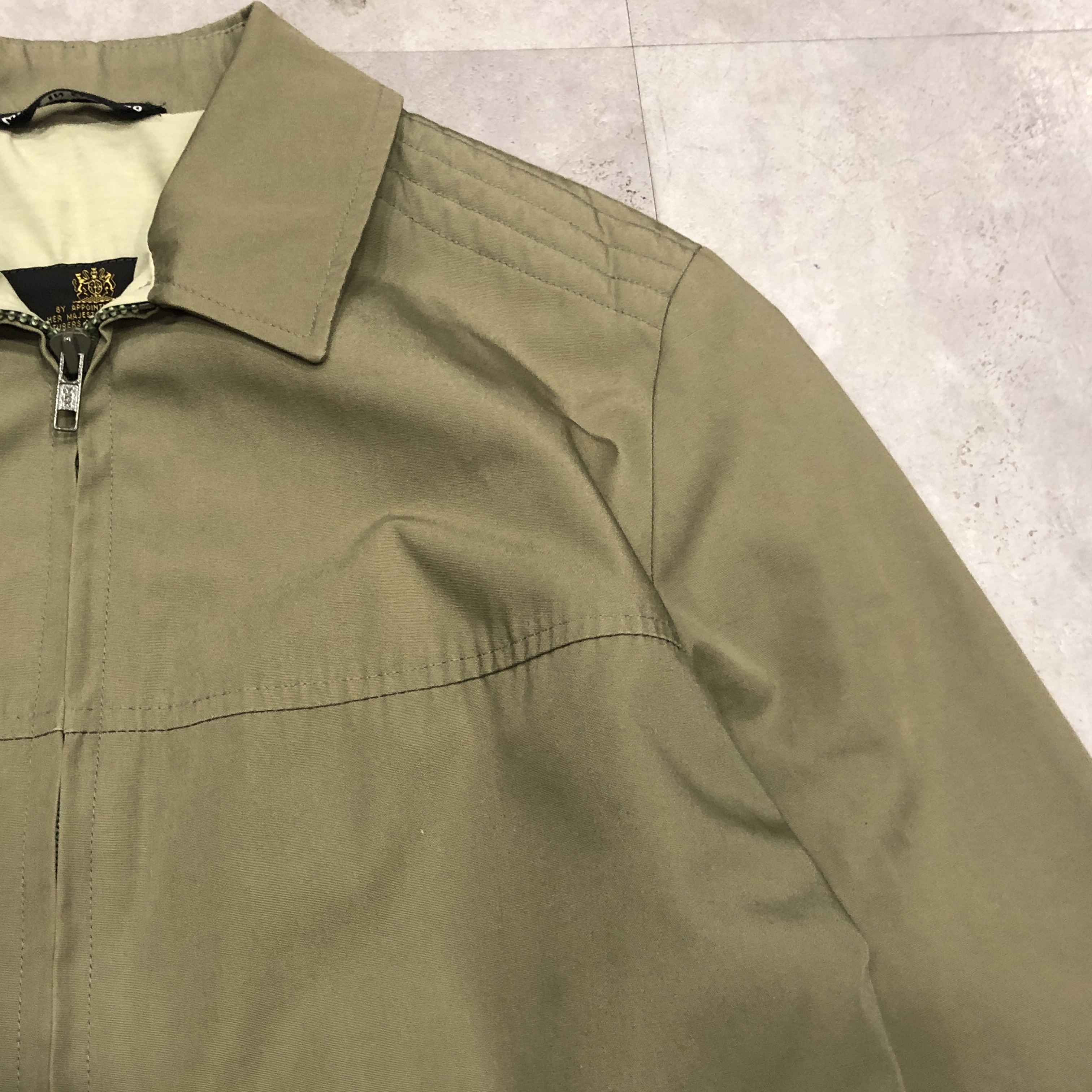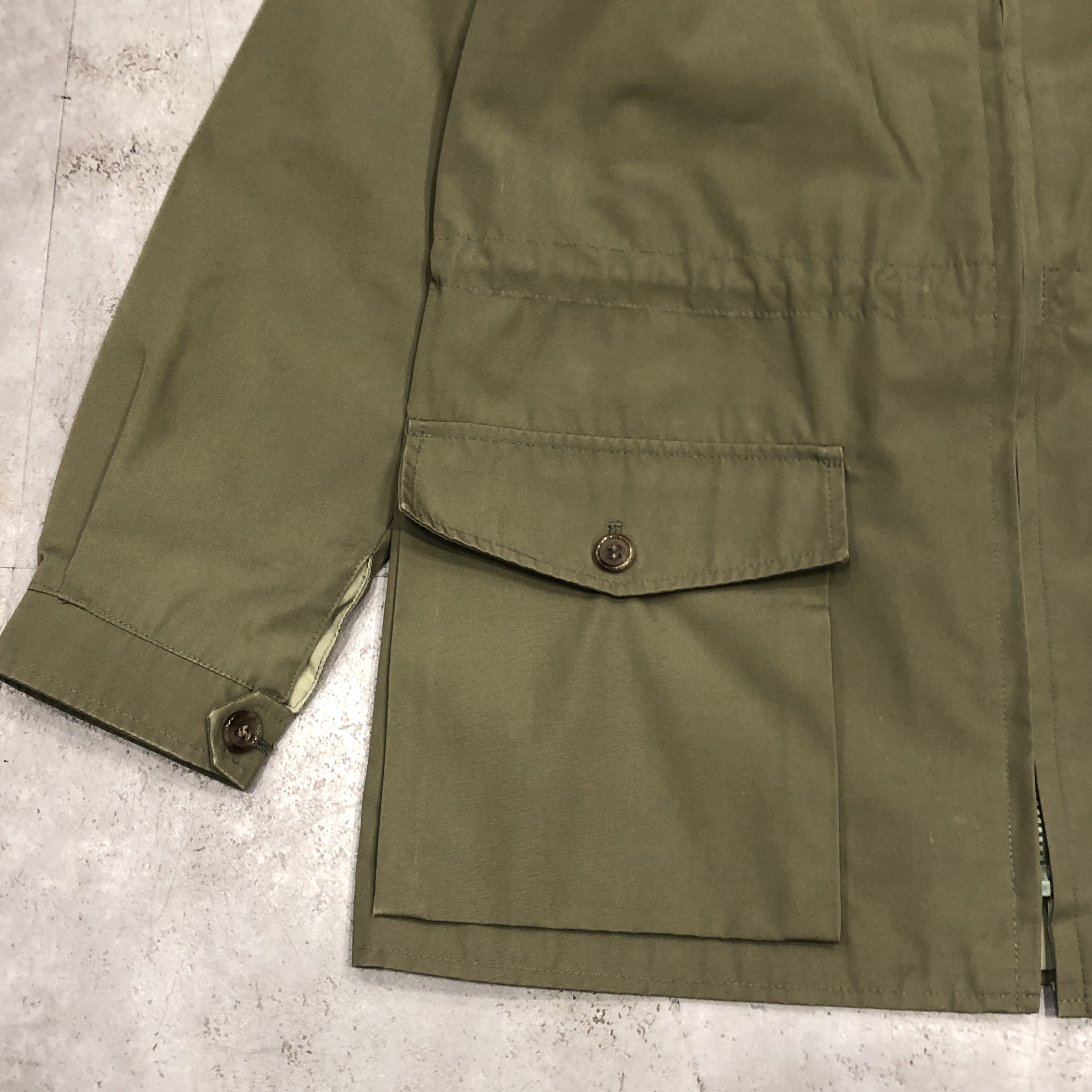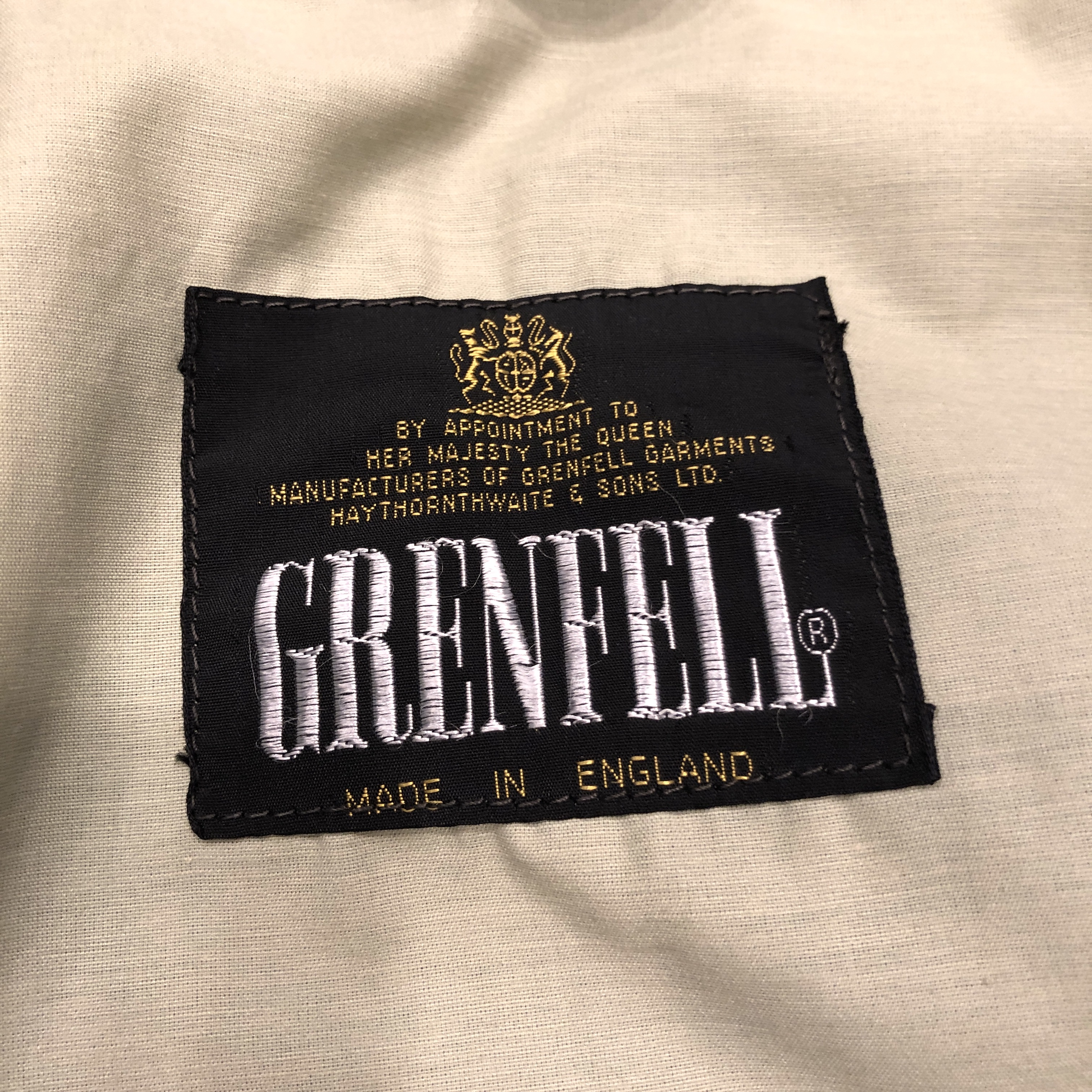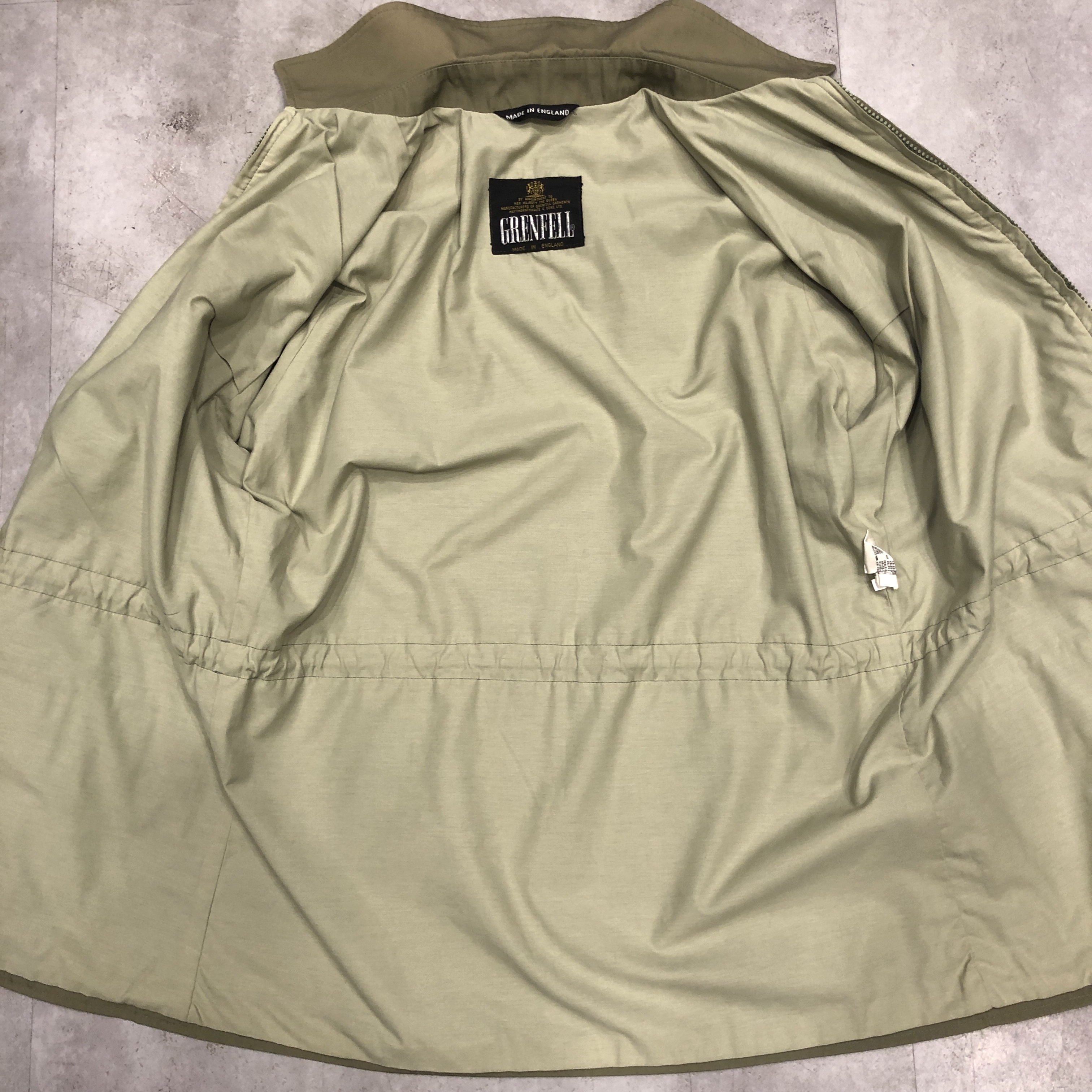 まず印象的なのは、カーキ〜サンドに近い淡いオリーブグリーンのトーン。肩に見られるキルティング風のショルダーデザインなど、ミリタリースタイルを参照しつつも、GRENFELLらしい洗練が感じられます。裏地には「Made in England」と記されたタグも見受けられ、英国製のクオリティが現物からも伝わってきます。