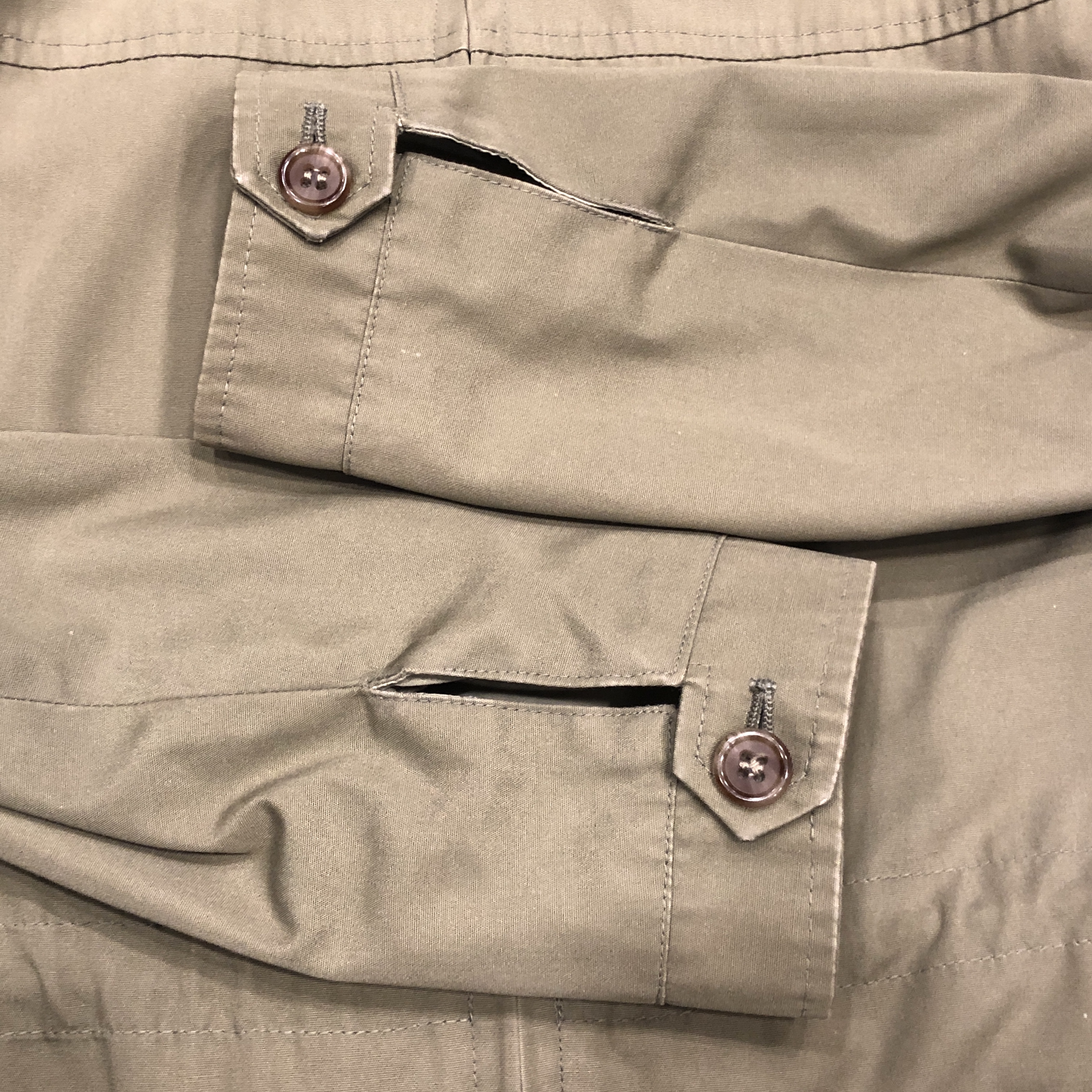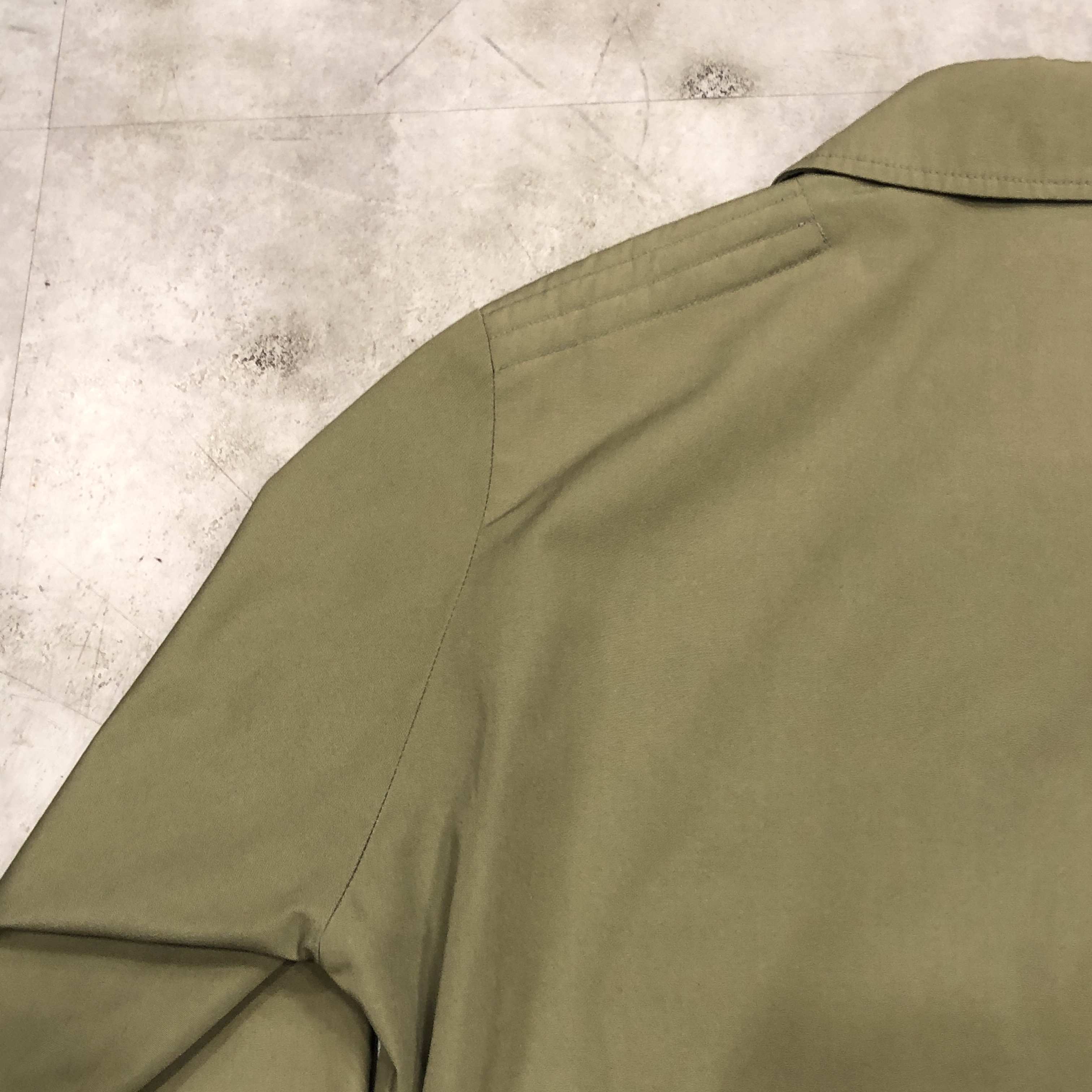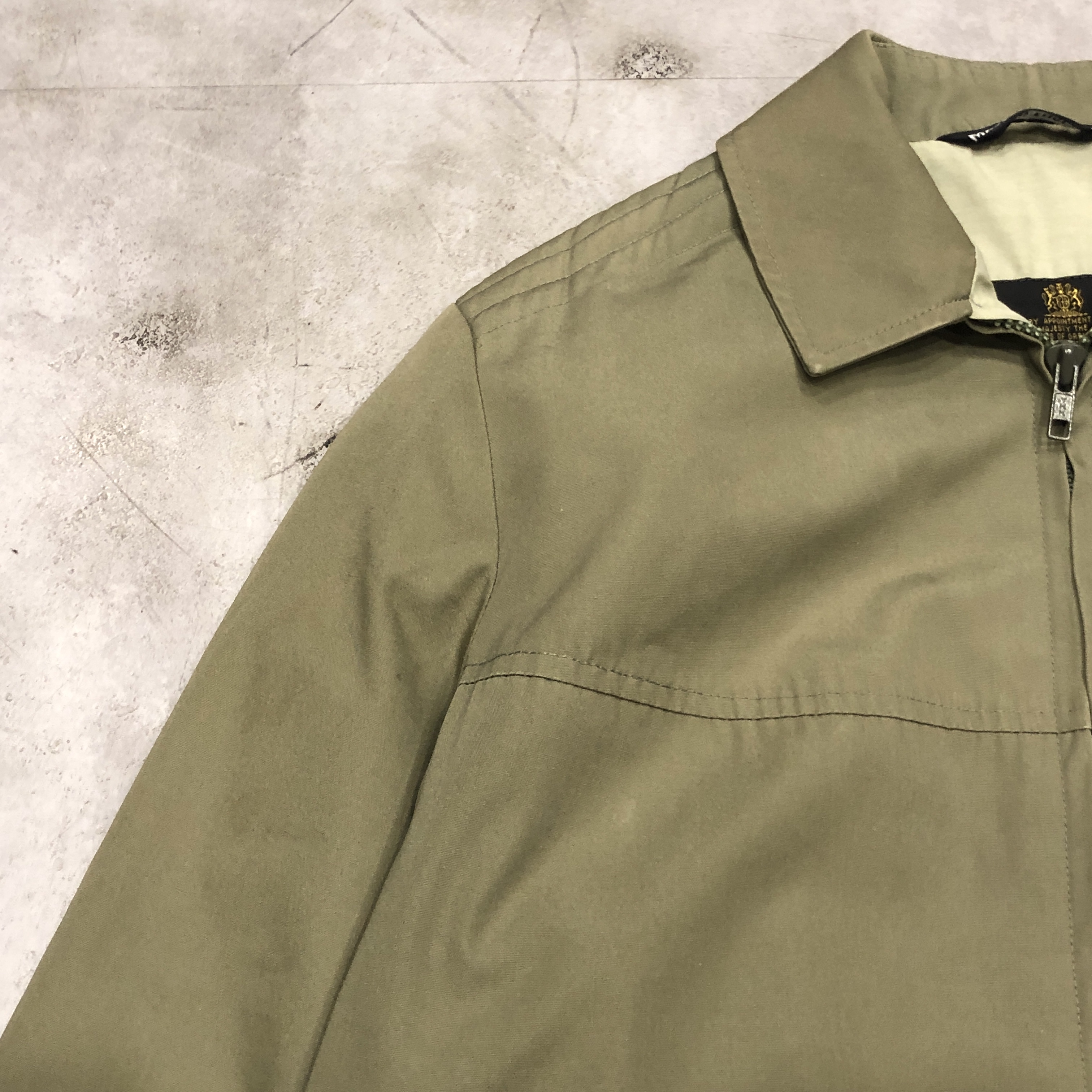 まず印象的なのは、カーキ〜サンドに近い淡いオリーブグリーンのトーン。肩に見られるキルティング風のショルダーデザインなど、ミリタリースタイルを参照しつつも、GRENFELLらしい洗練が感じられます。裏地には「Made in England」と記されたタグも見受けられ、英国製のクオリティが現物からも伝わってきます。