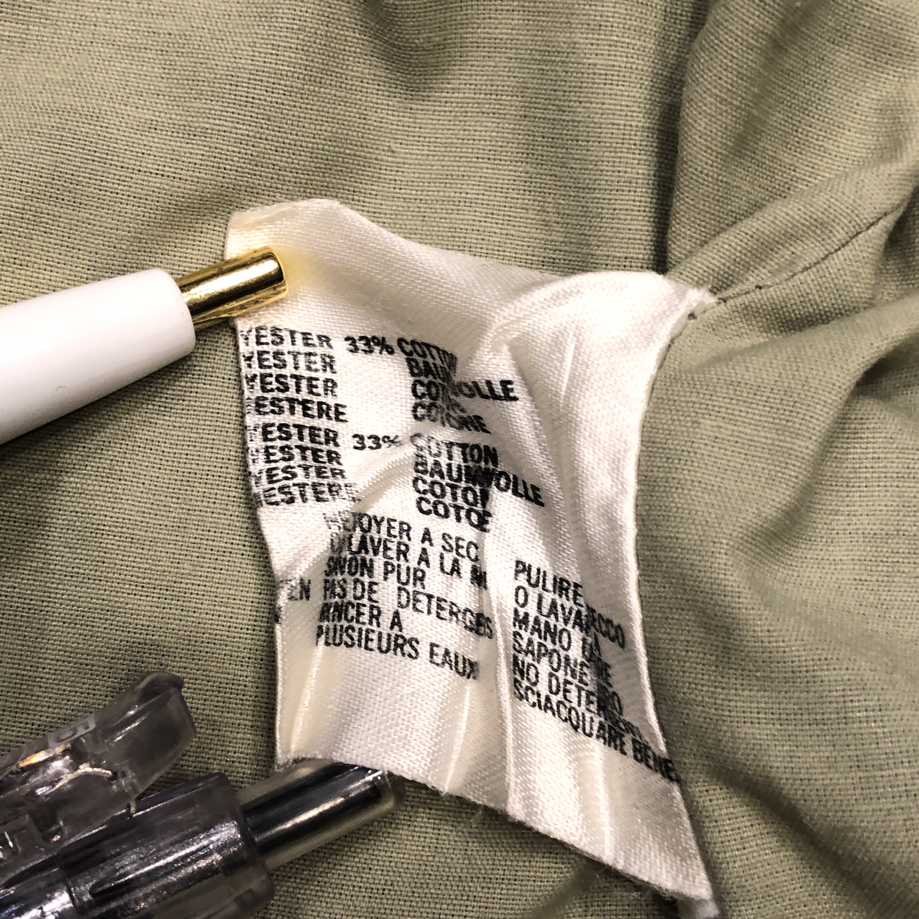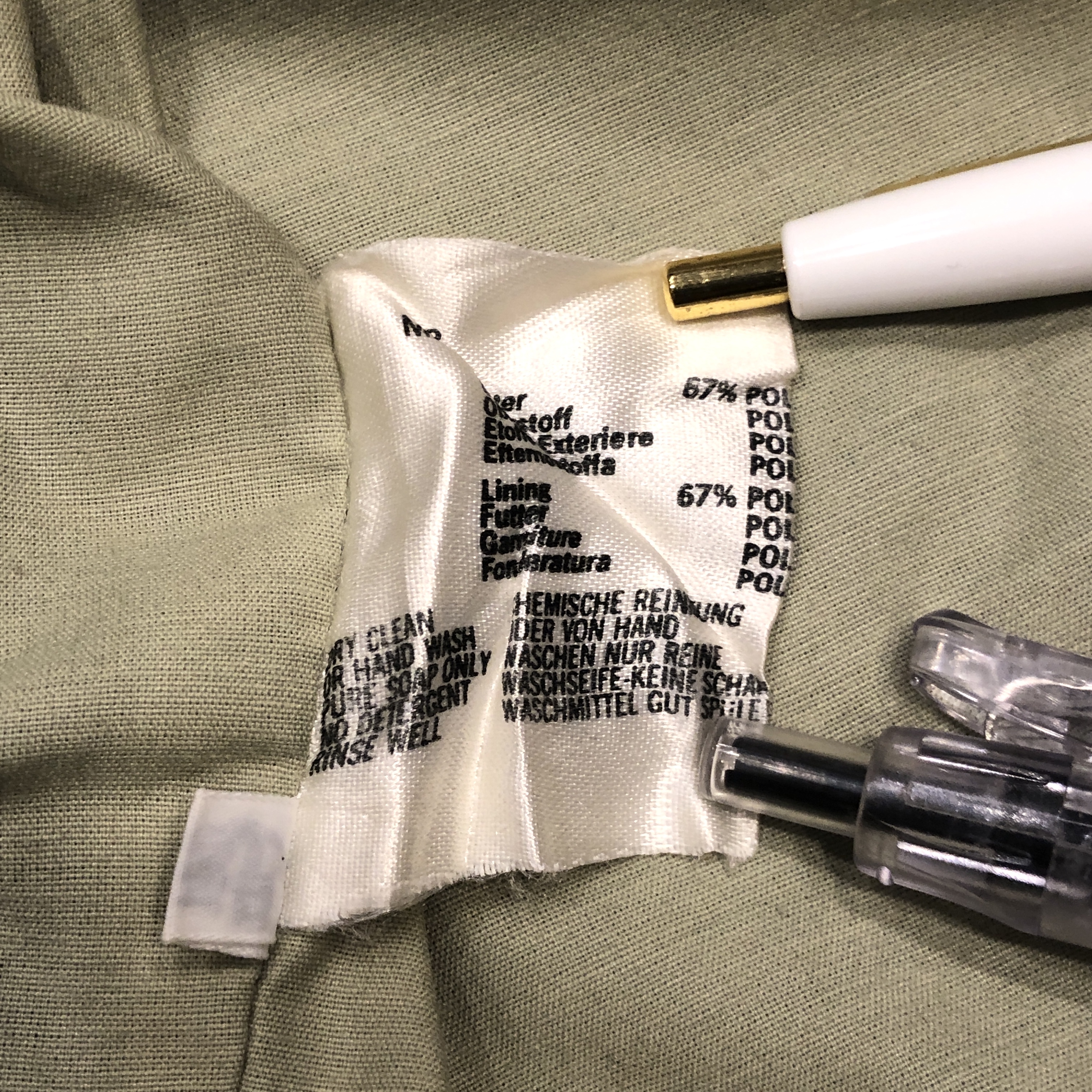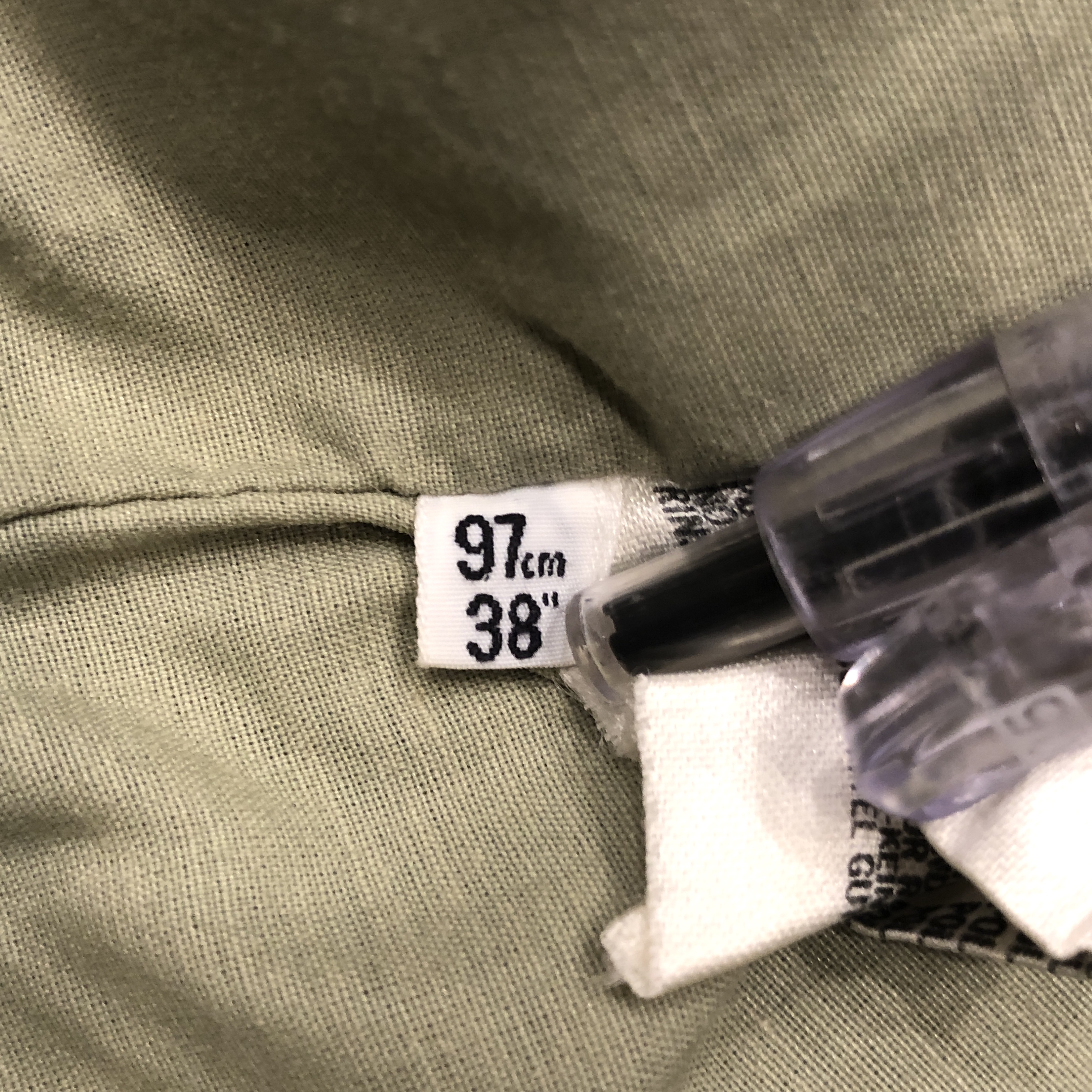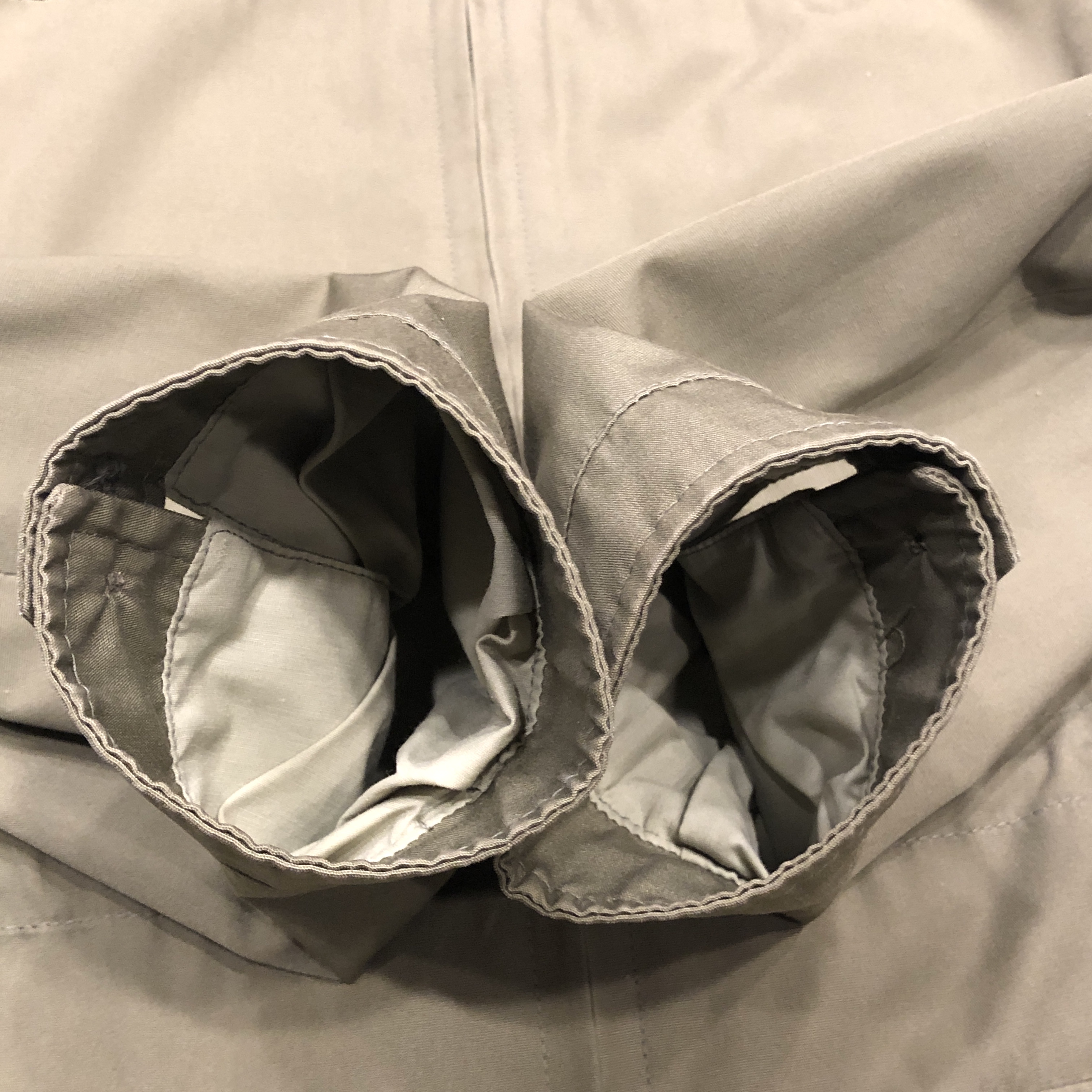 まず印象的なのは、カーキ〜サンドに近い淡いオリーブグリーンのトーン。肩に見られるキルティング風のショルダーデザインなど、ミリタリースタイルを参照しつつも、GRENFELLらしい洗練が感じられます。裏地には「Made in England」と記されたタグも見受けられ、英国製のクオリティが現物からも伝わってきます。