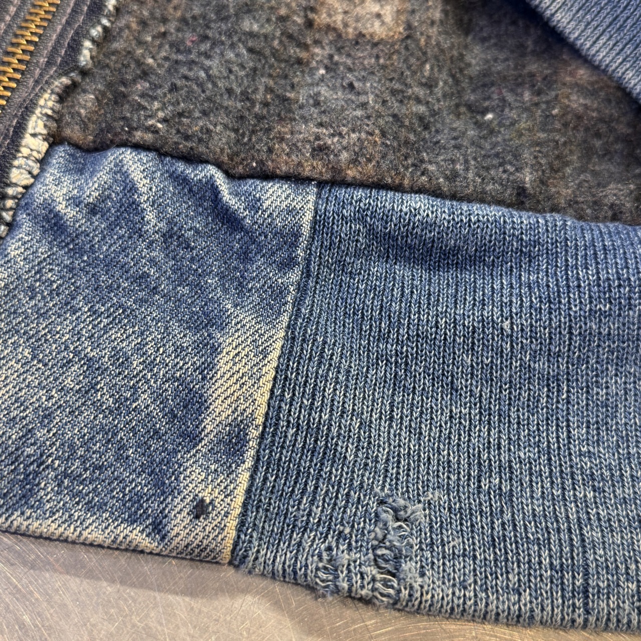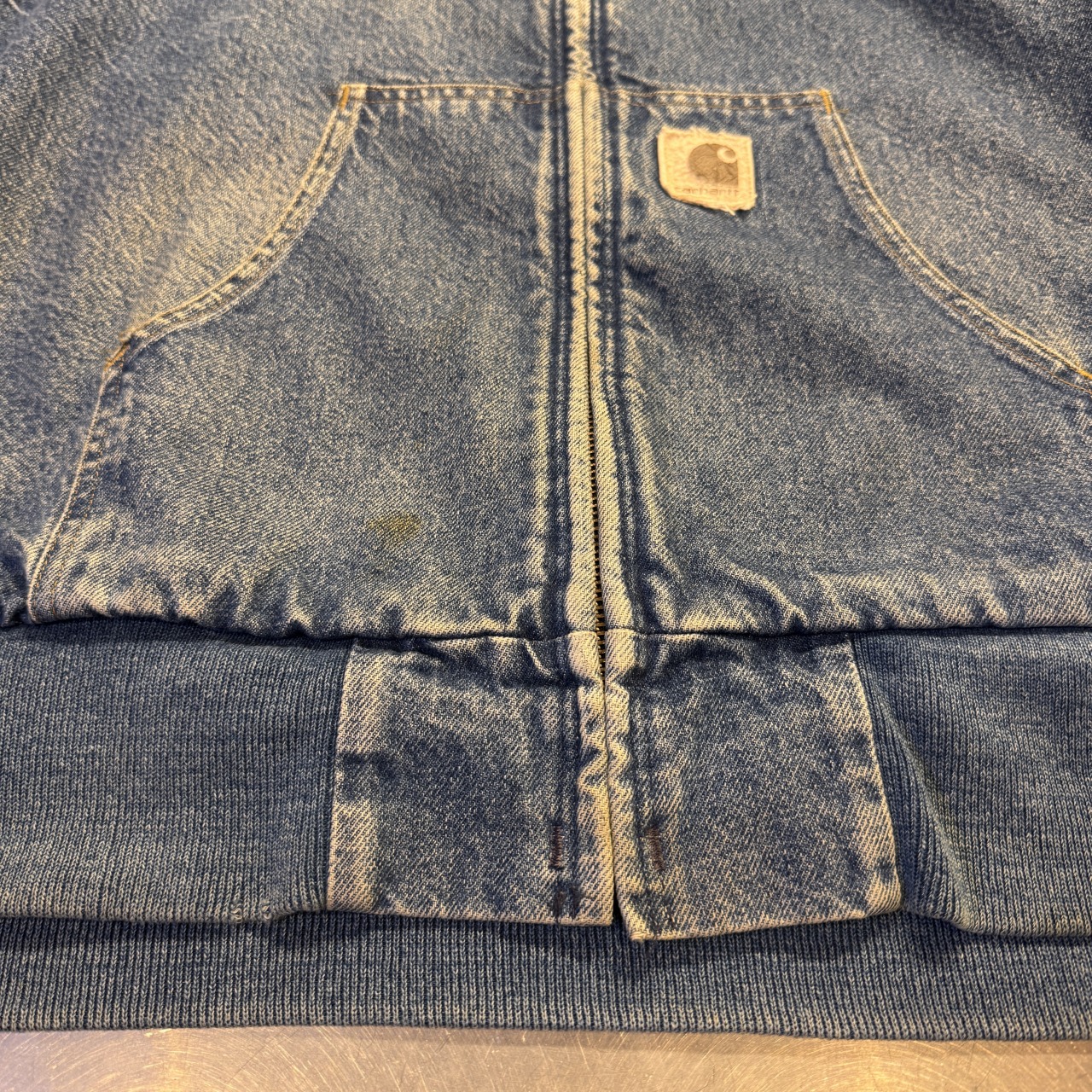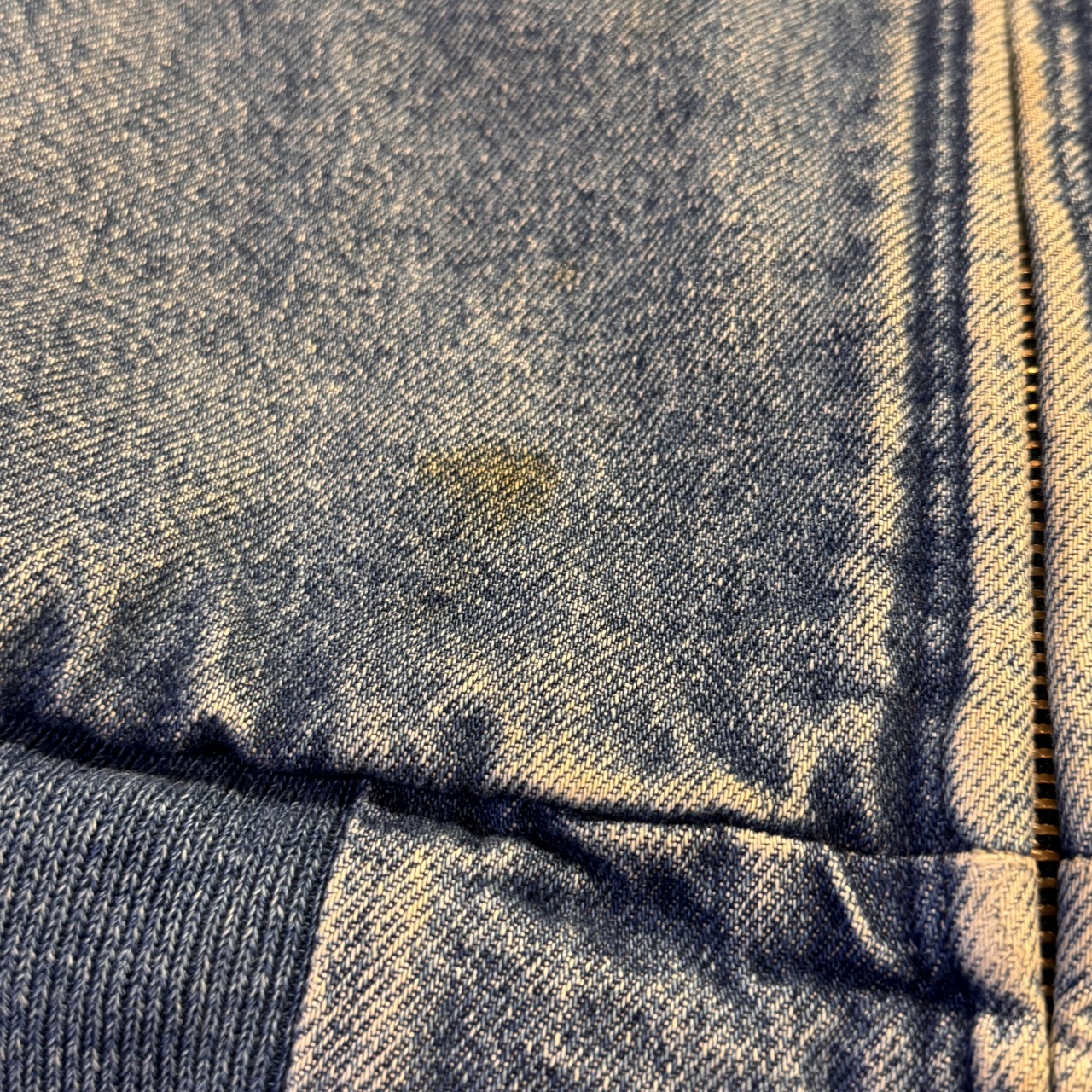 - 袖先ダメージ、袖リブの広がり、フロントにシミ、内部毛玉等の着用感がございますが、問題なく着用可能な状態です。