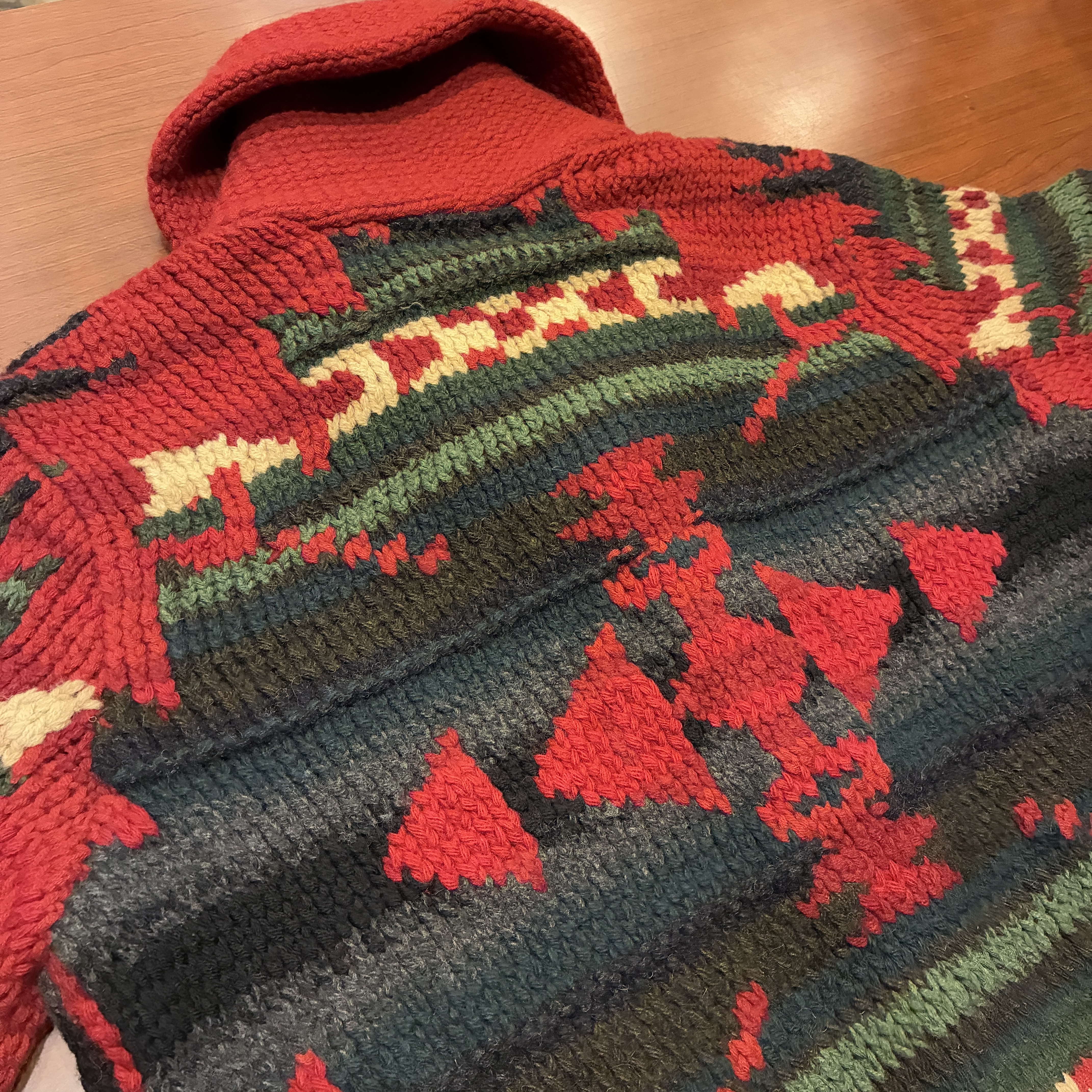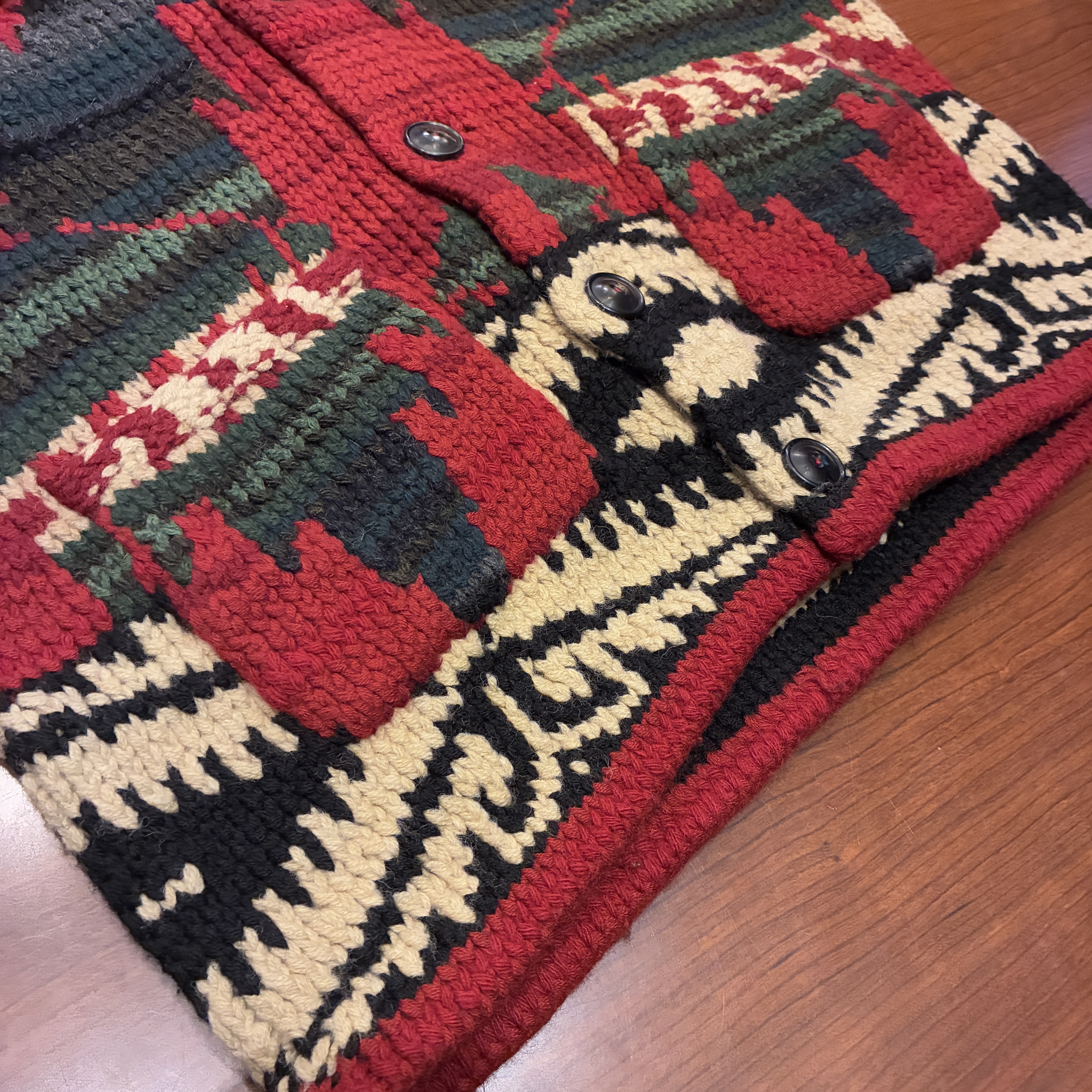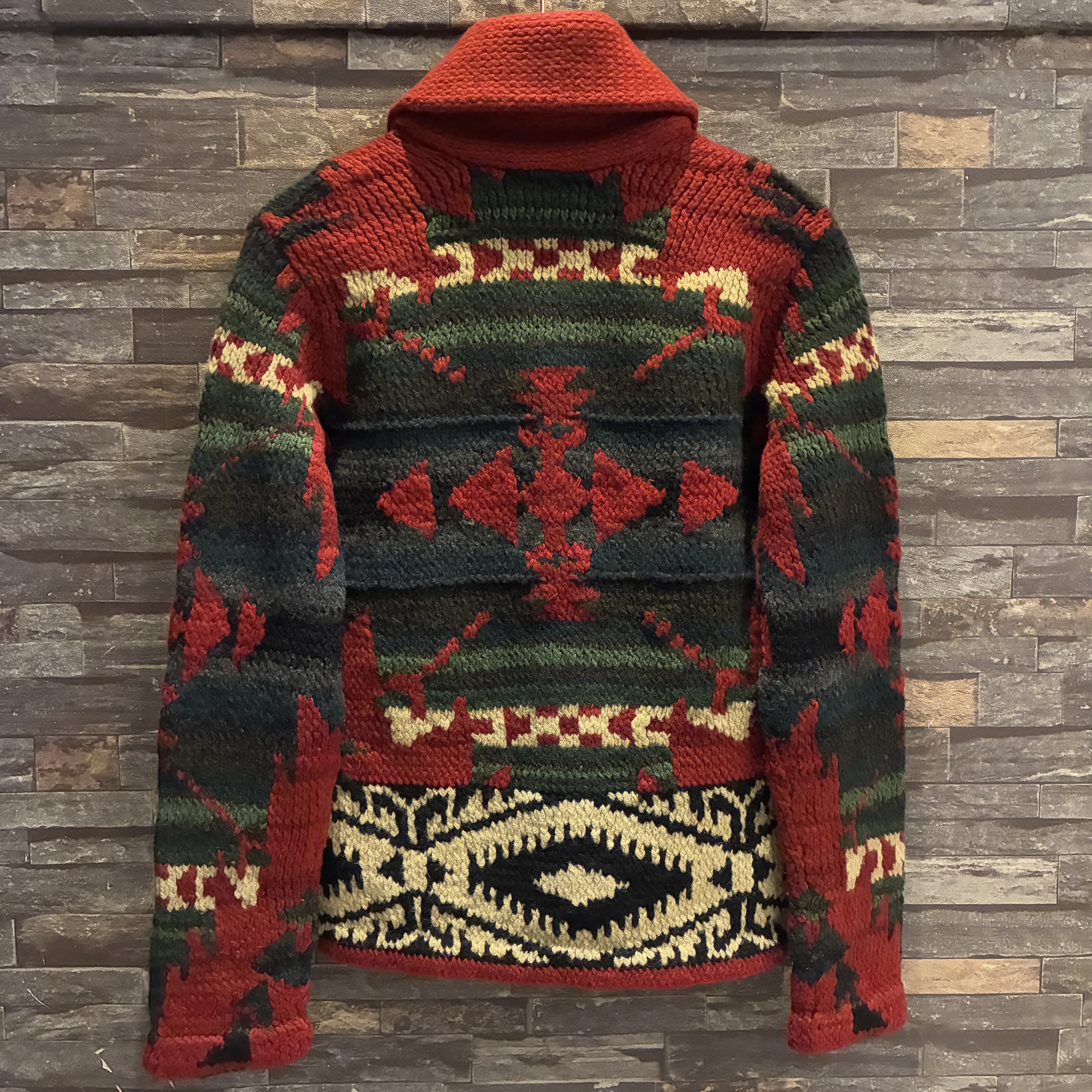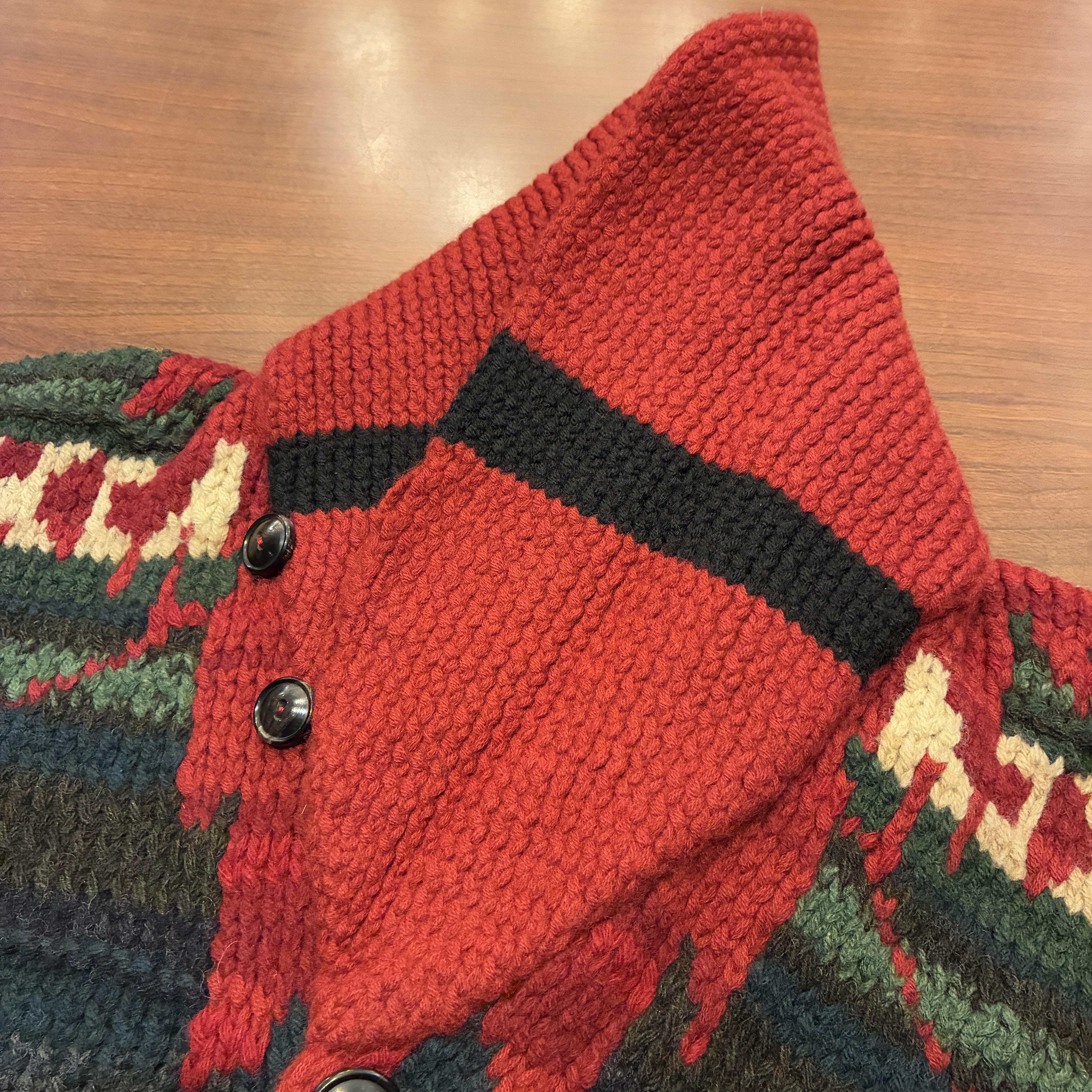 - ハンドニット製品特有の糸の飛び出しや多少の毛羽立ち等の着用感がございますが、目立つ汚れやダメージは無く問題無く着用していただける状態です。