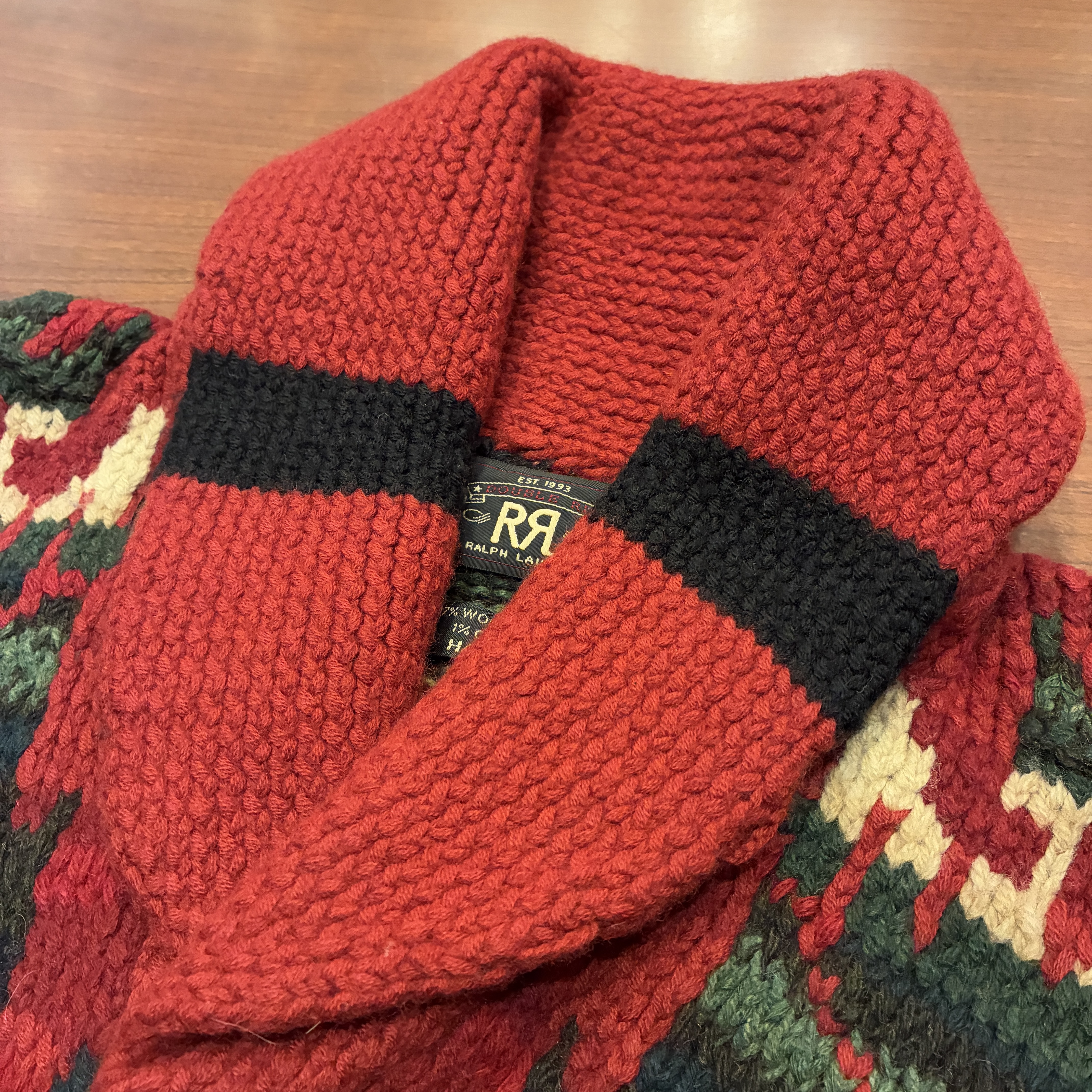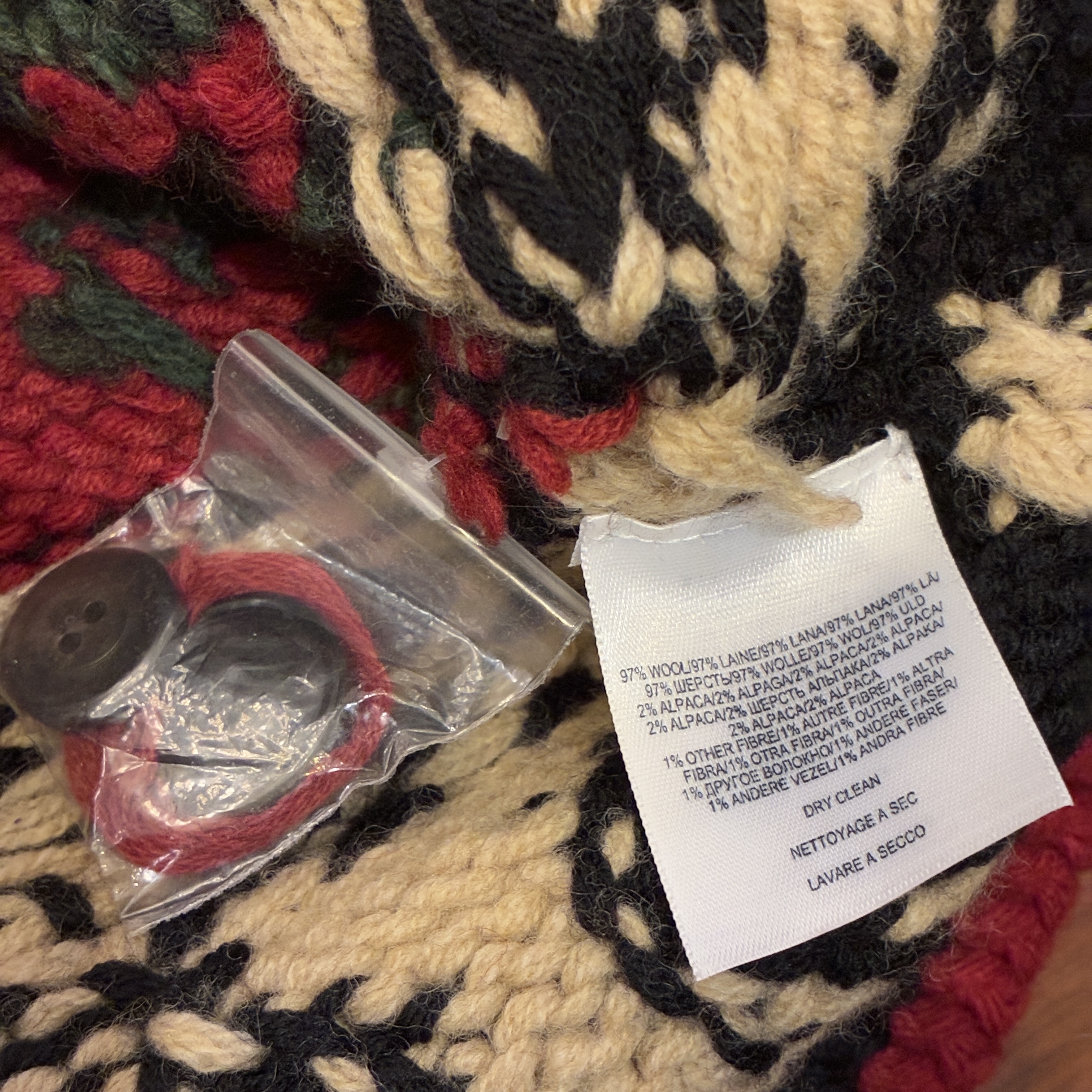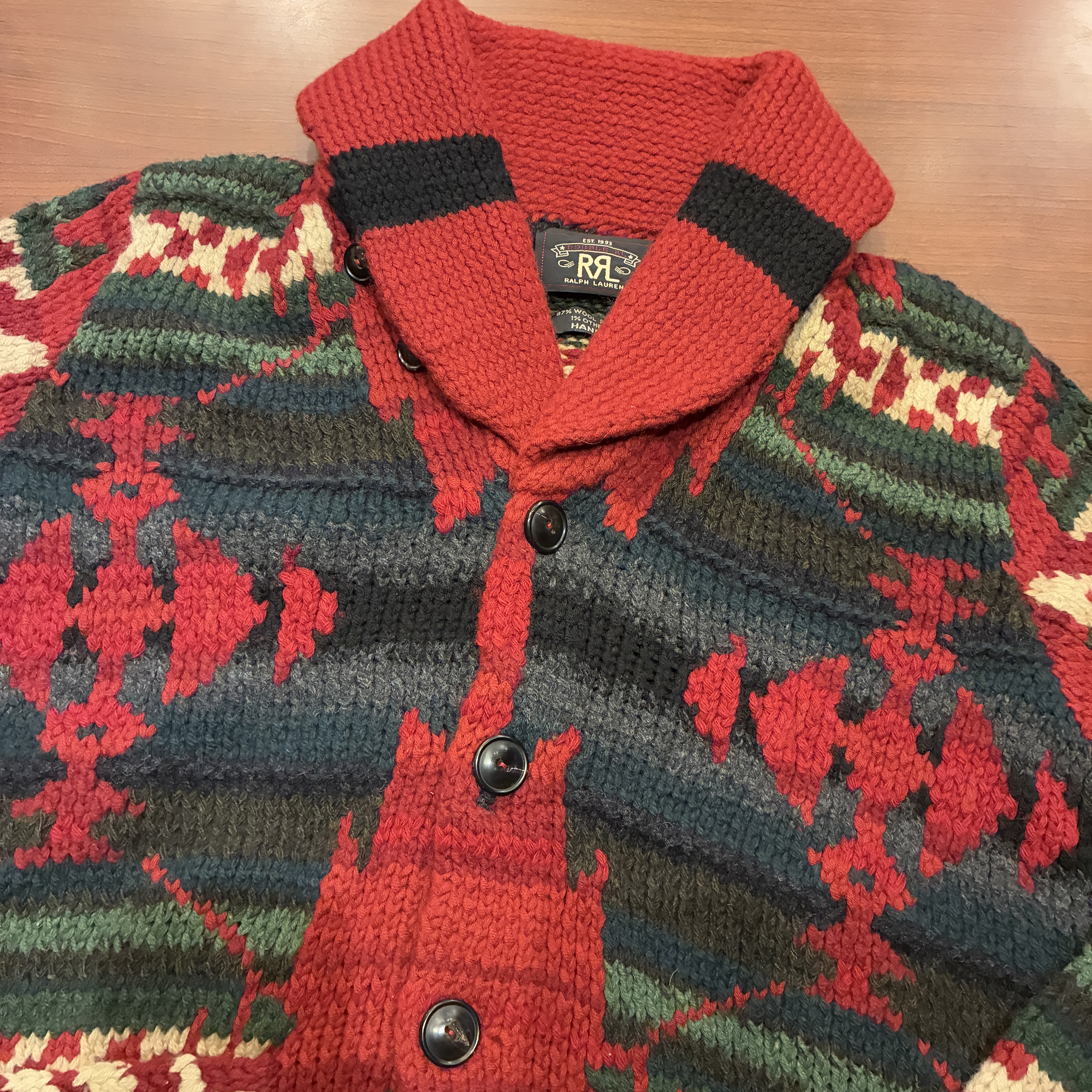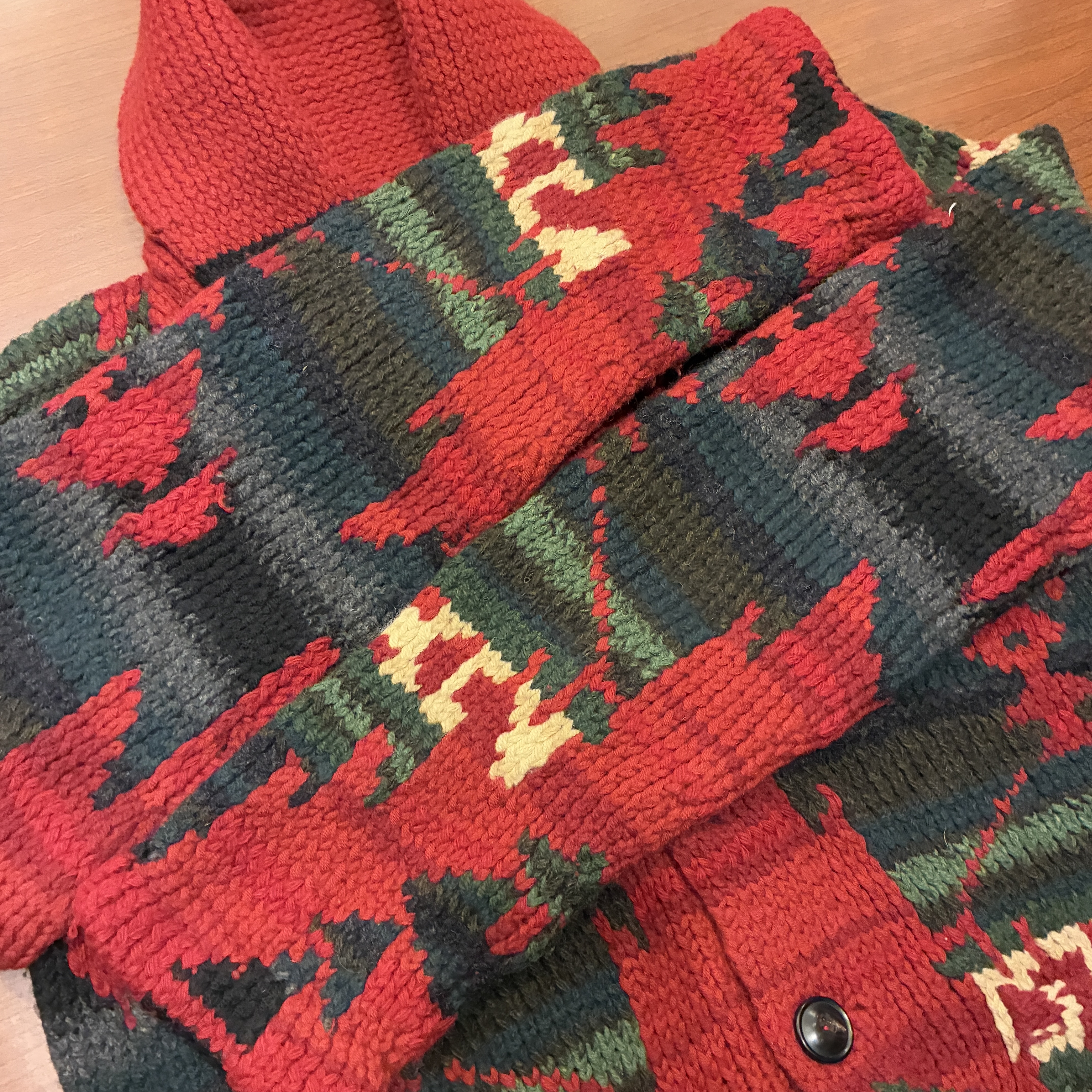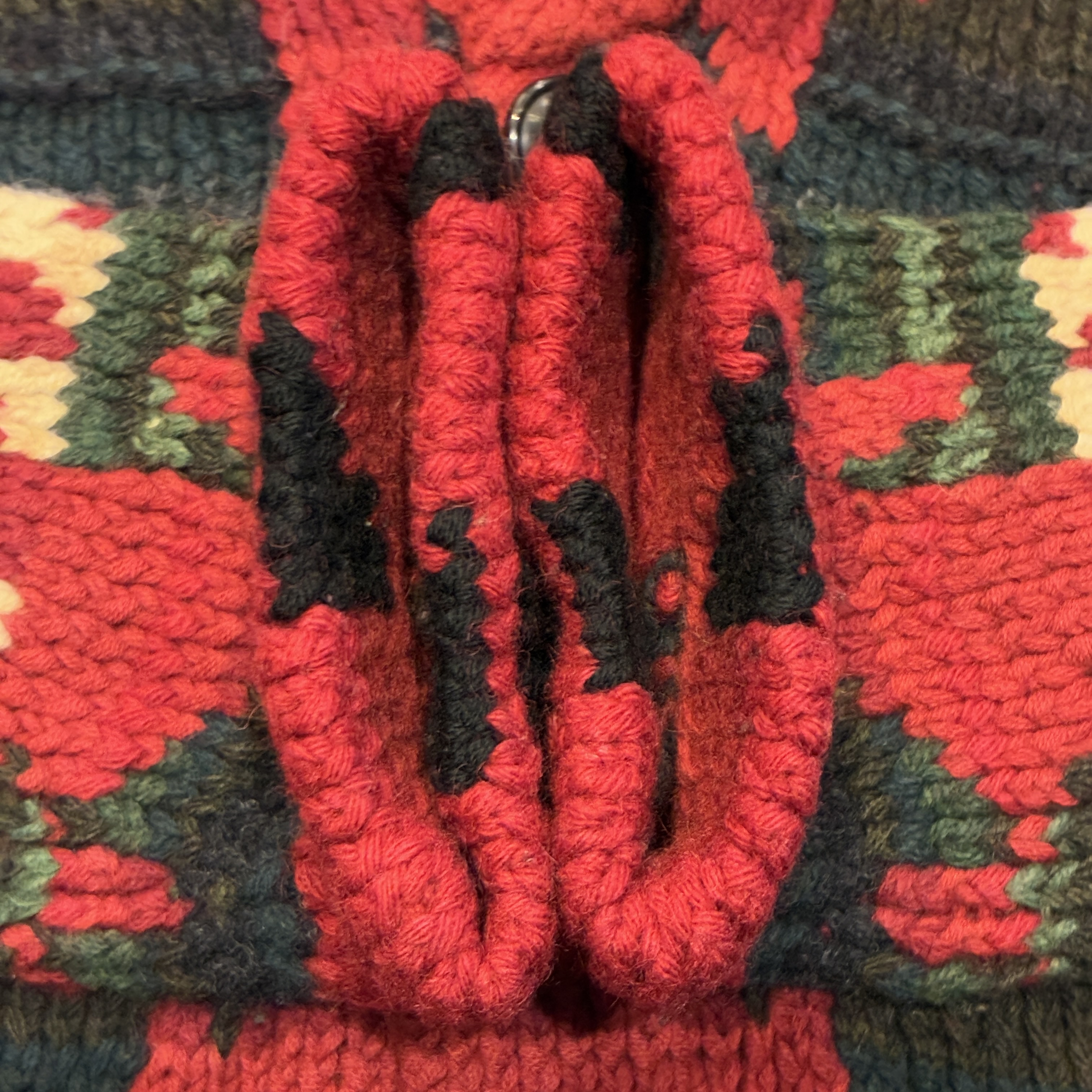 - ハンドニット製品特有の糸の飛び出しや多少の毛羽立ち等の着用感がございますが、目立つ汚れやダメージは無く問題無く着用していただける状態です。