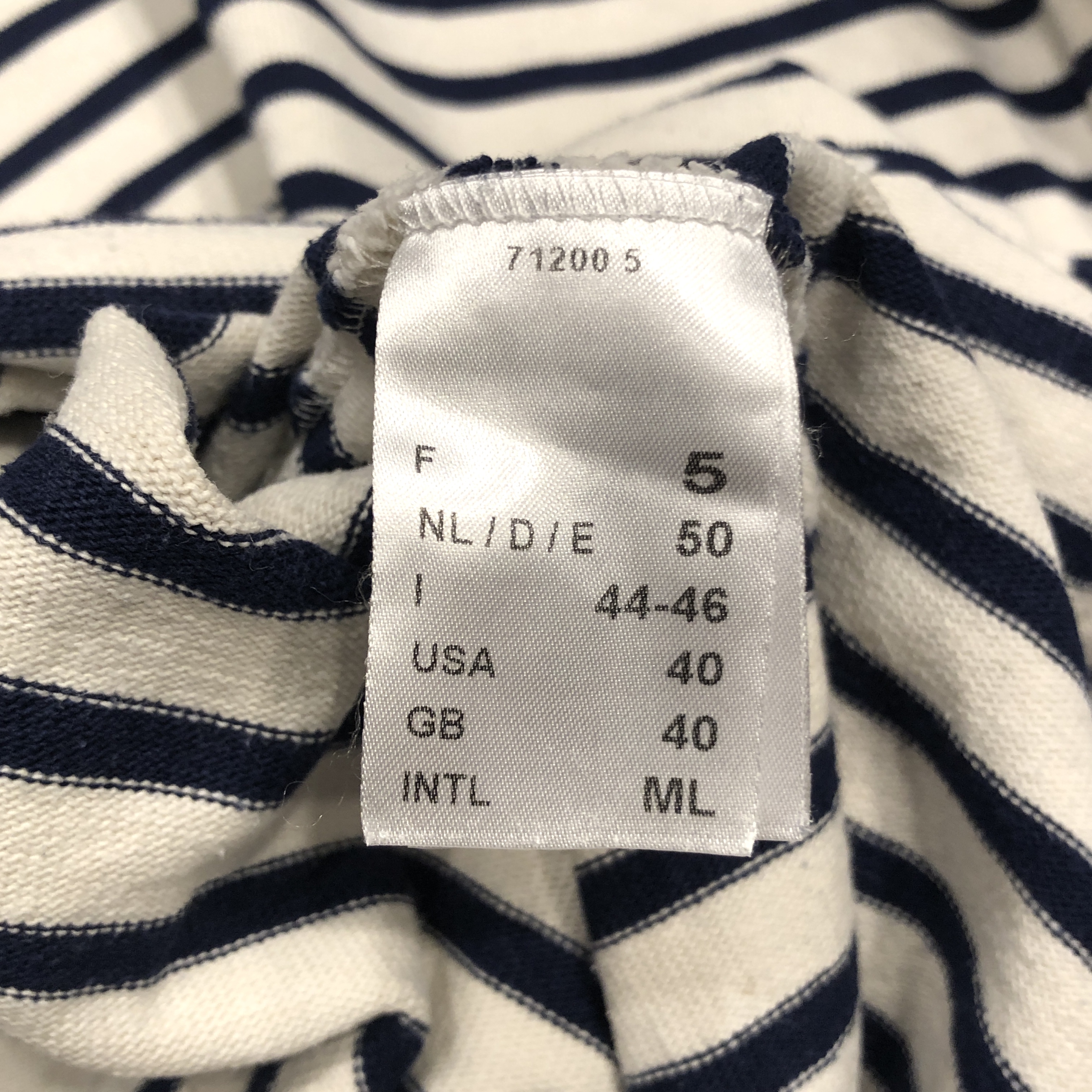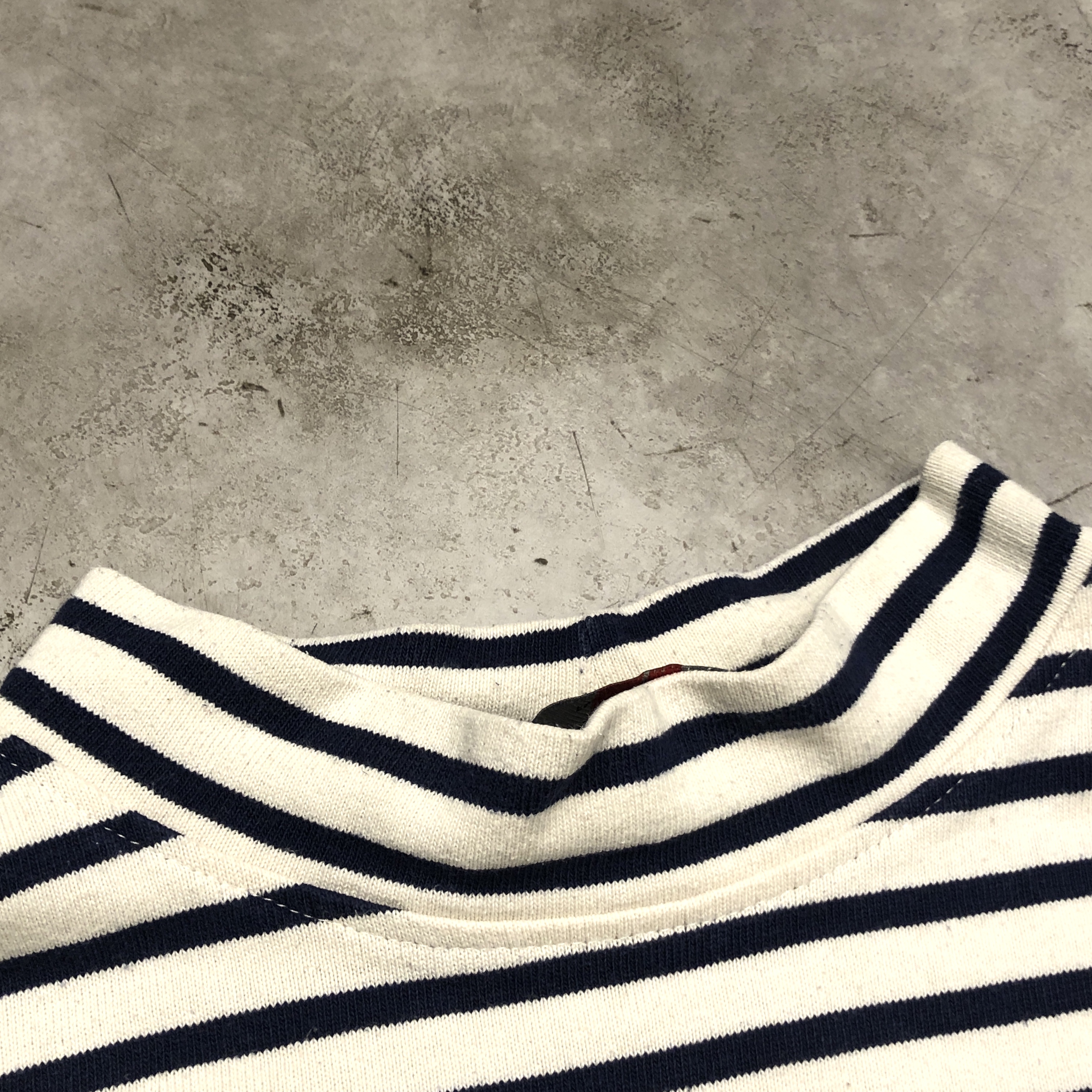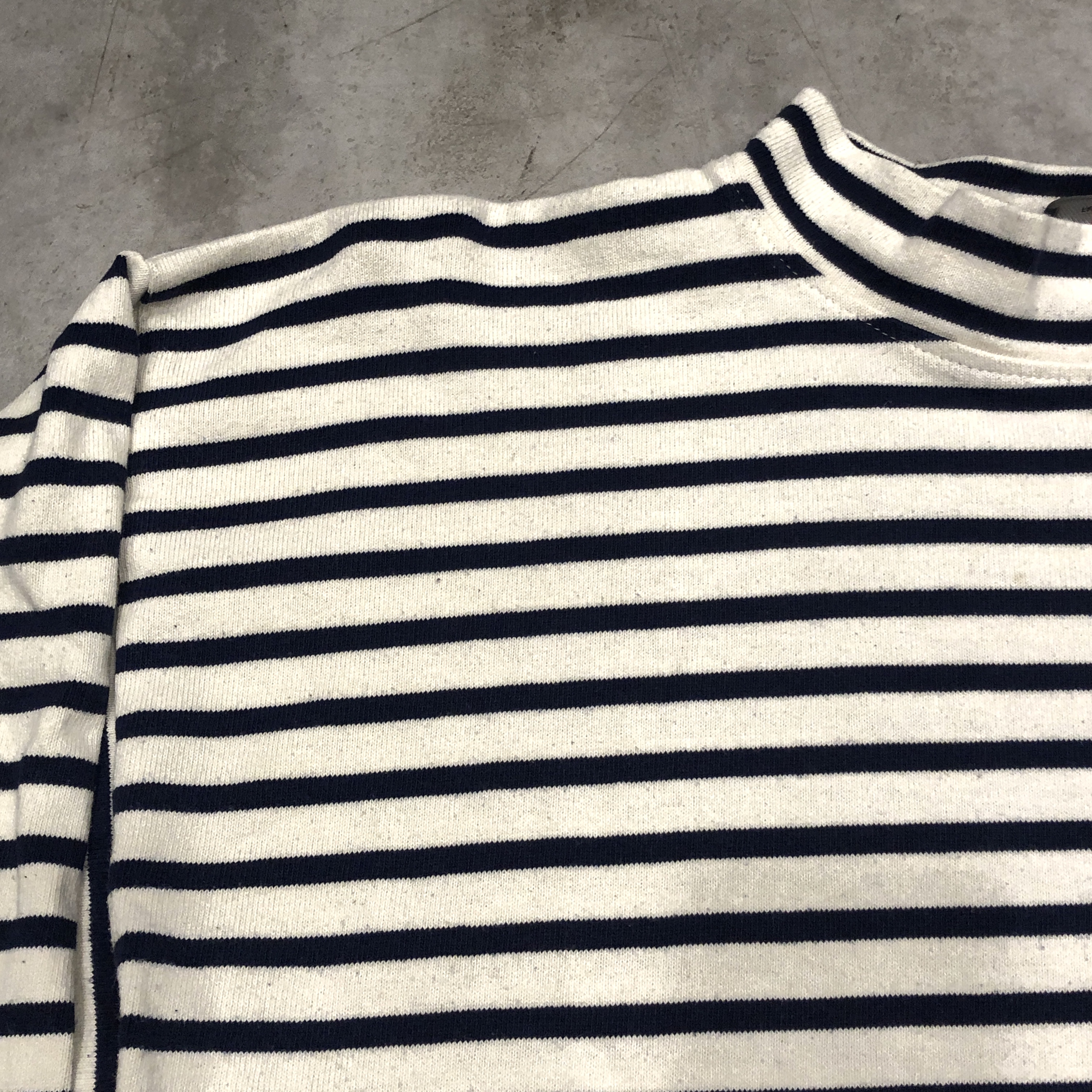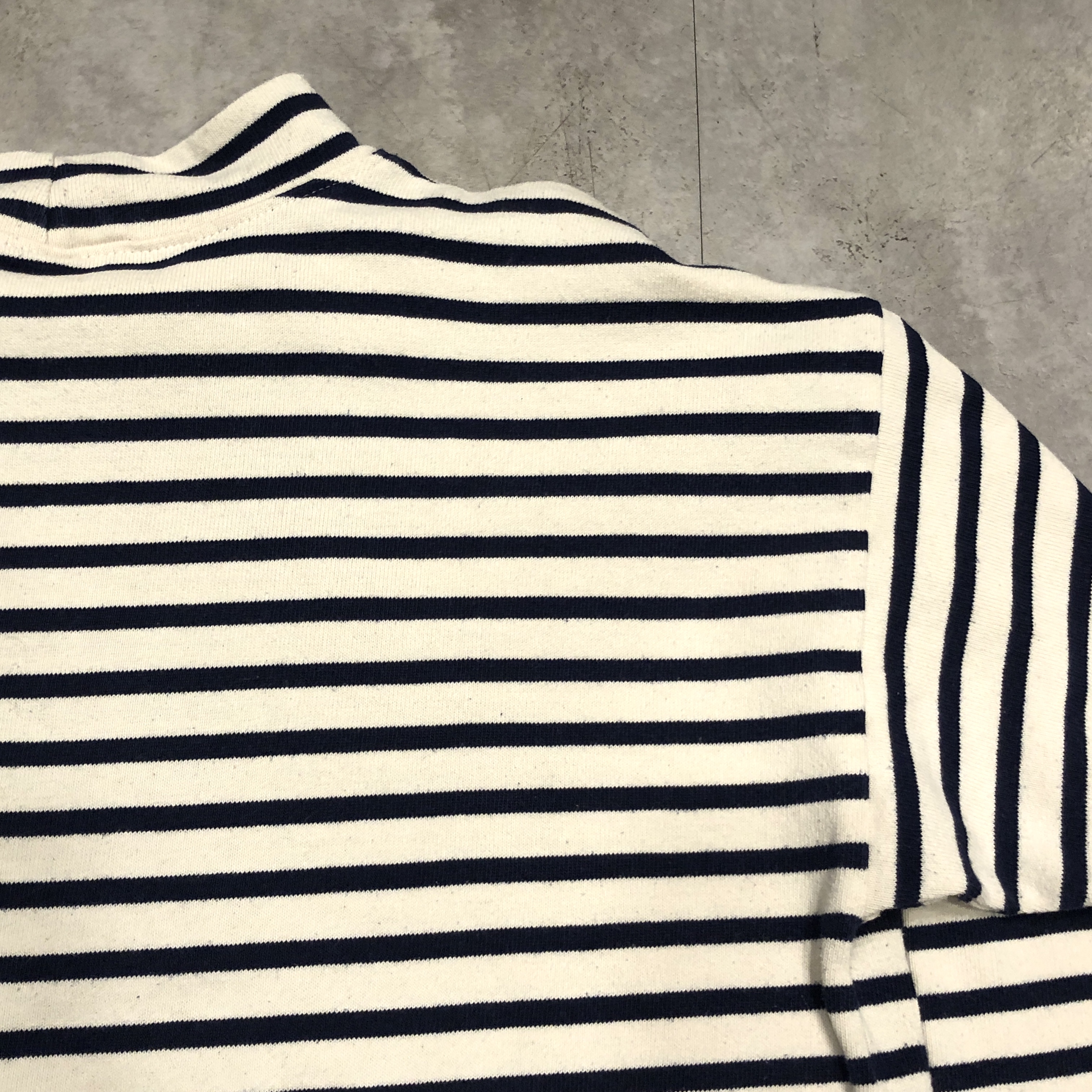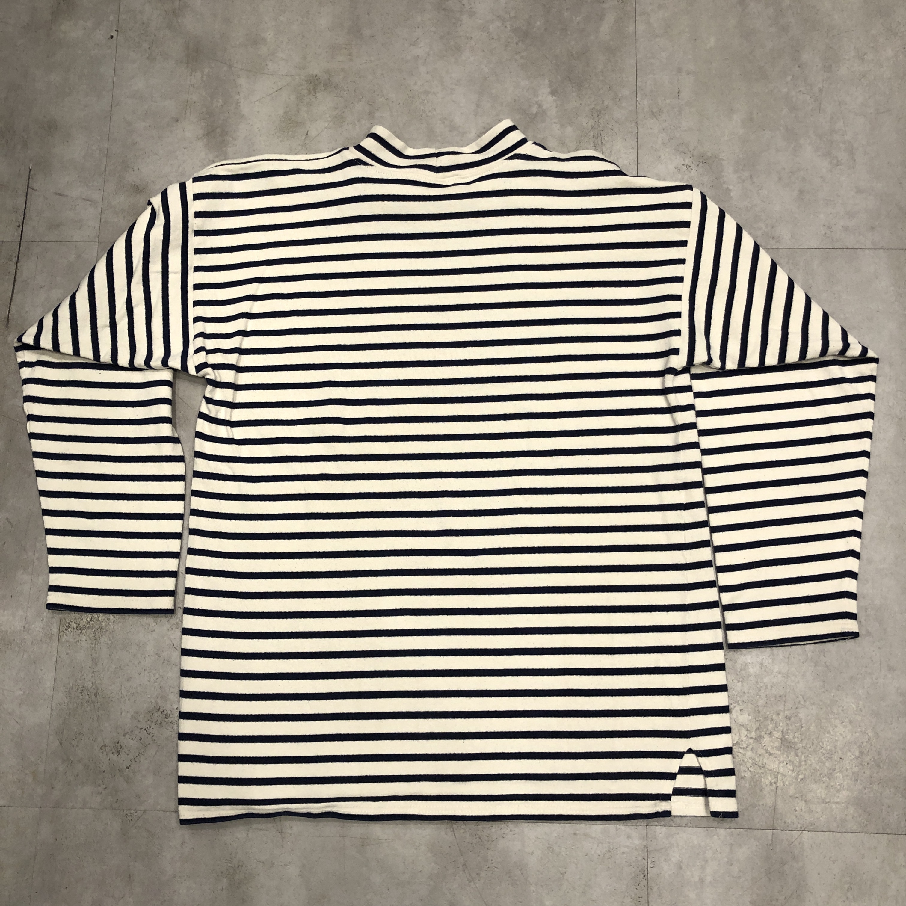 更にこちらは珍しいモックネックタイプ。肩線の落ちたストレートなパターンは、重ね着にも最適。袖口にはブランドロゴのネームパッチを控えめに配置。製造はもちろんフランス自社工場で行われ、サイズはフランス表記5(国際サイズML)で、男女問わずゆとりあるシルエットを楽しめます。