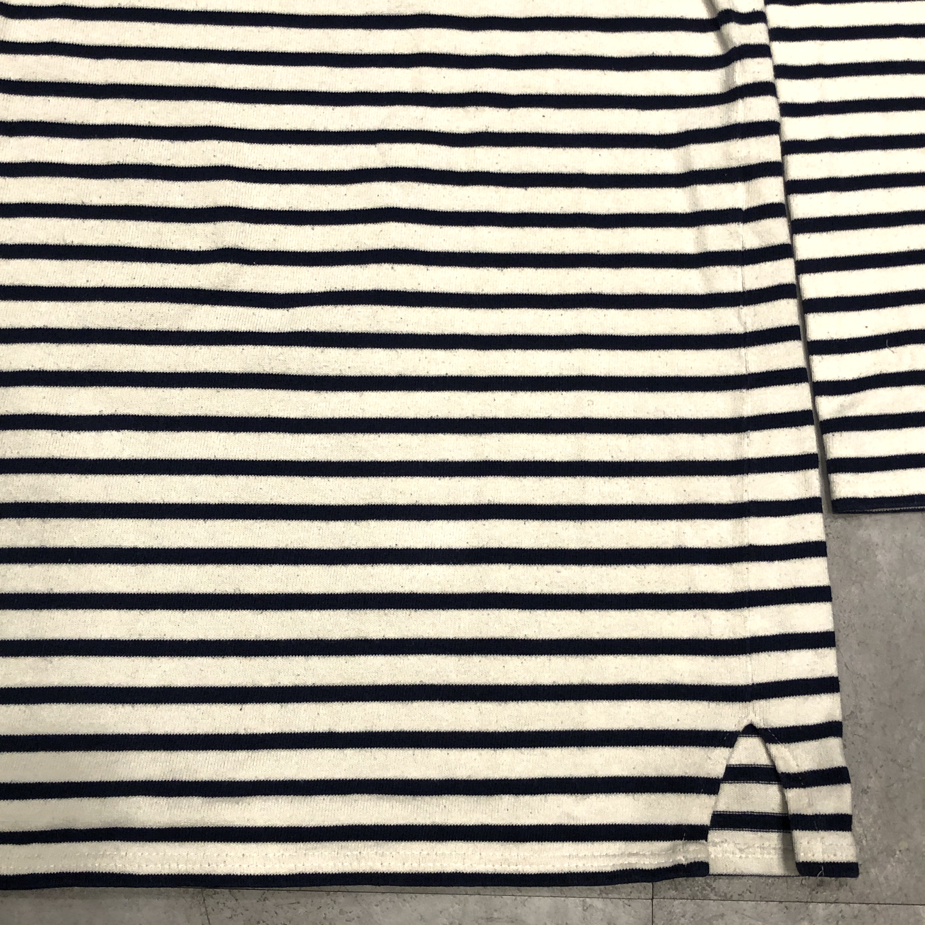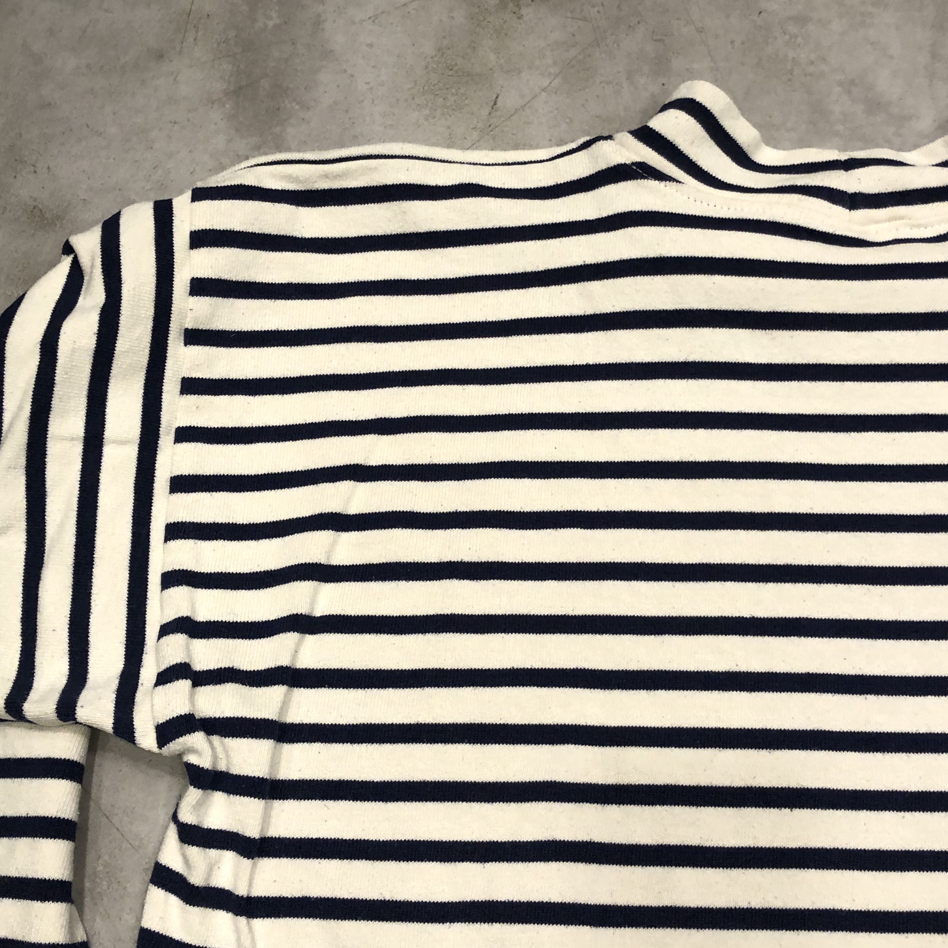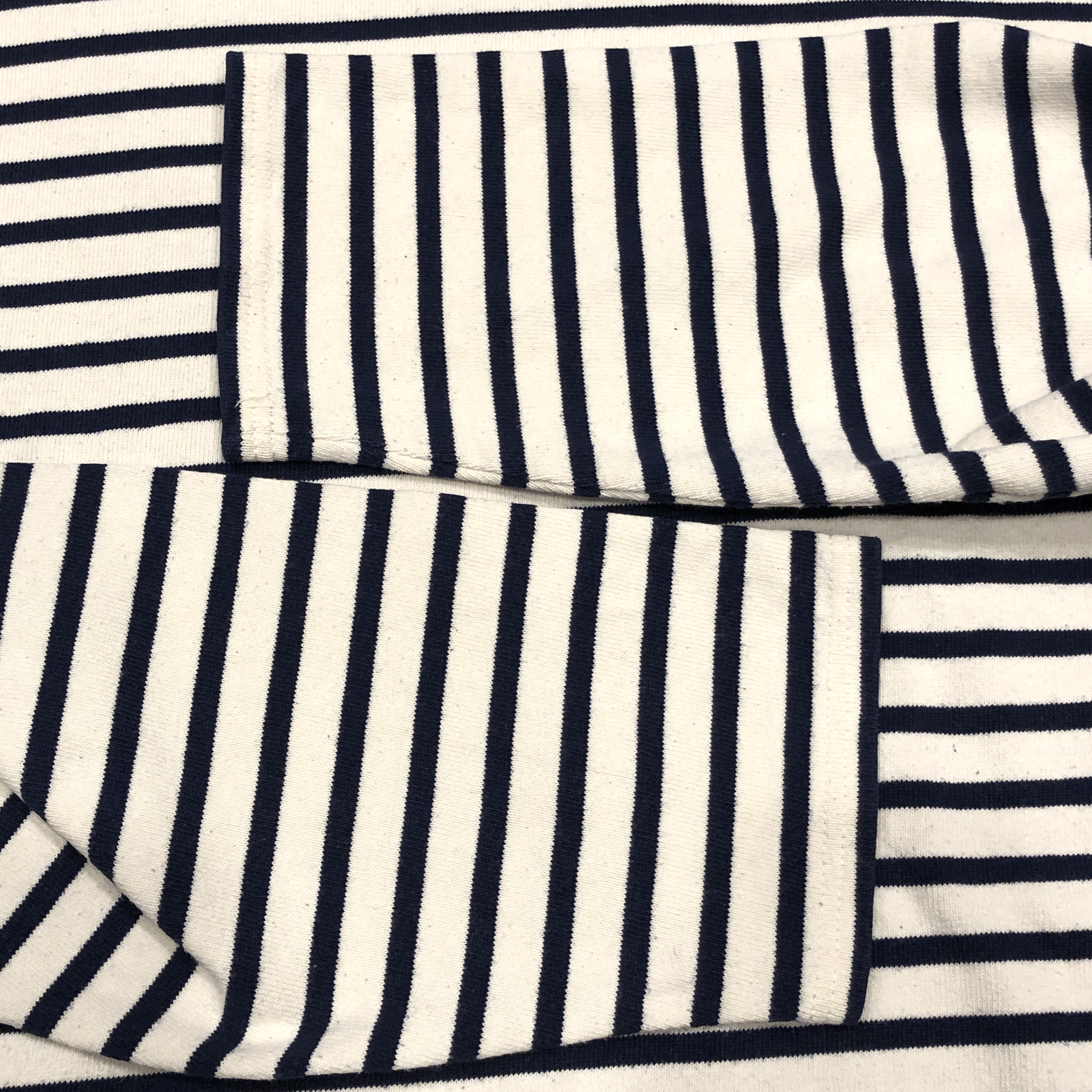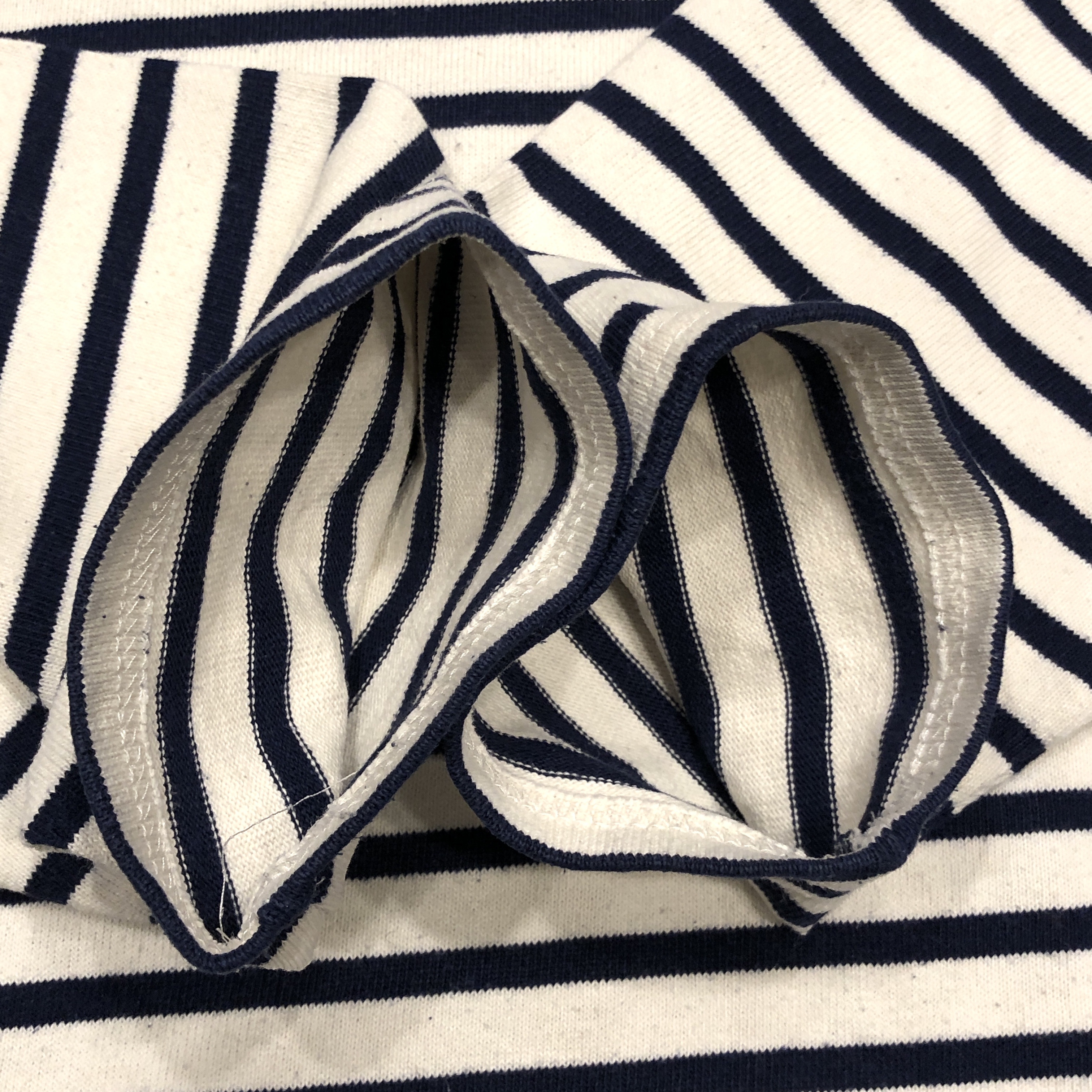 今回ご紹介するのは、落ち着いたネイビー/ ホワイトのボーダーカラー。ミリタリーやワークスタイルにも馴染み、カジュアルからシックまで幅広く対応します。素材は100%コットンの目の詰まった天竺生地。着始めはしっかりとした張り感があり、洗い込むことで徐々に柔らかく、肌馴染みの良い風合いへと育っていきます。
