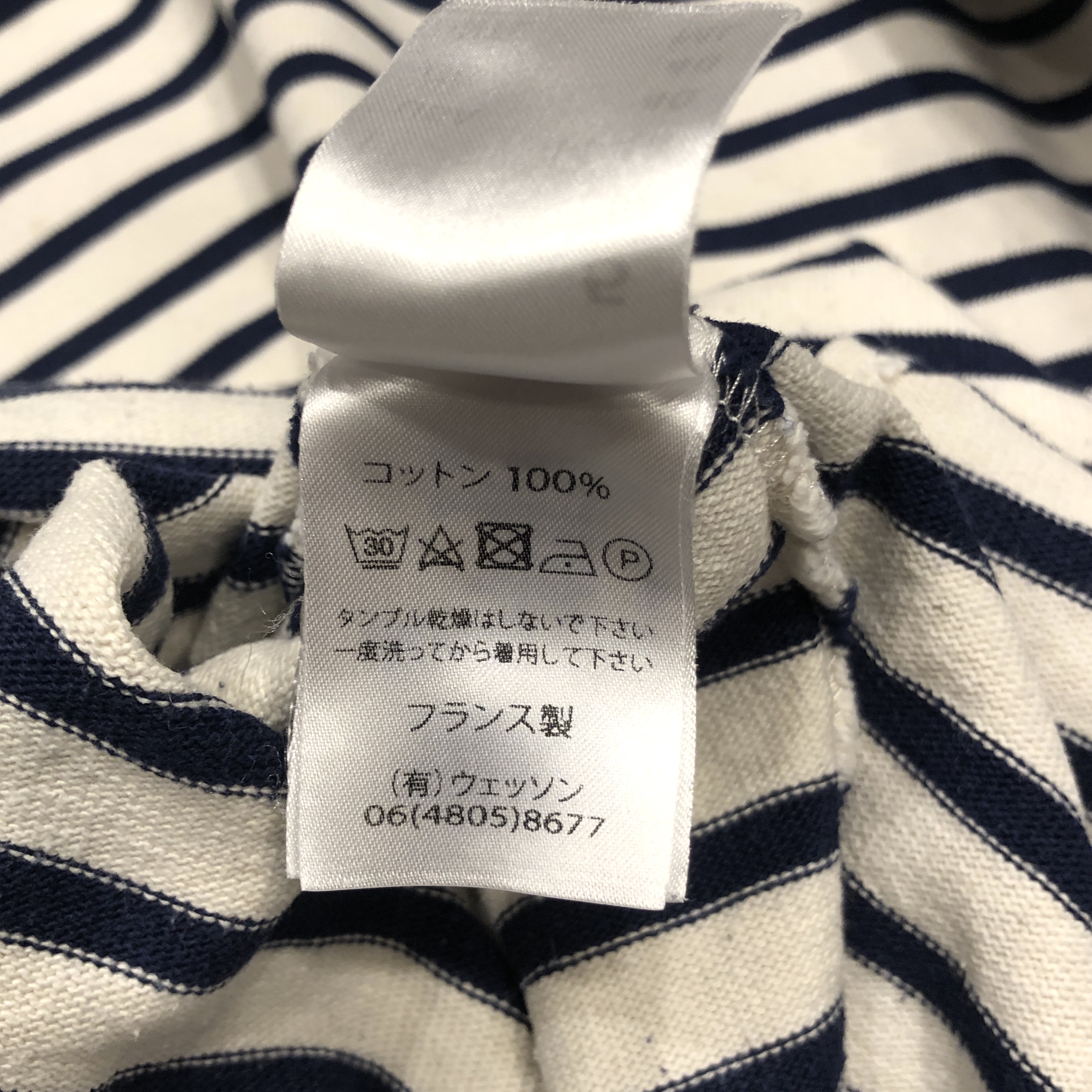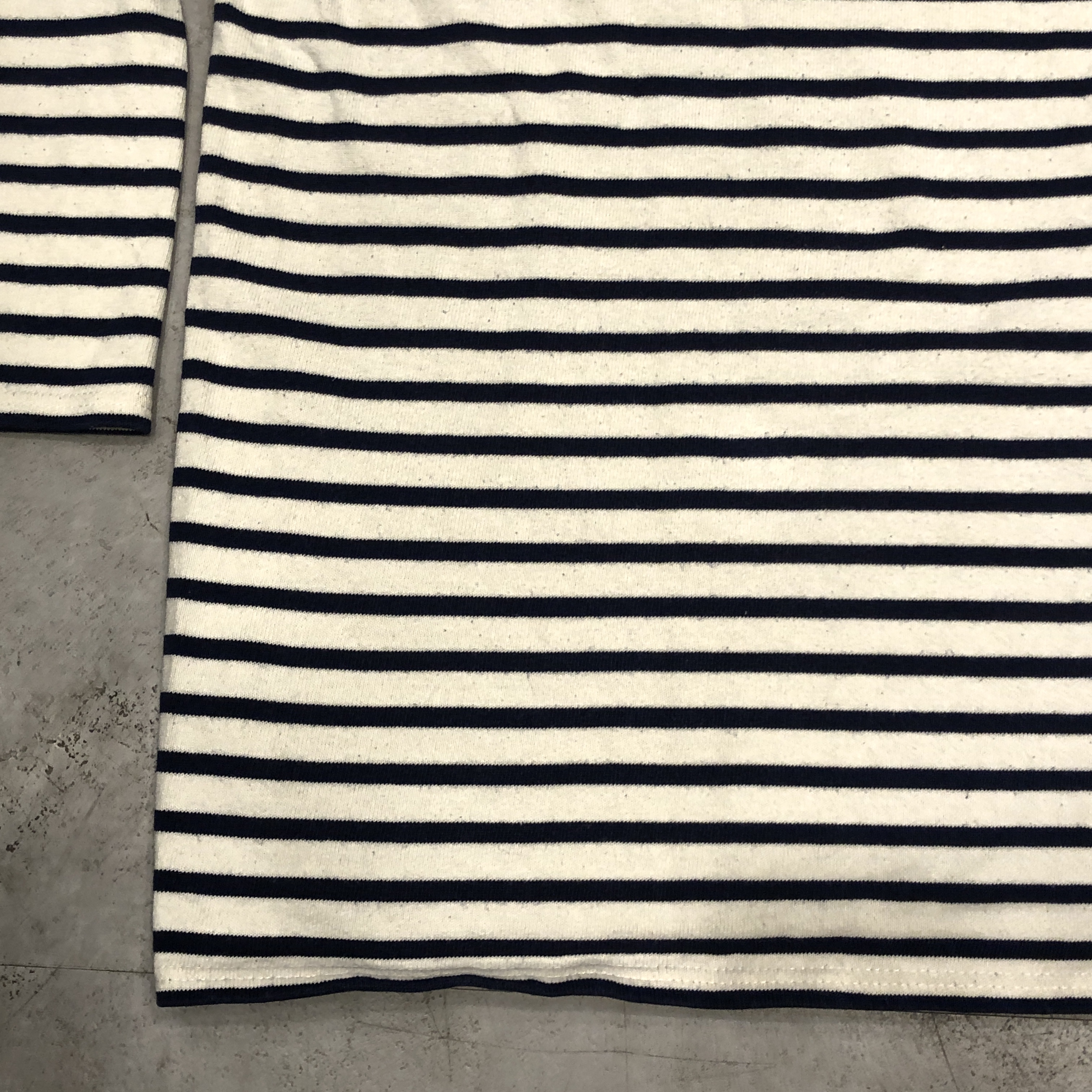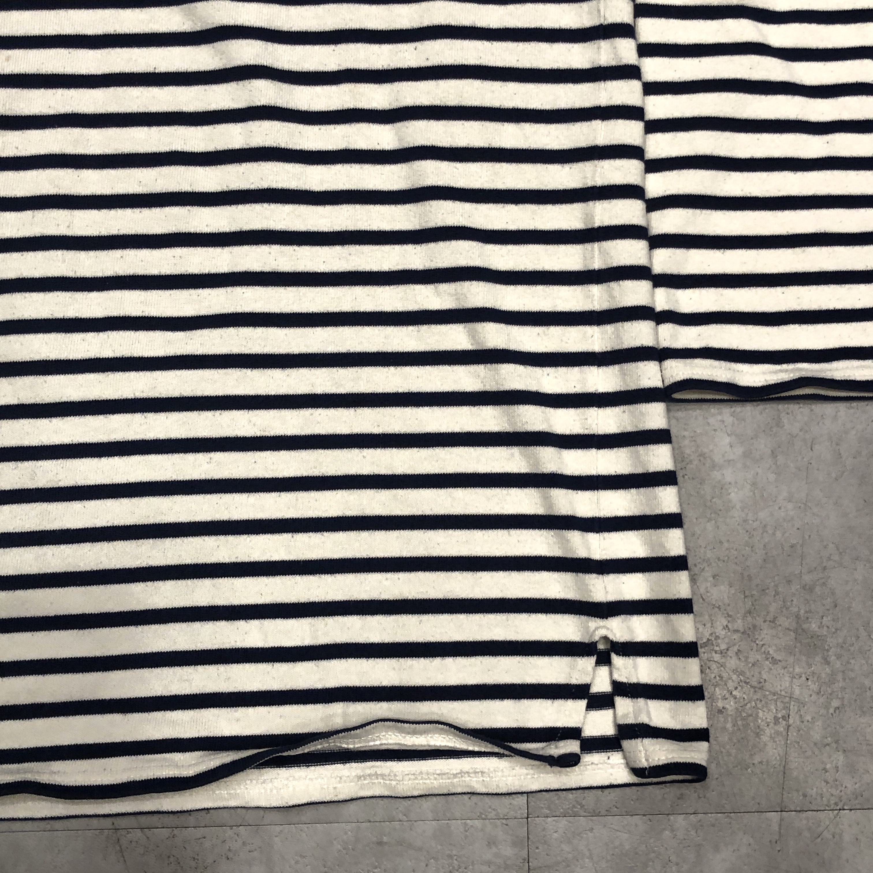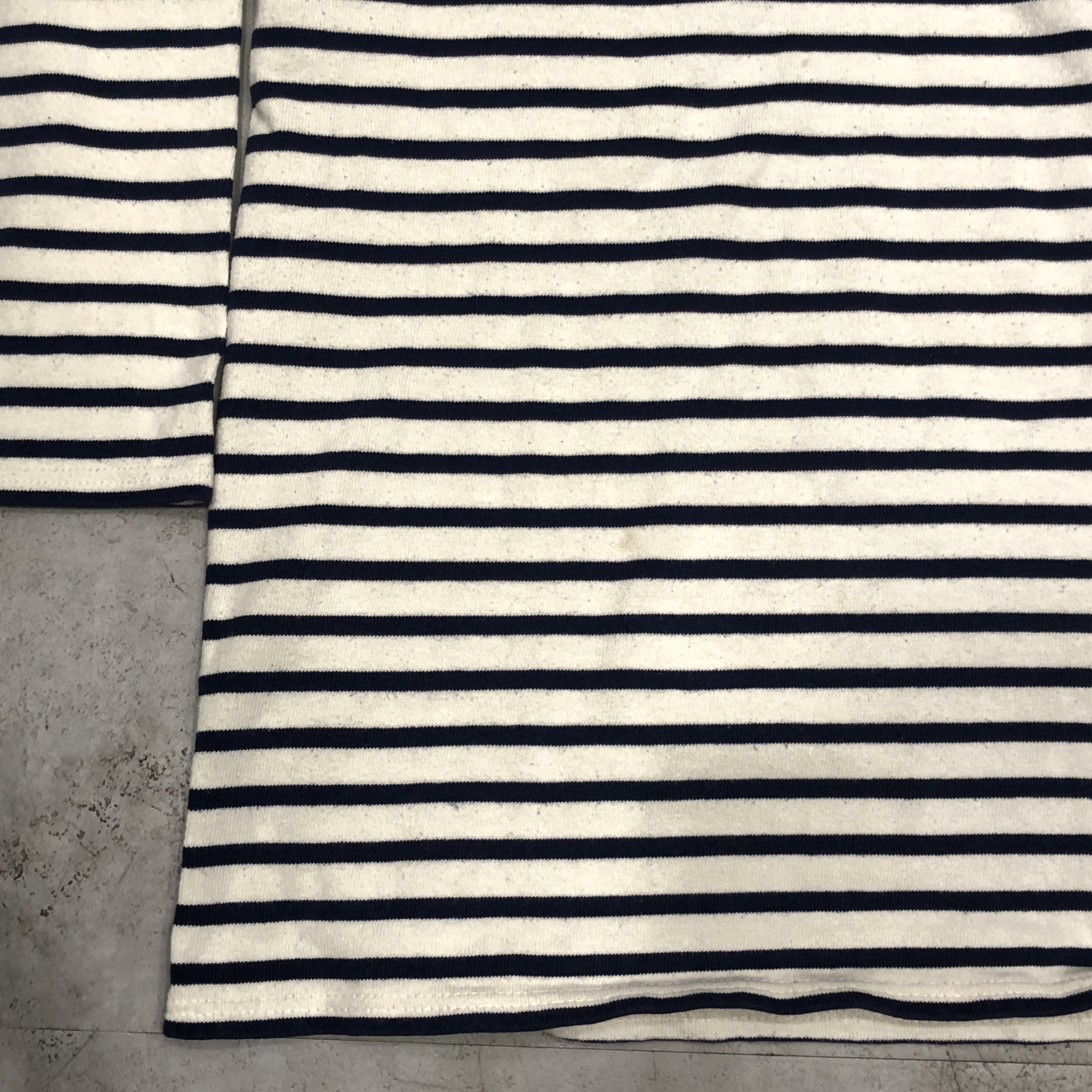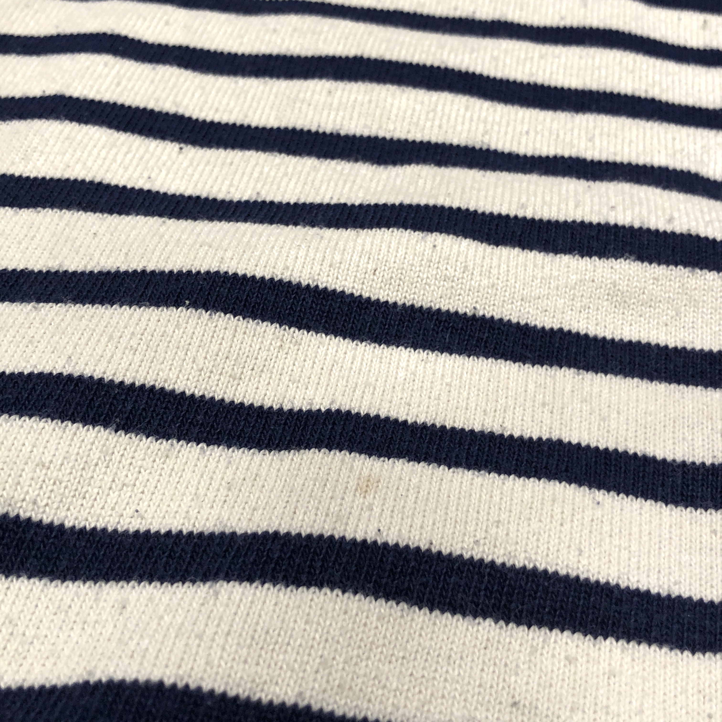 今回ご紹介するのは、落ち着いたネイビー/ ホワイトのボーダーカラー。ミリタリーやワークスタイルにも馴染み、カジュアルからシックまで幅広く対応します。素材は100%コットンの目の詰まった天竺生地。着始めはしっかりとした張り感があり、洗い込むことで徐々に柔らかく、肌馴染みの良い風合いへと育っていきます。