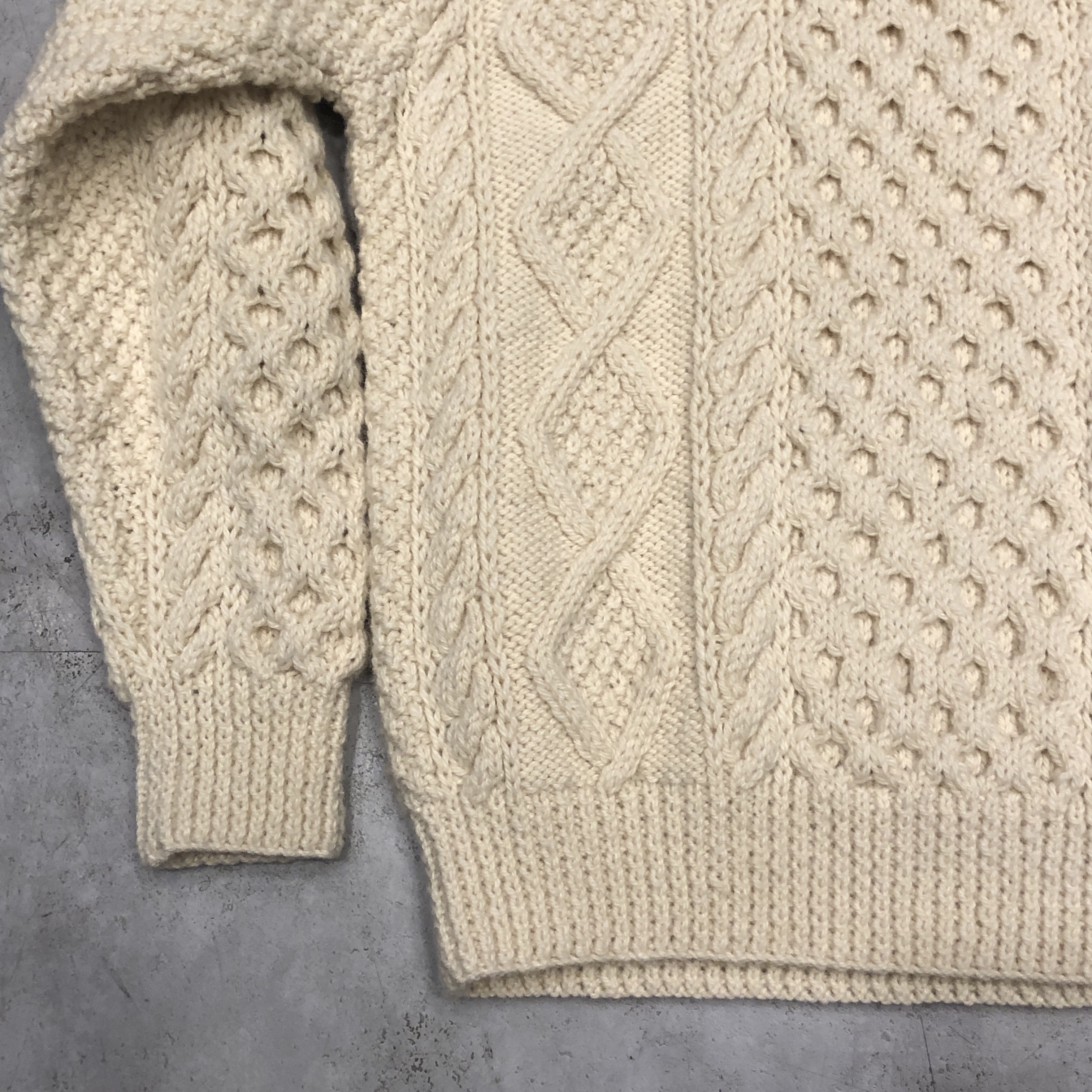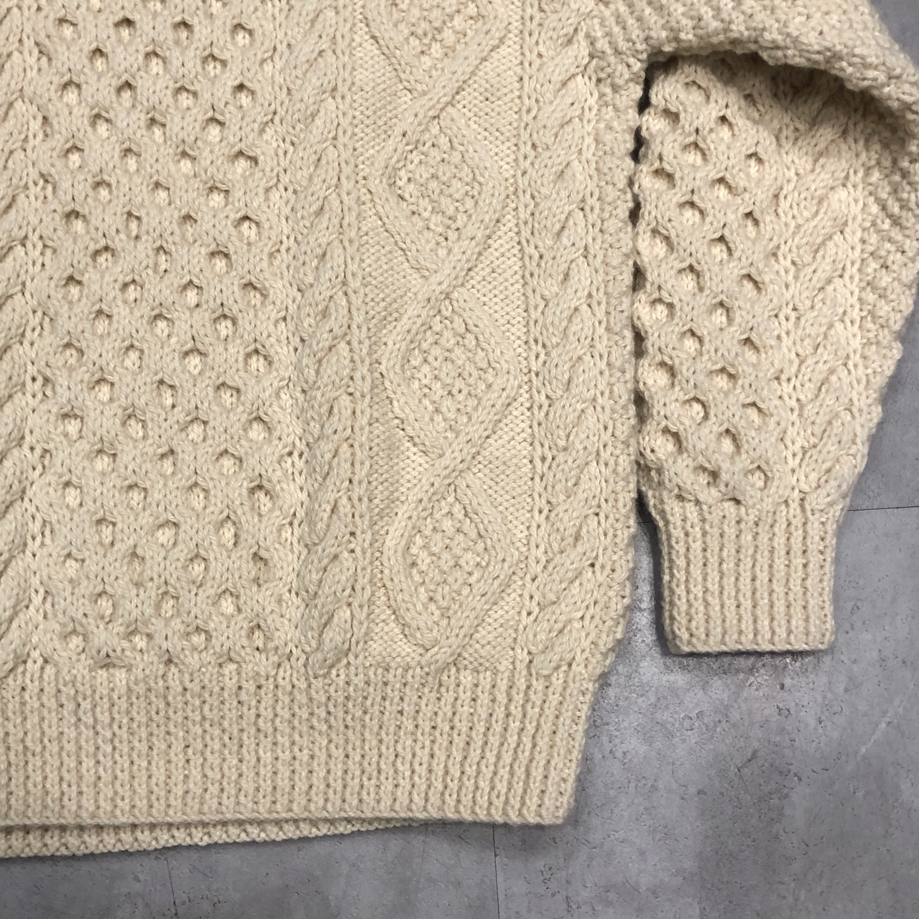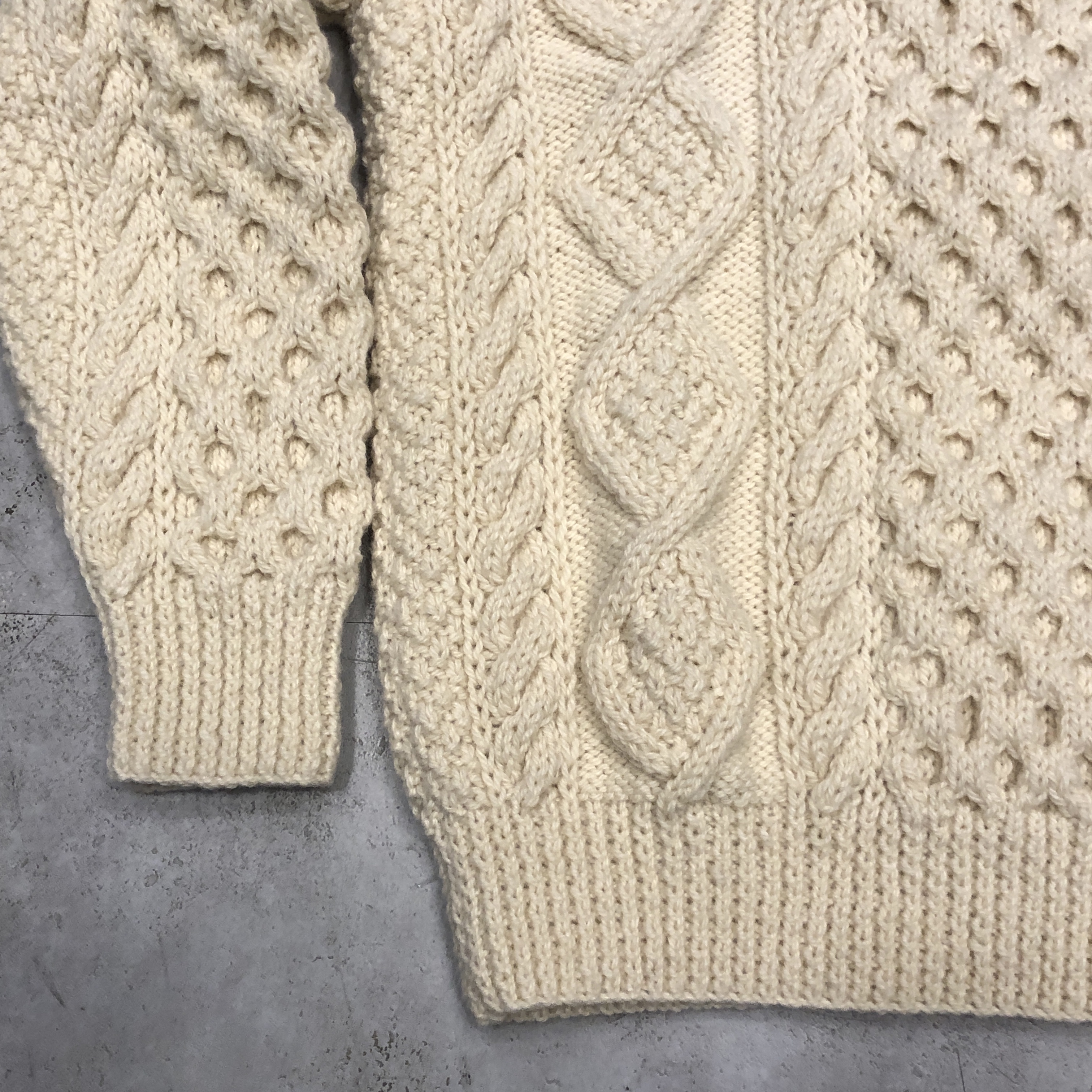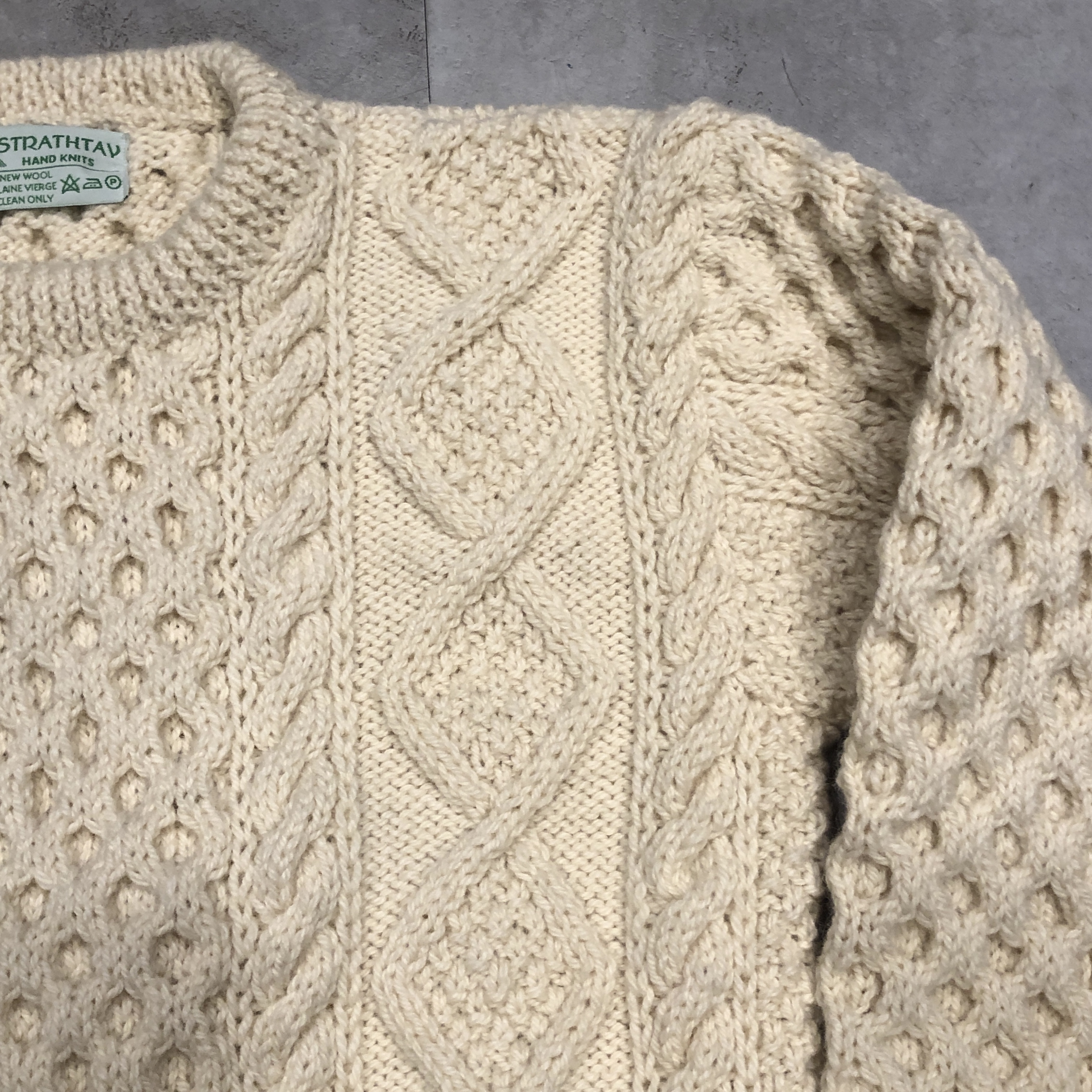 名門INVERALLANの別ラインとしてご存知の方も多い“STRATHTAY”より、ハンドニットのクルーネックセーターのご紹介です。タグからも分かる通りPURE NEW WOOLを贅沢に使用した手編み仕様で、現行のローゲージニットとは根本的に異なる、どこか素朴で原始的な温かみのある表情が魅力の一着。特筆すべきはこの密度の高いケーブル編み。前面に施されたフィッシャーマンズパターン、袖にも惜しみなく同様のパターンが入る贅沢仕様です。ふっくらと膨らむ袖のシルエットが絶妙で、アウターの中に忍ばせても存在感を発揮してくれる頼れる一枚。カラーはナチュラルな生成り色で、デニムや軍パンはもちろん、スラックスの上から合わせても上品にまとまります。このボリューム感と雰囲気をお探しだった方は是非ご検討ください。