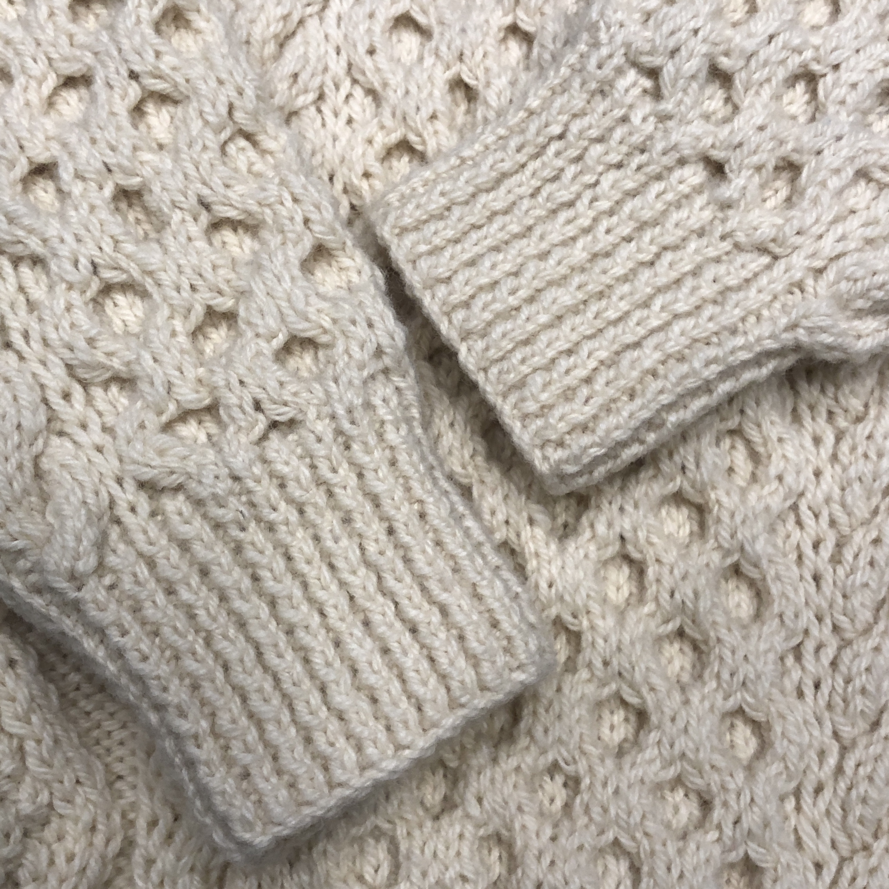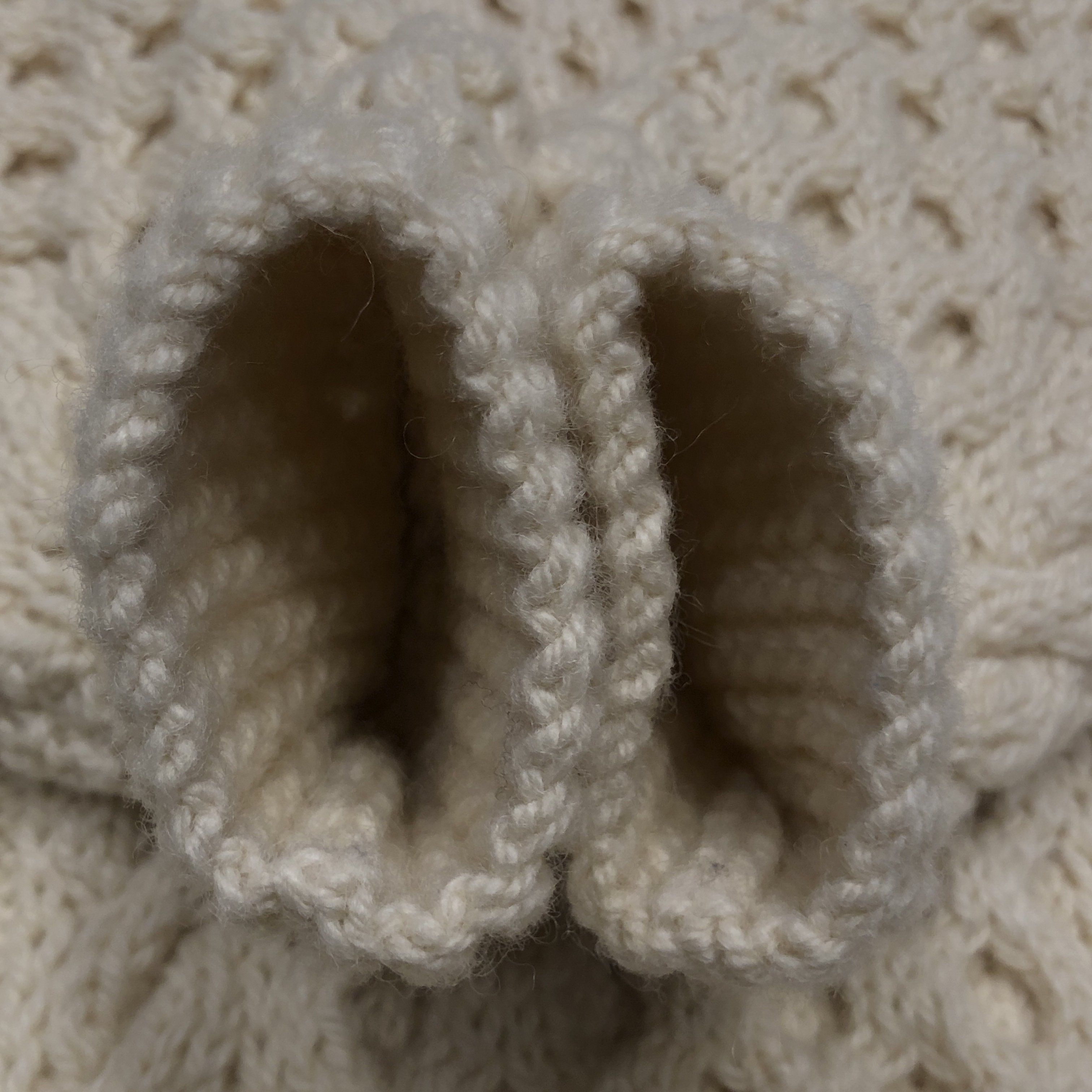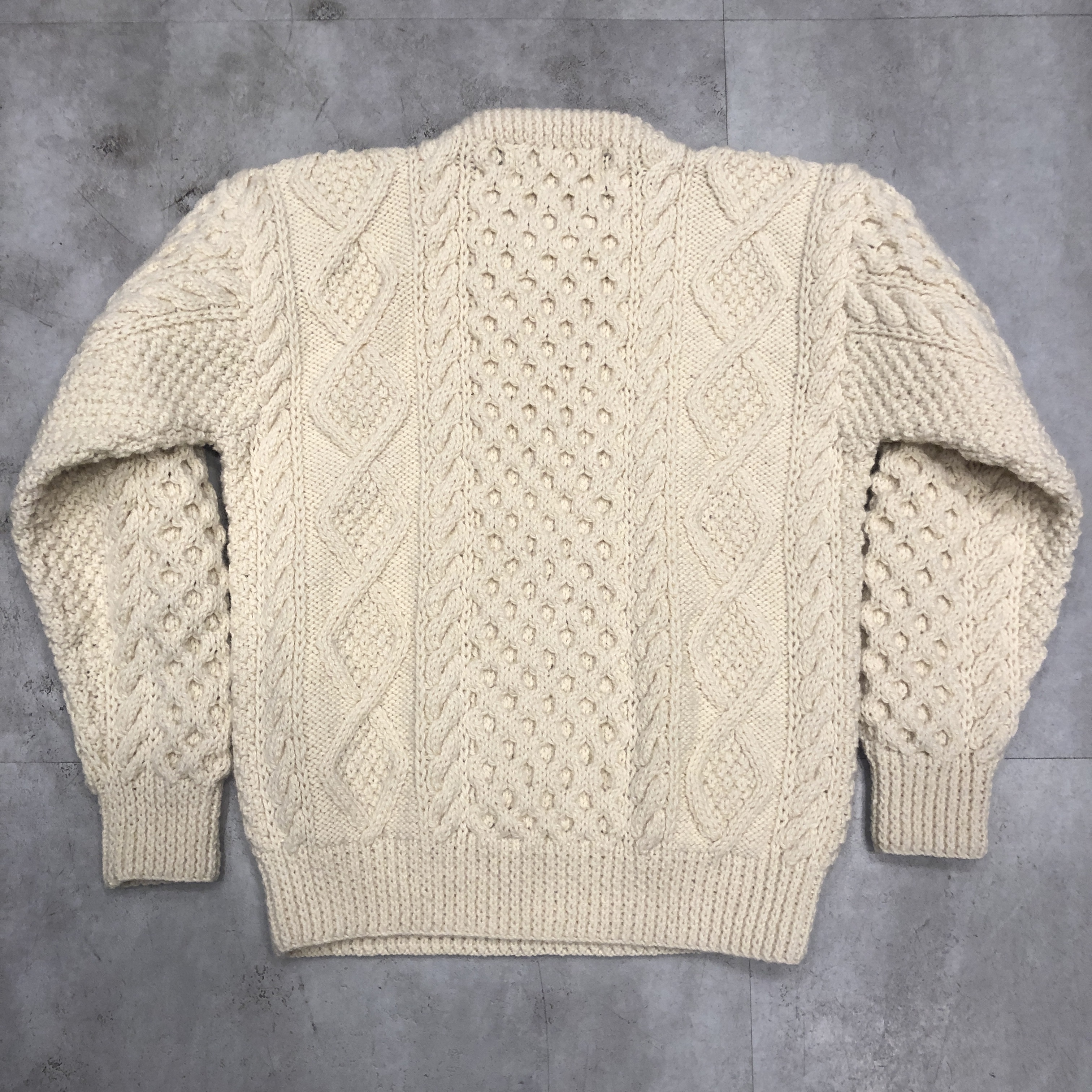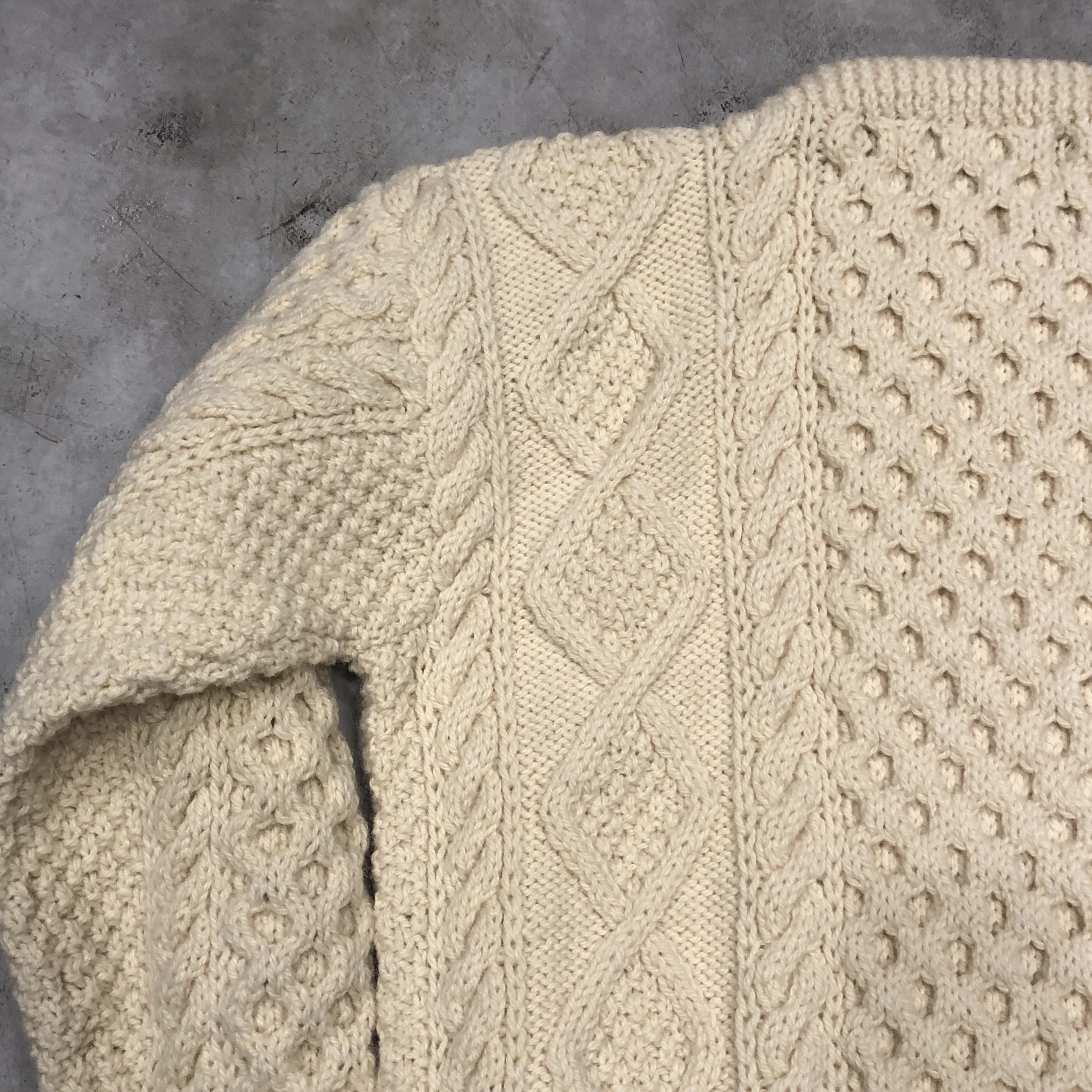 名門INVERALLANの別ラインとしてご存知の方も多い“STRATHTAY”より、ハンドニットのクルーネックセーターのご紹介です。タグからも分かる通りPURE NEW WOOLを贅沢に使用した手編み仕様で、現行のローゲージニットとは根本的に異なる、どこか素朴で原始的な温かみのある表情が魅力の一着。特筆すべきはこの密度の高いケーブル編み。前面に施されたフィッシャーマンズパターン、袖にも惜しみなく同様のパターンが入る贅沢仕様です。ふっくらと膨らむ袖のシルエットが絶妙で、アウターの中に忍ばせても存在感を発揮してくれる頼れる一枚。カラーはナチュラルな生成り色で、デニムや軍パンはもちろん、スラックスの上から合わせても上品にまとまります。このボリューム感と雰囲気をお探しだった方は是非ご検討ください。