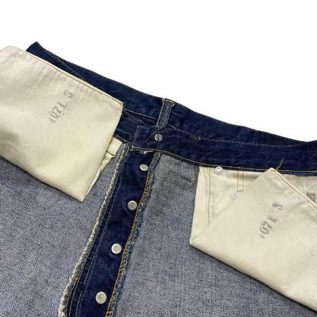 - トップボタン裏刻印『4』、Vステッチ、ウェストシングル、足長R、不均V