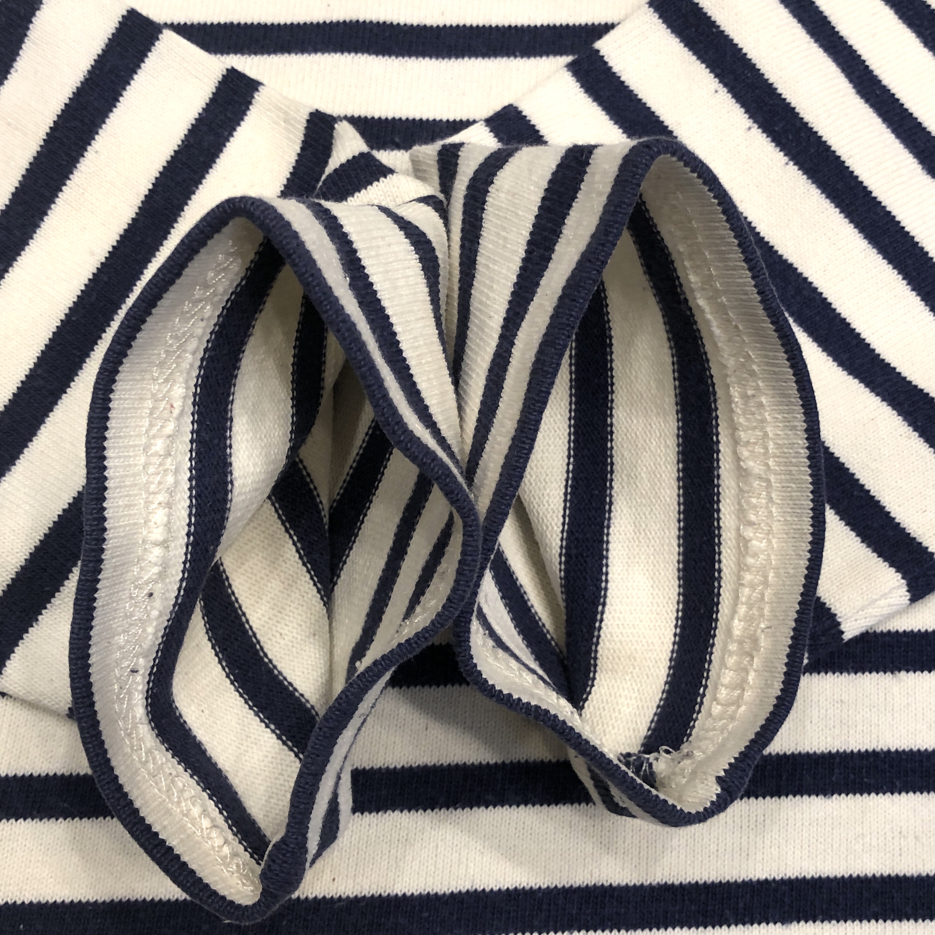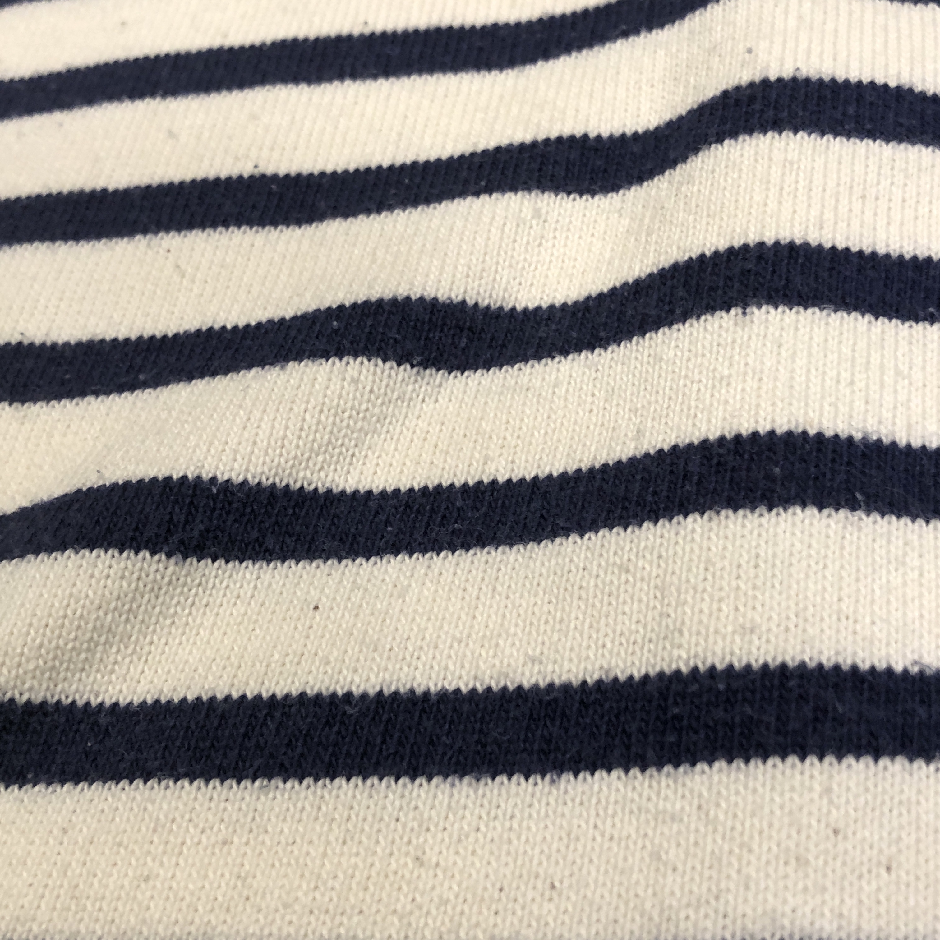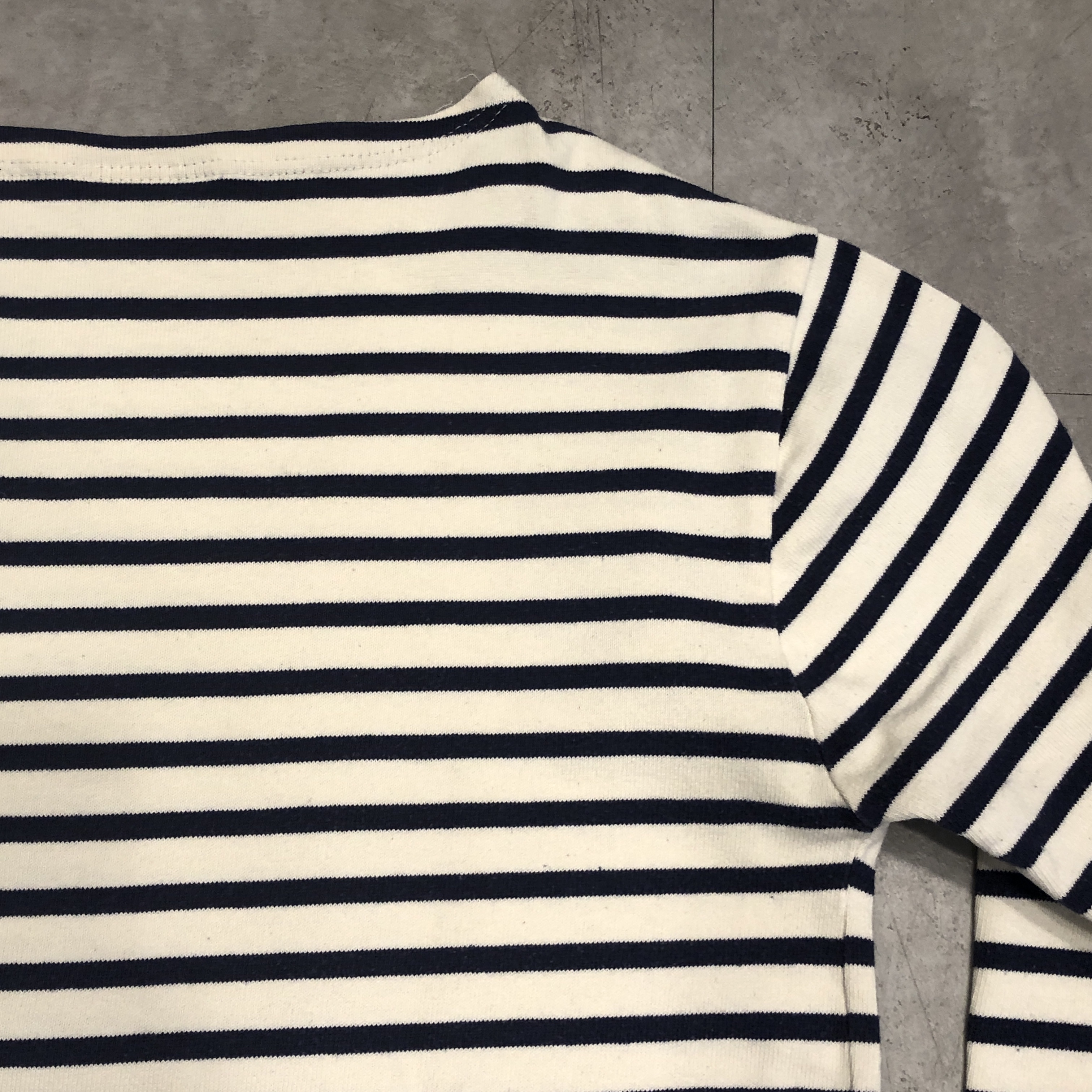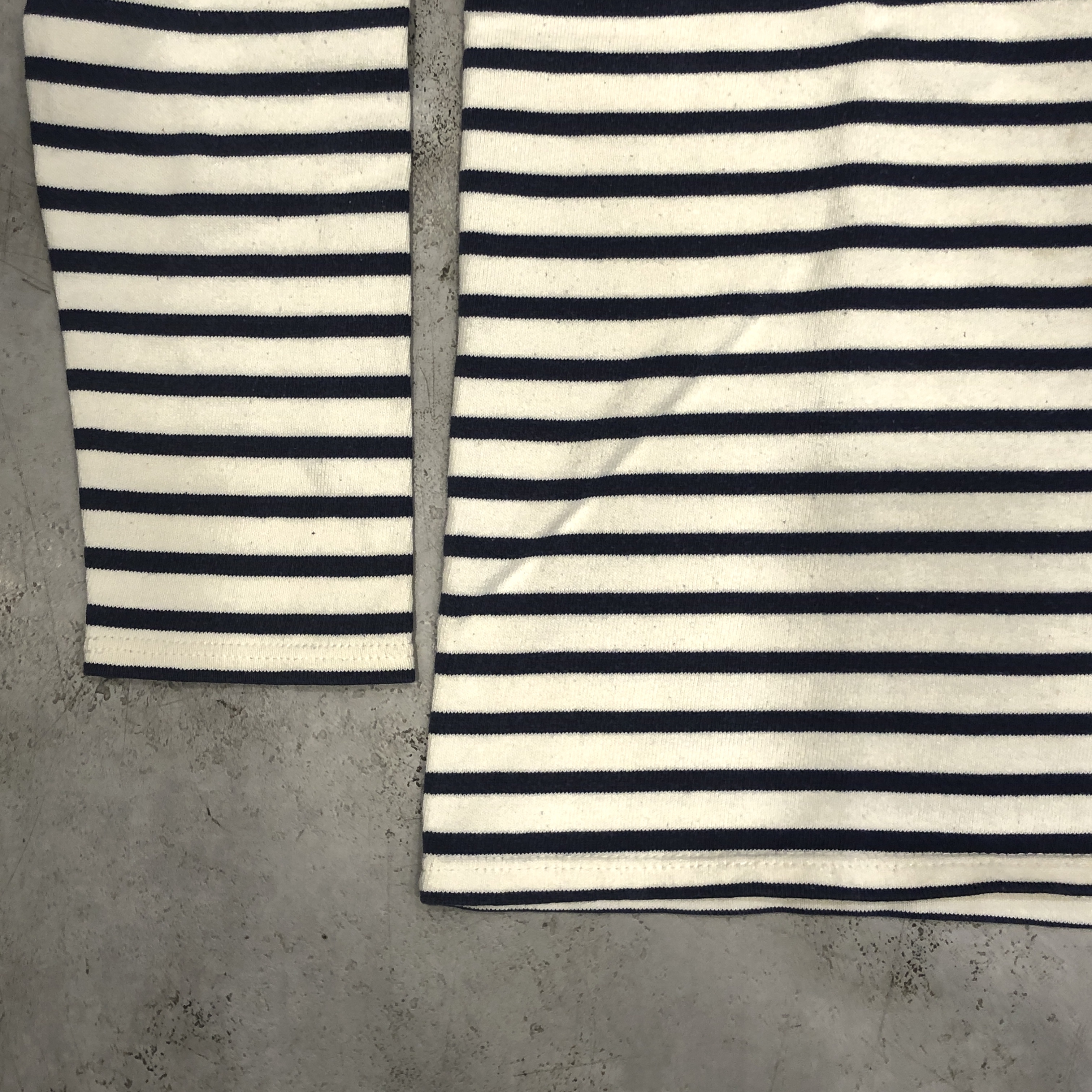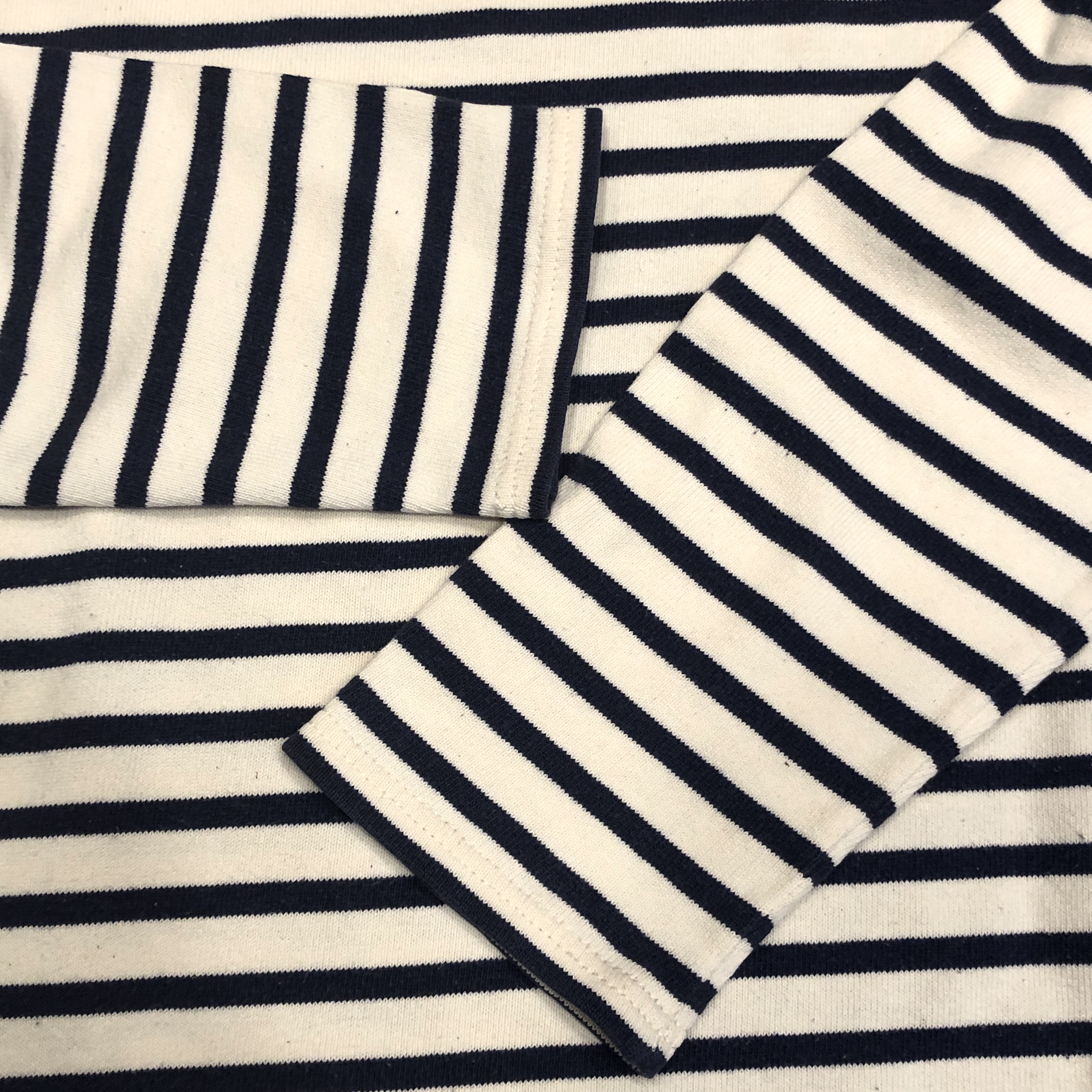 今回ご紹介するのは、落ち着いたネイビー/ ホワイトのボーダーカラー。ミリタリーやワークスタイルにも馴染み、カジュアルからシックまで幅広く対応します。素材は100%コットンの目の詰まった天竺生地。着始めはしっかりとした張り感があり、洗い込むことで徐々に柔らかく、肌馴染みの良い風合いへと育っていきます。