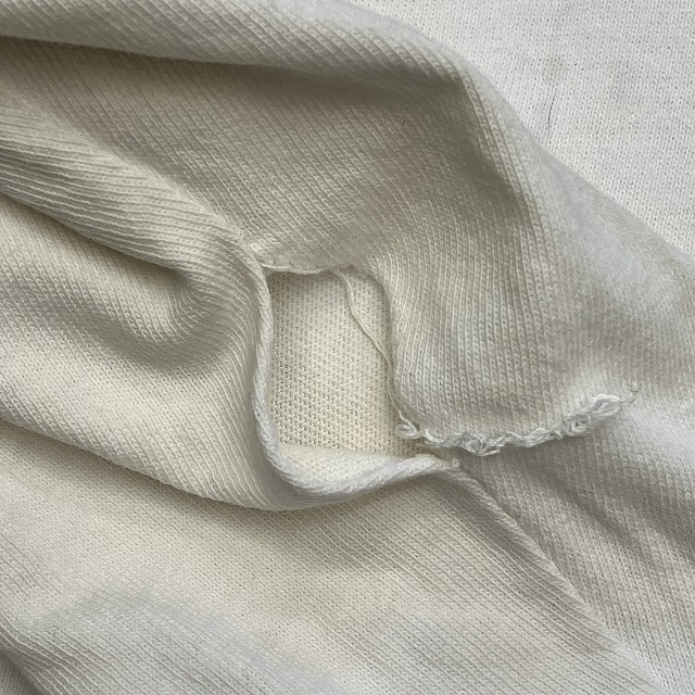 - 袖先に数箇所小穴、右袖や左脇下のステッチ抜けがみられます。