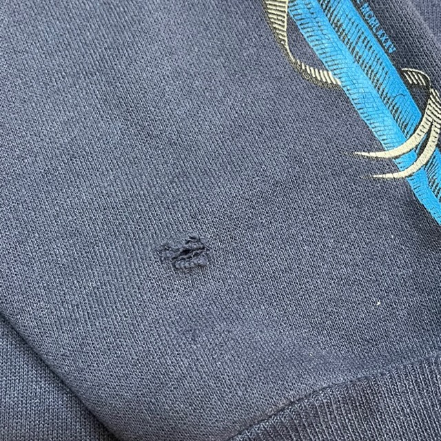 - 右脇下ステッチのリペア、右袖先に破れやほつれが見られます。