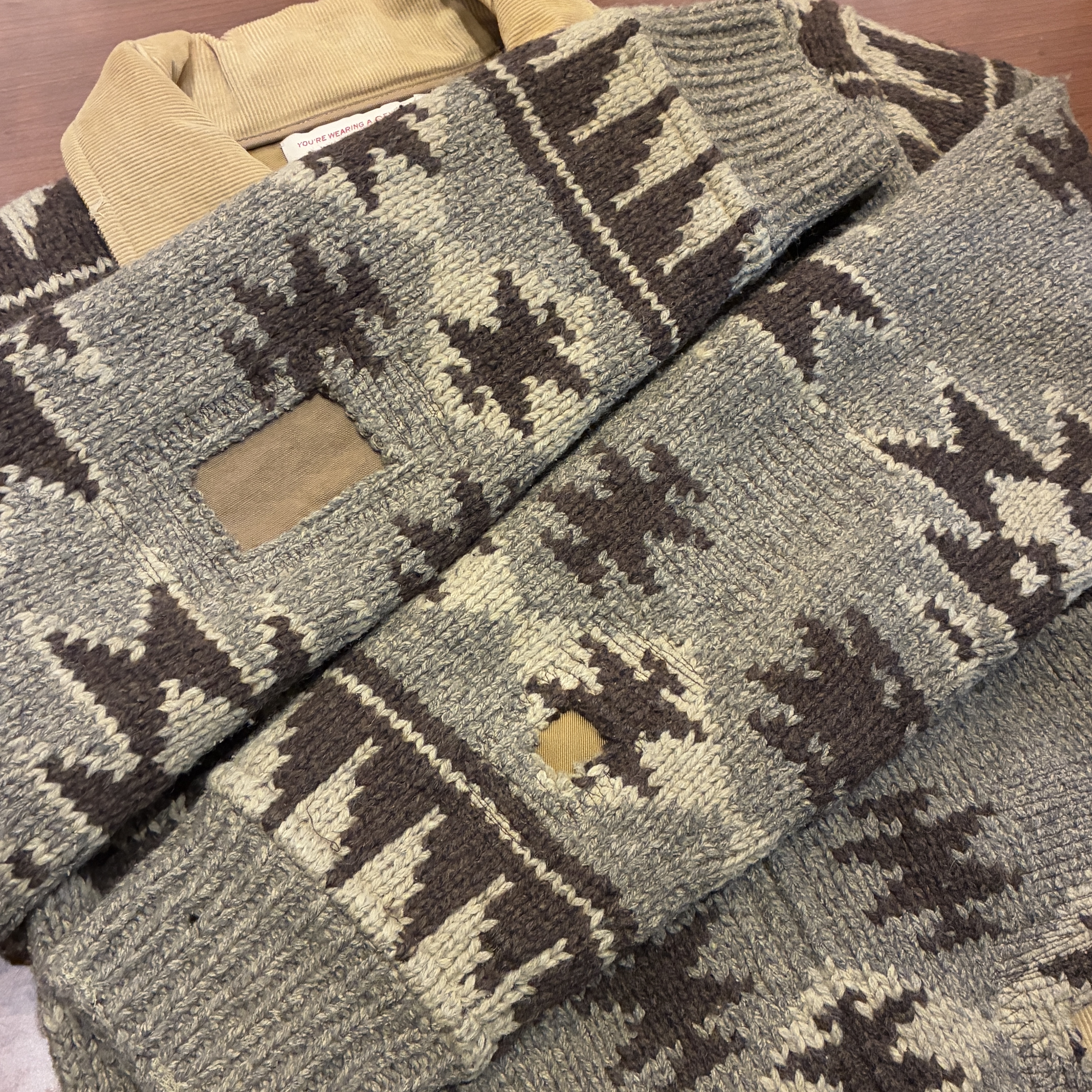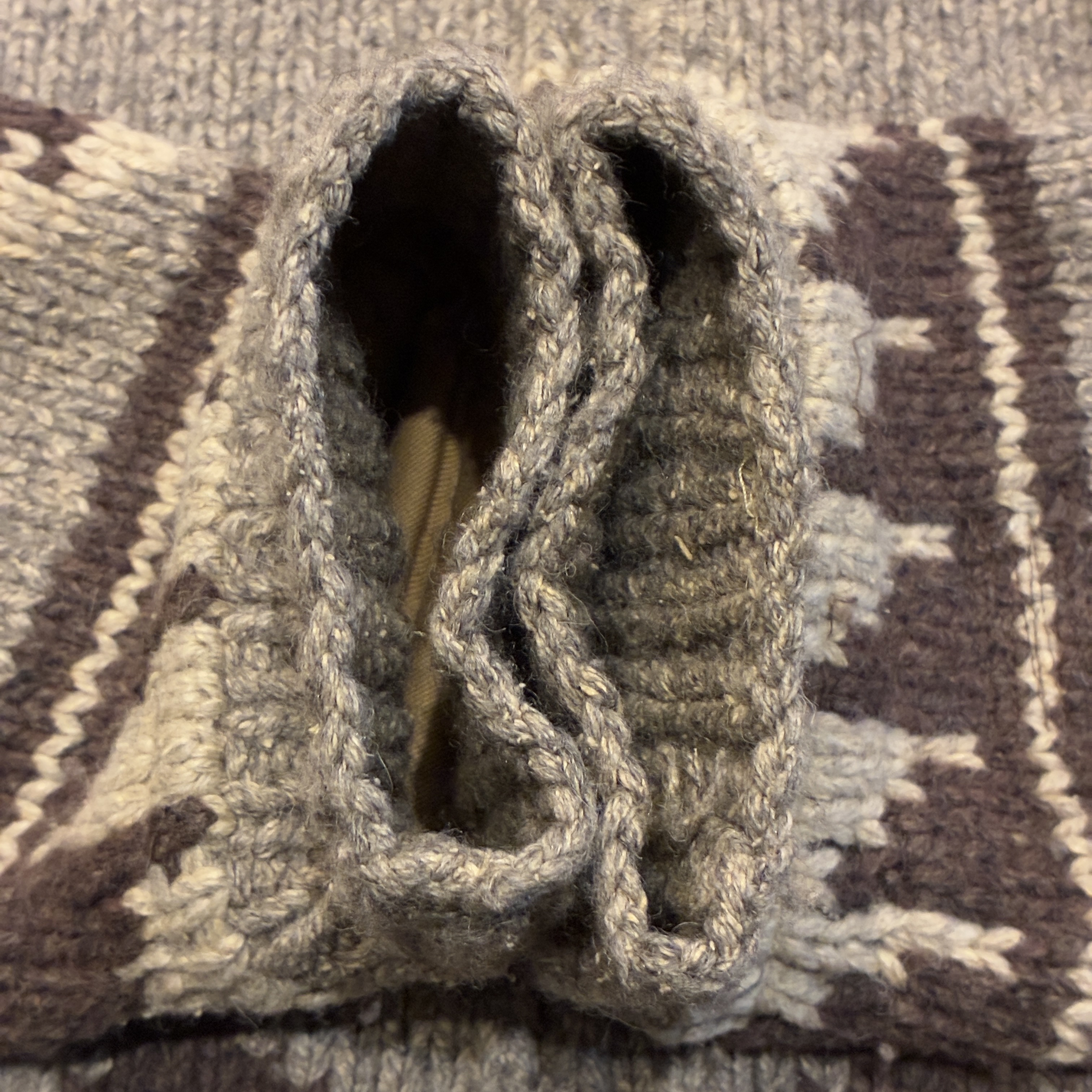 ニット製品特有の毛羽立ちや網目の荒い箇所がございますが、目立つ汚れやダメージ等は無くまだまだ問題無く着用していただける状態です。
