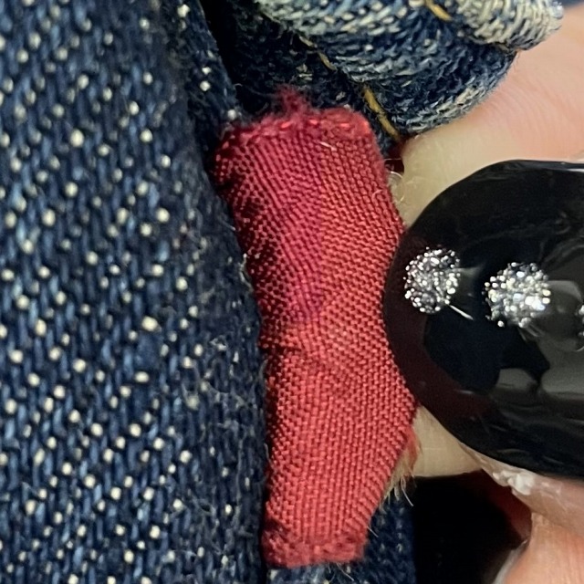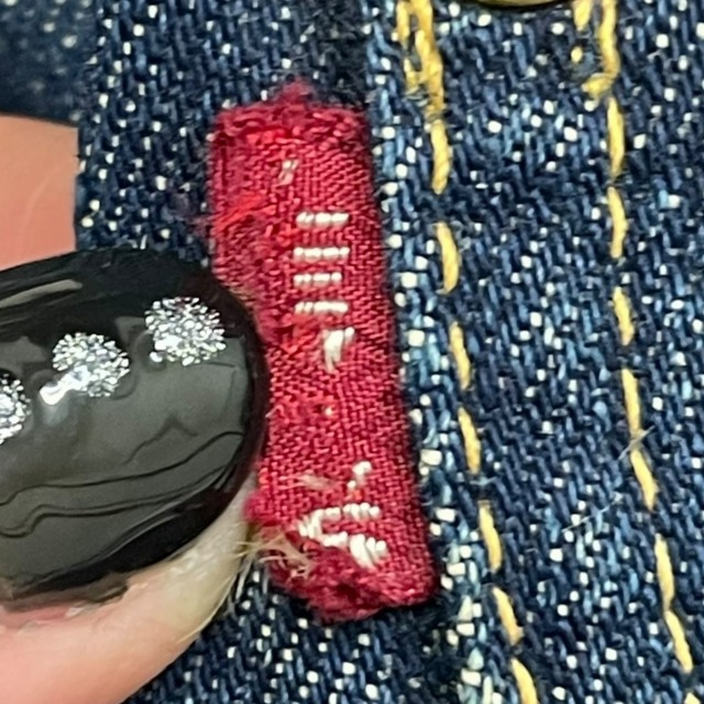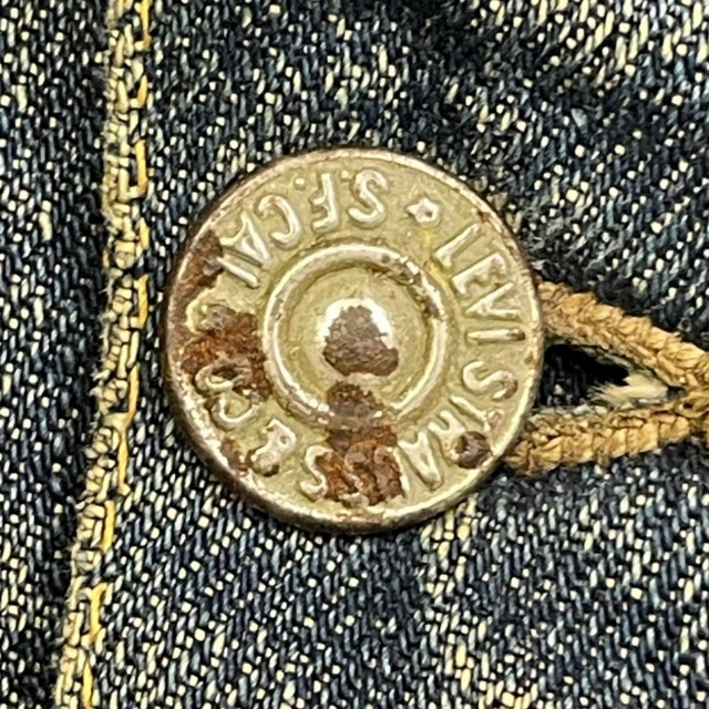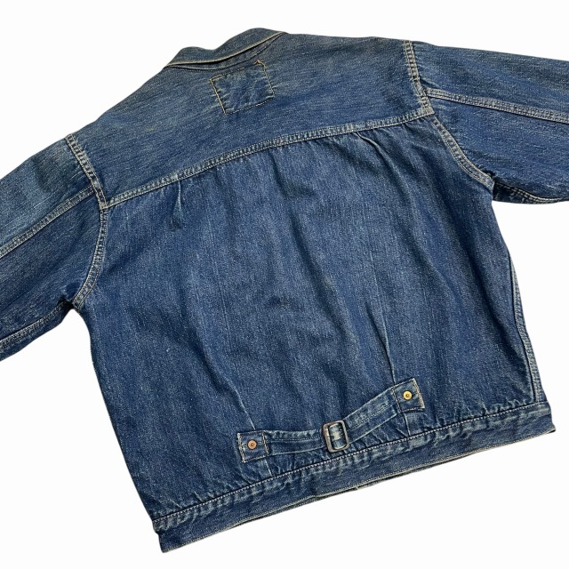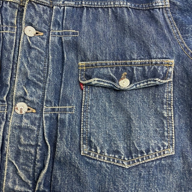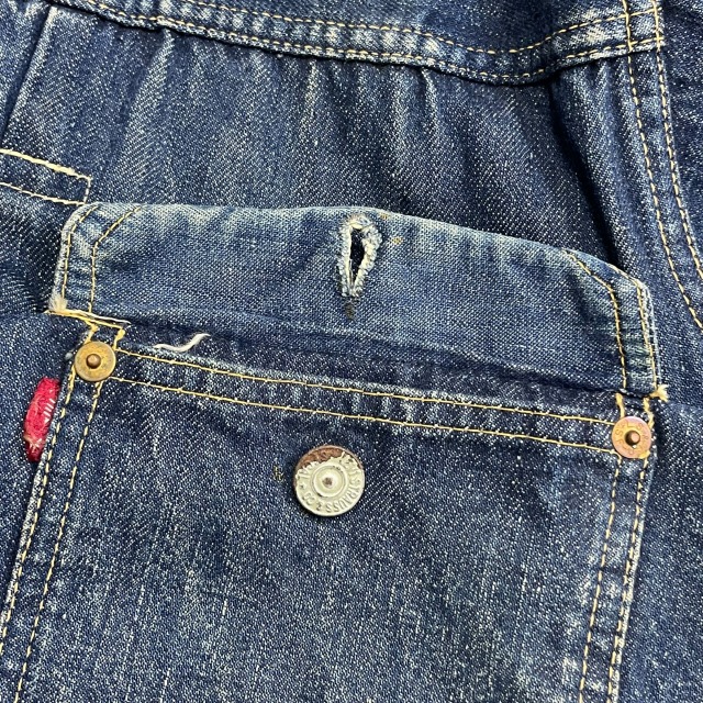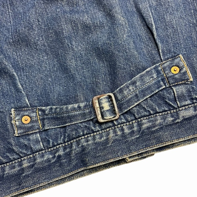 片面タブ、レザーパッチ、胸ポケット裏 ライトオンスデニム、スライド式バックル