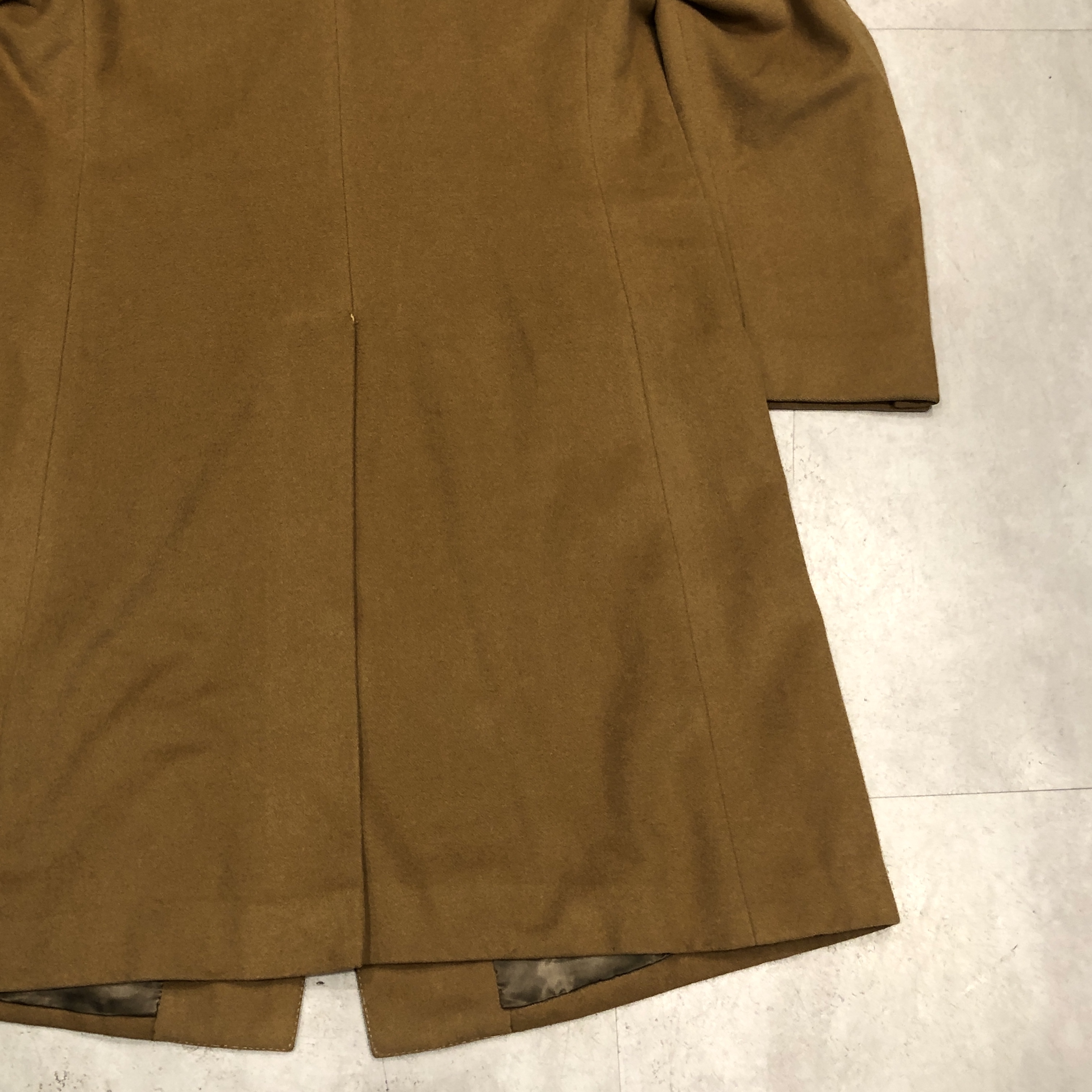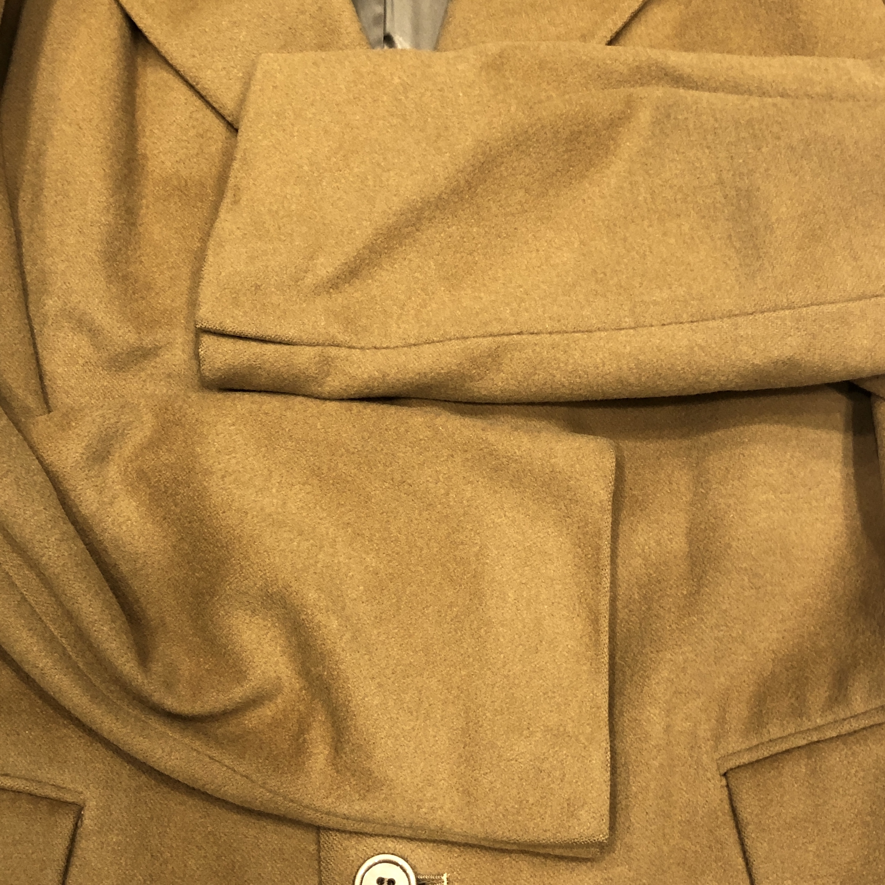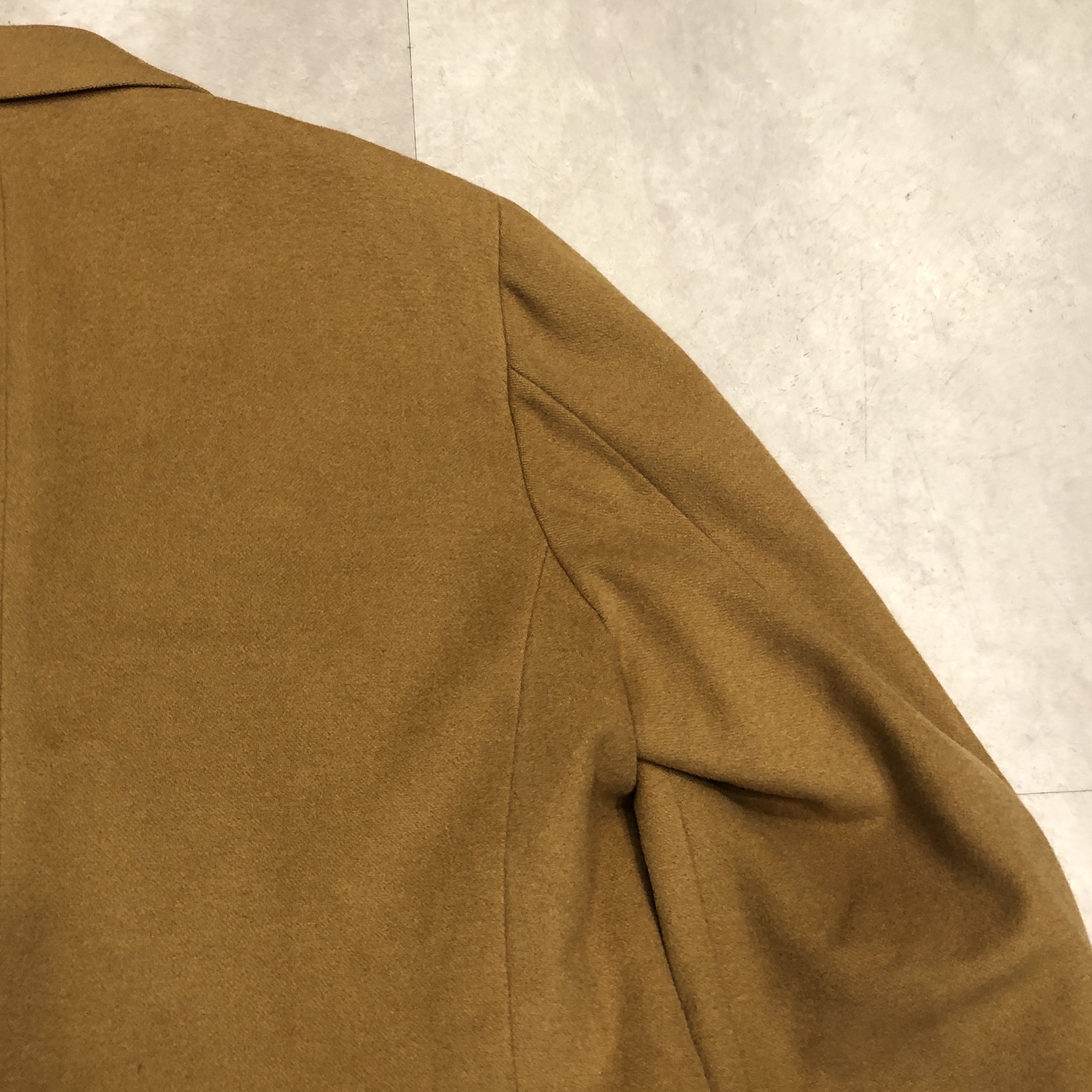 キャメル〜キャラメルに近い深みのあるブラウンカラーが美しく、シングルブレストの3ボタン仕様、ノッチドラペル、そしてチェスターコート特有の膝あたりまで届くミドル〜ロング丈のフォルムが、クラシックな佇まいを醸し出しています。