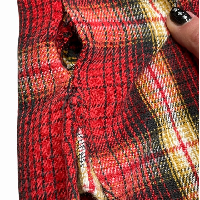 - 画像のように、右裾上サイド縫製部分にステッチ抜けがあり、後左肩下付近に穴がございます。