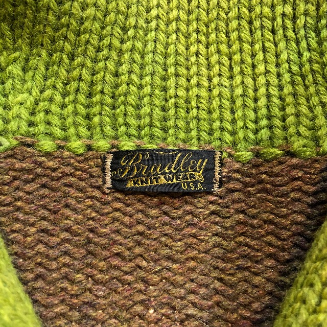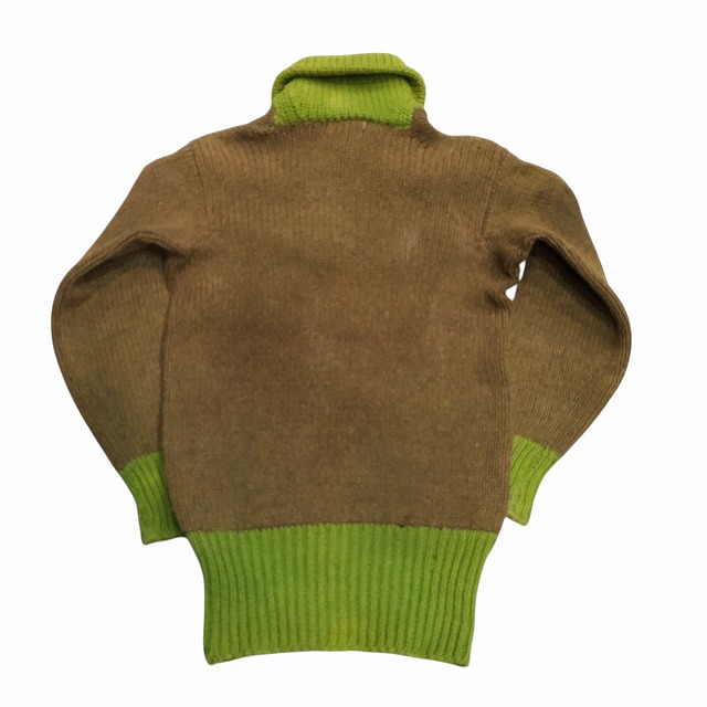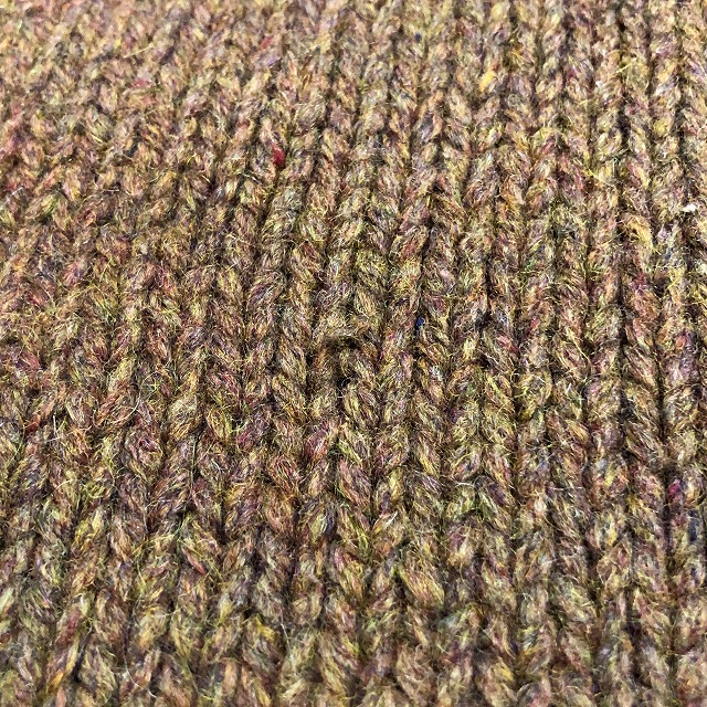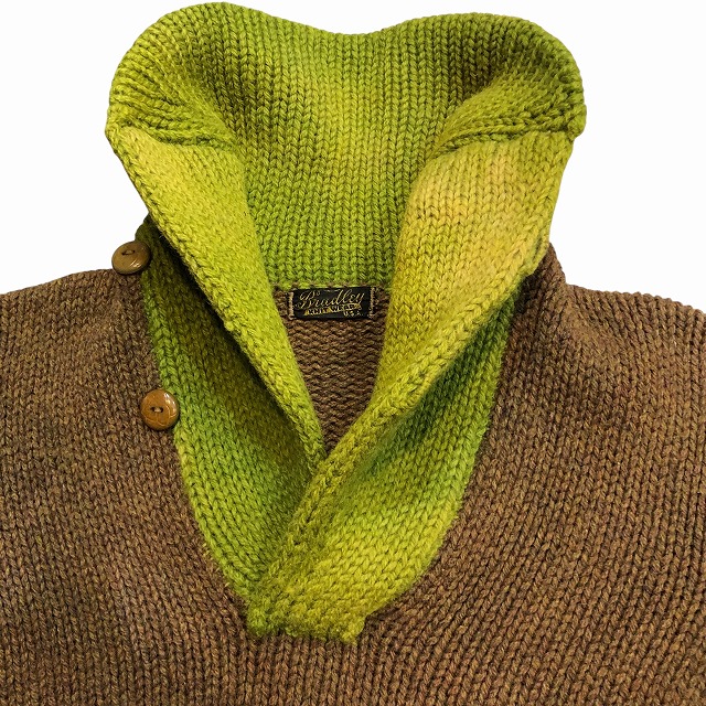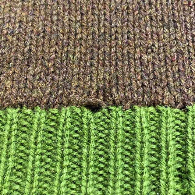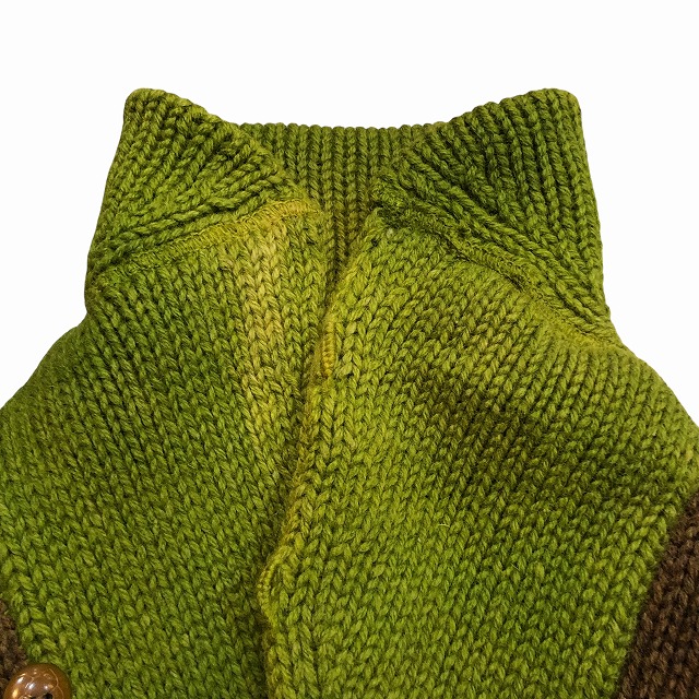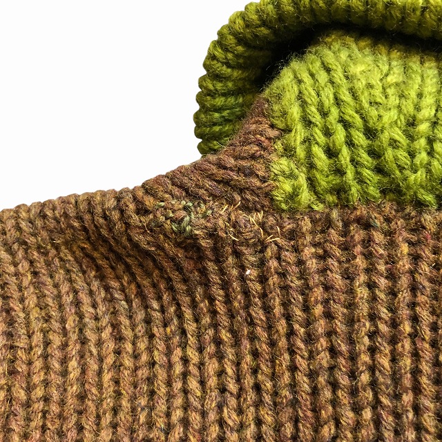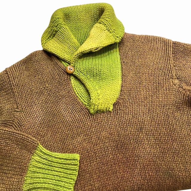 ブラウンと各リブのライトグリーンが好配色なショールニット。