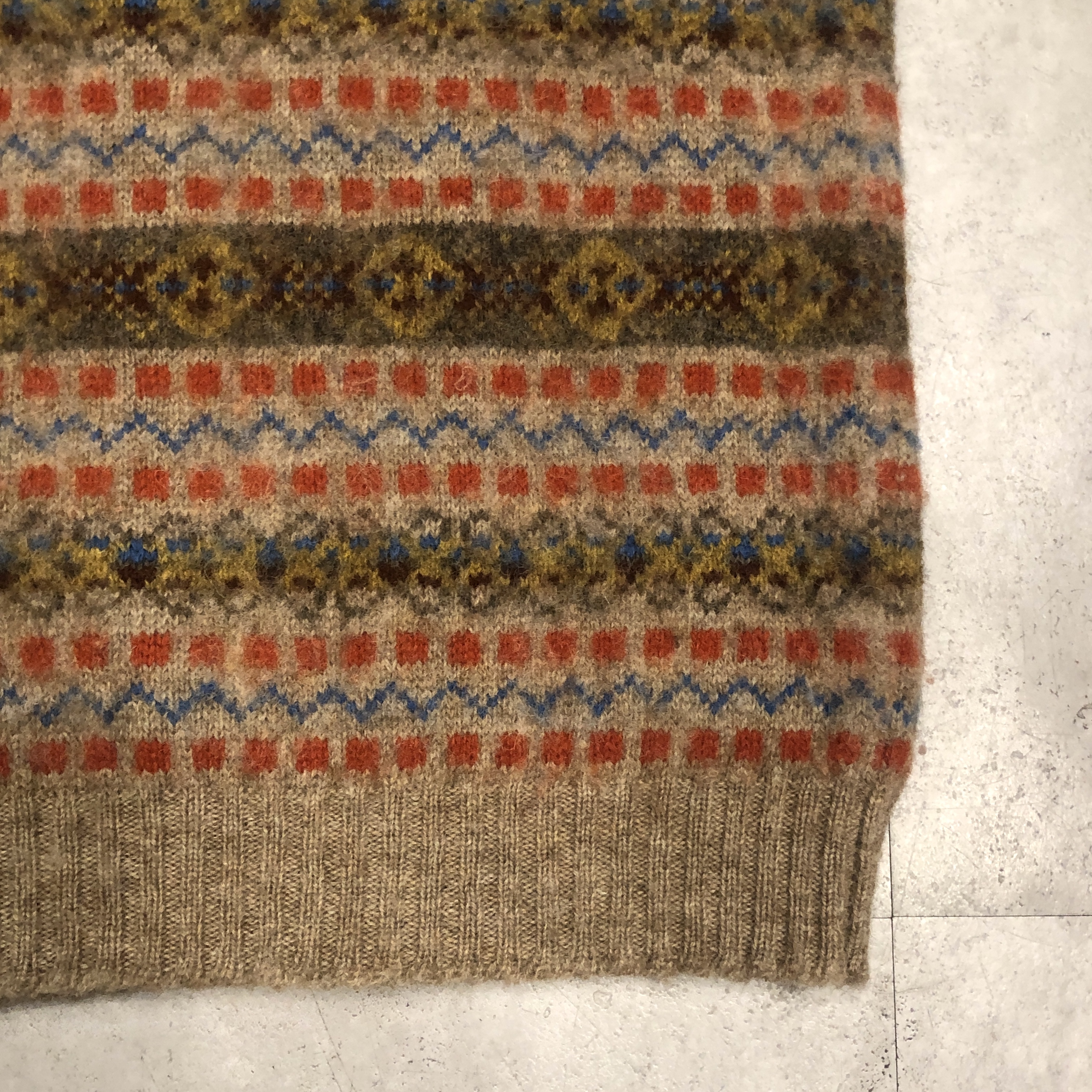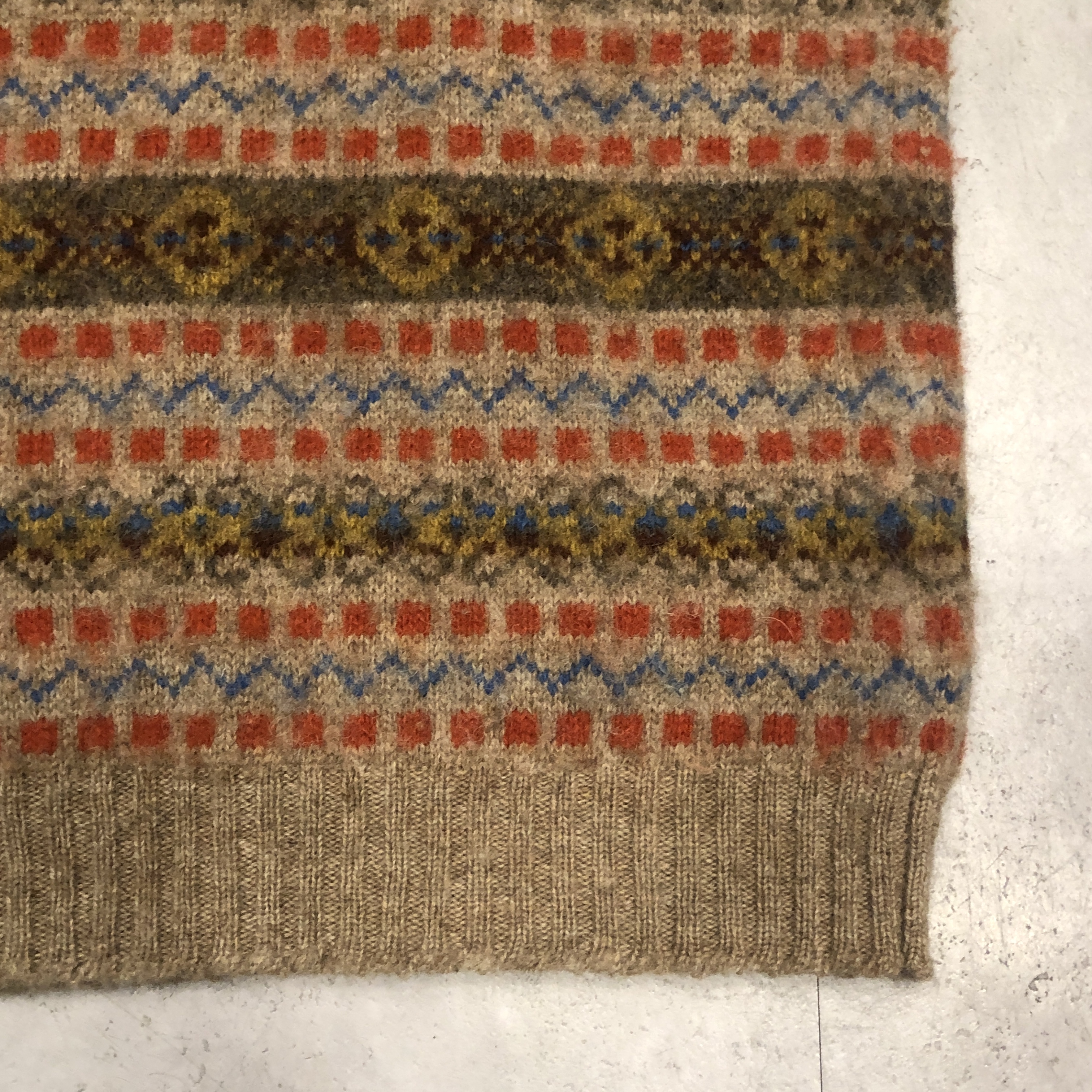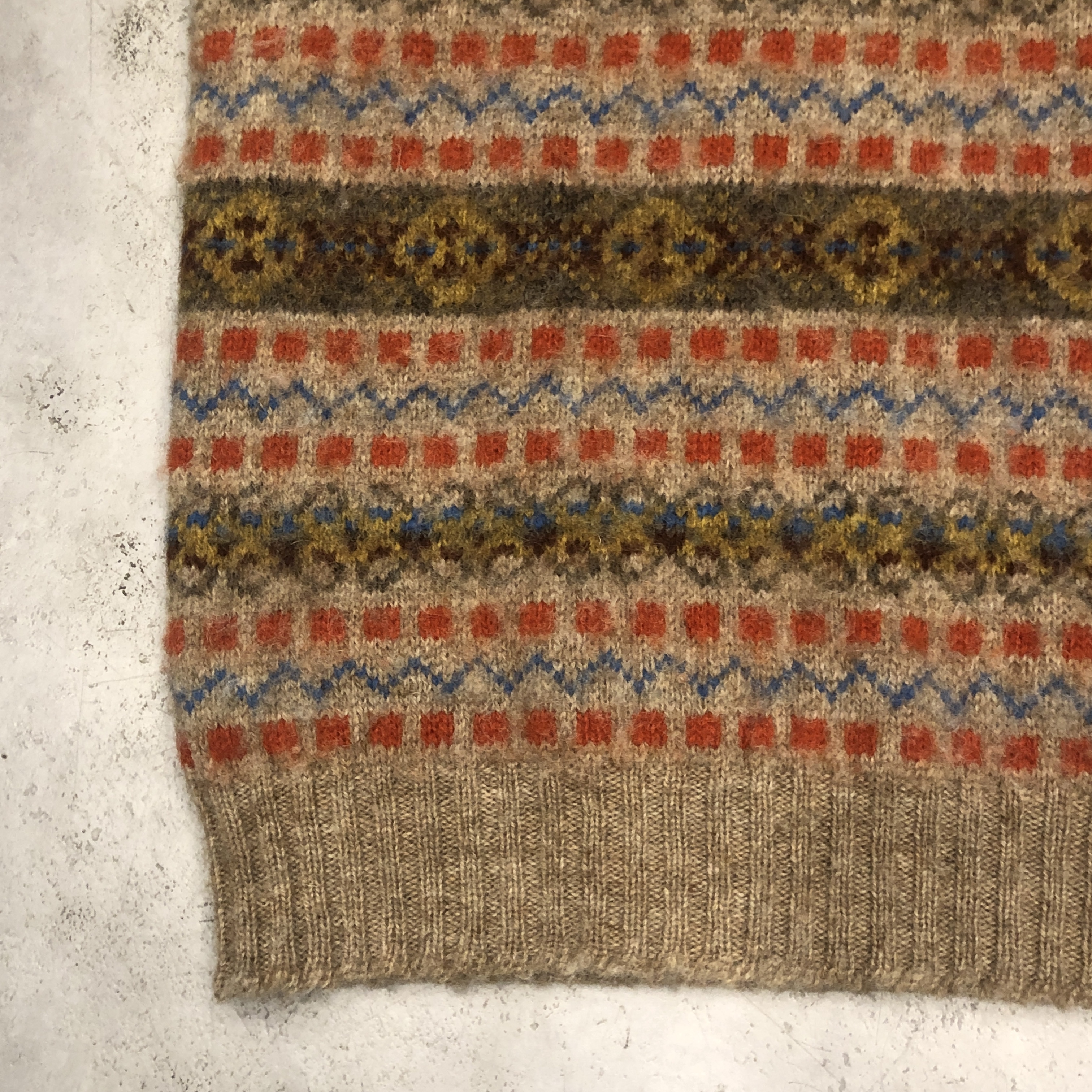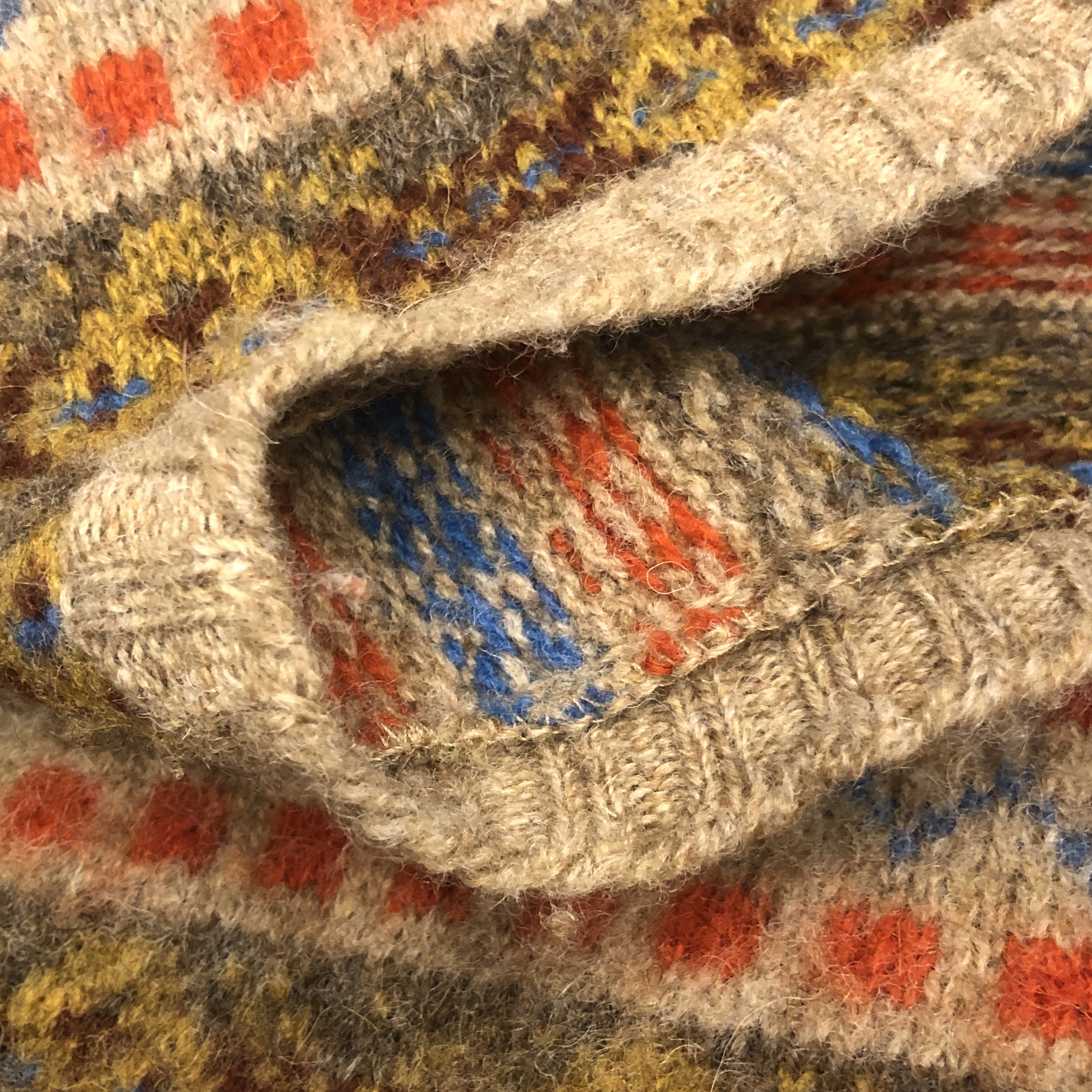 まず目に飛び込んでくるのは、伝統的なフェアアイル柄。柔らかなベージュをベースに、ノスタルジックなレンガ色、からし、ブルーが絶妙に交じり合い、どこか70年代のヨーロッパ古着を思わせる温かみのある配色です。柄のピッチが細かく、スコットランドらしいネップ混じりのウール糸がまた最高に雰囲気あります。
