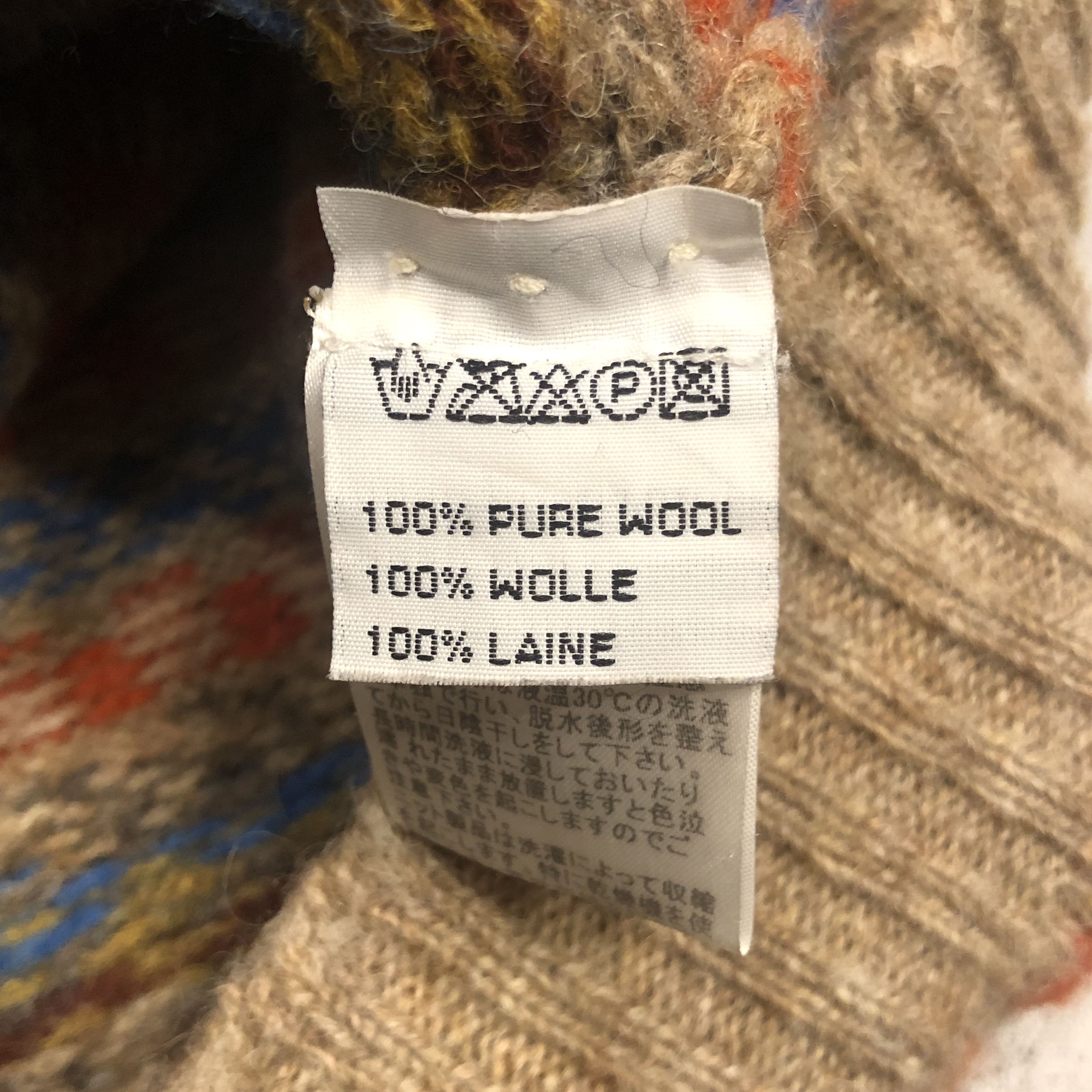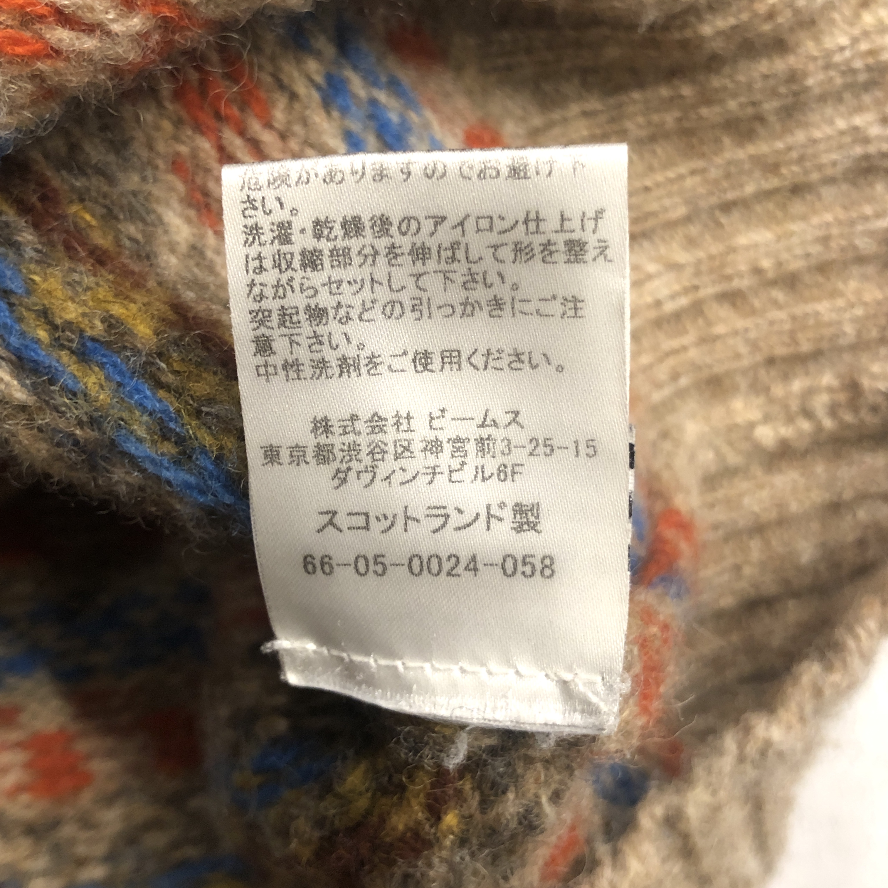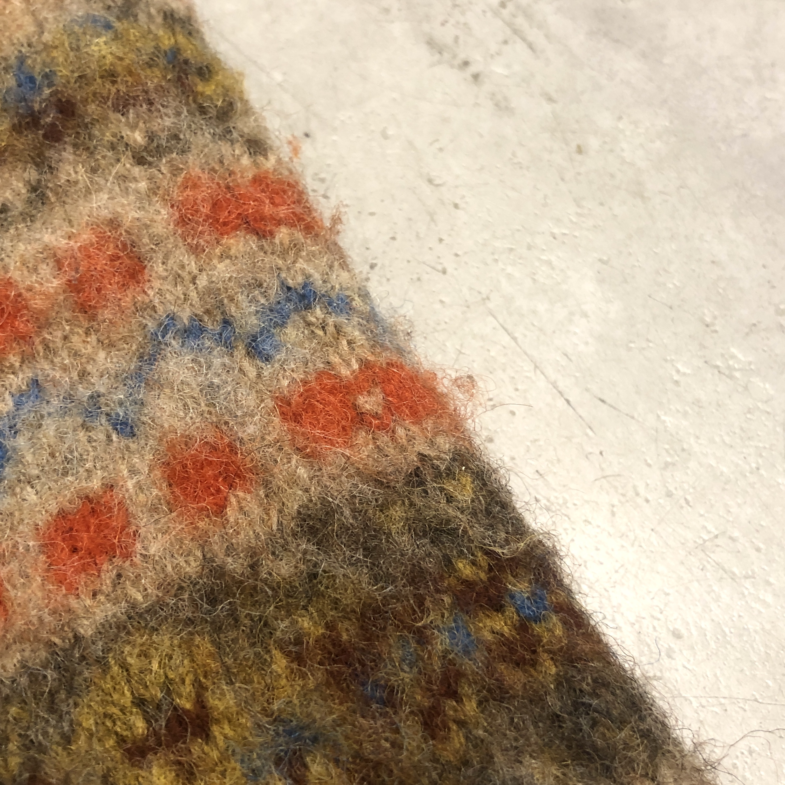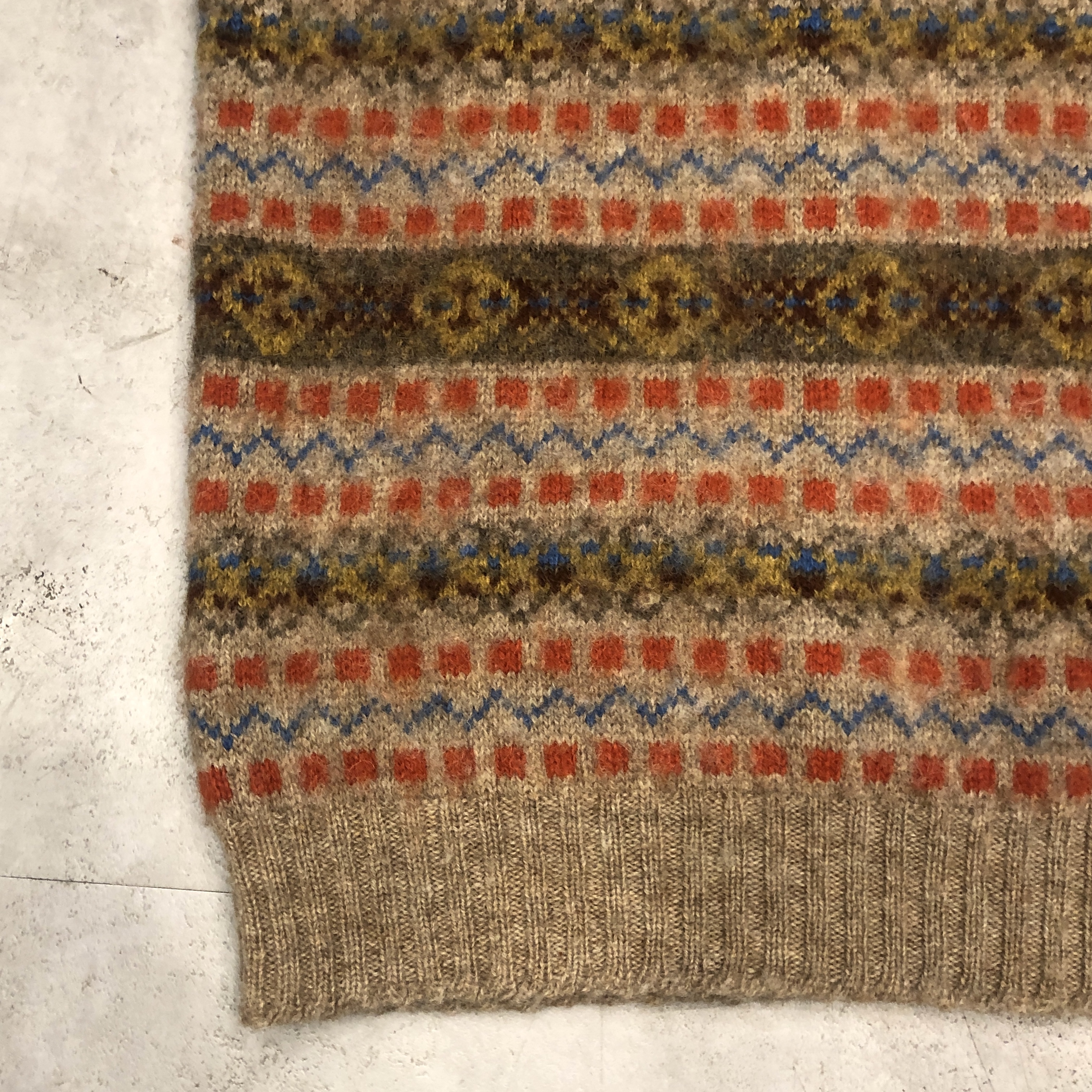 まず目に飛び込んでくるのは、伝統的なフェアアイル柄。柔らかなベージュをベースに、ノスタルジックなレンガ色、からし、ブルーが絶妙に交じり合い、どこか70年代のヨーロッパ古着を思わせる温かみのある配色です。柄のピッチが細かく、スコットランドらしいネップ混じりのウール糸がまた最高に雰囲気あります。