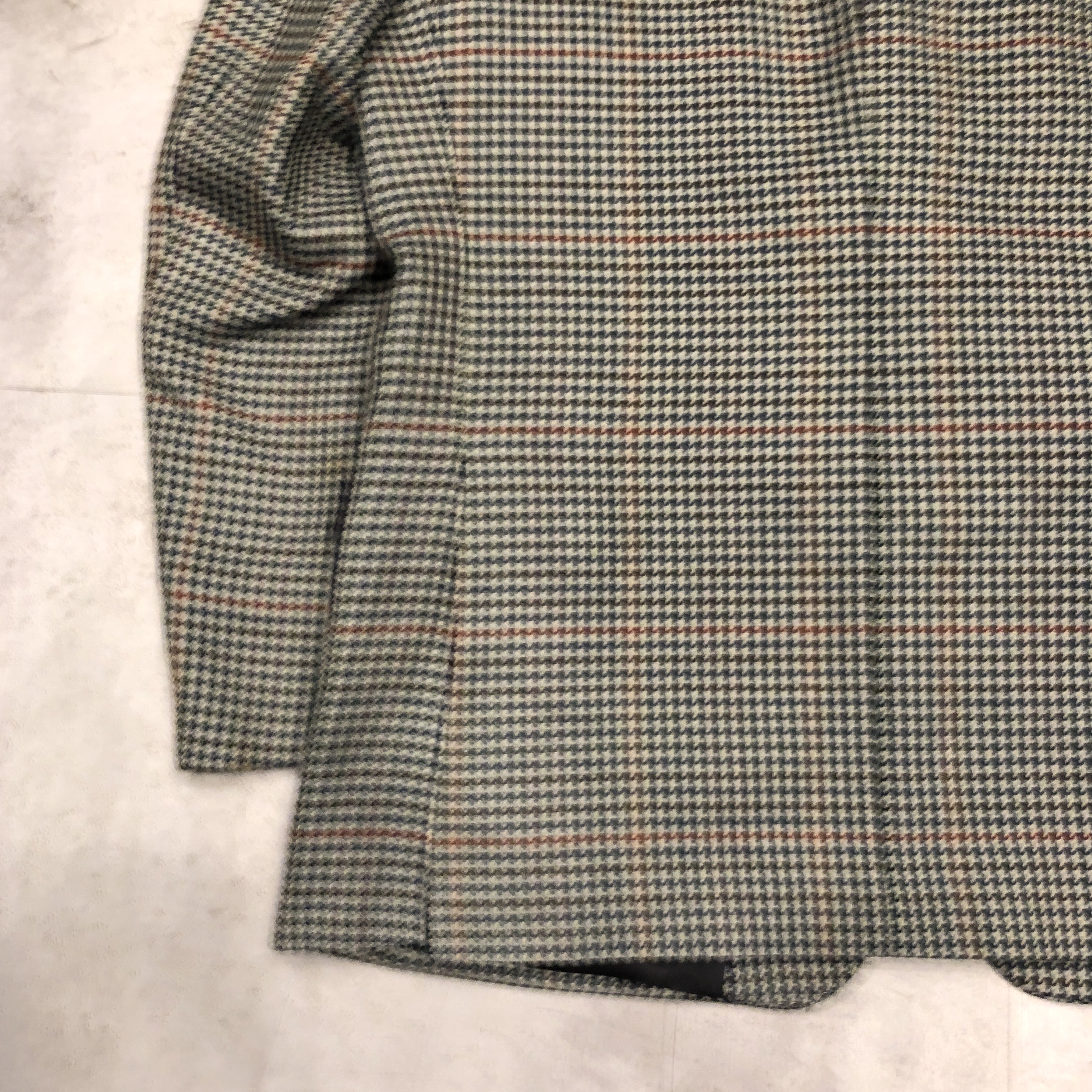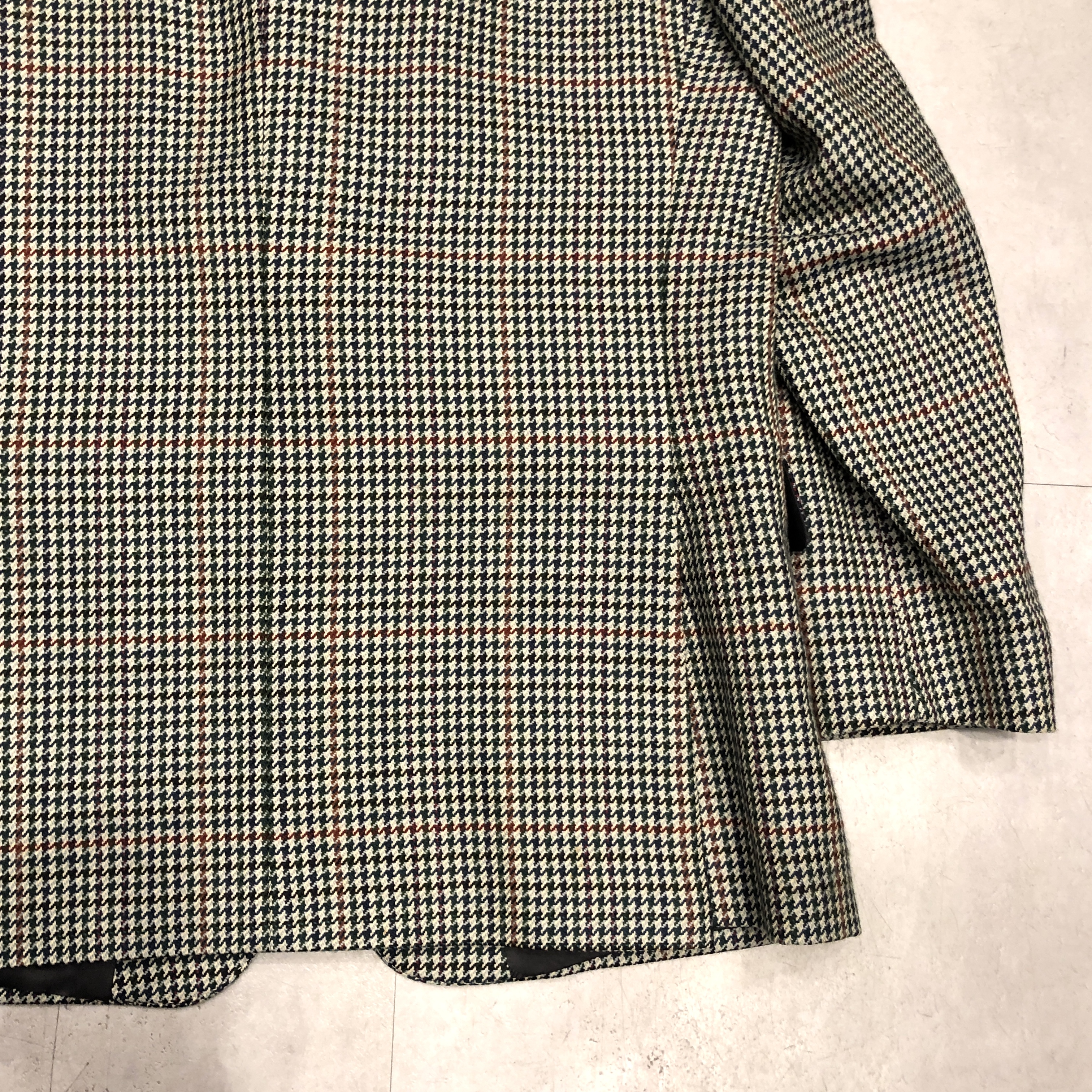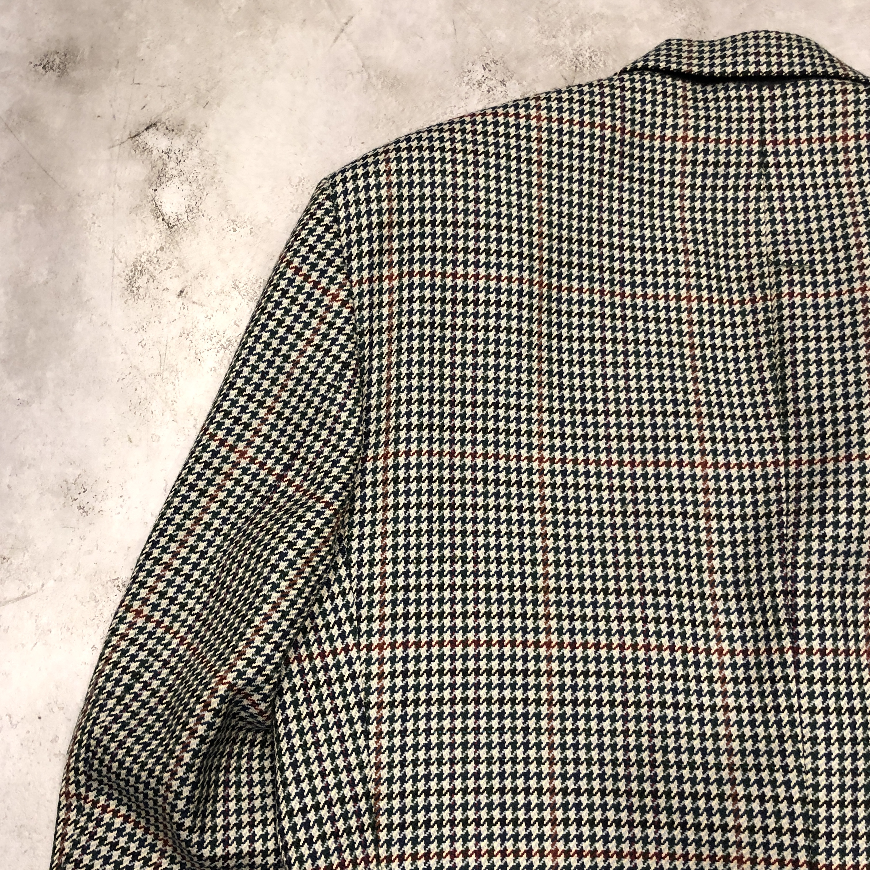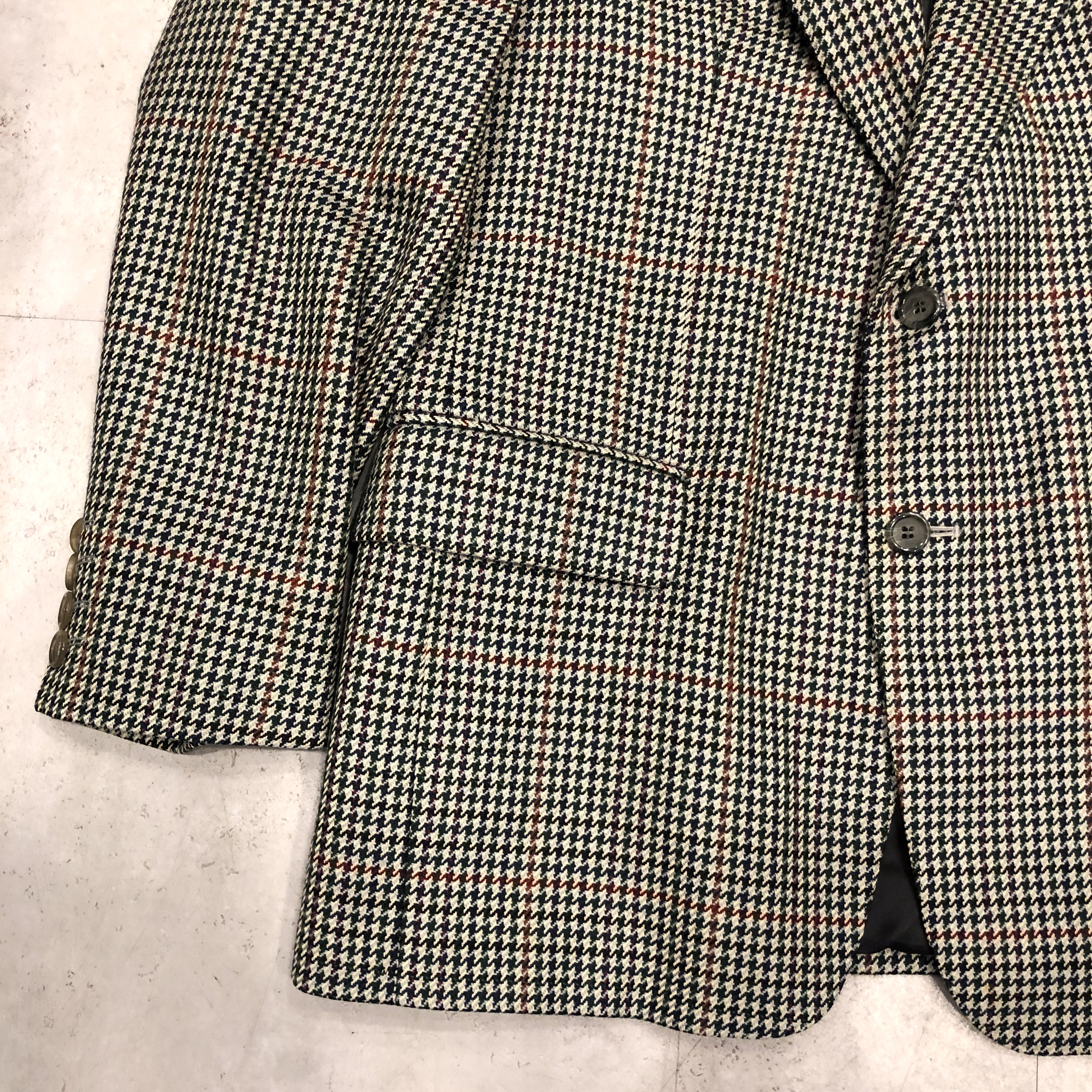 それぞれの色糸が細かく織り込まれ、遠目には落ち着きのあるトーン、近くで見ると実はとても表情豊かな柄で、英国ジャケットらしい奥行きがあります。