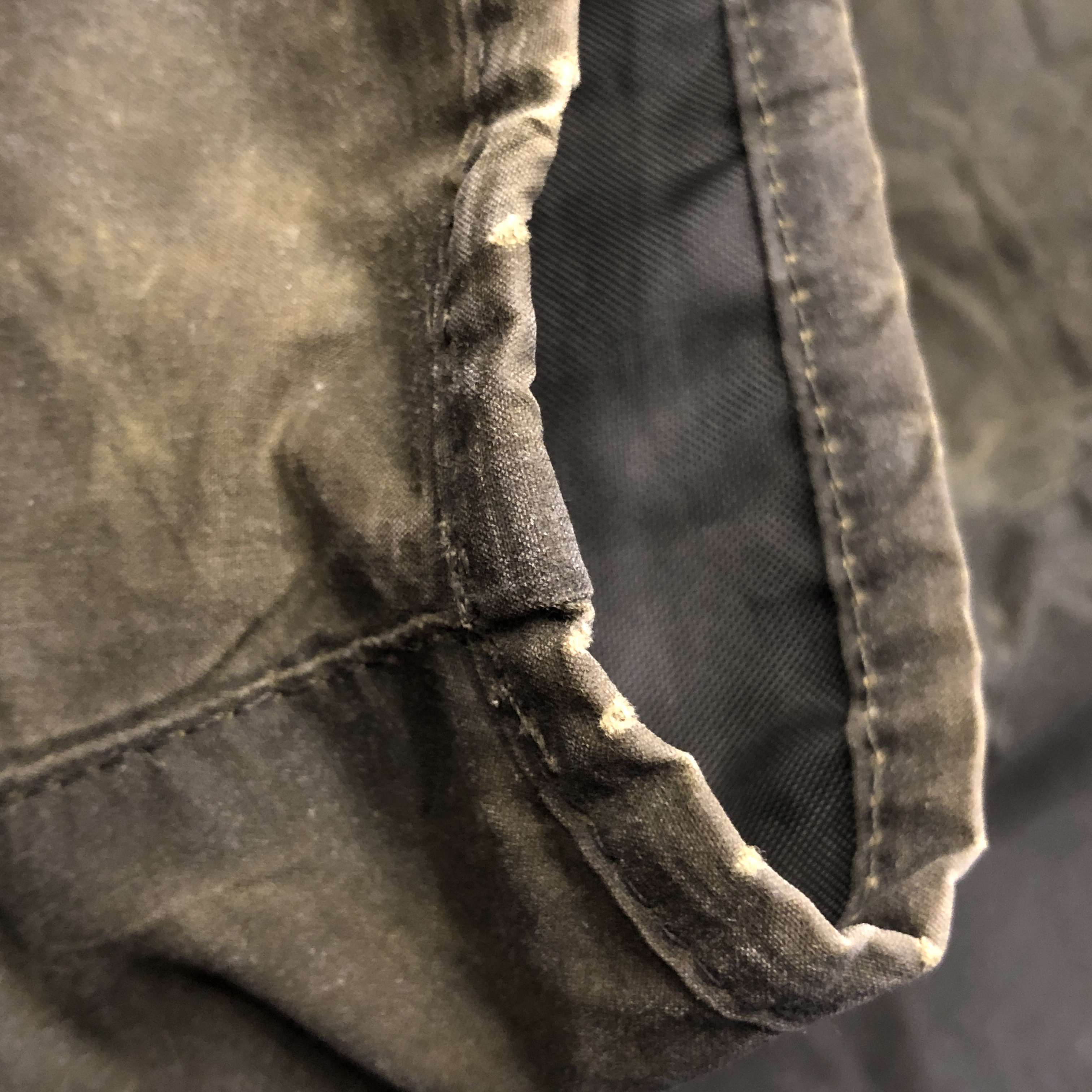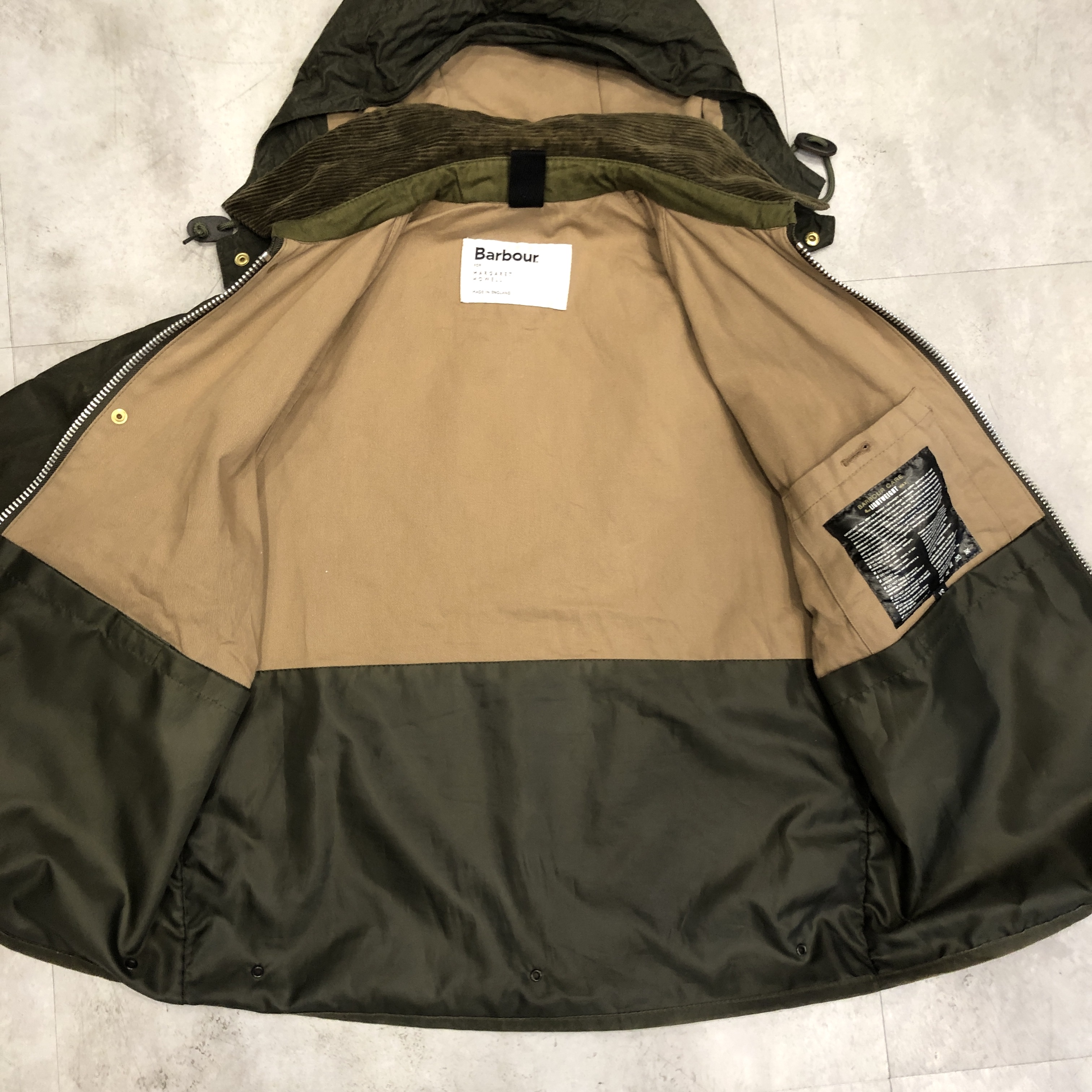 表地には 4oz LIGHTWEIGHT WAX を採用し、バブアー特有の重さや粘度が控えめ。くったりと馴染むドレープは、このモデルならでは。身頃裏はベージュ × オリーブの切り替え仕様で、過剰な演出を排したミニマルさが美しい。